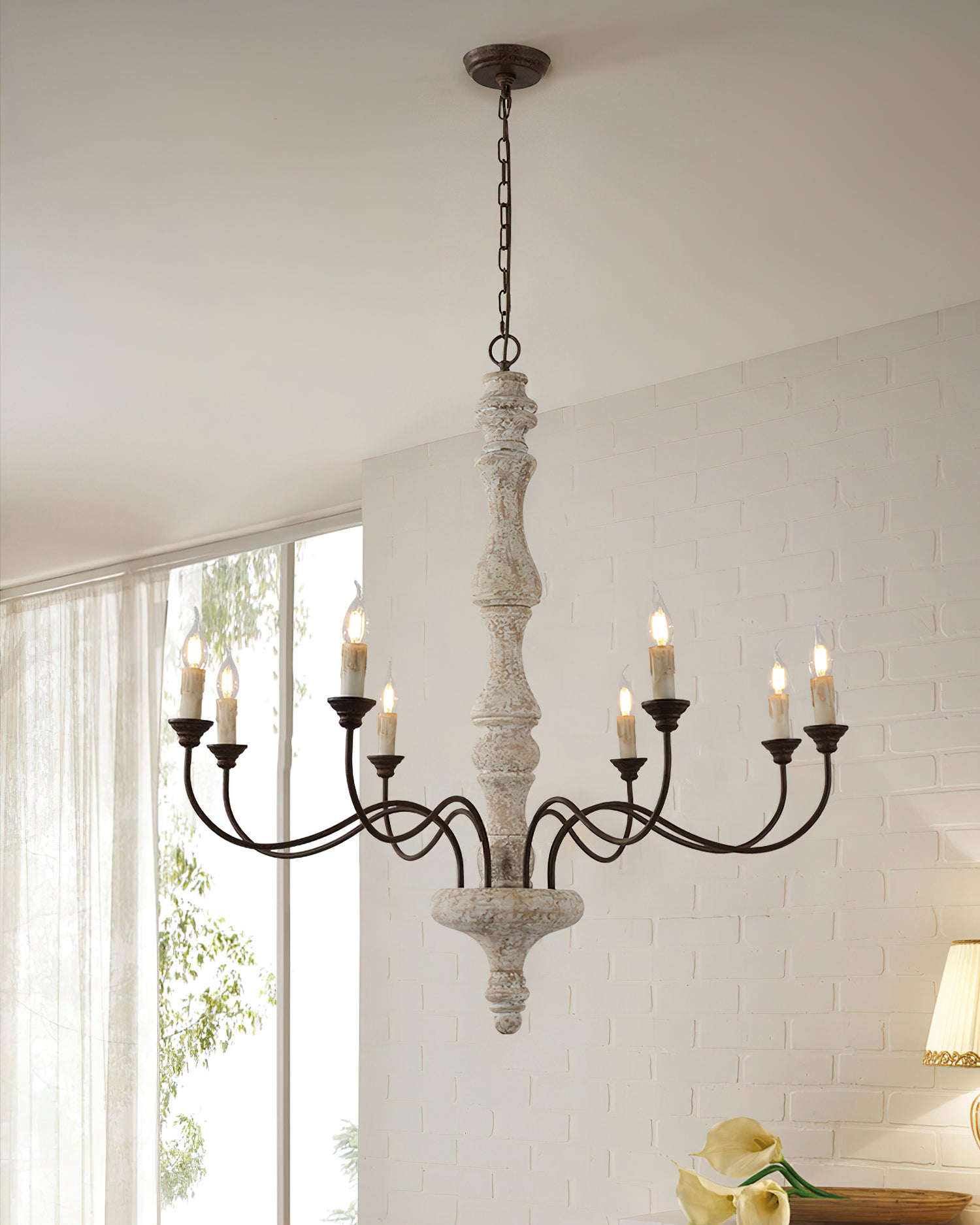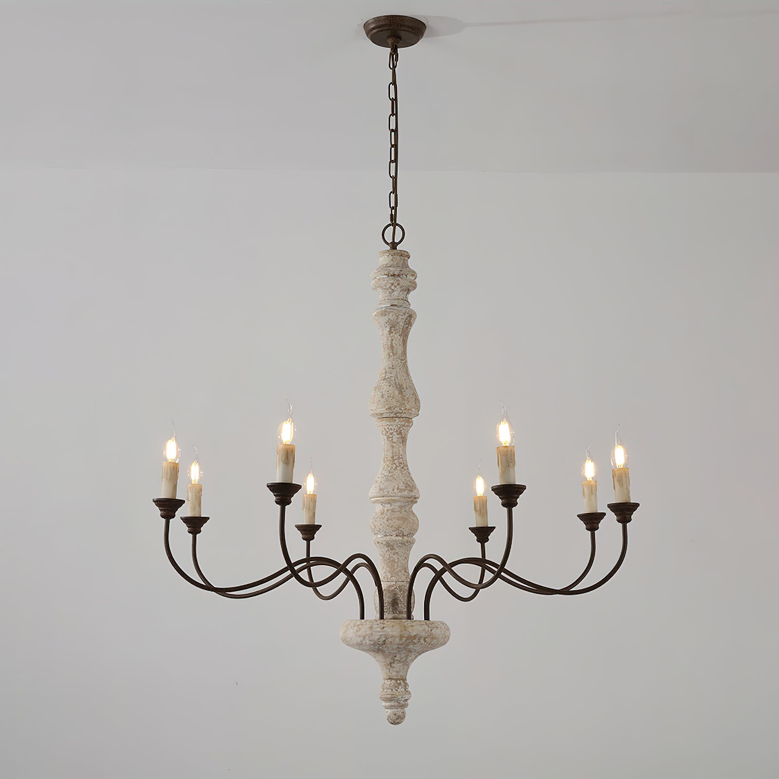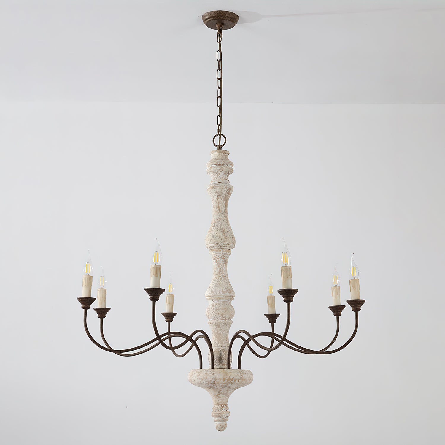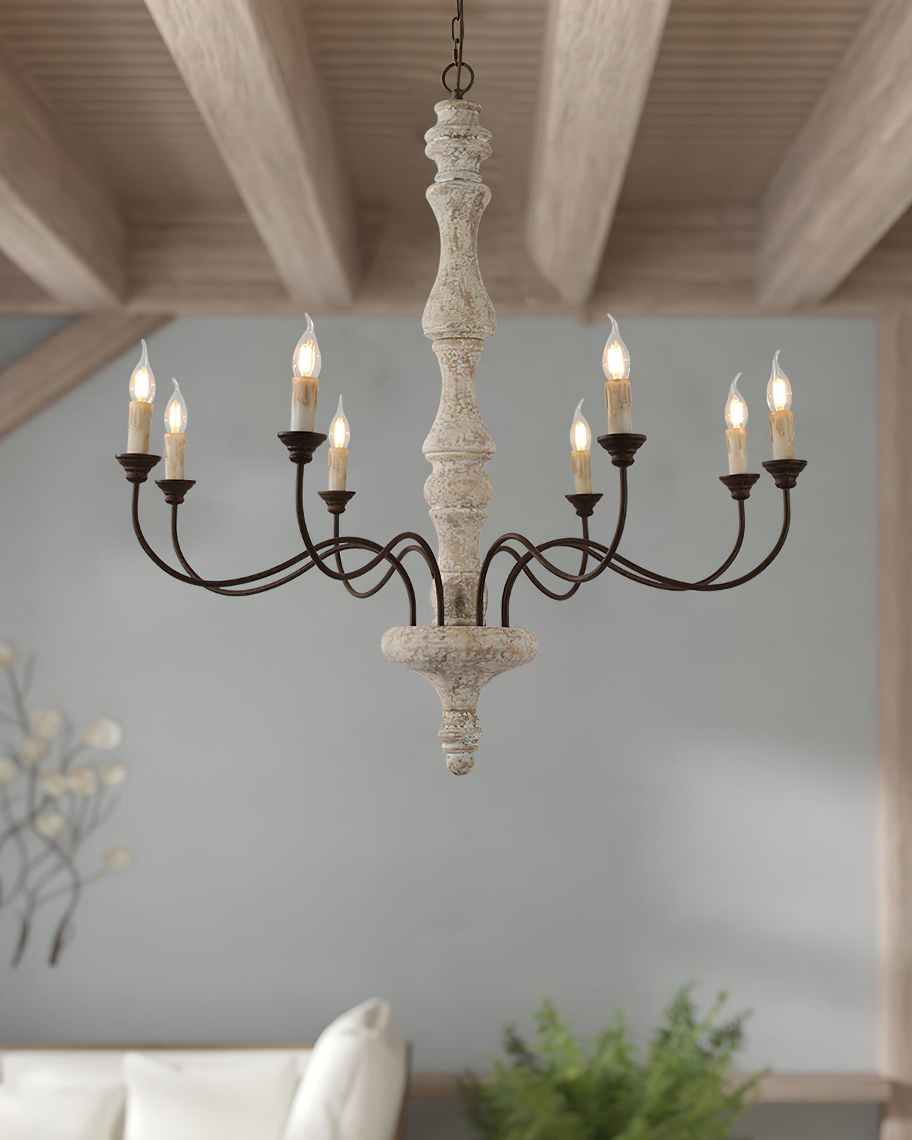 Elevate your space with the timeless elegance of Mooijane's Molina Chandelier. Inspired by French country living, the distressed wood frame and rusted iron exude a classic Empire style. The eight-candelabra lamp adds an air of luxury, and the adjustable light string allows for customizable hanging height. Perfect for any room, this chandelier adds a sophisticated touch.