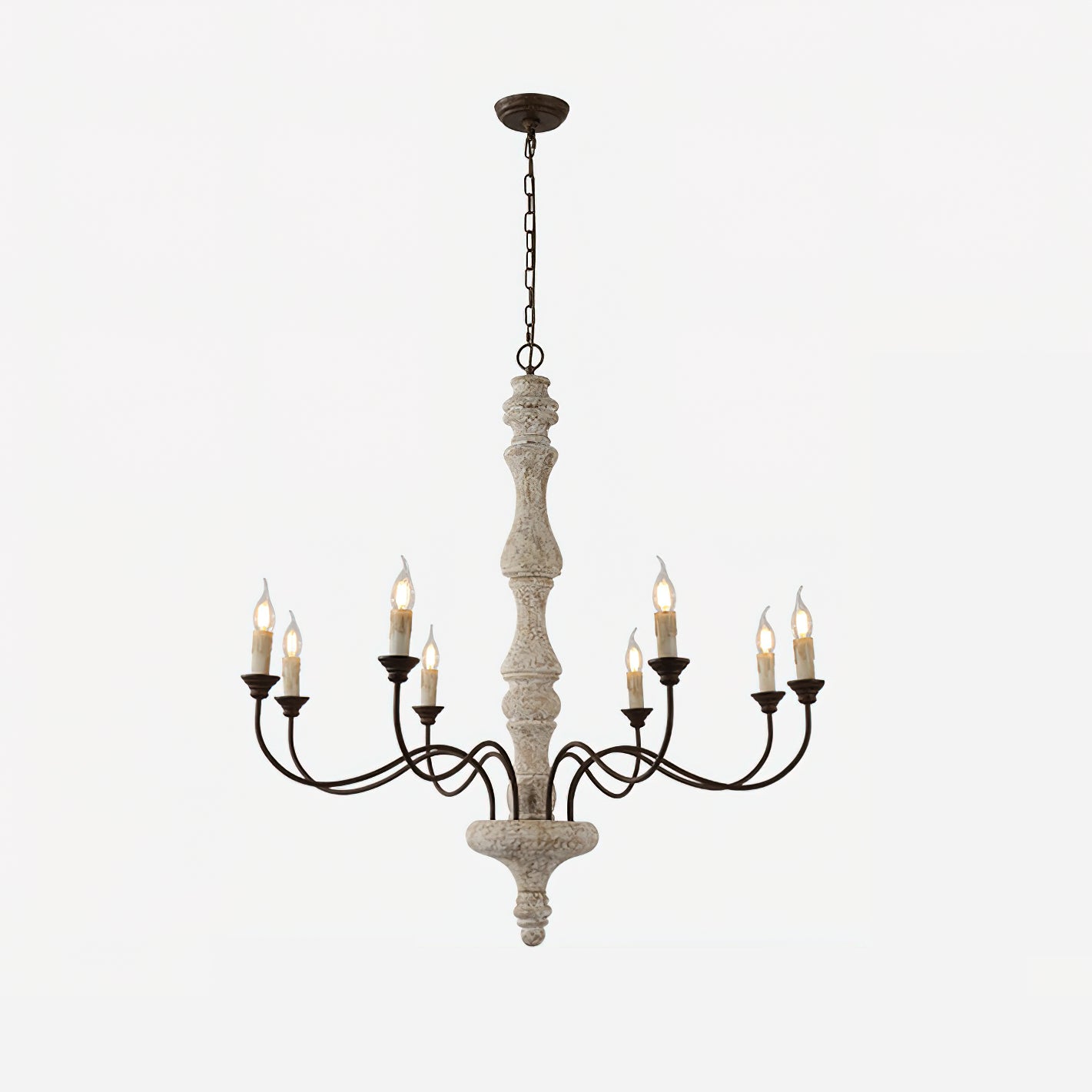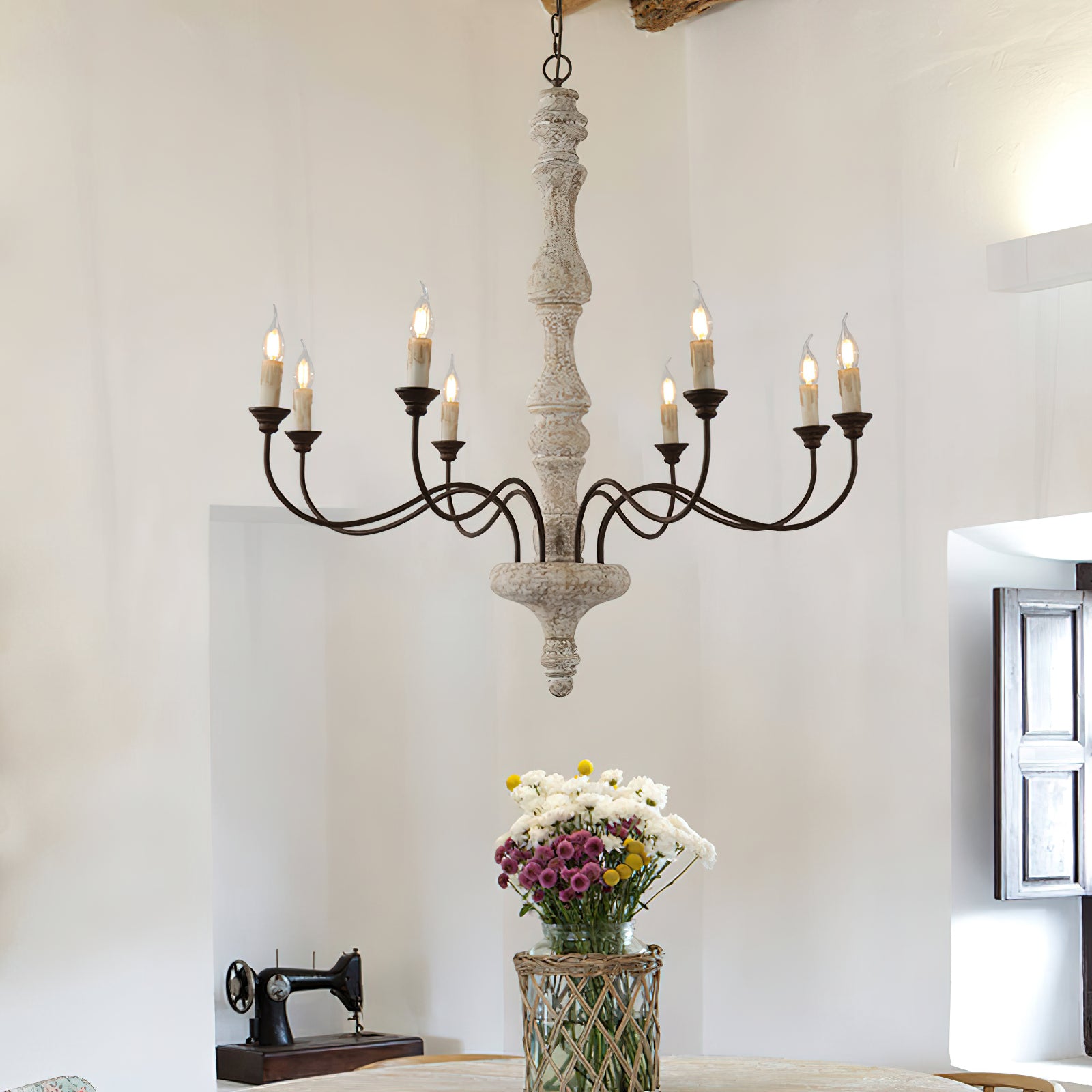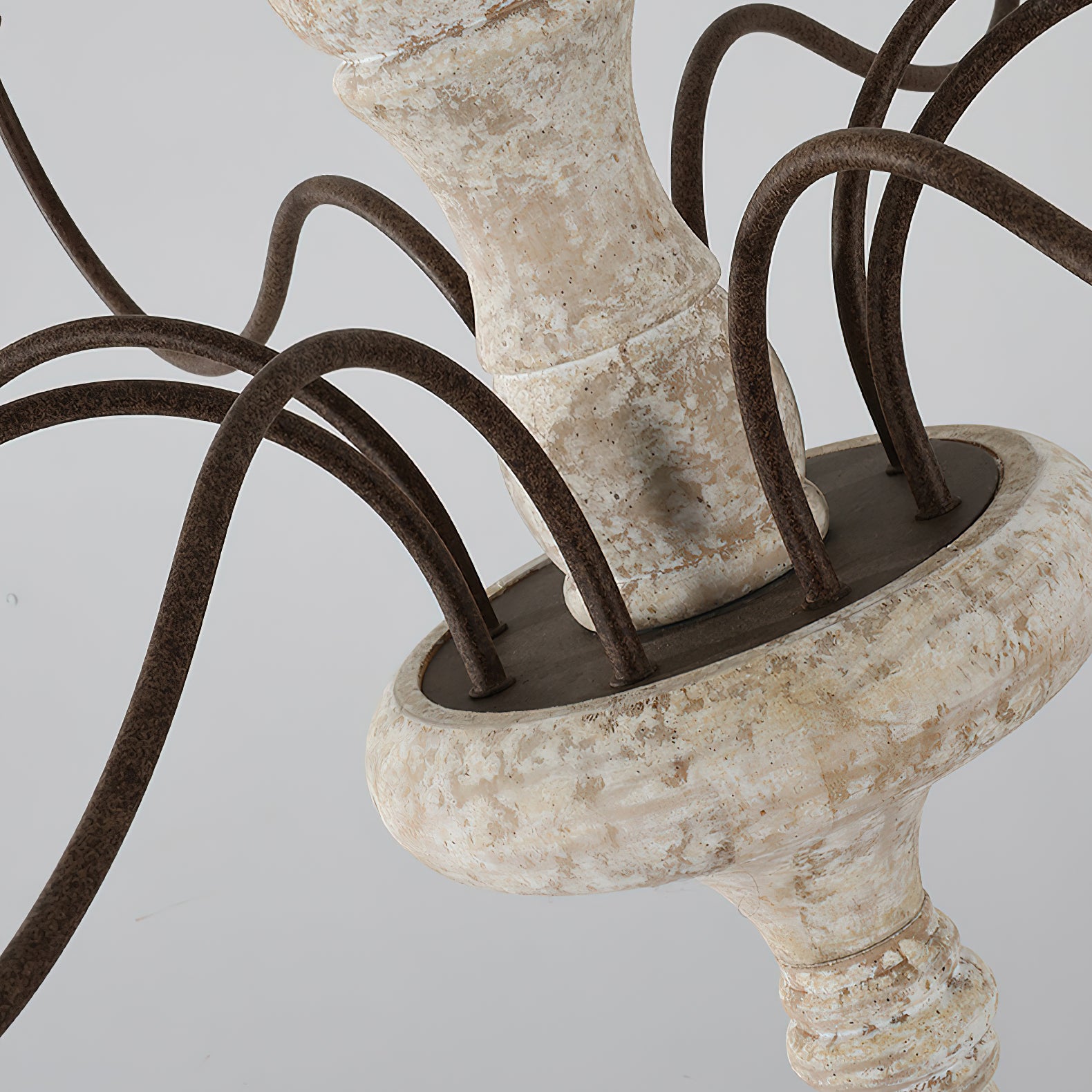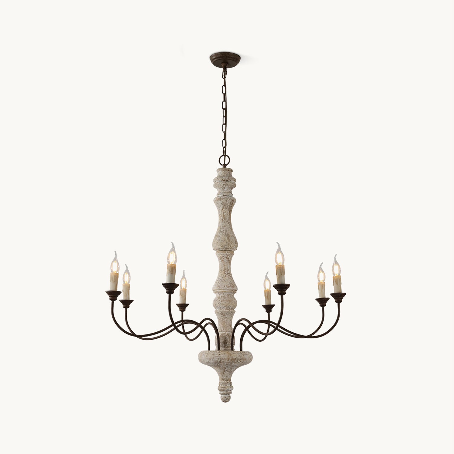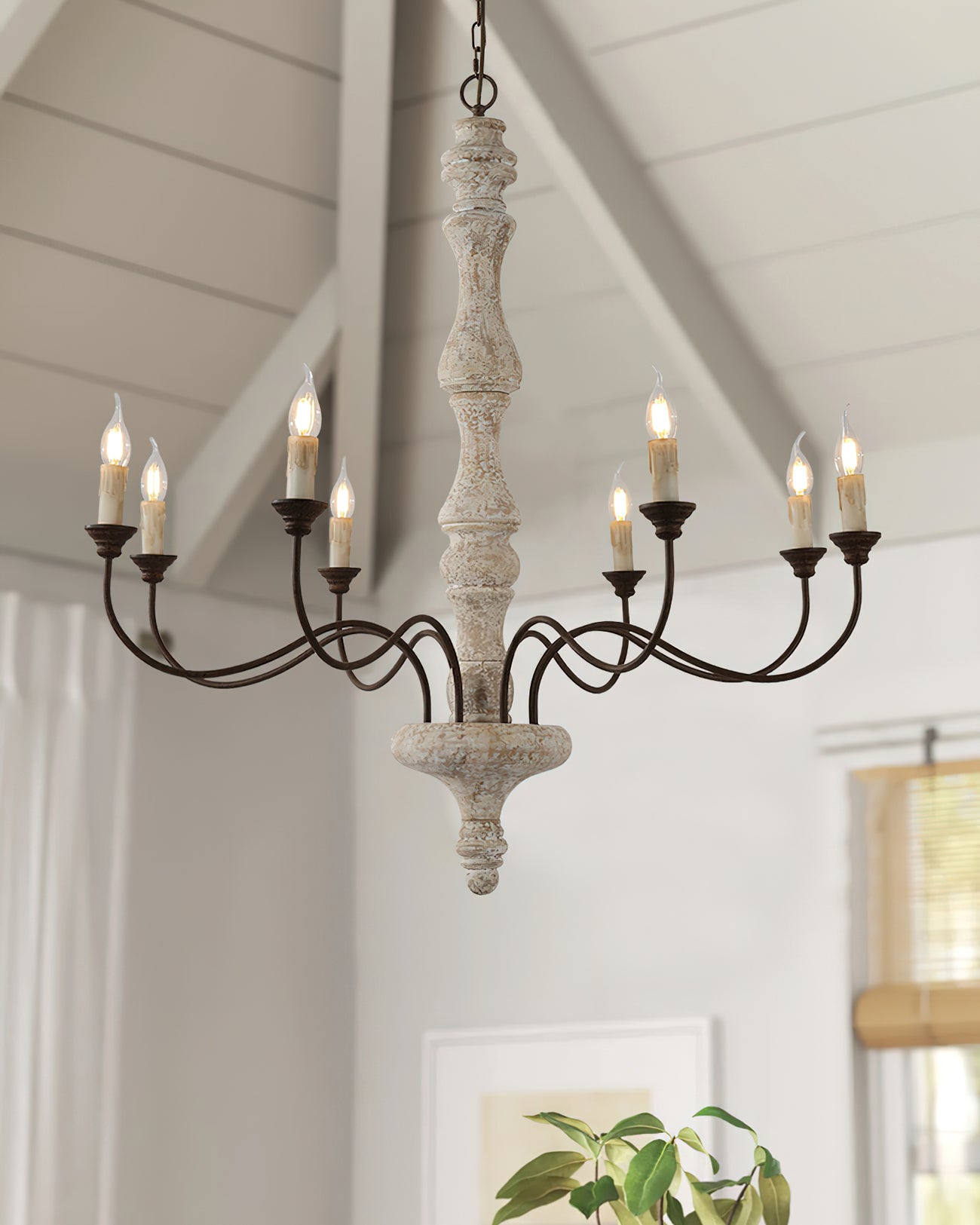 Elevate your space with the timeless elegance of Mooijane's Molina Chandelier. Inspired by French country living, the distressed wood frame and rusted iron exude a classic Empire style. The eight-candelabra lamp adds an air of luxury, and the adjustable light string allows for customizable hanging height. Perfect for any room, this chandelier adds a sophisticated touch.