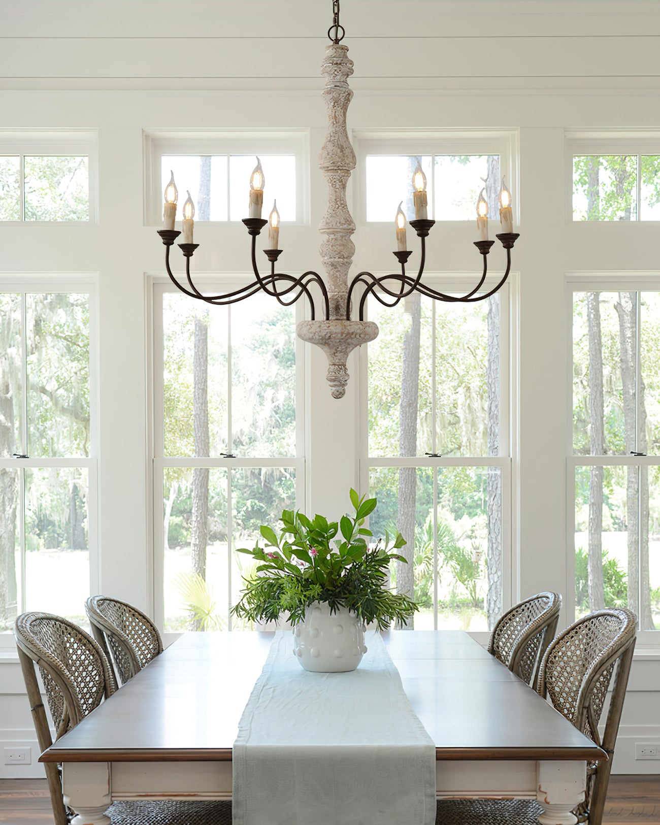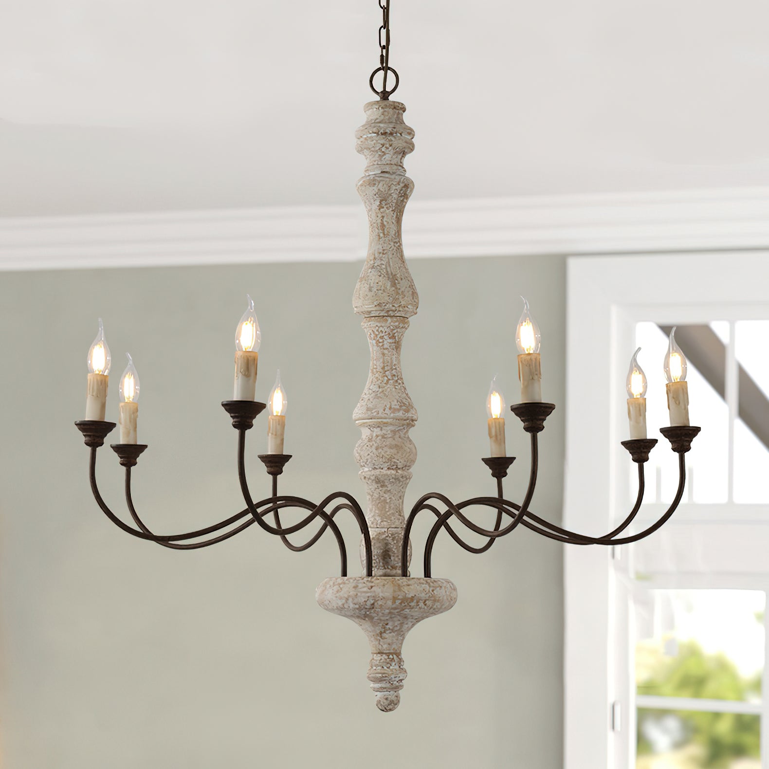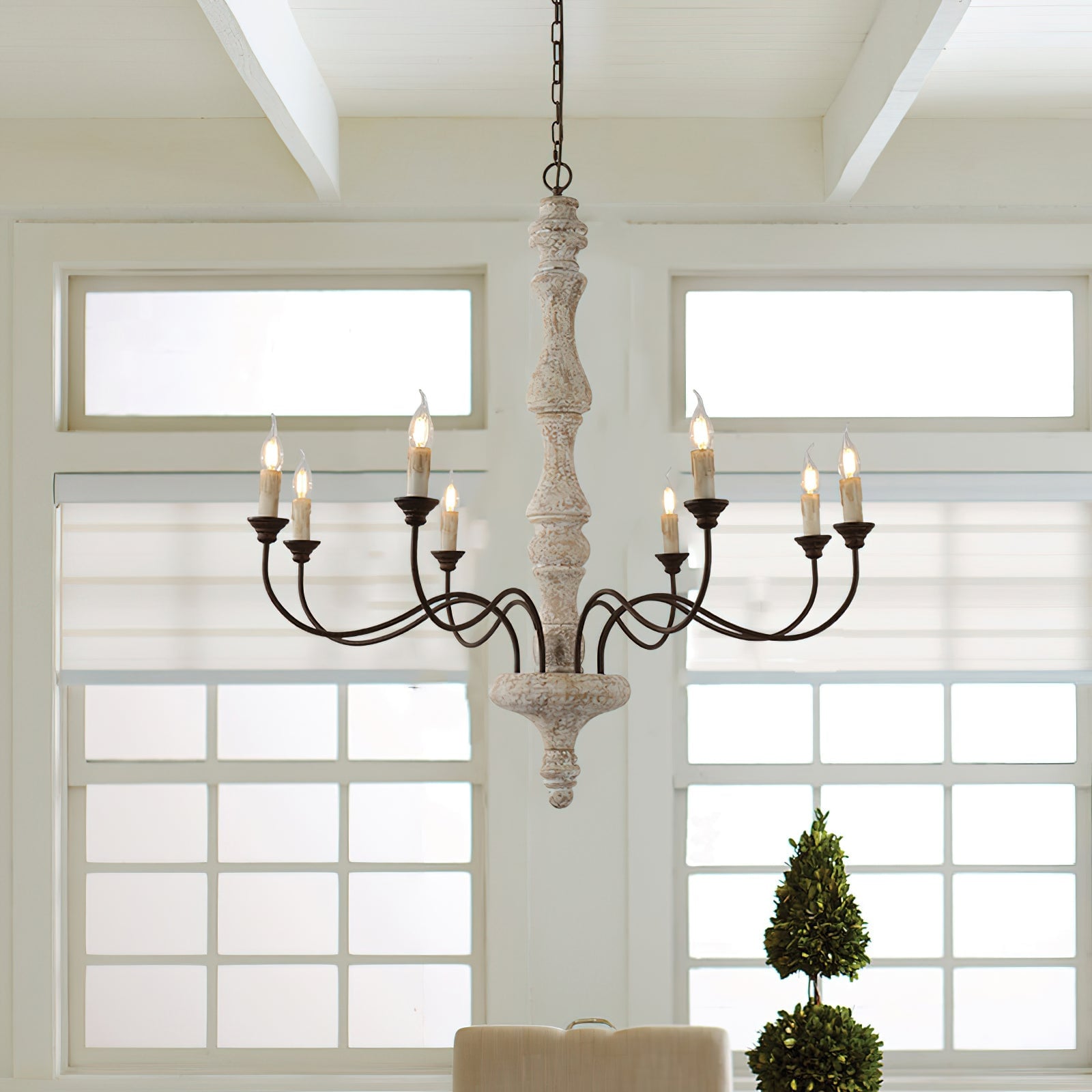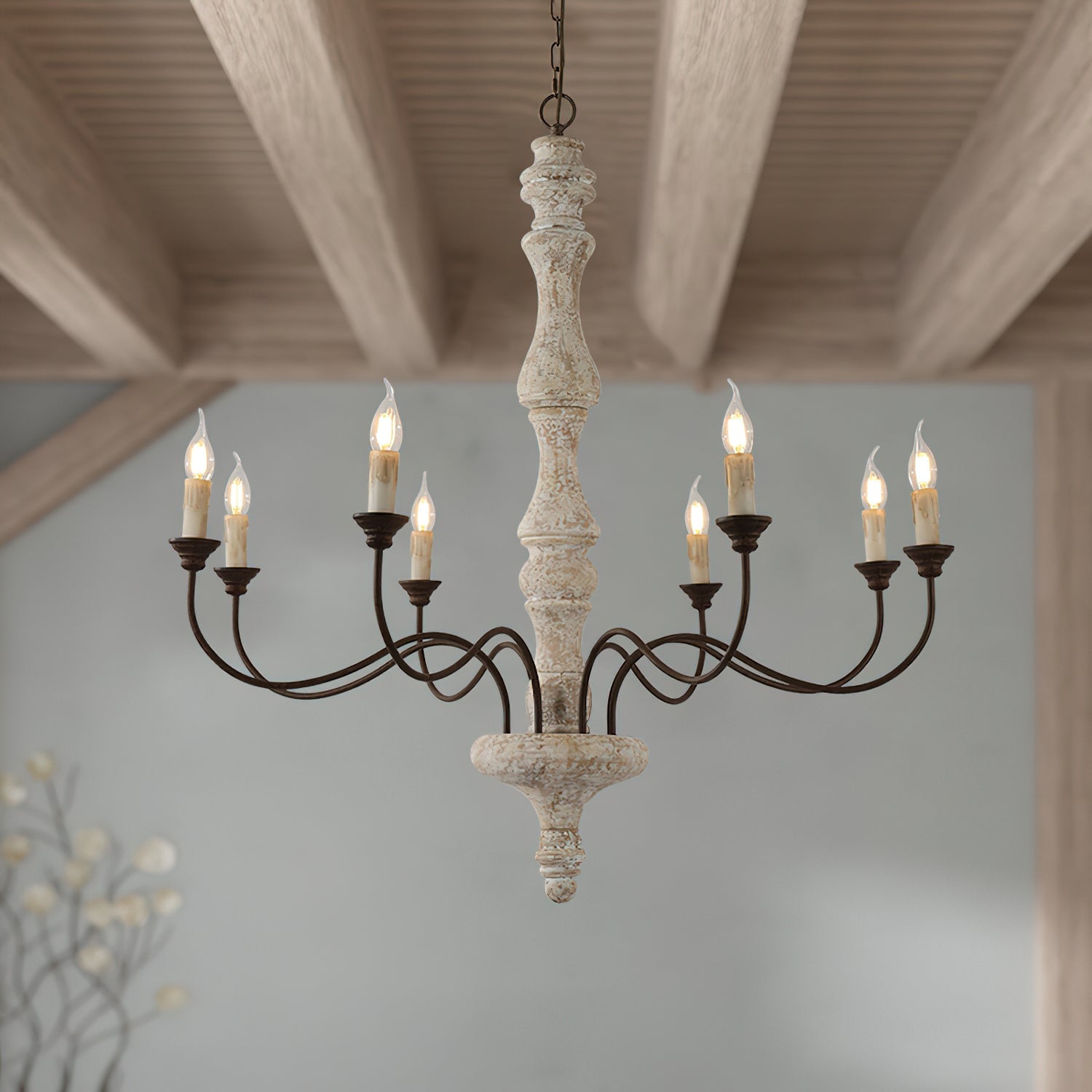 Elevate your space with the timeless elegance of Mooijane's Molina Chandelier. Inspired by French country living, the distressed wood frame and rusted iron exude a classic Empire style. The eight-candelabra lamp adds an air of luxury, and the adjustable light string allows for customizable hanging height. Perfect for any room, this chandelier adds a sophisticated touch.