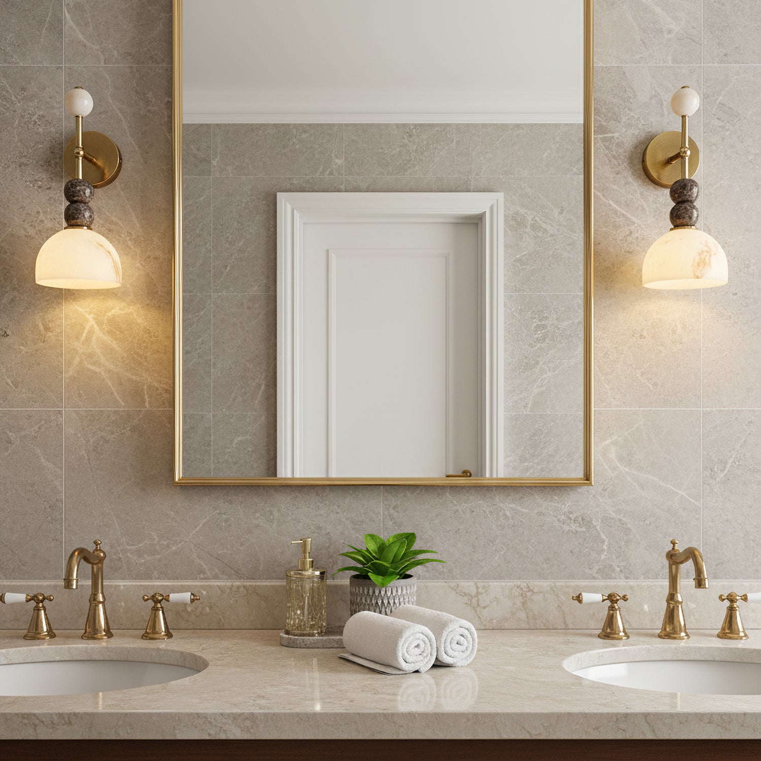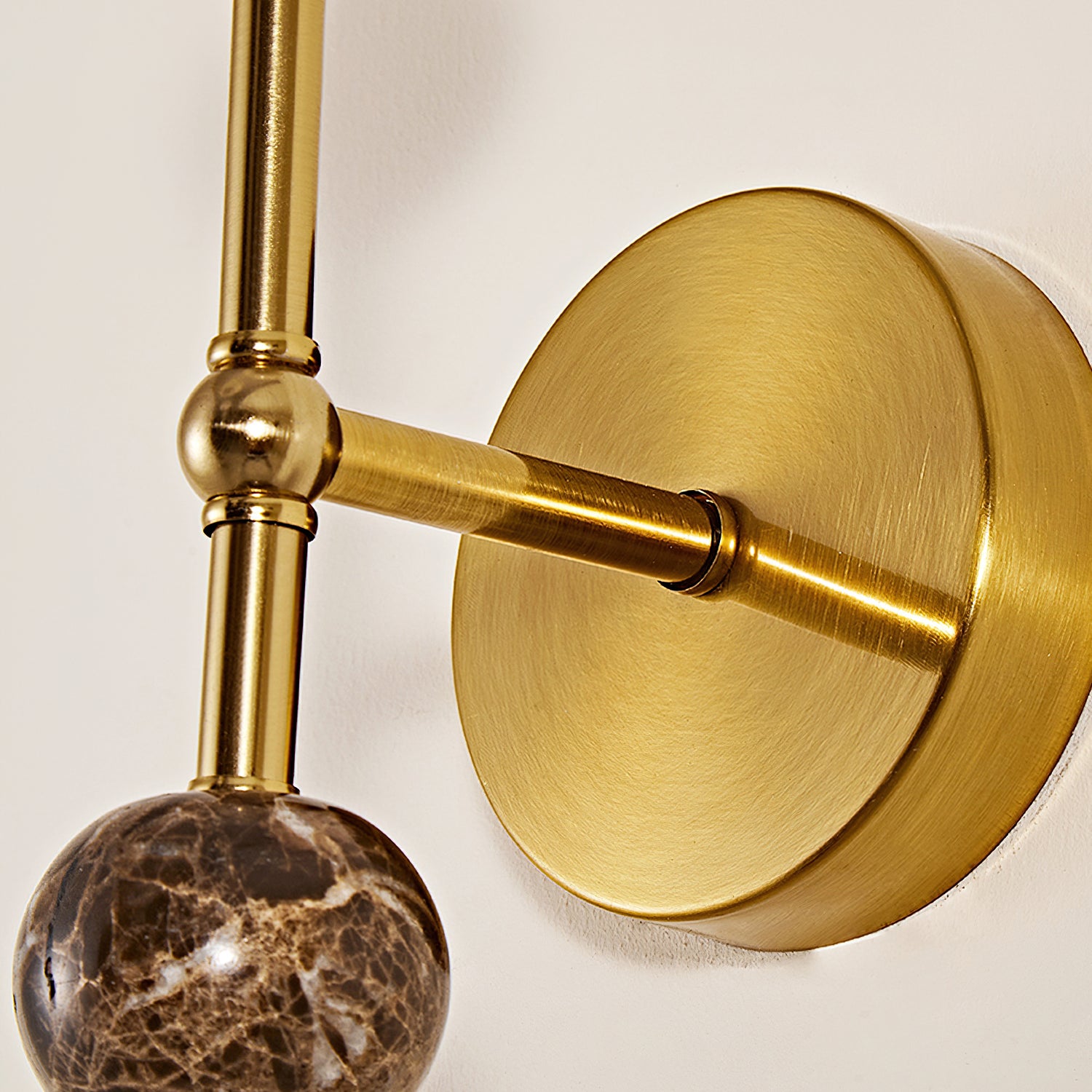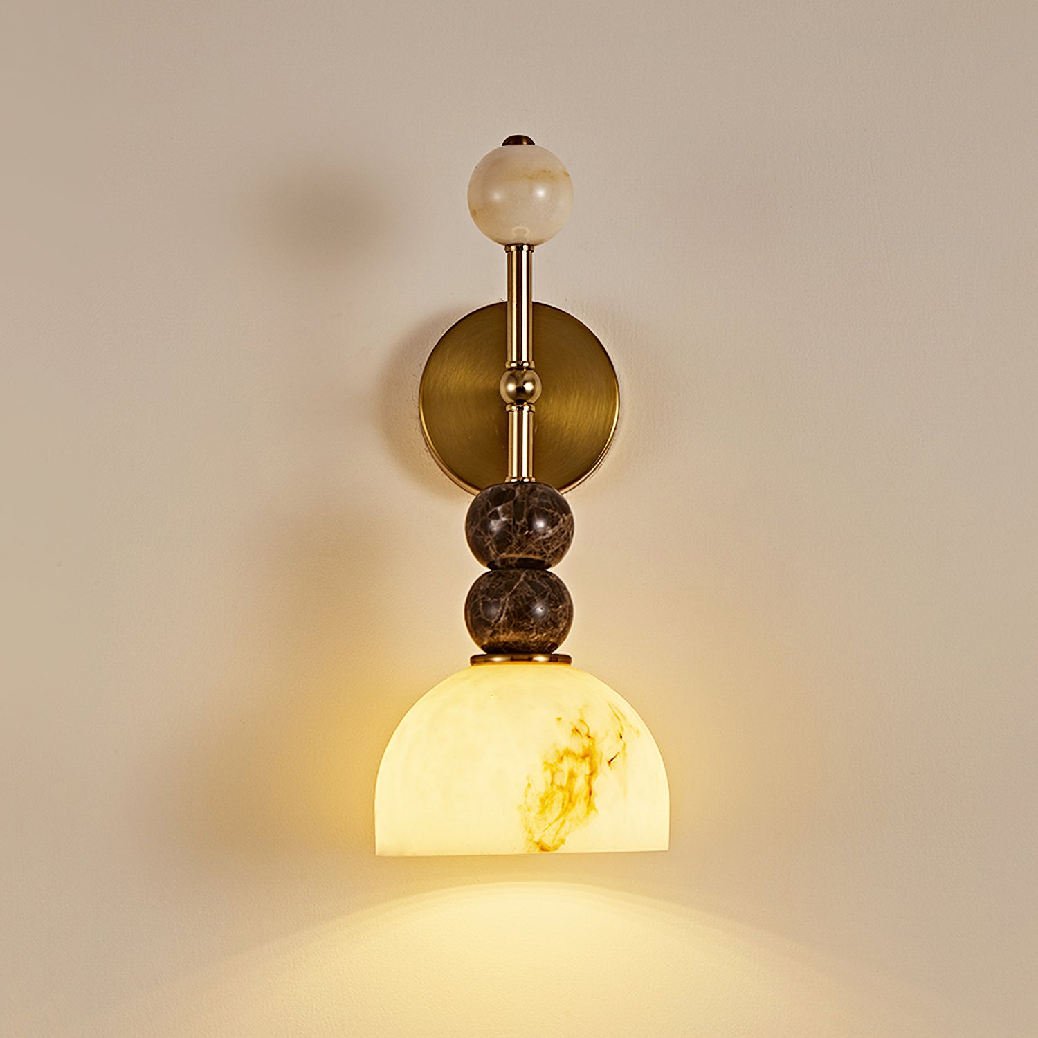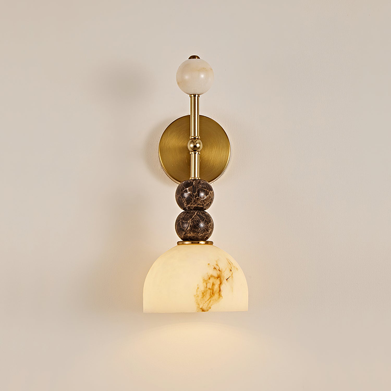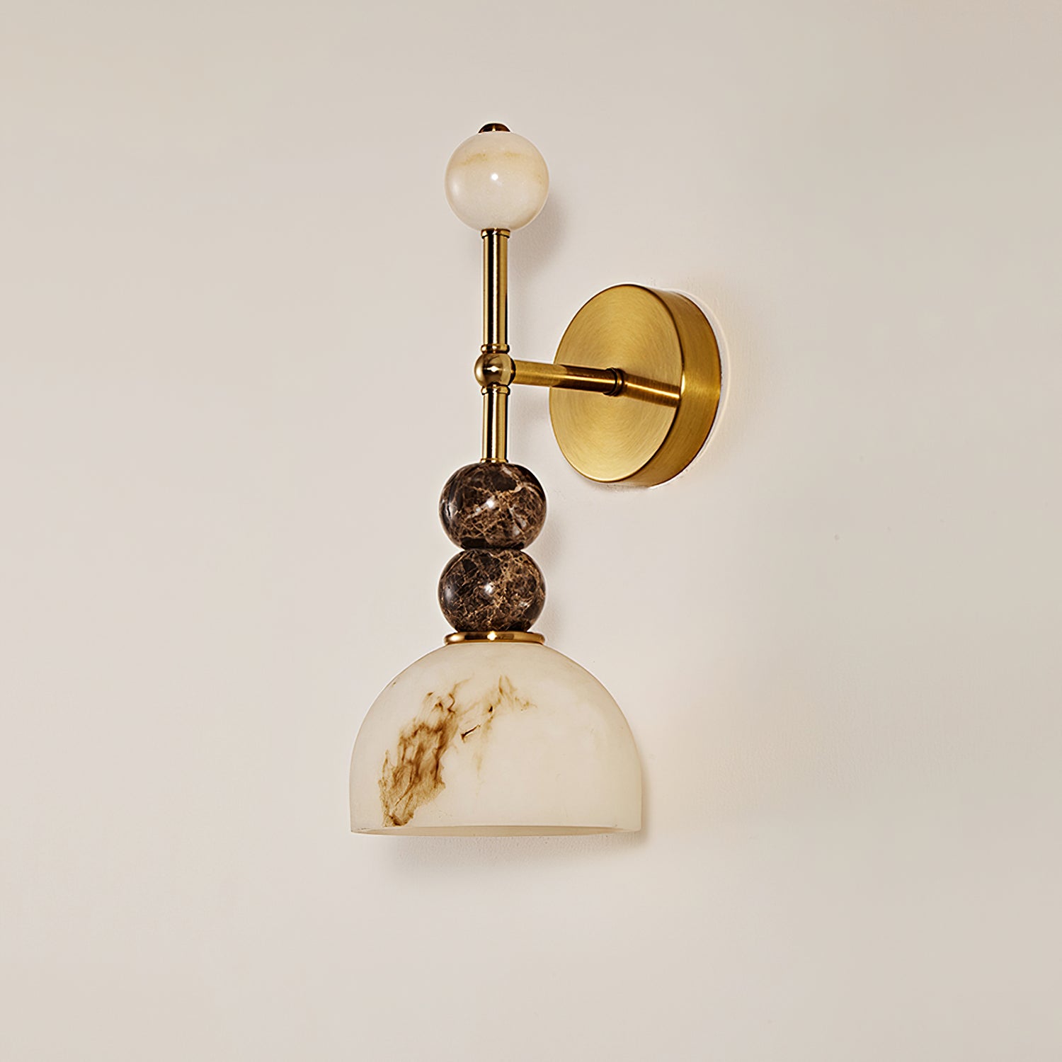 The Mona Wall Light from Mooijane captures sculptural elegance through its refined silhouette and sophisticated material contrast. A sleek metal frame pairs beautifully with a faux alabaster shade, accented by stacked spherical details that add balance and artistry. The marbled texture of the shade diffuses a warm, ambient glow, while the gold finish lends a subtle vintage charm—making the Mona a timeless addition to any interior.