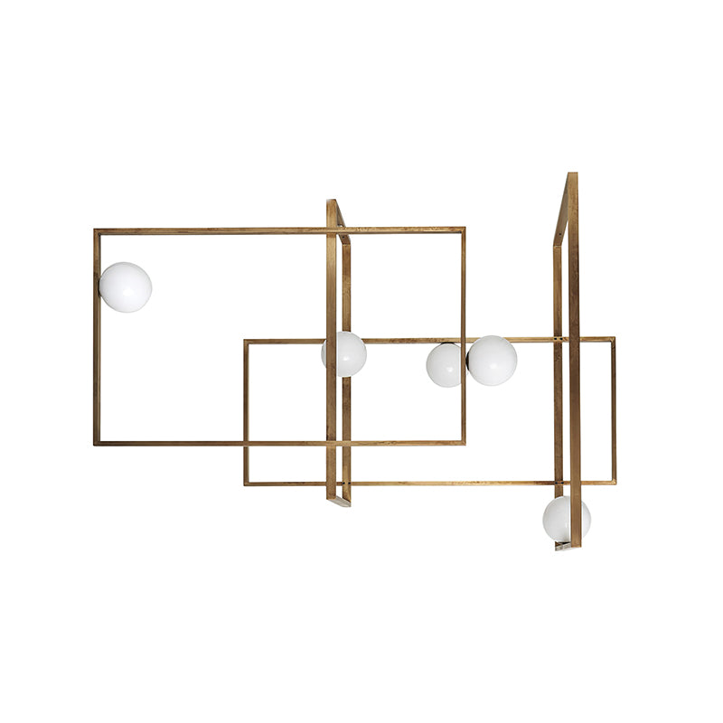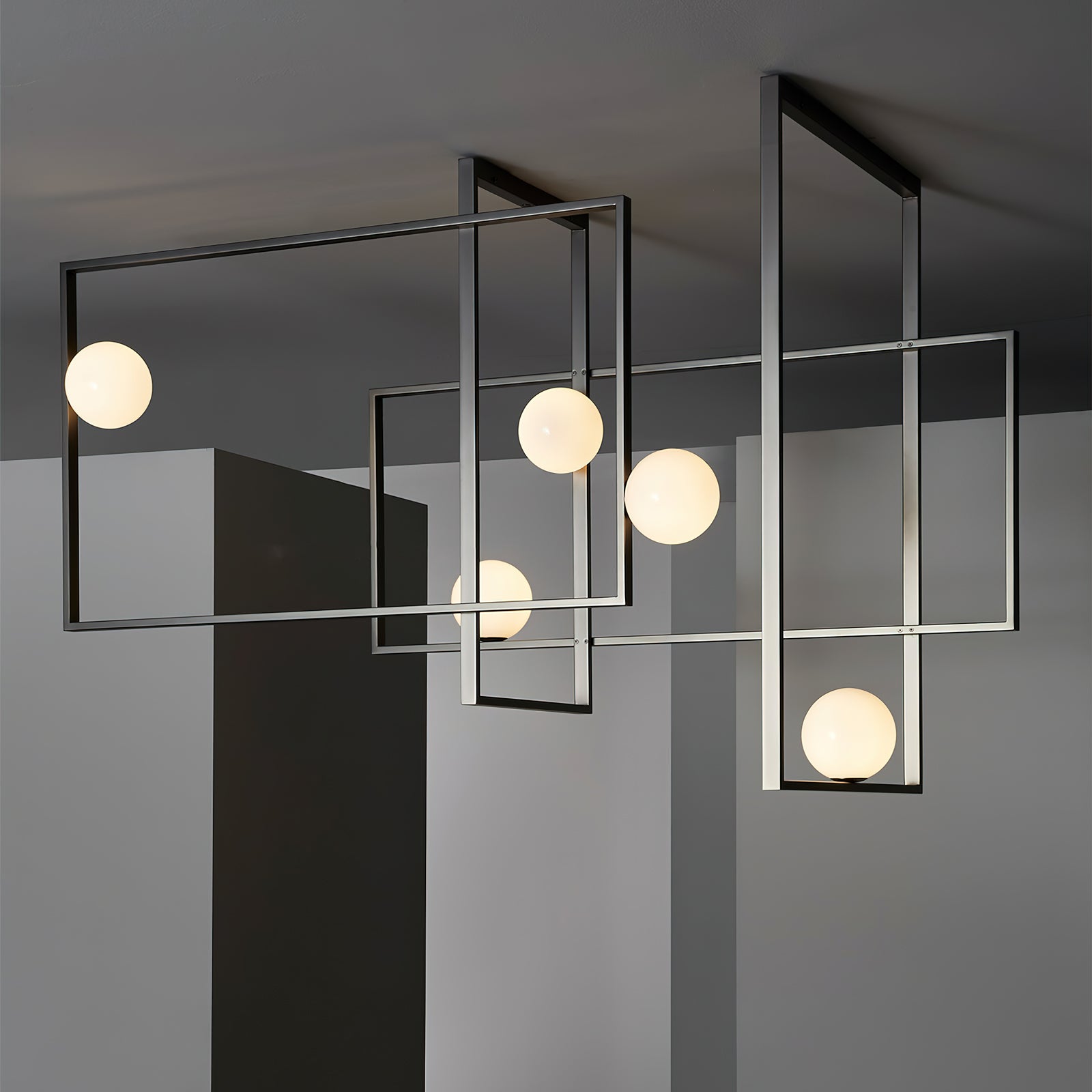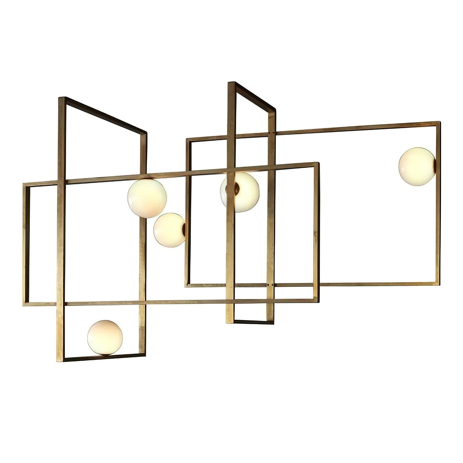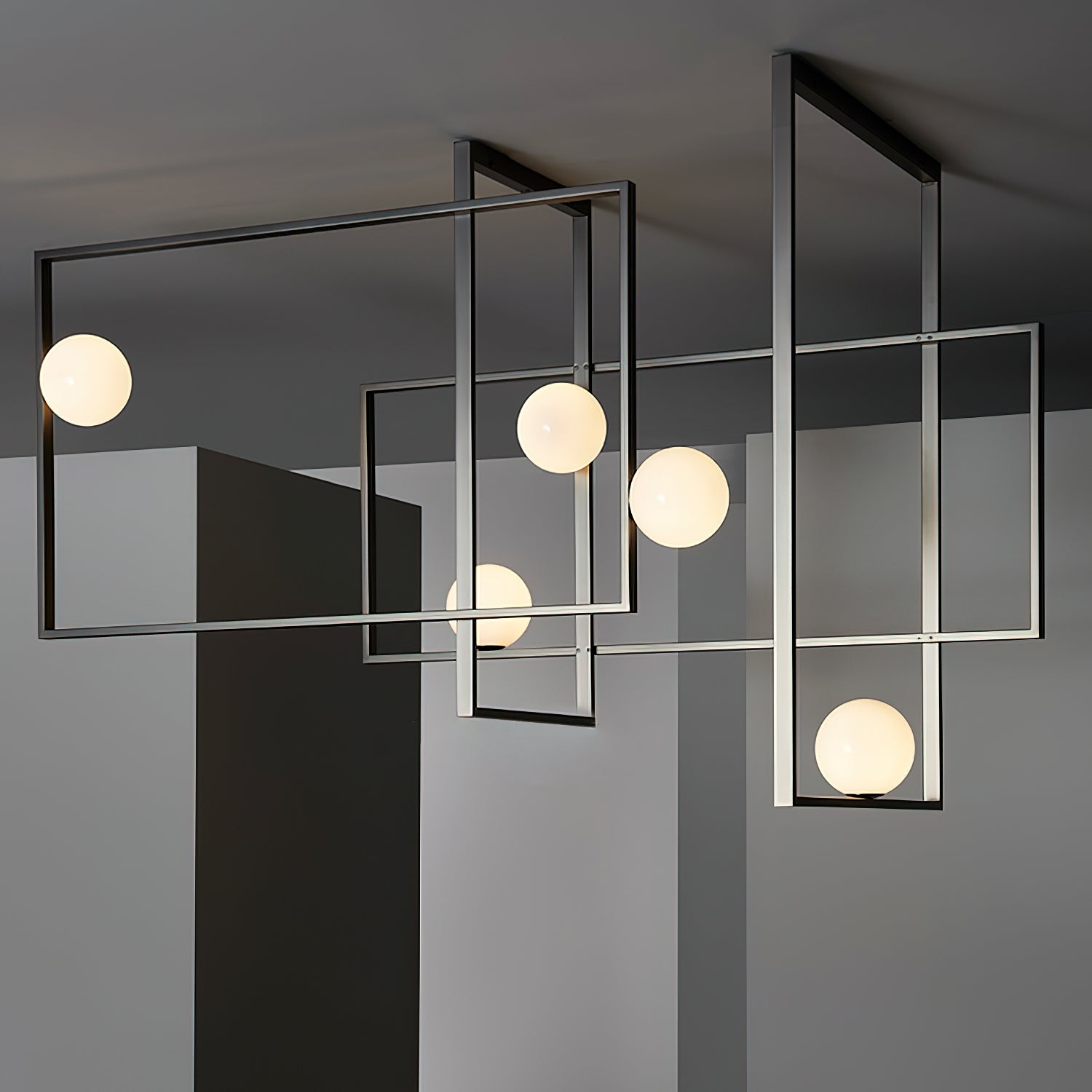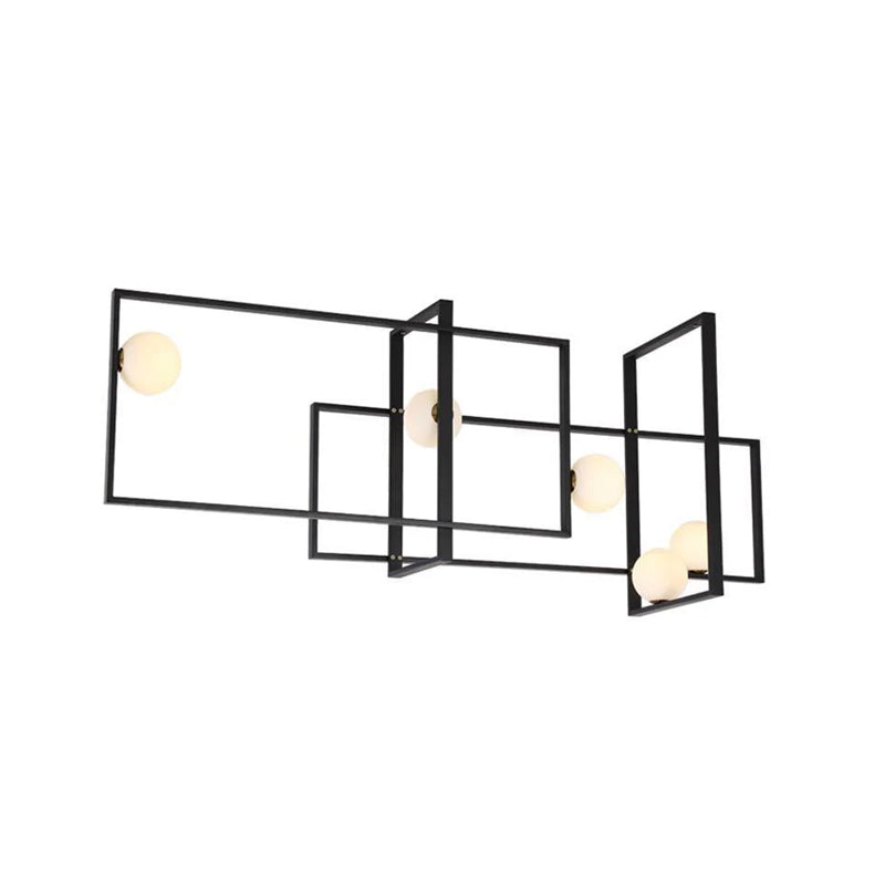 Elevate your living space with the Mondrian Rectangular Chandelier. Featuring five hand-blown white glass globes, this modern art chandelier will add a stylish touch to any room. Add a bold yet elegant element to your home decor. Add sparkle to your space with this eye-catching piece.