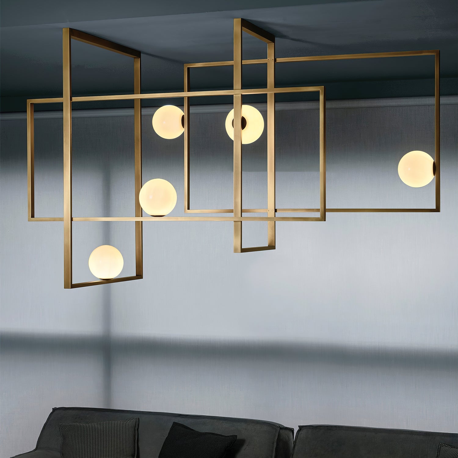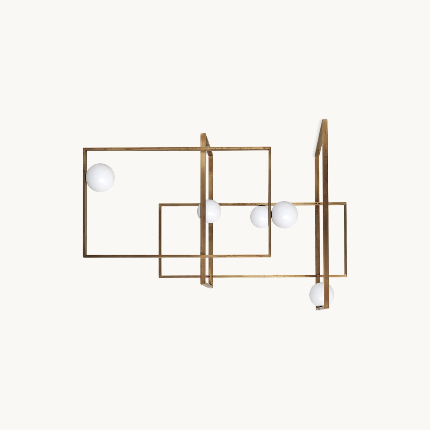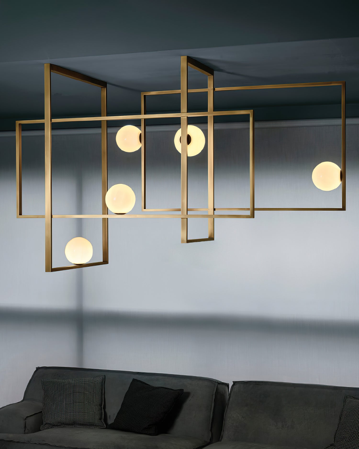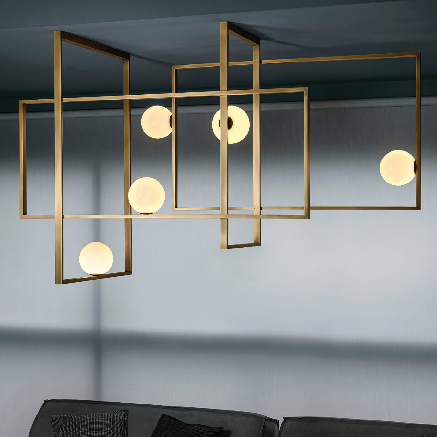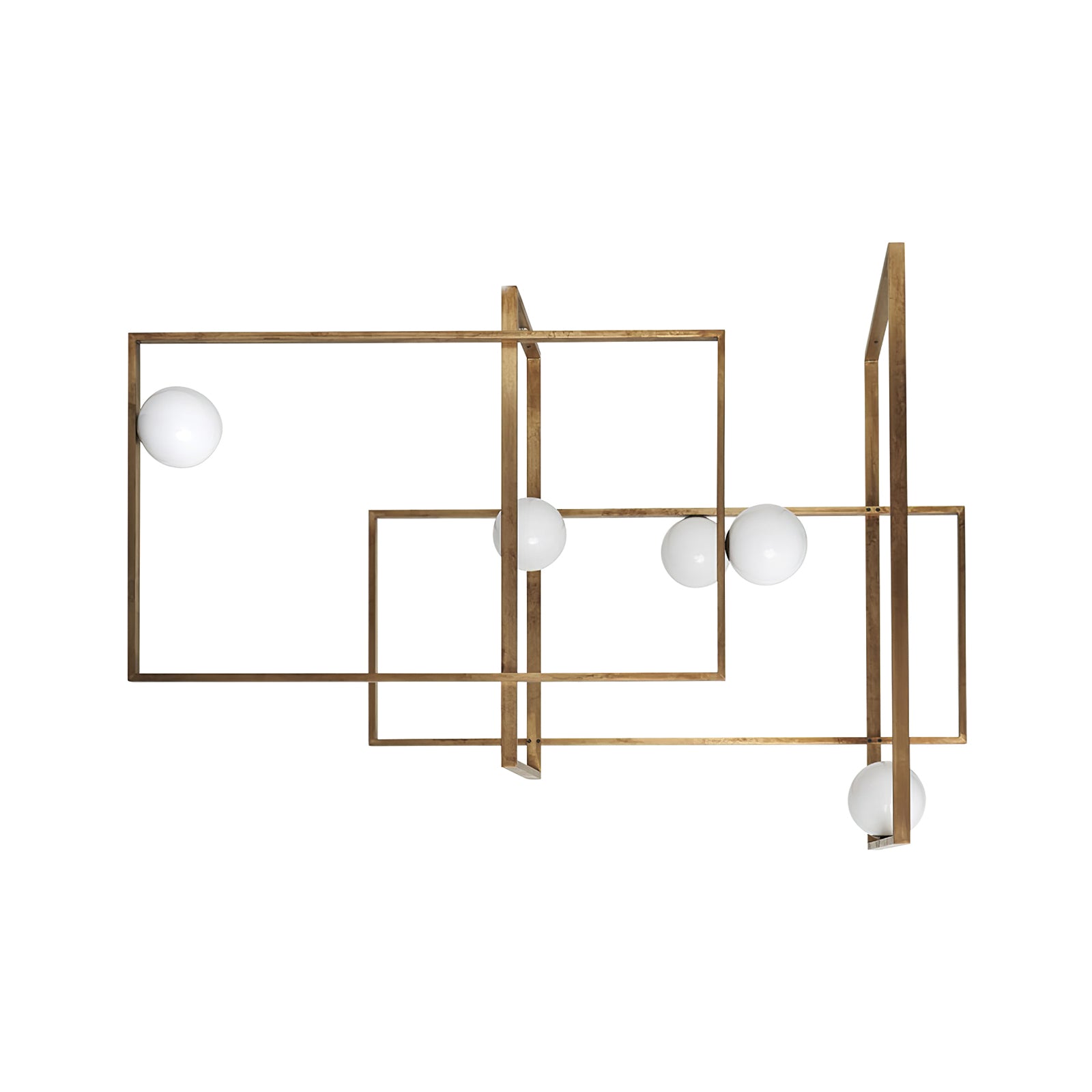 Elevate your living space with the Mondrian Rectangular Chandelier. Featuring five hand-blown white glass globes, this modern art chandelier will add a stylish touch to any room. Add a bold yet elegant element to your home decor. Add sparkle to your space with this eye-catching piece.