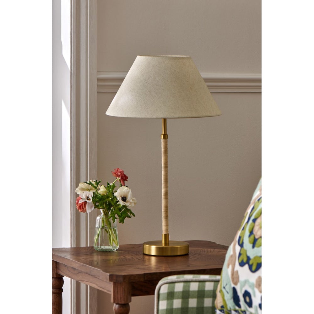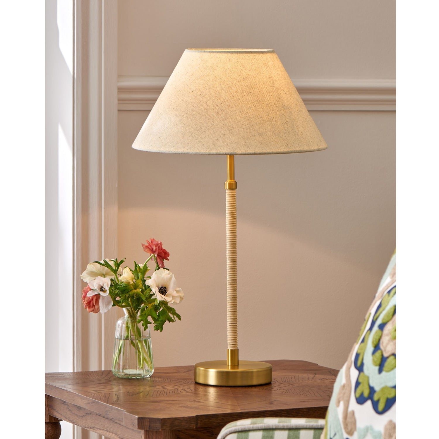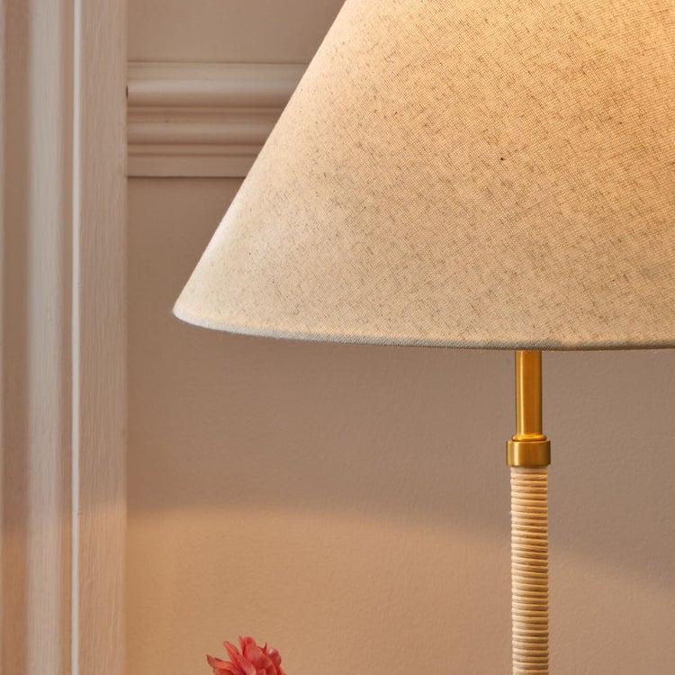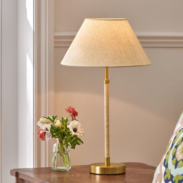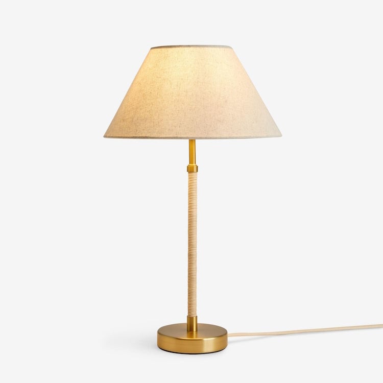 The Morgana Table Lamp by Mooijane features a chic metal frame paired with a linen-blend lampshade and elegant detailing wrapped around the base. Its warm, inviting light enhances any space, making it a stylish addition to bedrooms, living rooms, or offices.