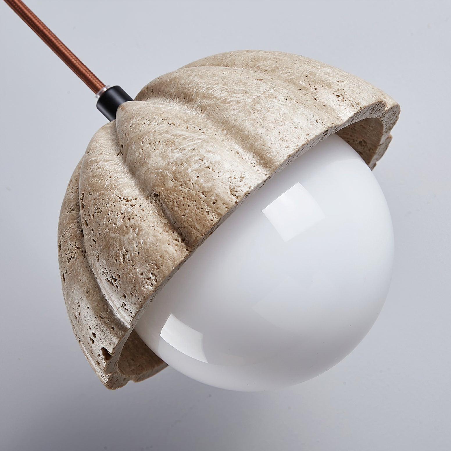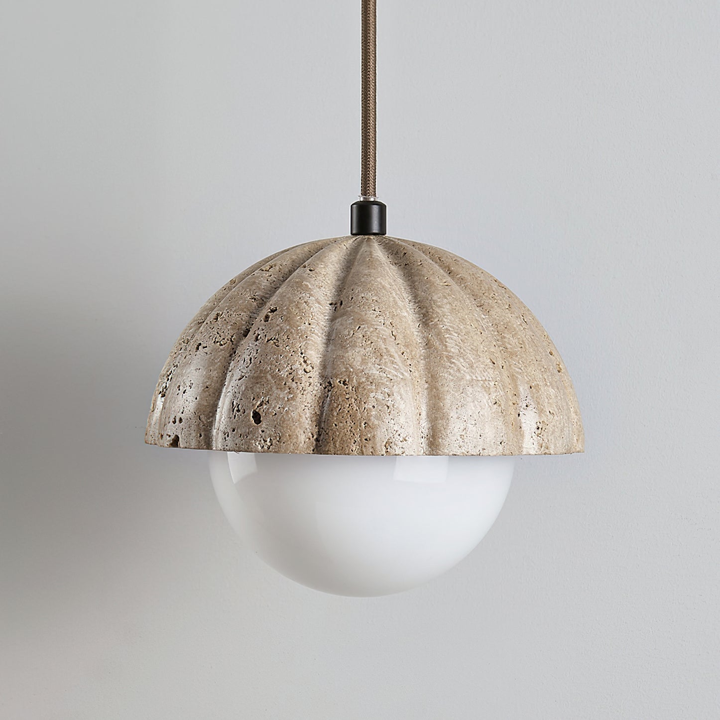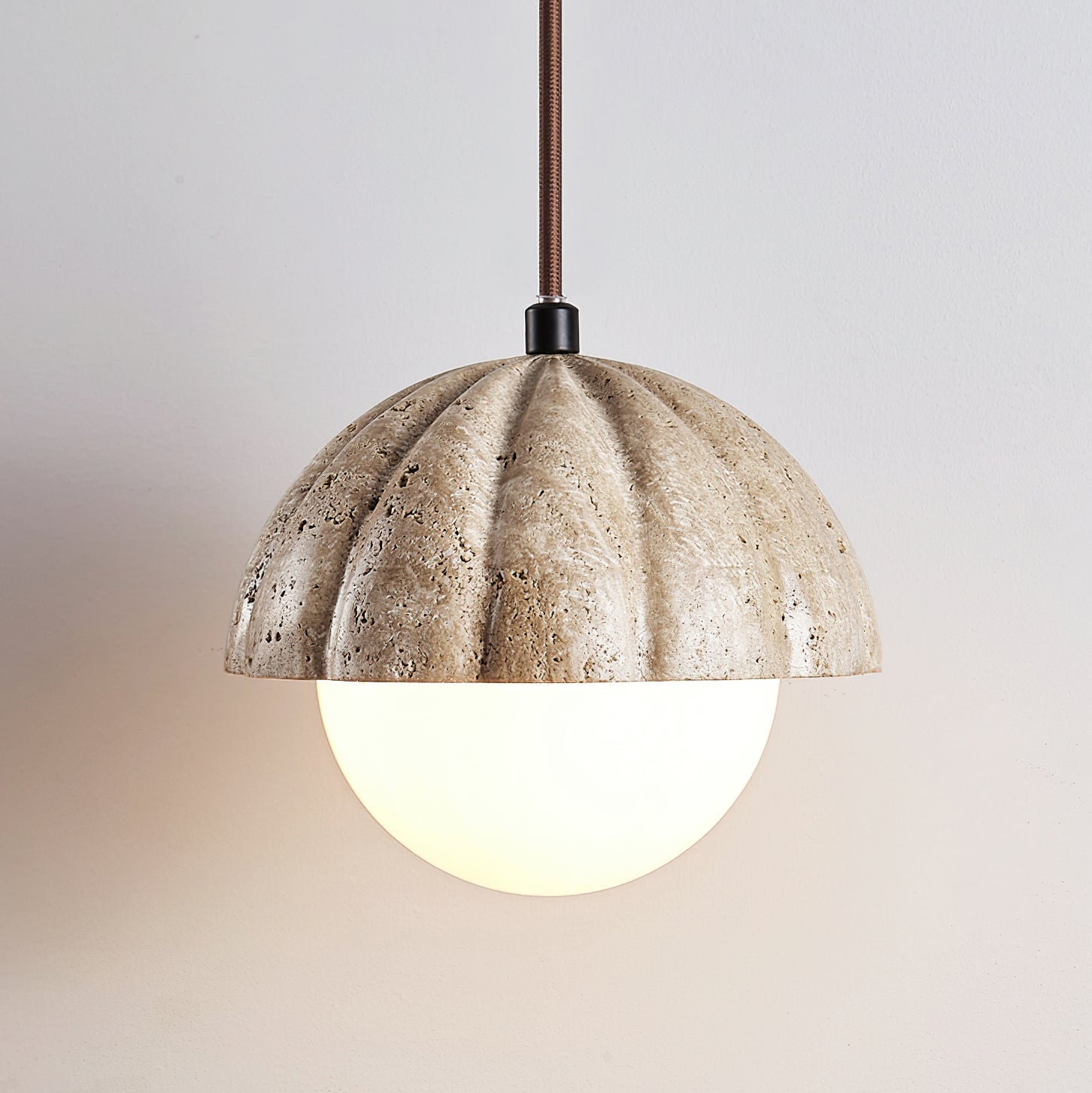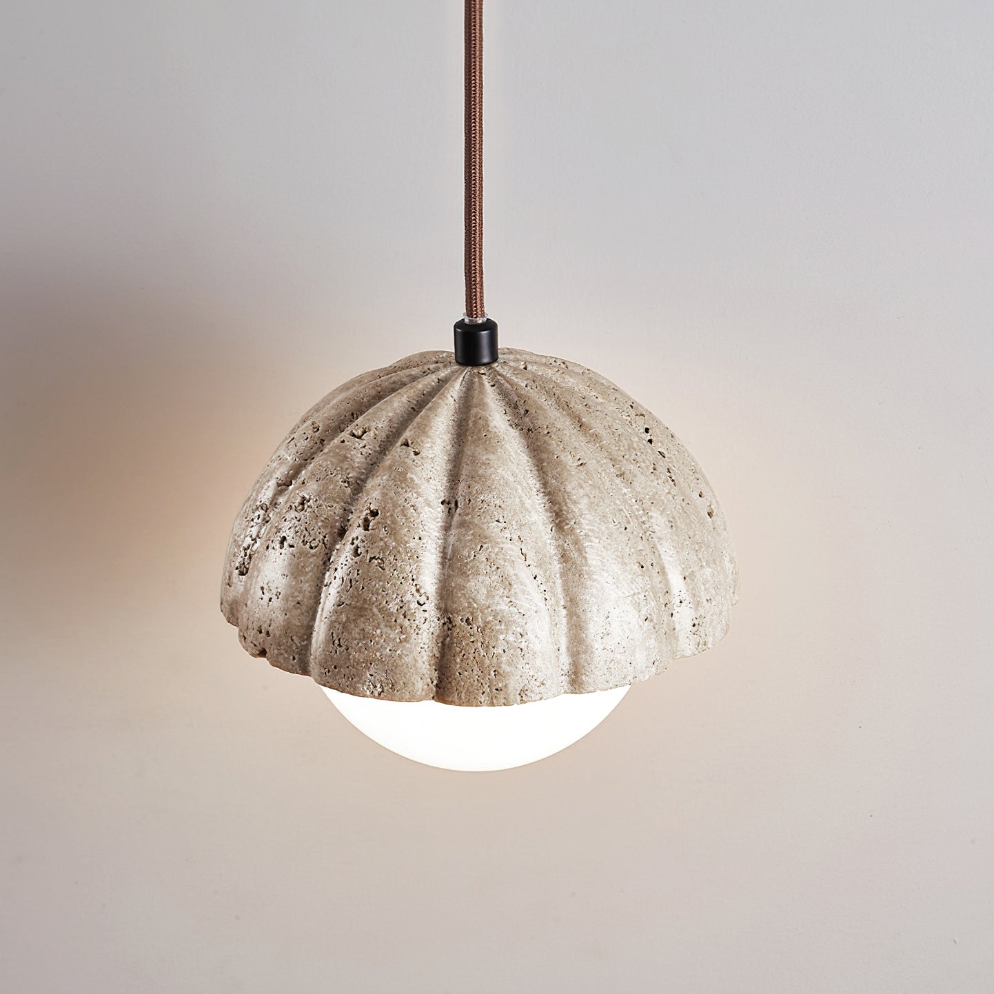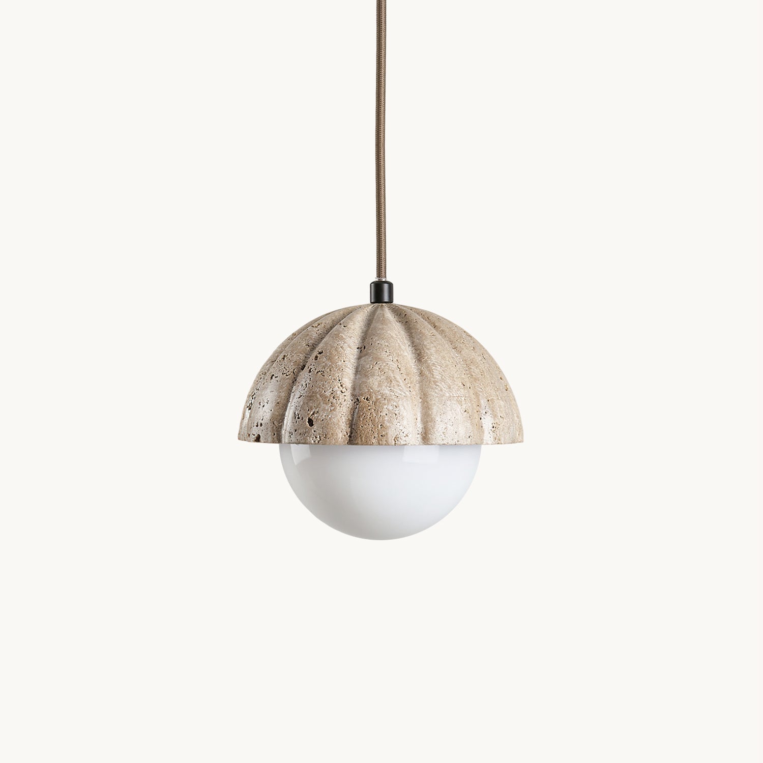 The Morphe Pendant Lamp by Mooijane beautifully balances natural texture and modern form. Featuring a carved travertine shade that retains the raw pores and character of the stone, it evokes the lightness of a seashell with a grounded, rustic feel. A round milky glass globe rests beneath, softly diffusing light and creating a warm, elegant contrast. Ideal for dining areas, entryways, or bedside settings, Morphe adds organic charm and a calming glow to any interior.