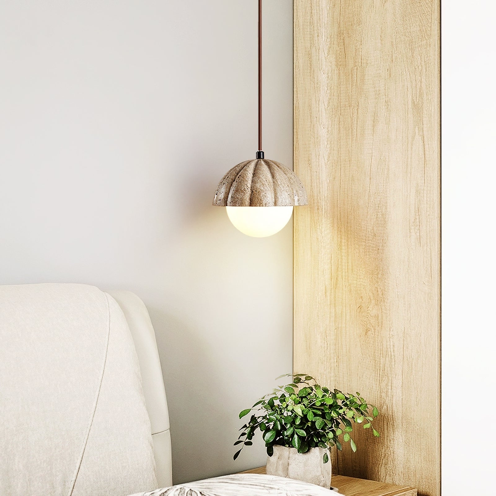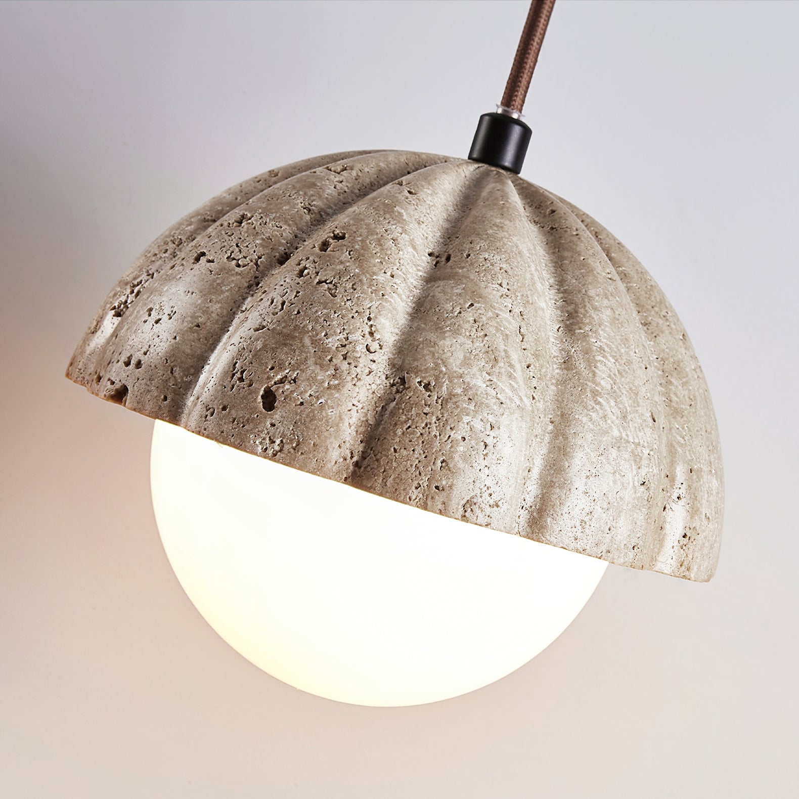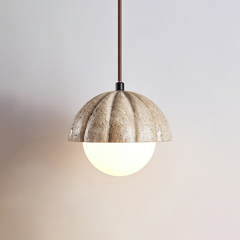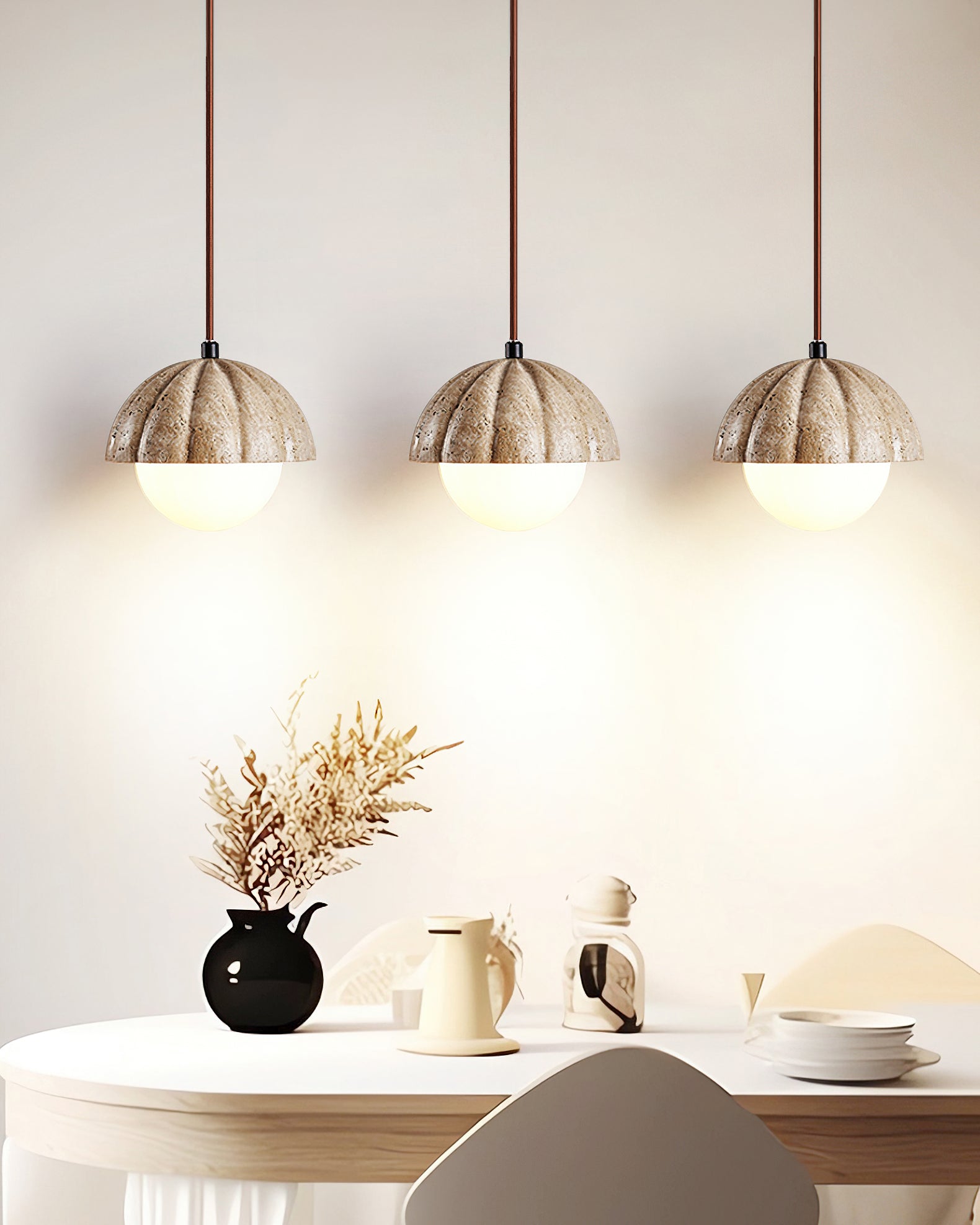 The Morphe Pendant Lamp by Mooijane beautifully balances natural texture and modern form. Featuring a carved travertine shade that retains the raw pores and character of the stone, it evokes the lightness of a seashell with a grounded, rustic feel. A round milky glass globe rests beneath, softly diffusing light and creating a warm, elegant contrast. Ideal for dining areas, entryways, or bedside settings, Morphe adds organic charm and a calming glow to any interior.
