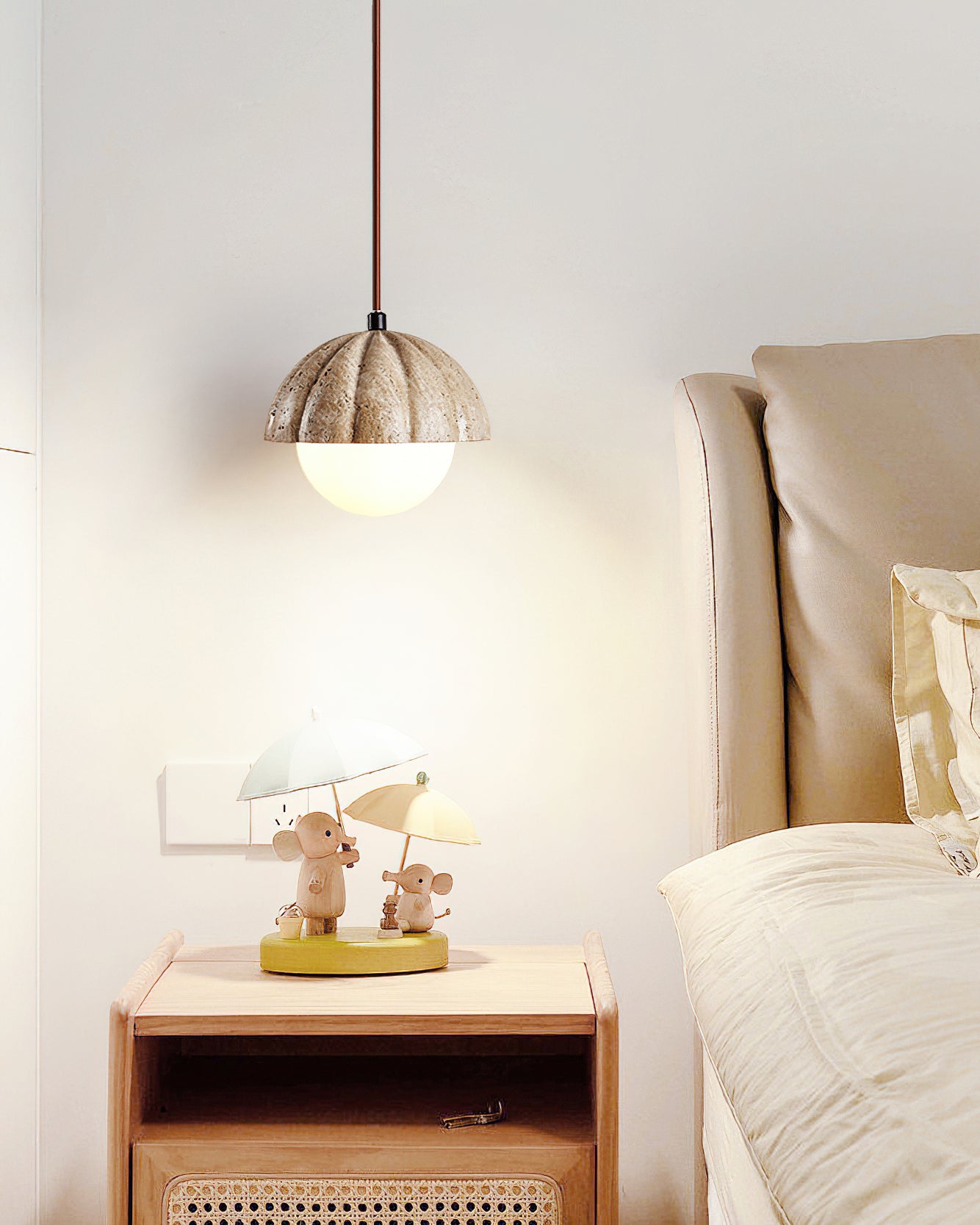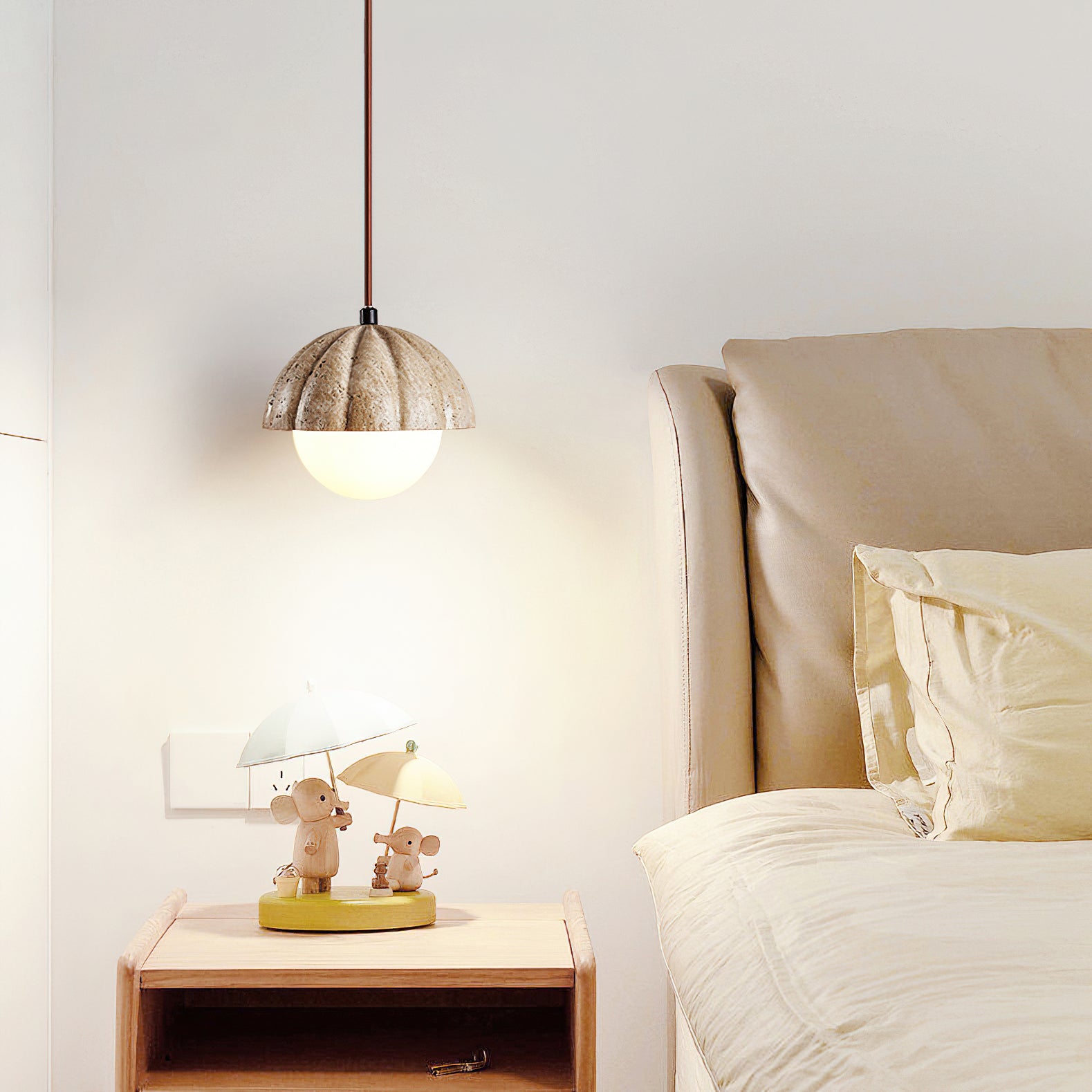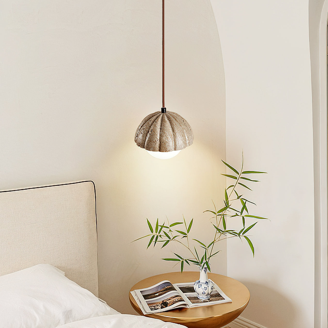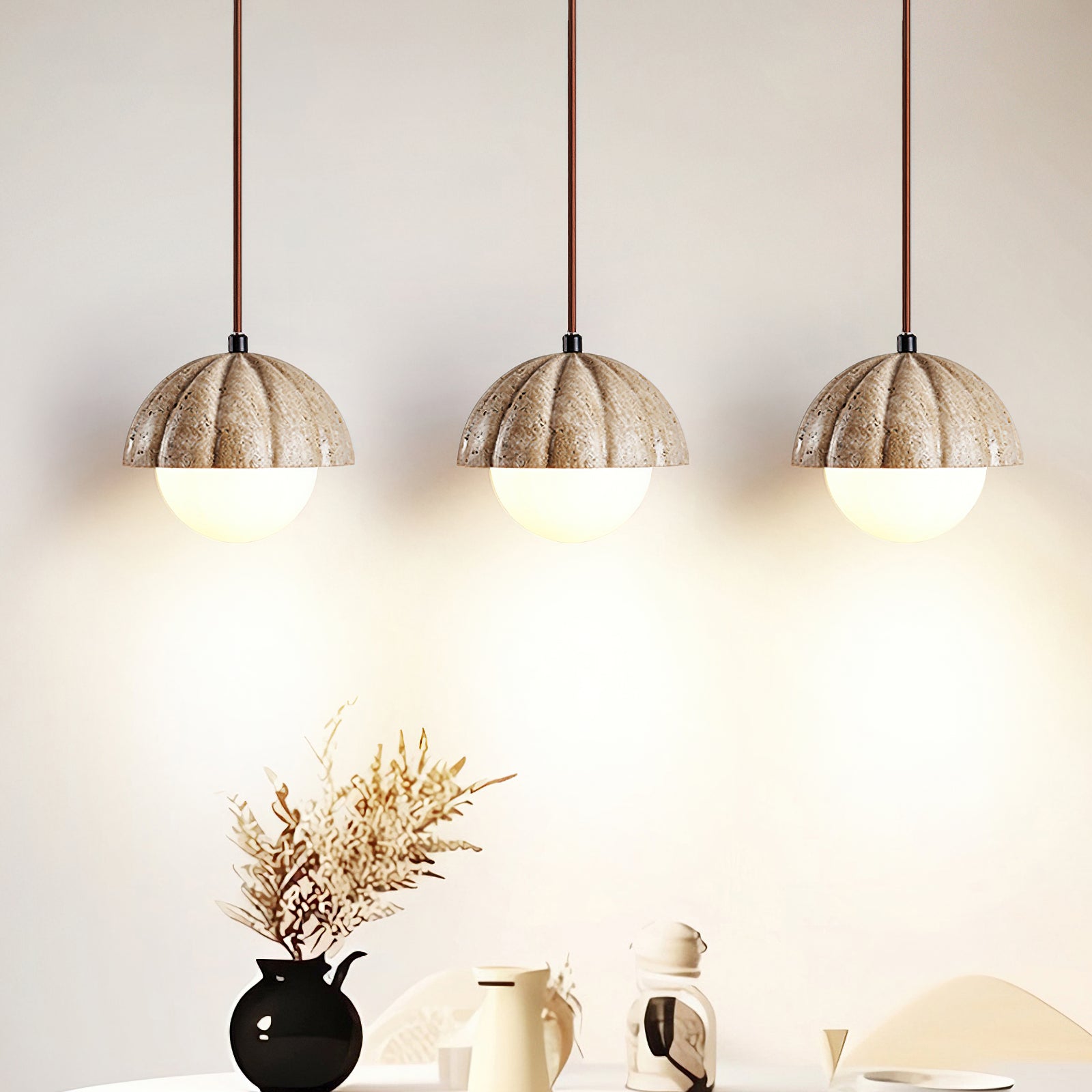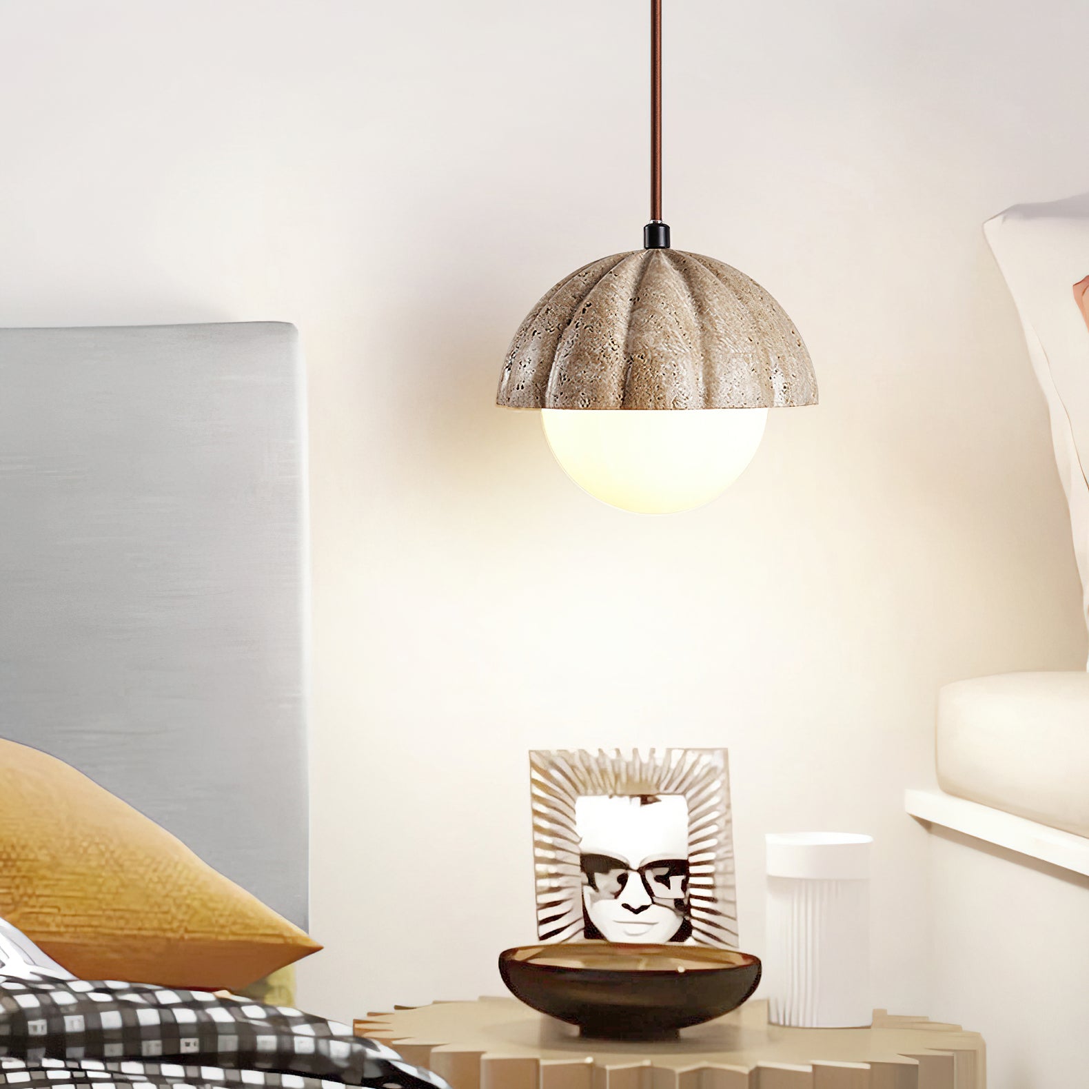 The Morphe Pendant Lamp by Mooijane beautifully balances natural texture and modern form. Featuring a carved travertine shade that retains the raw pores and character of the stone, it evokes the lightness of a seashell with a grounded, rustic feel. A round milky glass globe rests beneath, softly diffusing light and creating a warm, elegant contrast. Ideal for dining areas, entryways, or bedside settings, Morphe adds organic charm and a calming glow to any interior.