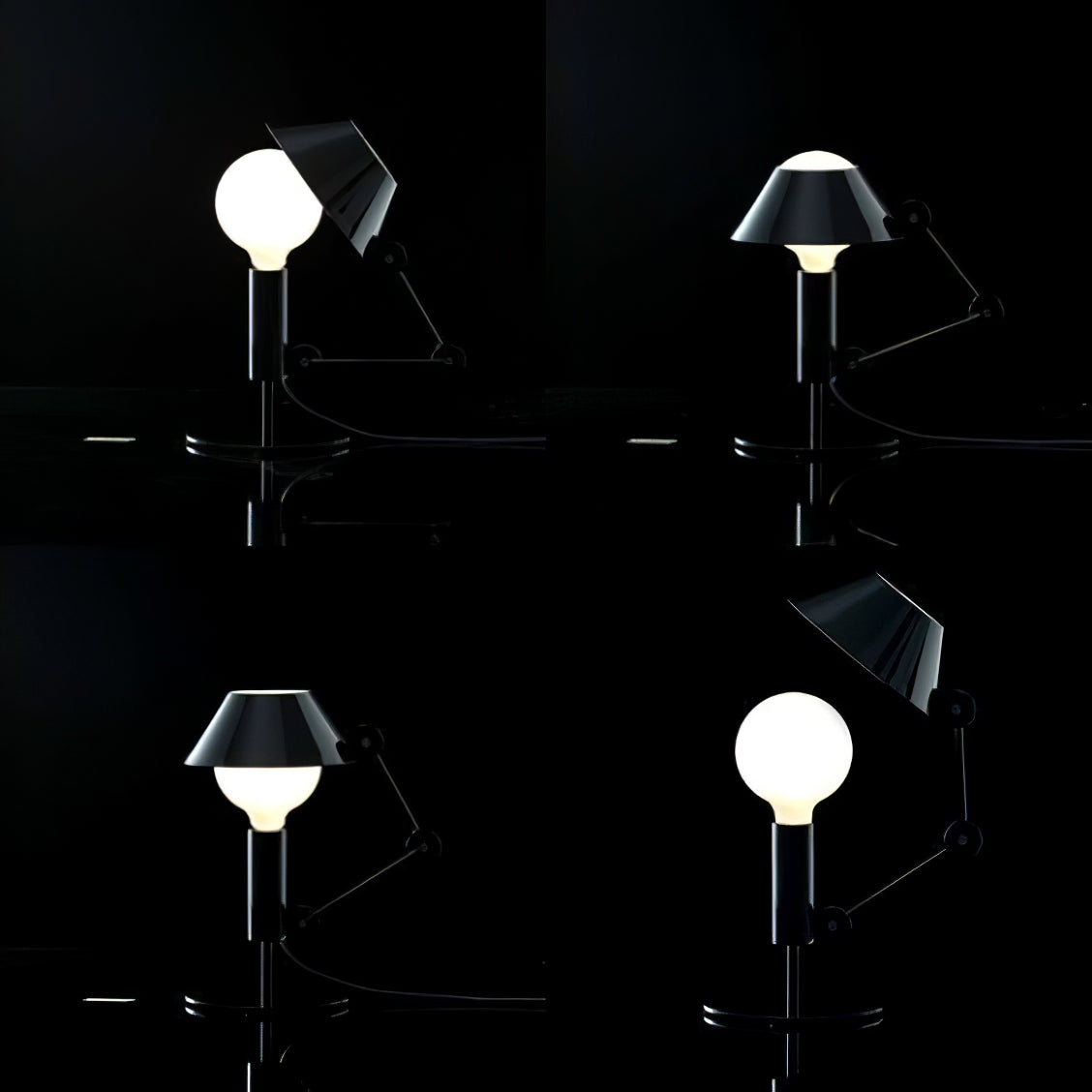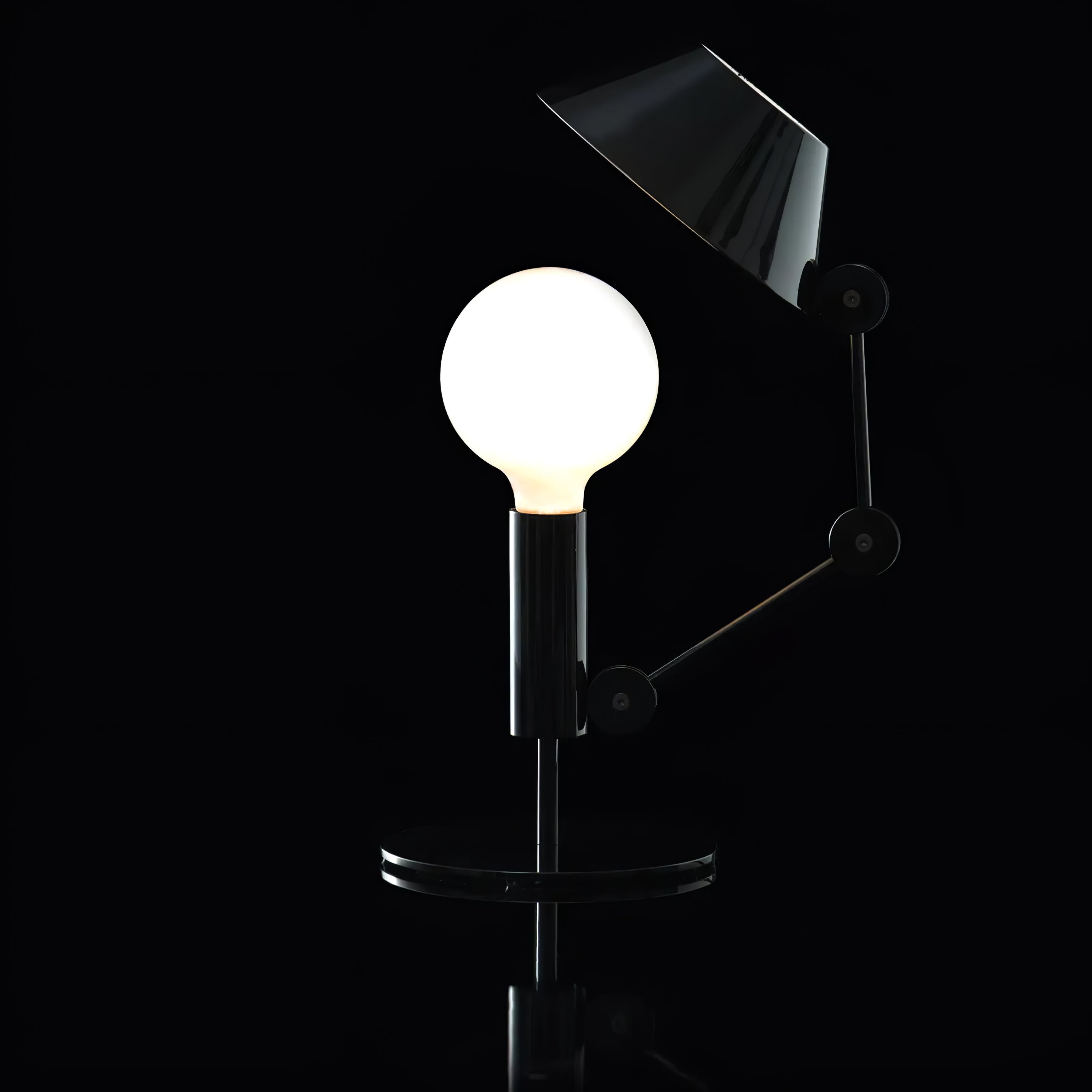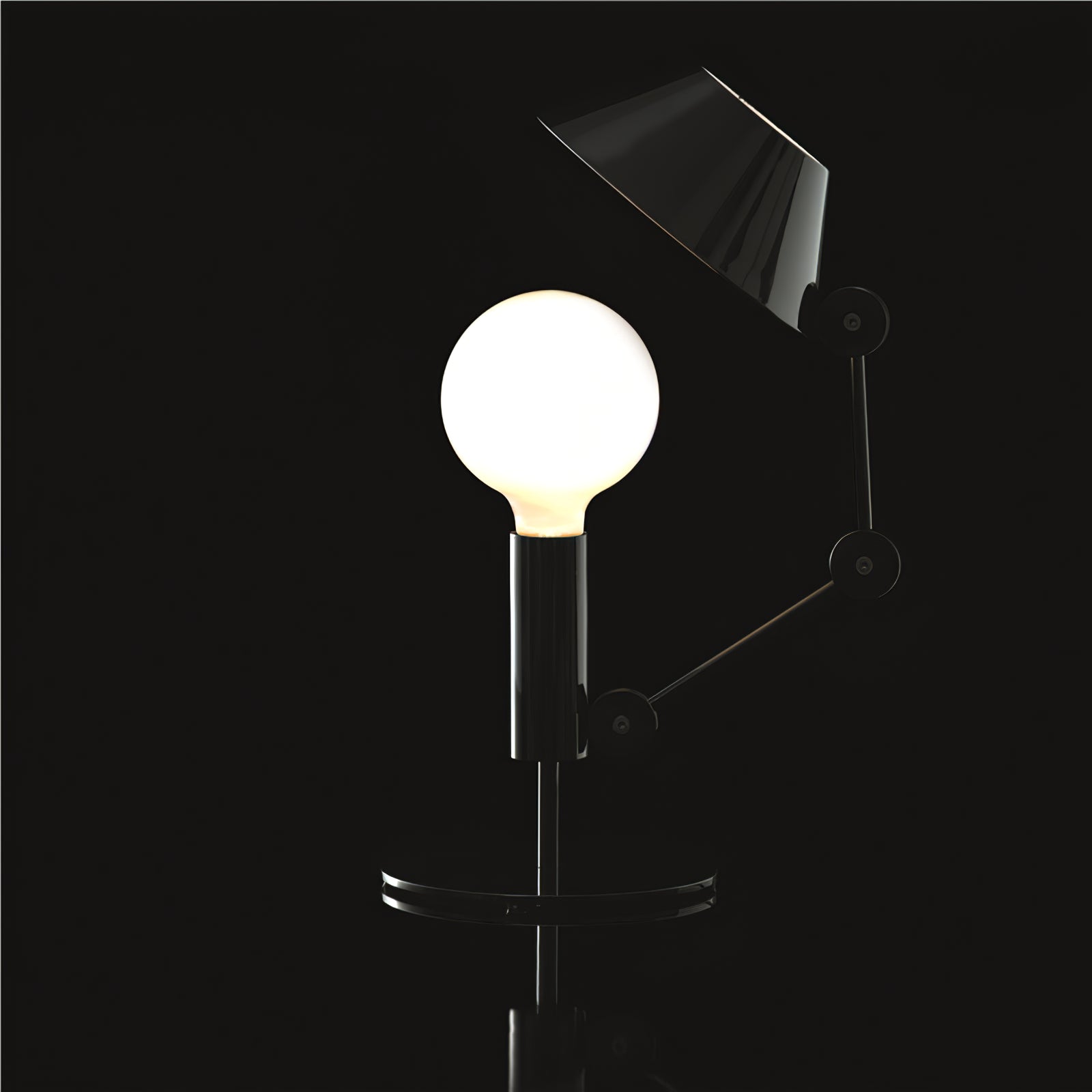 Graphic and playful table lamp made with an articulated arm and body in matt black metal. The two-tone lampshade with matt white interior creates a diffused light and provides the possibility of reducing the intensity of the light in the upper part thanks to the light bulb cover with the hat closure.