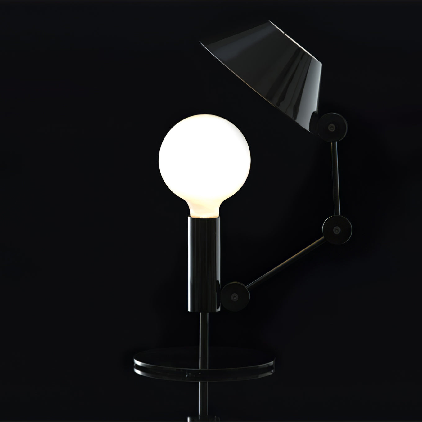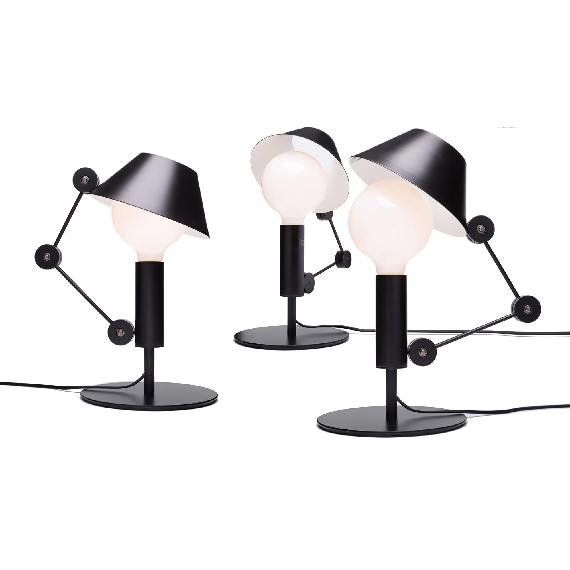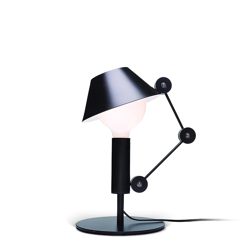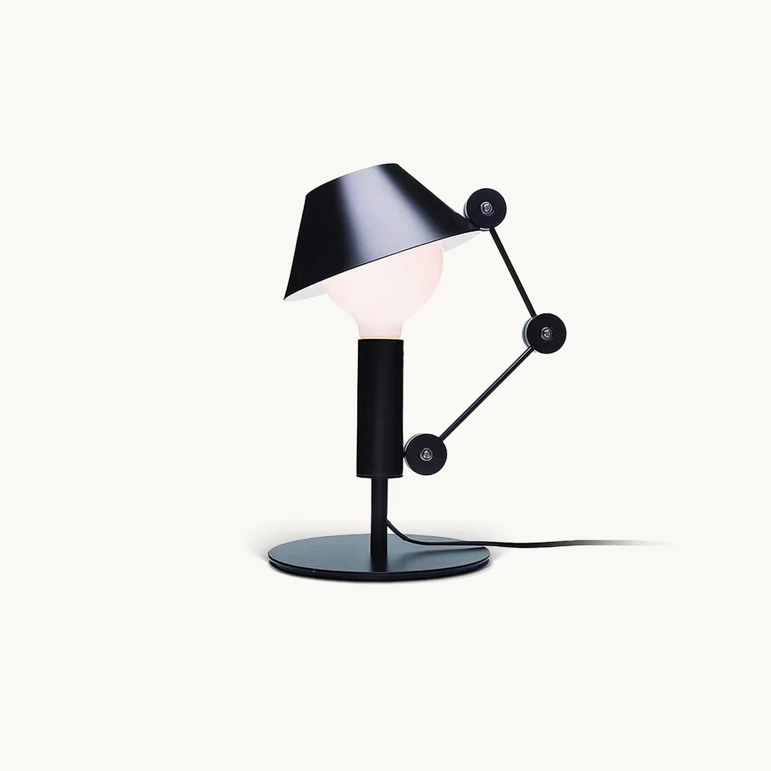MR. Light Table Lamp is a structured table lamp entirely in matt black painted metal. The articulated arm is equipped with three joints that regulate the mobility of the diffuser that shields a light source with E27 coupling and switch-on cable.