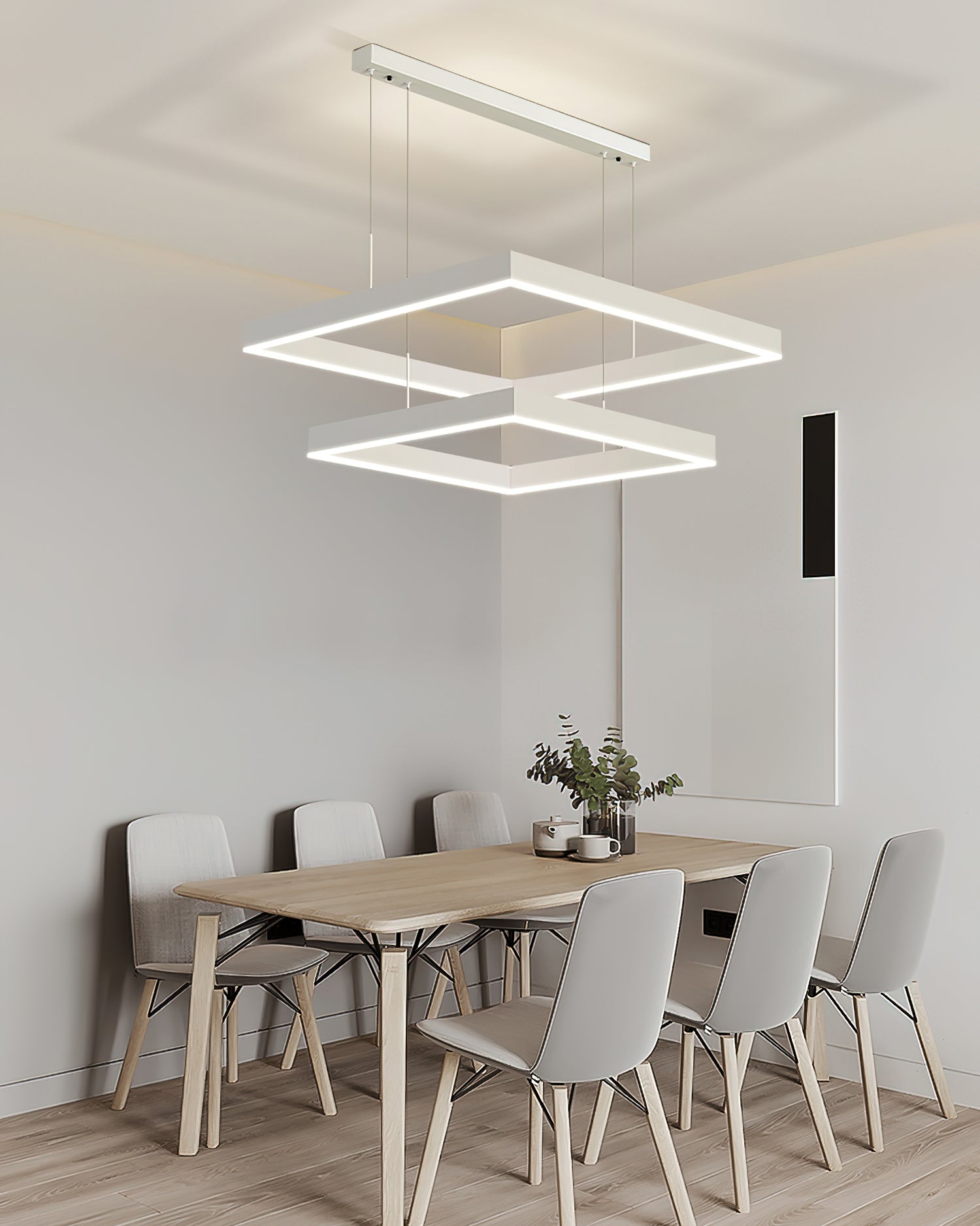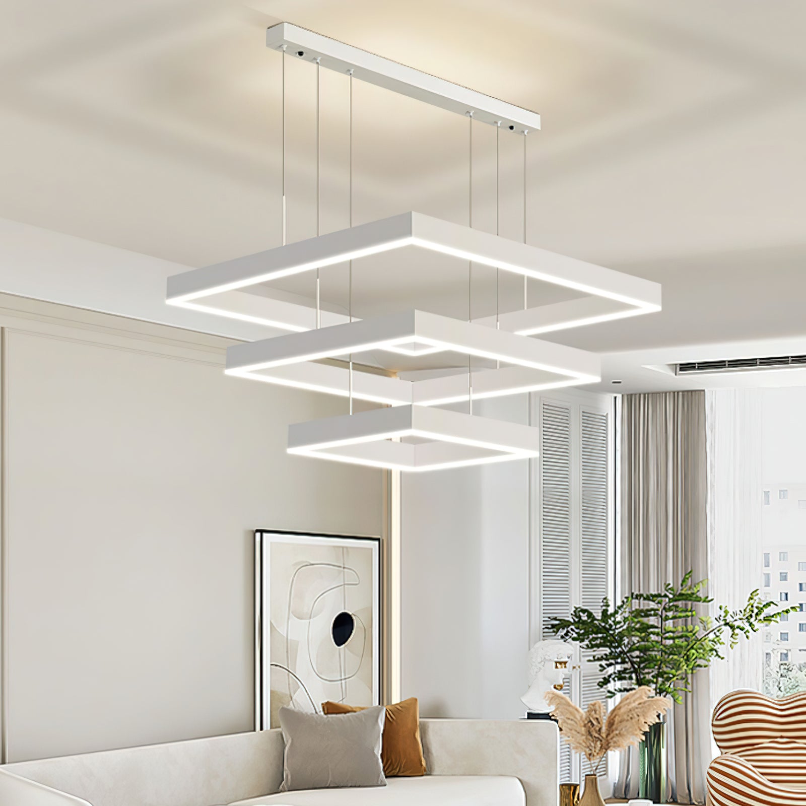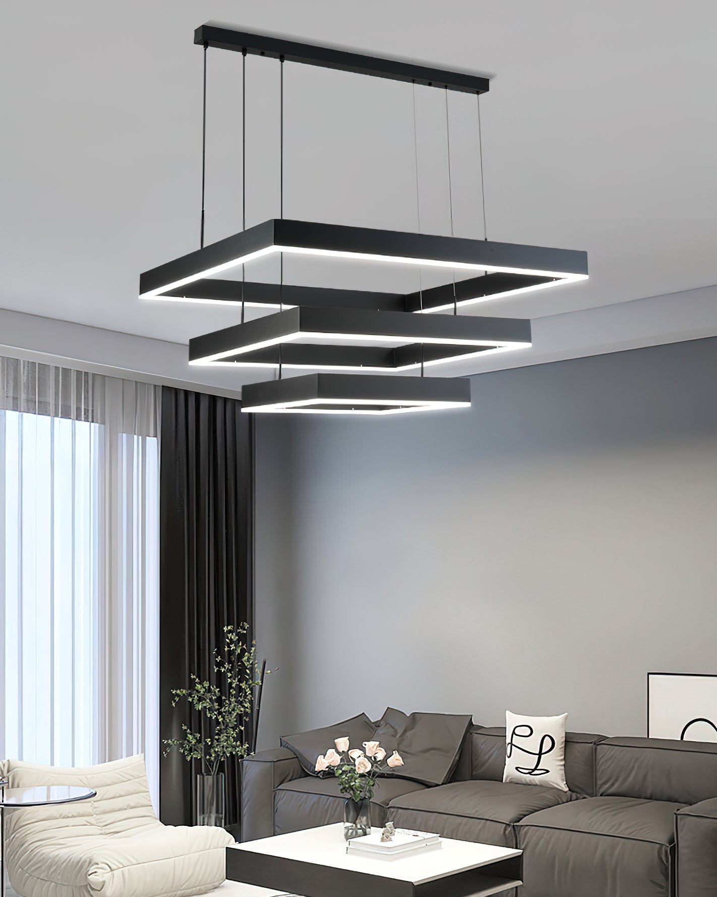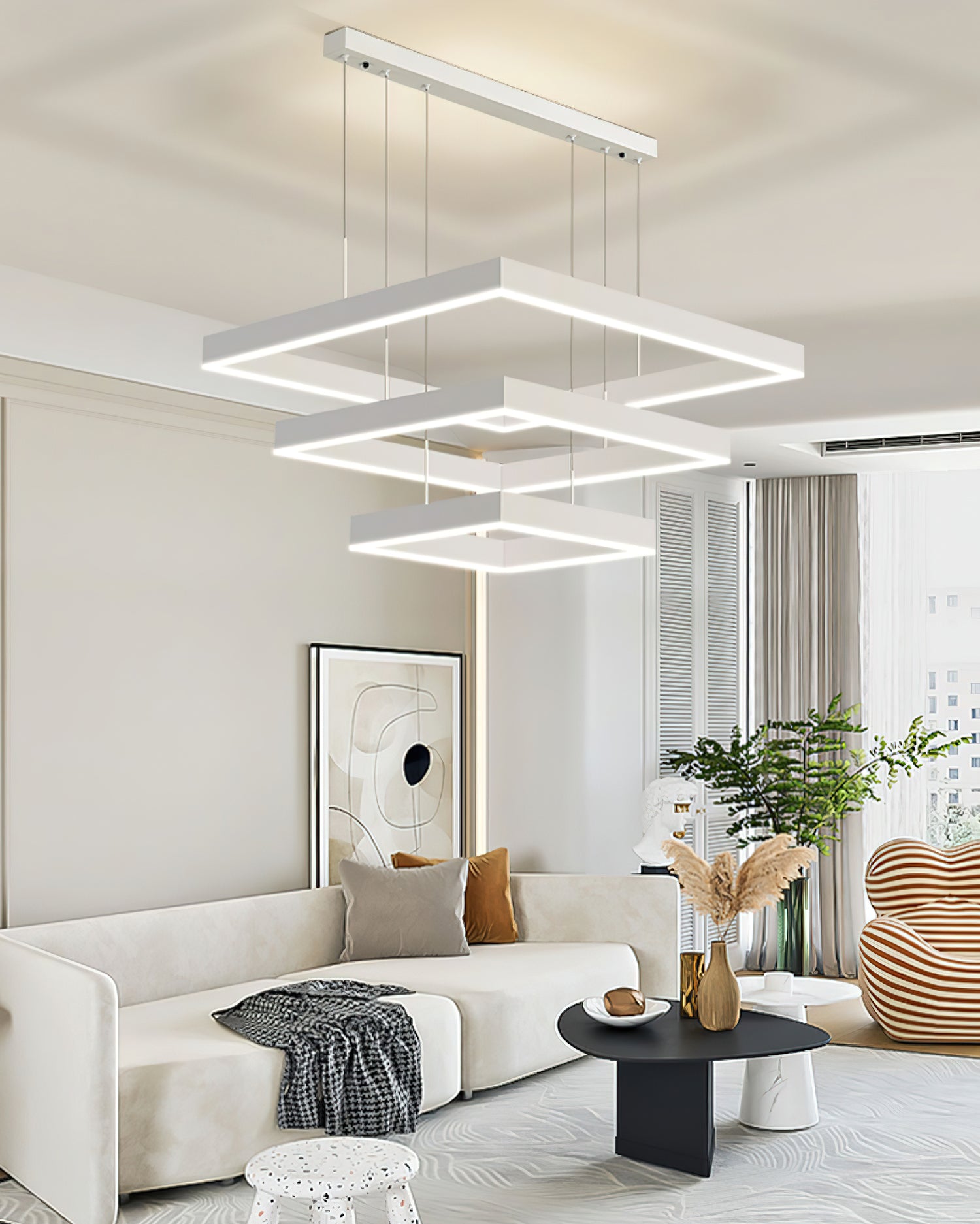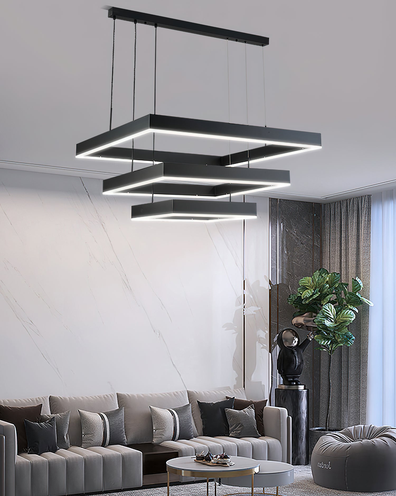 The Multi-tier Square Chandelier has built-in LED light sources to create a comfortable lighting environment. Its aluminum chassis has a durable matte texture, creating a modern and warm atmosphere. This chandelier has a simple and versatile design that complements any decoration. It is very suitable for adding a touch of fashion to the home and living room, dining room, bedroom, and office.