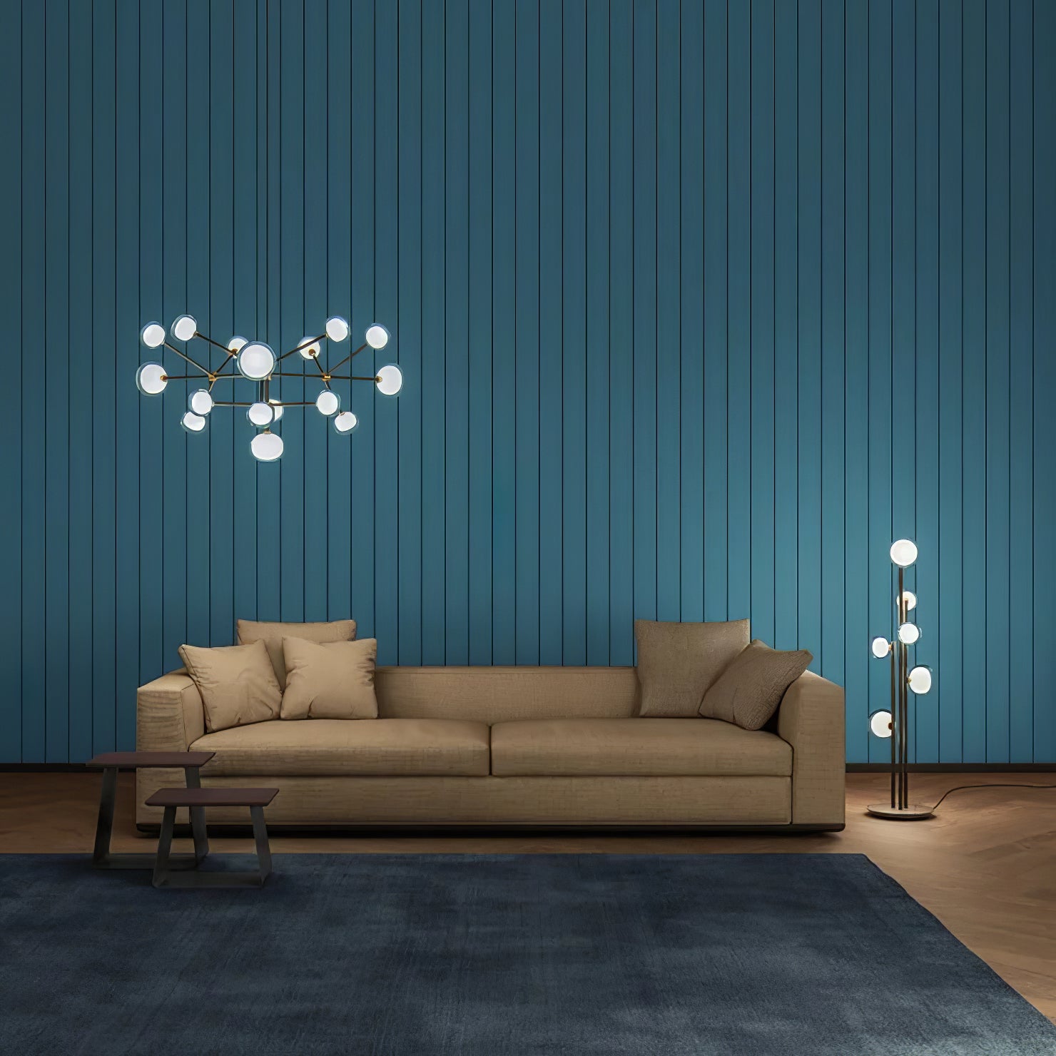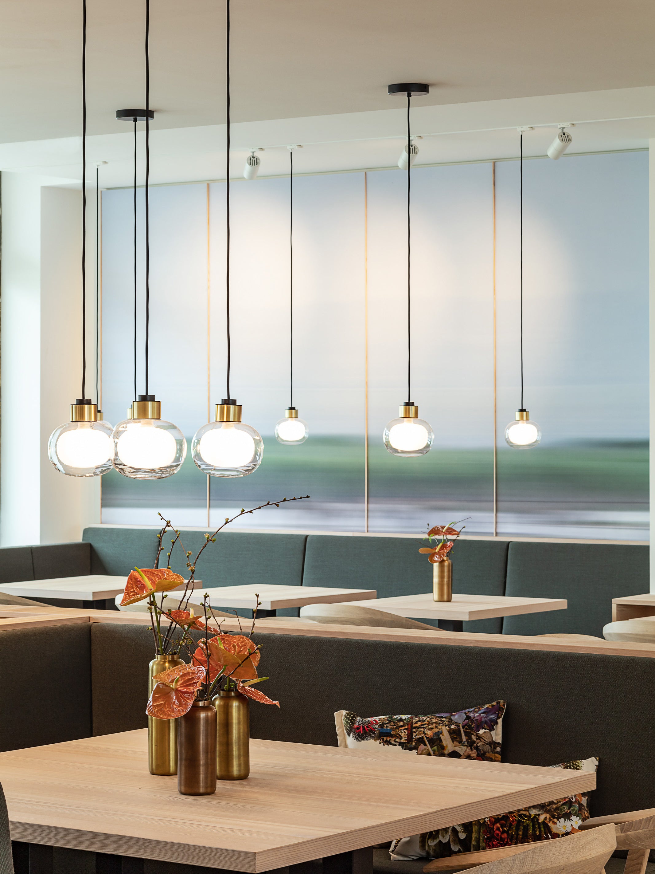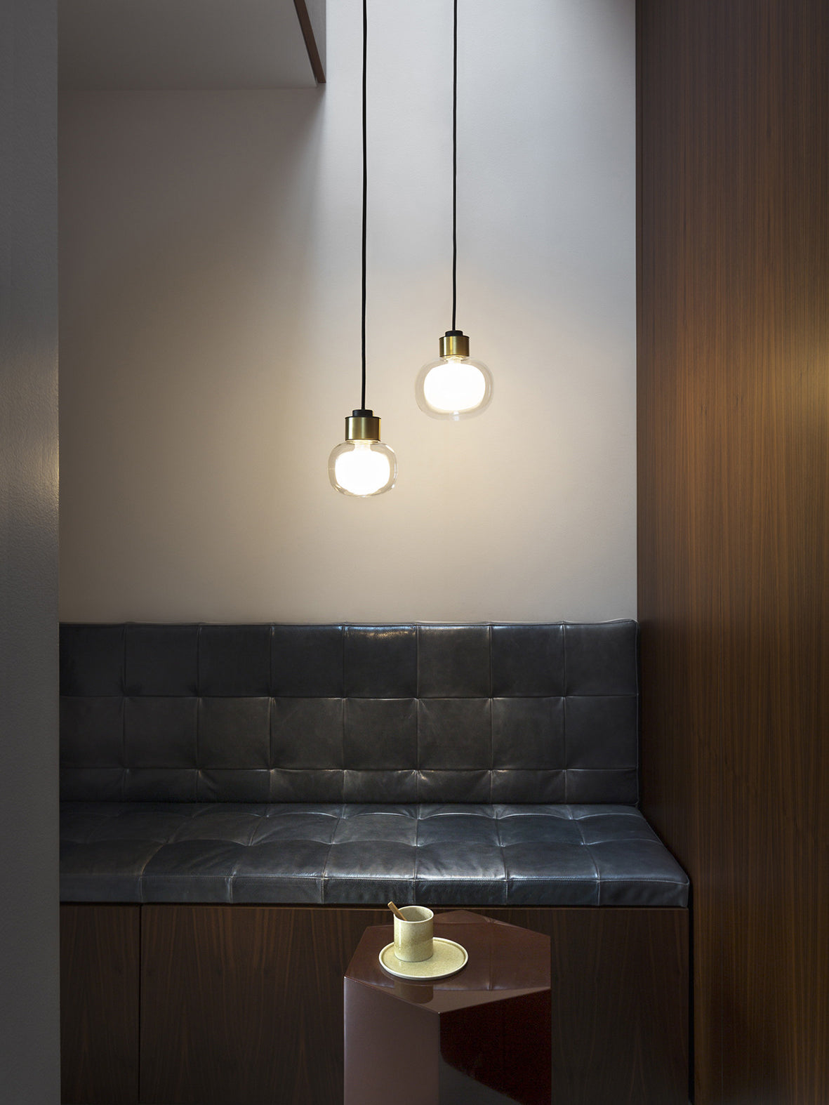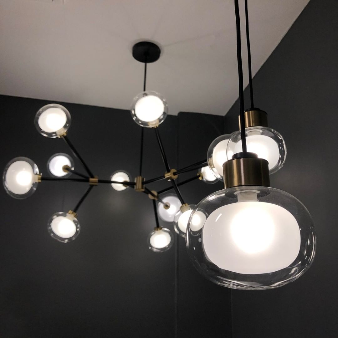 The Nabila Pendant Light's elegant sophistication is inspired by the 1950s pursuit of outer space. Modeled off of the Sputnik, Nabila's double-sided spherical frame in Matte Black with Black Chrome accents and Smoke borosilicate glass discs or Matte Black with Brushed Brass and Clear borosilicate glass discs brings a unique touch to a contemporary interior. Place in the entryway or over the dining table to complete your aesthetic.