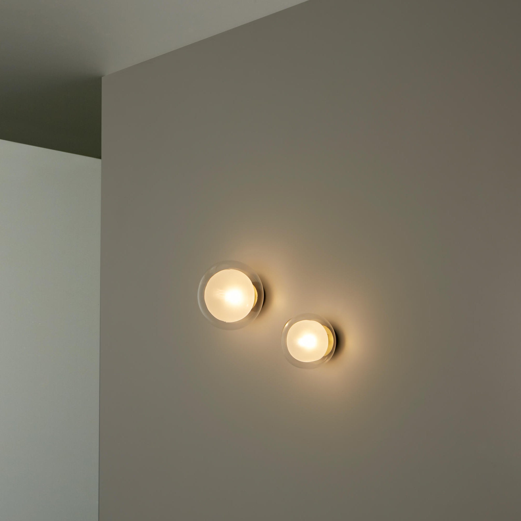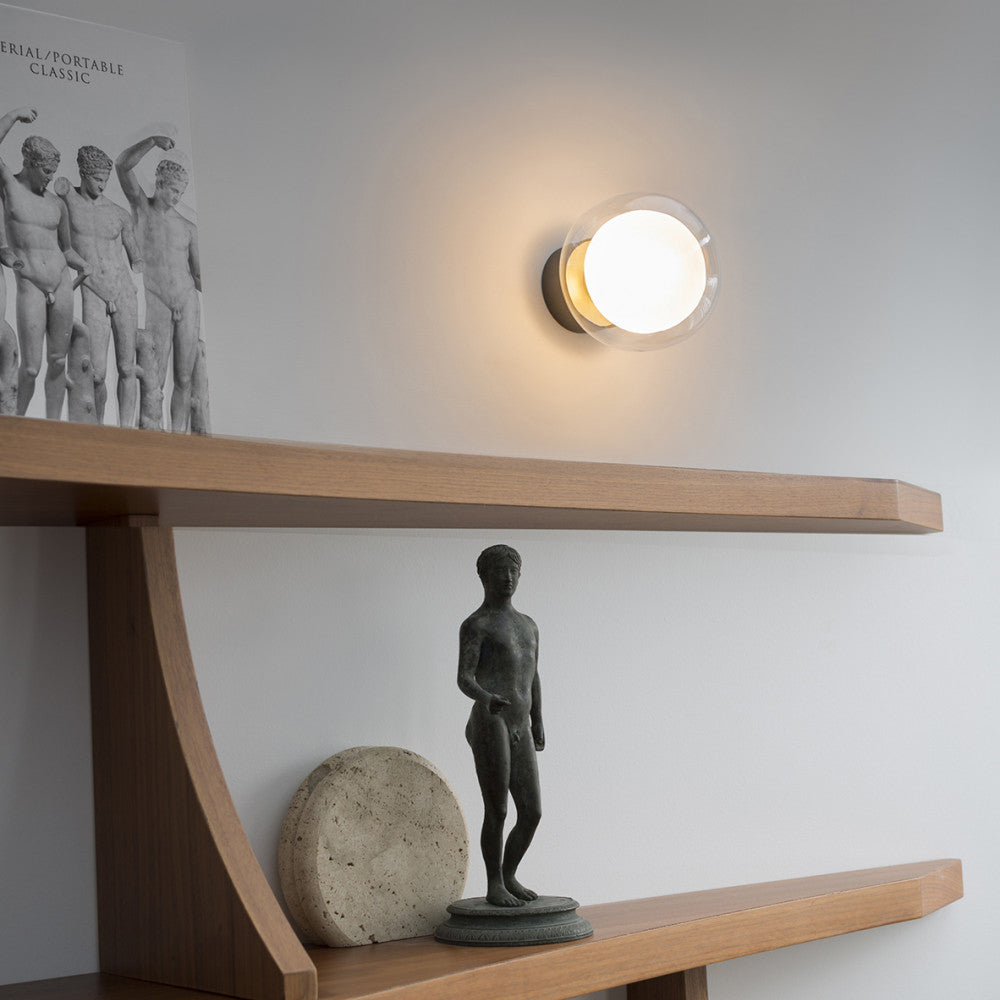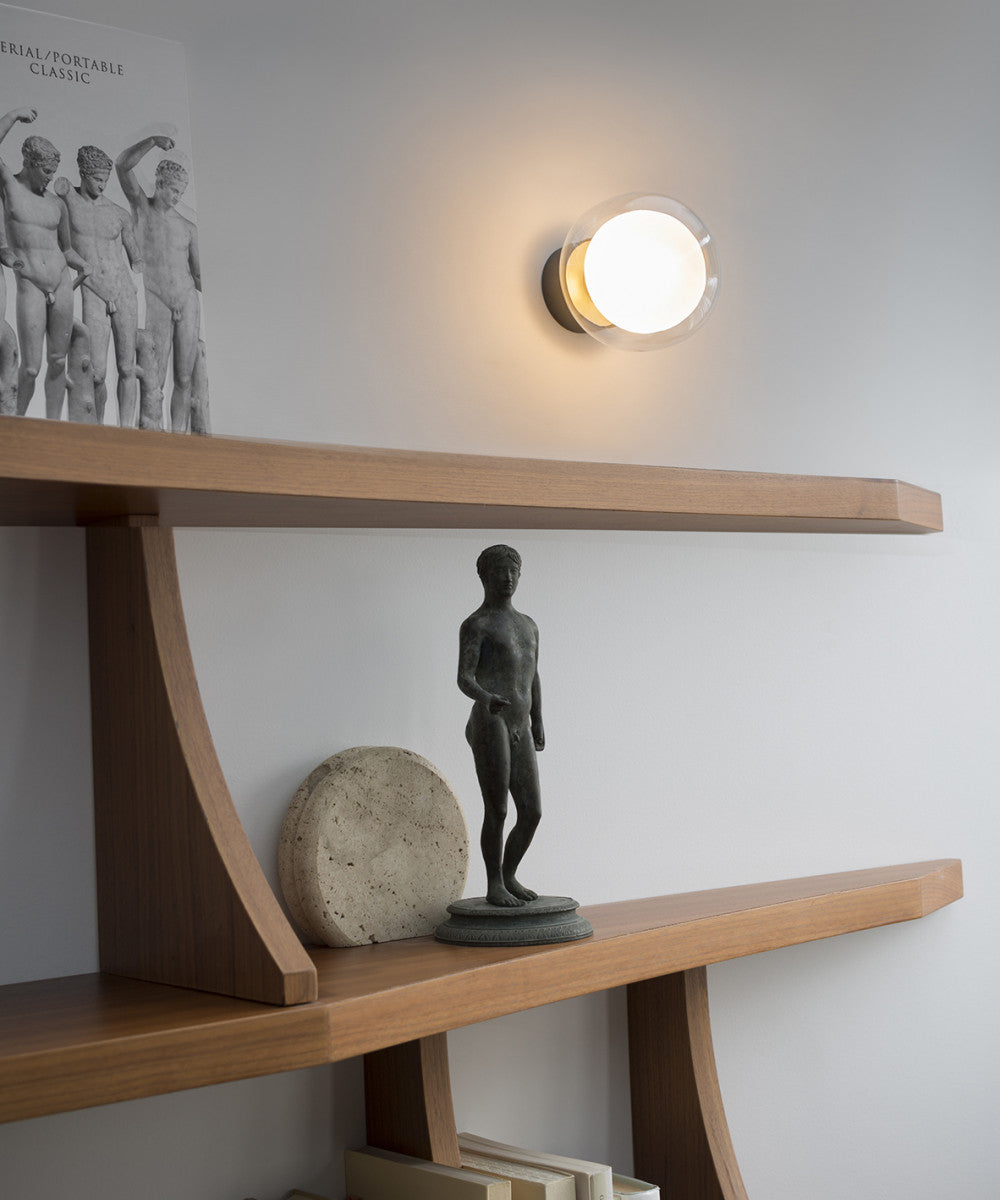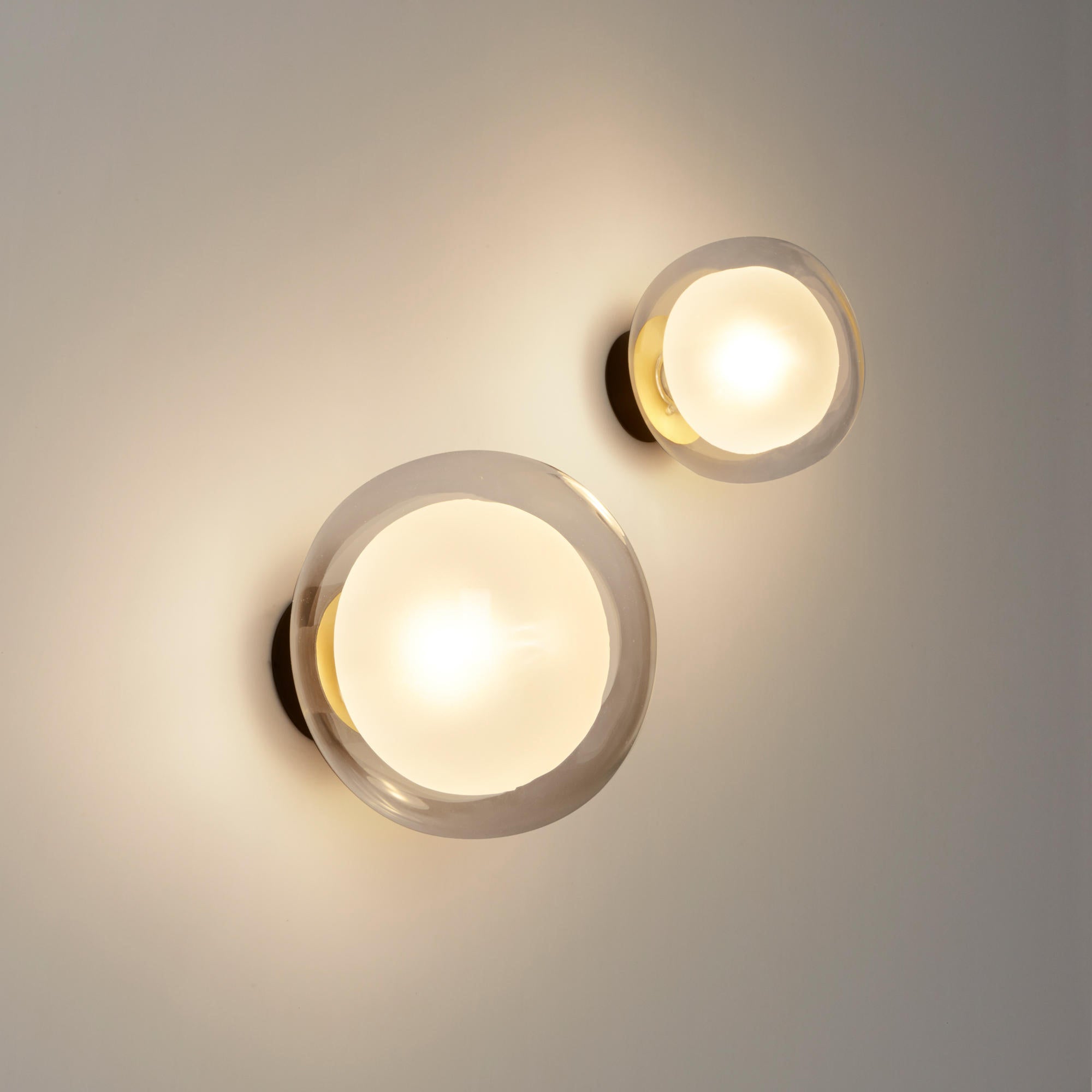 The Nabila Wall Lamp's elegant sophistication is inspired by the 1950s pursuit of outer space. Modeled off of the Sputnik, Nabila's double-sided spherical frame in Matte Black with Black Chrome accents and Smoke borosilicate glass discs or Matte Black with Brushed Brass and Clear borosilicate glass discs brings a unique touch to a contemporary interior. Place in the entryway or over the dining table to complete your aesthetic.