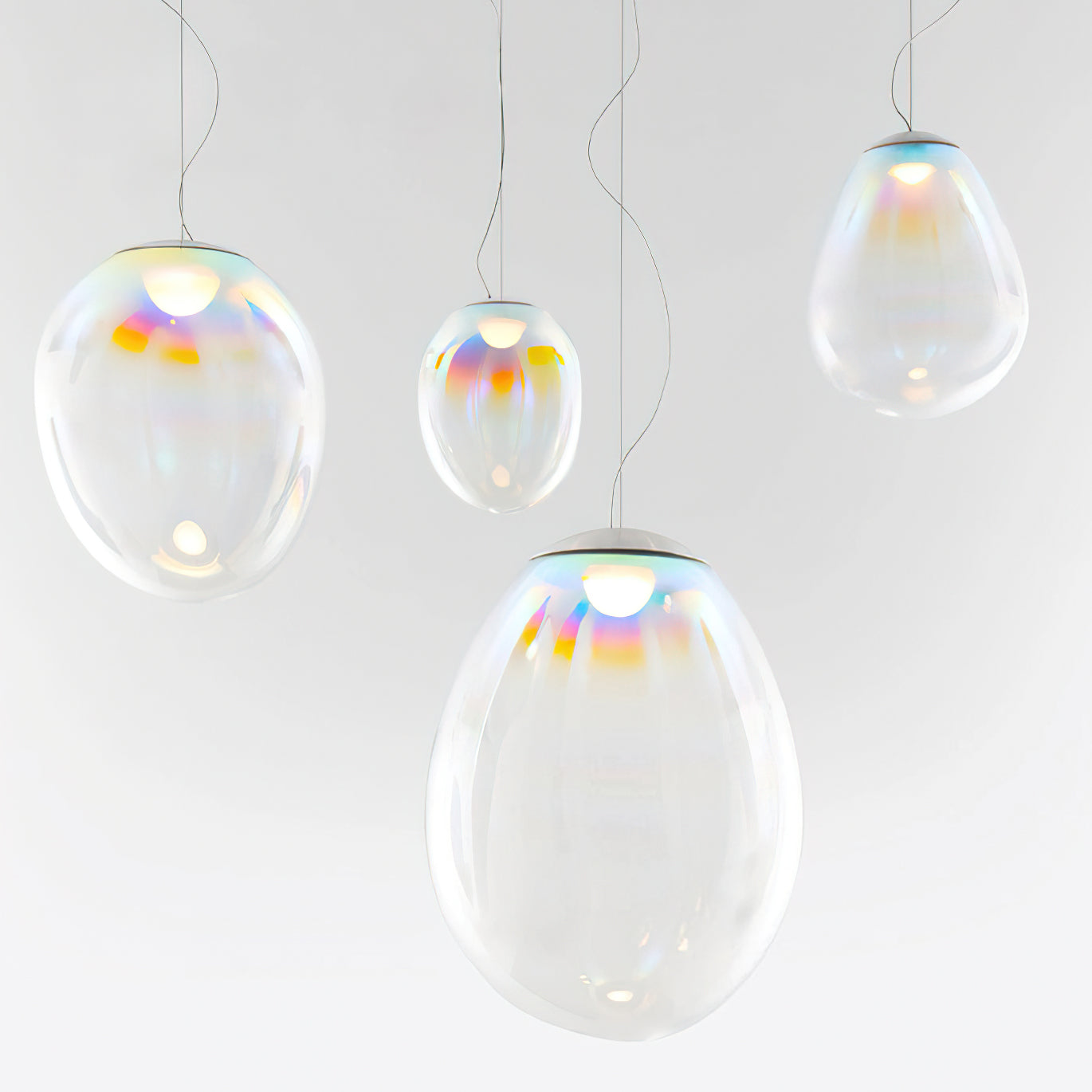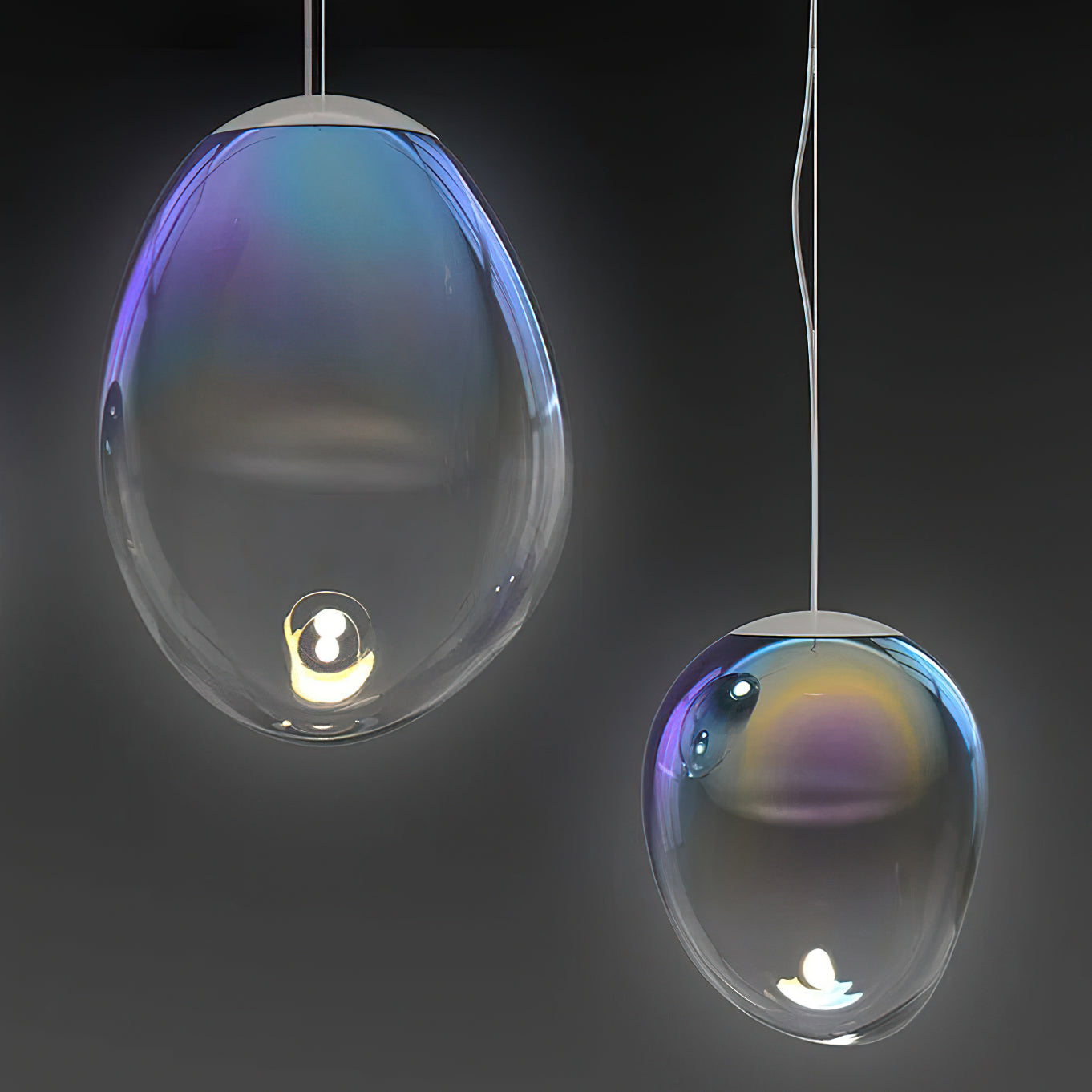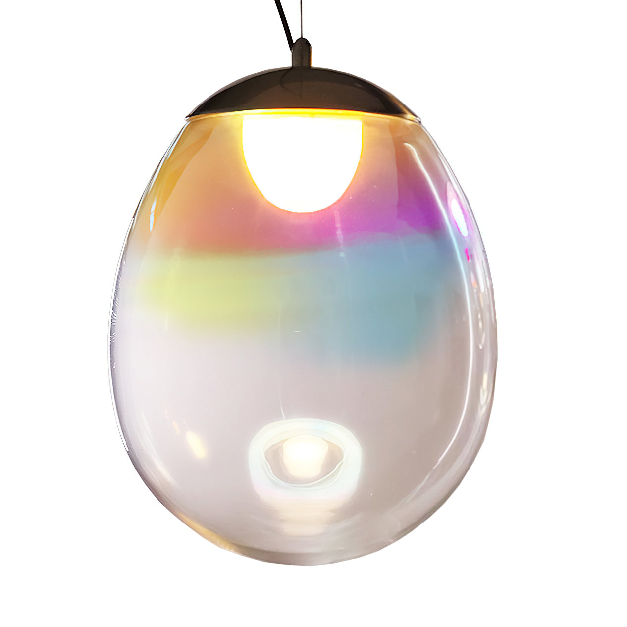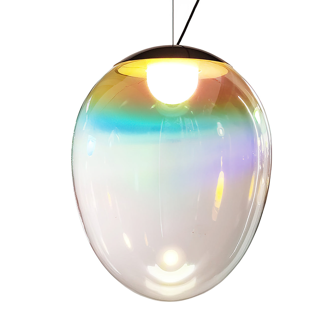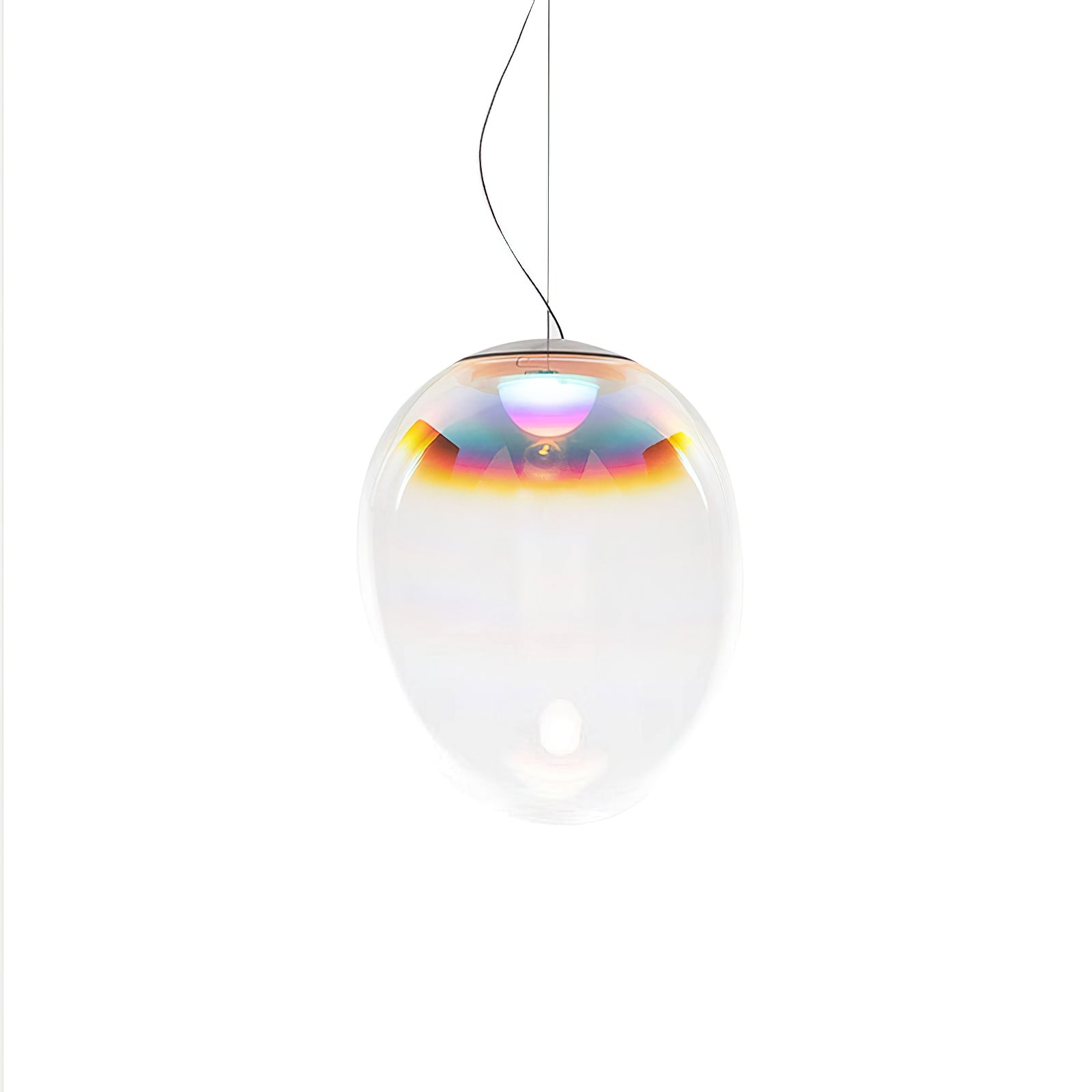 Discover the captivating and contemporary beauty of the Nebula Glass Pendant Light. Using innovative finishing techniques, this lamp showcases the traditional art of hand-blown glass in a whole new light. The iridescent glass reflects an ever-changing array of mesmerizing colors, creating an interactive and poetic experience for the viewer. With its ethereal and organic shape, this chandelier adds a sophisticated and colorful touch to any space.