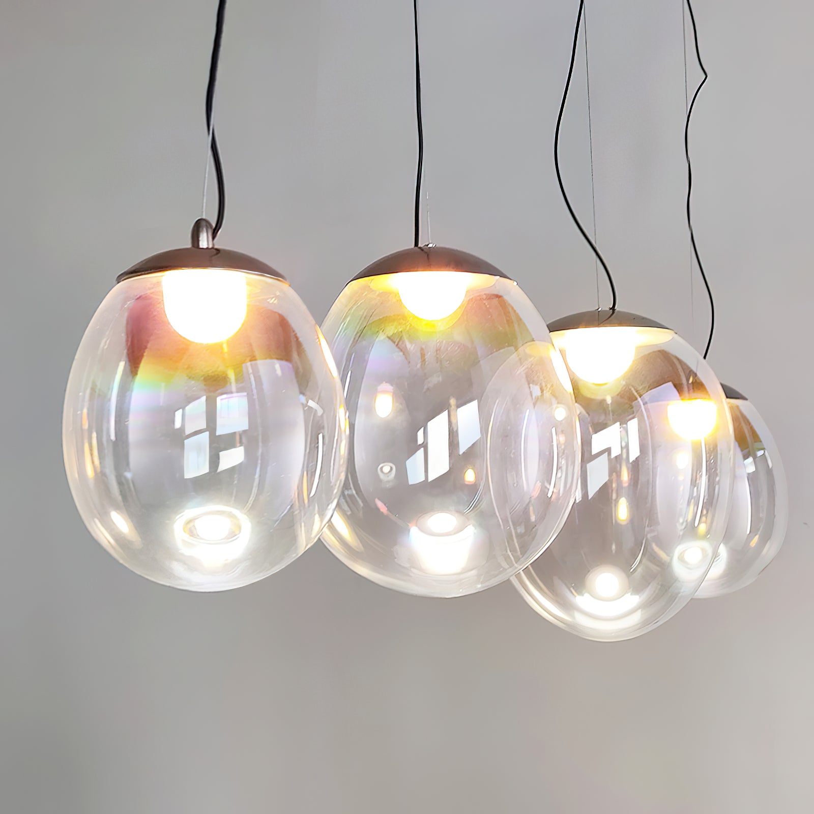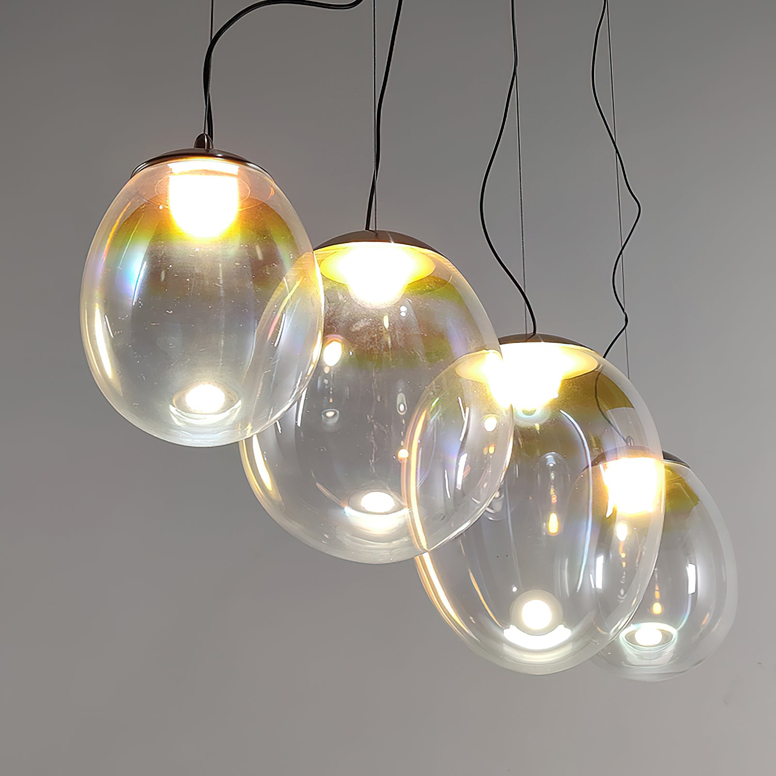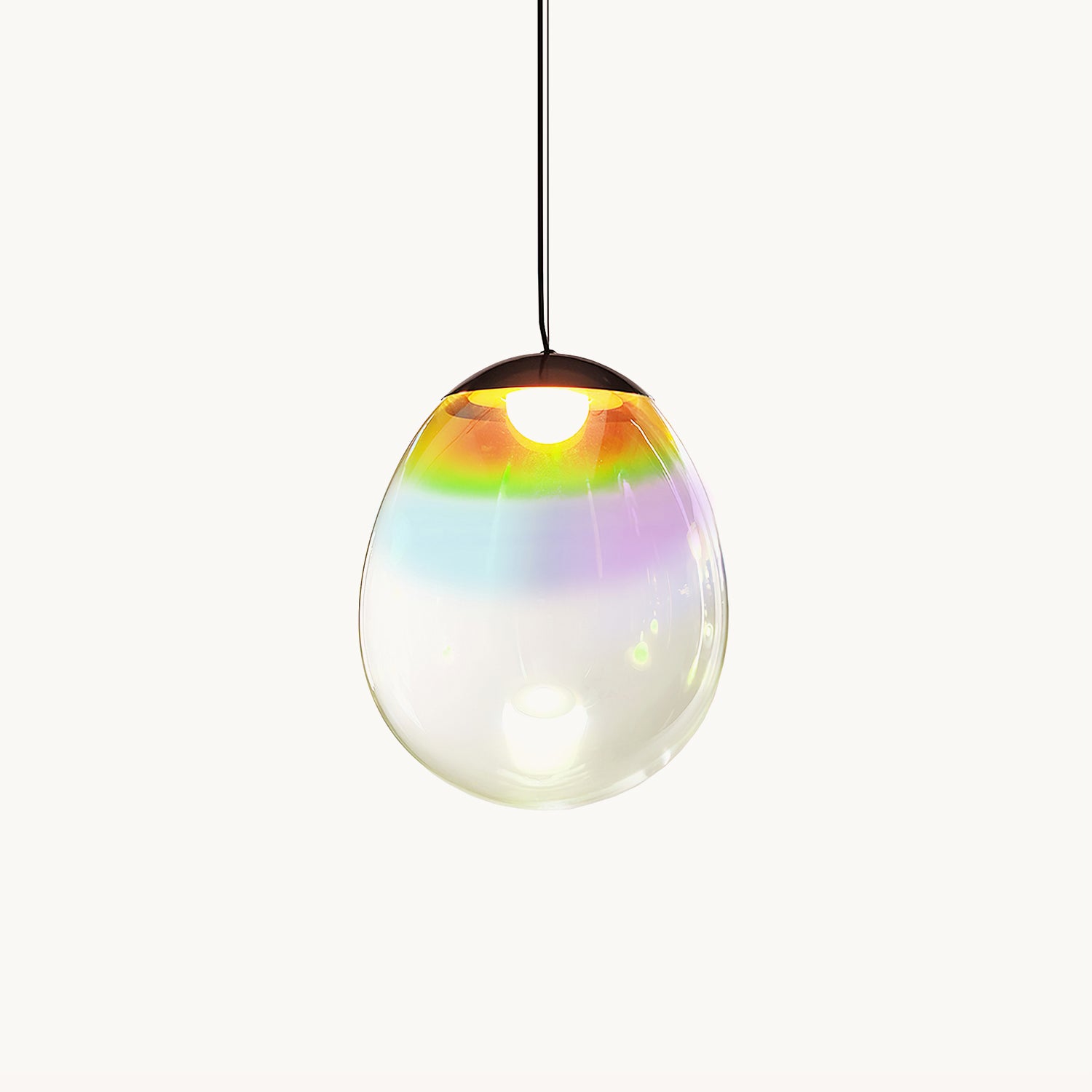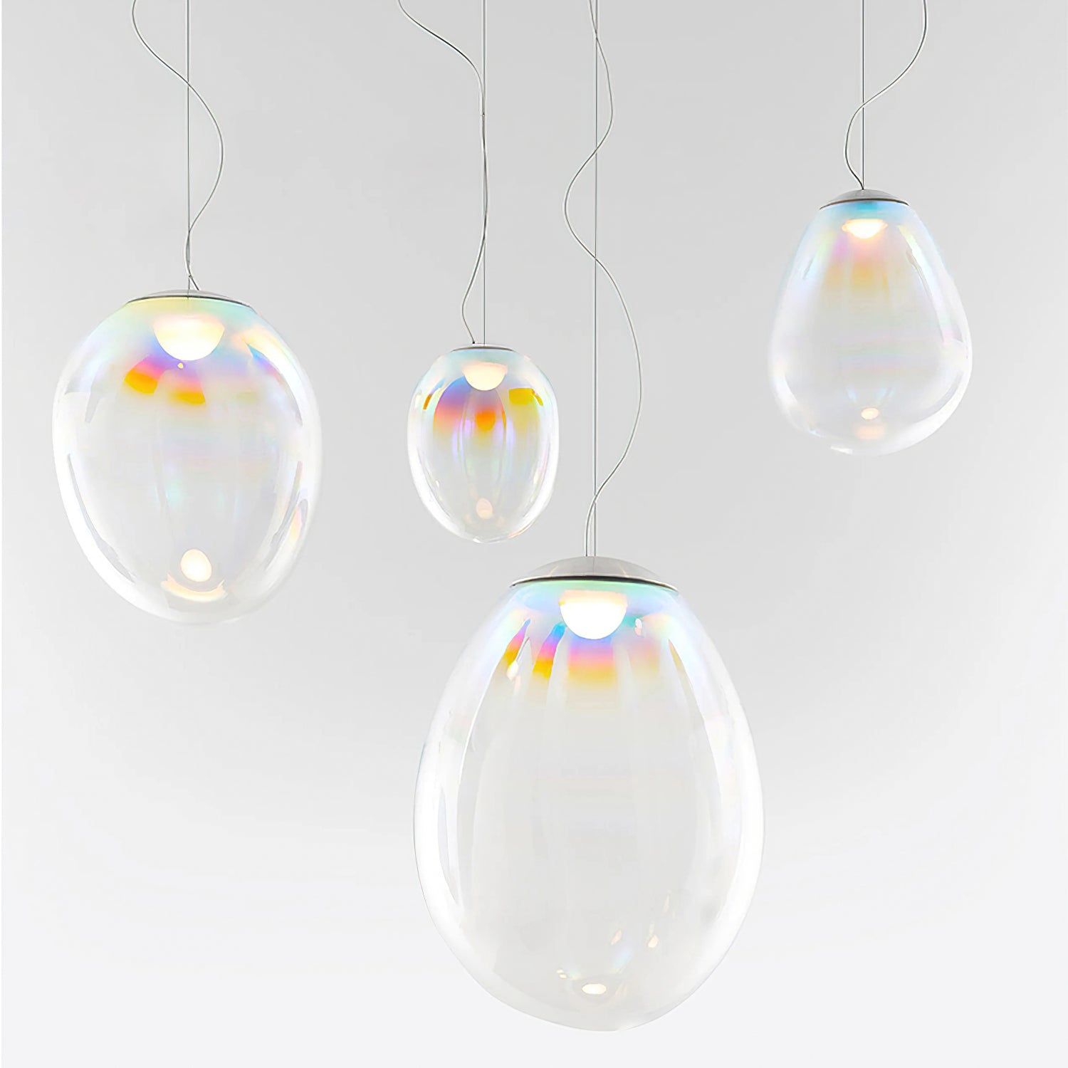 Discover the captivating and contemporary beauty of the Nebula Glass Pendant Light. Using innovative finishing techniques, this lamp showcases the traditional art of hand-blown glass in a whole new light. The iridescent glass reflects an ever-changing array of mesmerizing colors, creating an interactive and poetic experience for the viewer. With its ethereal and organic shape, this chandelier adds a sophisticated and colorful touch to any space.