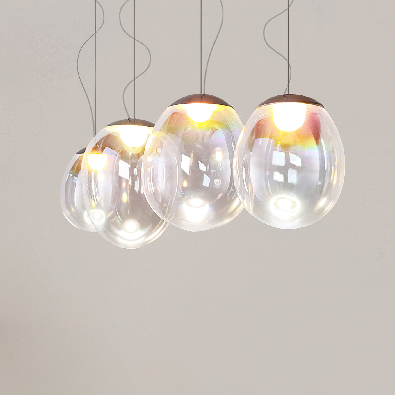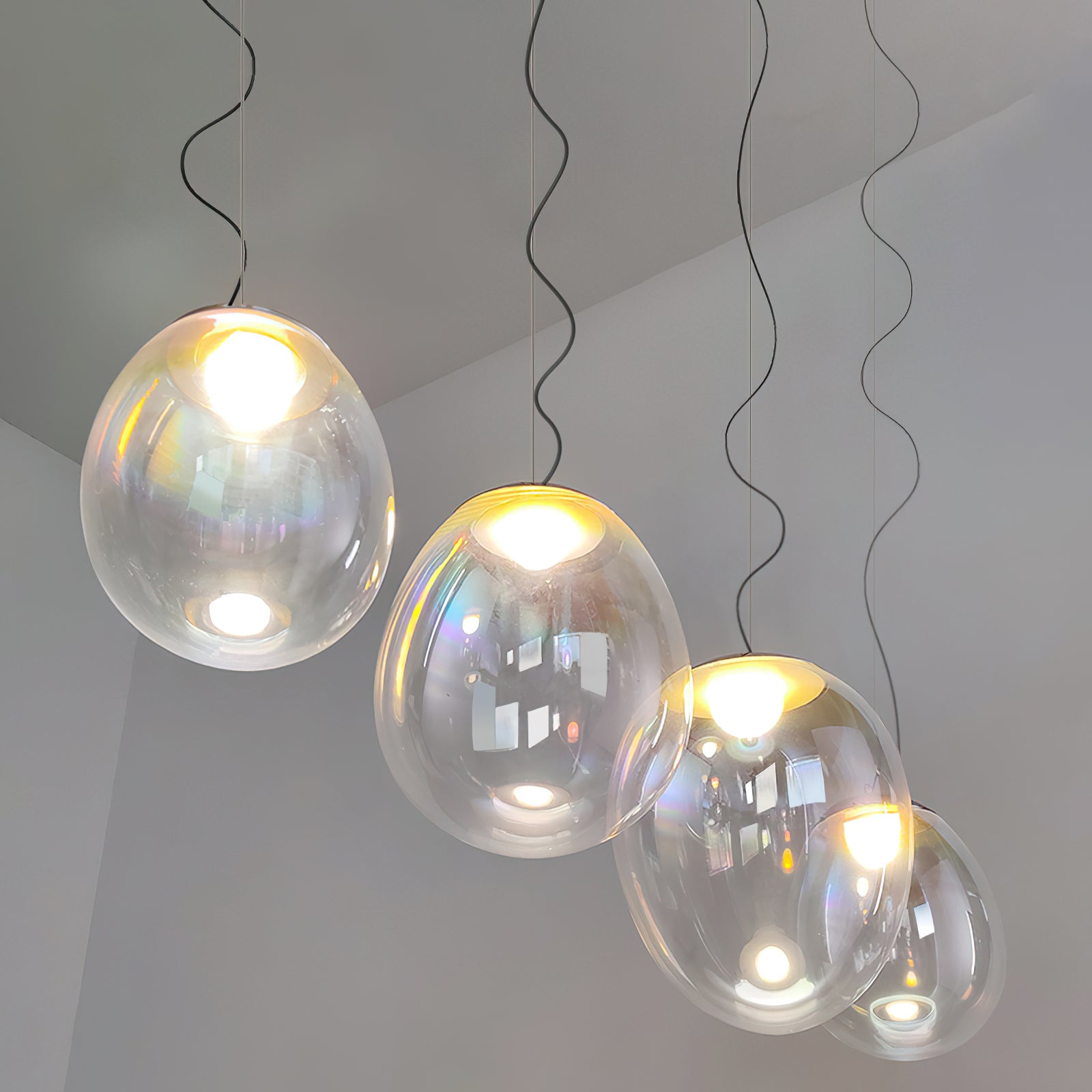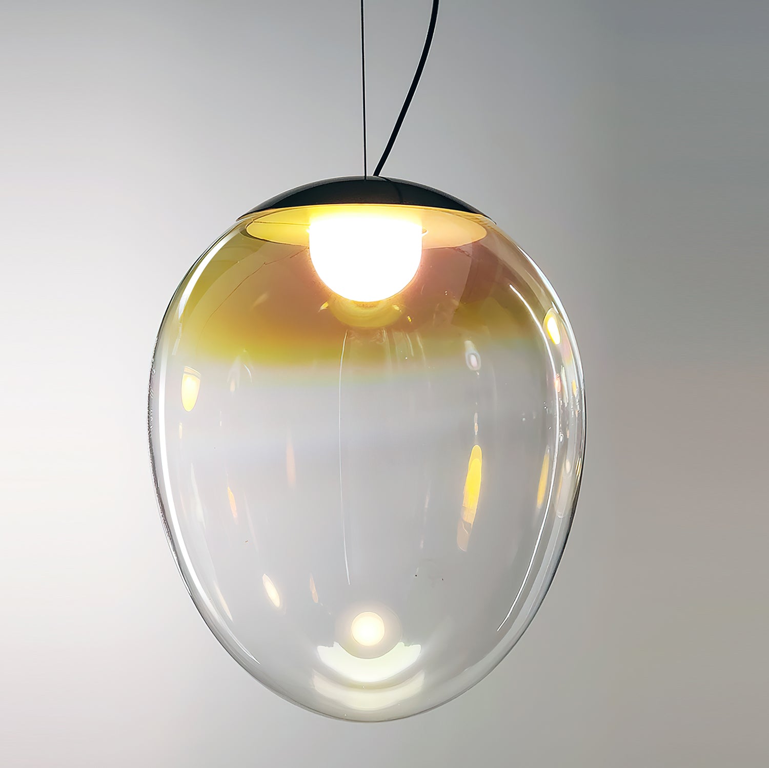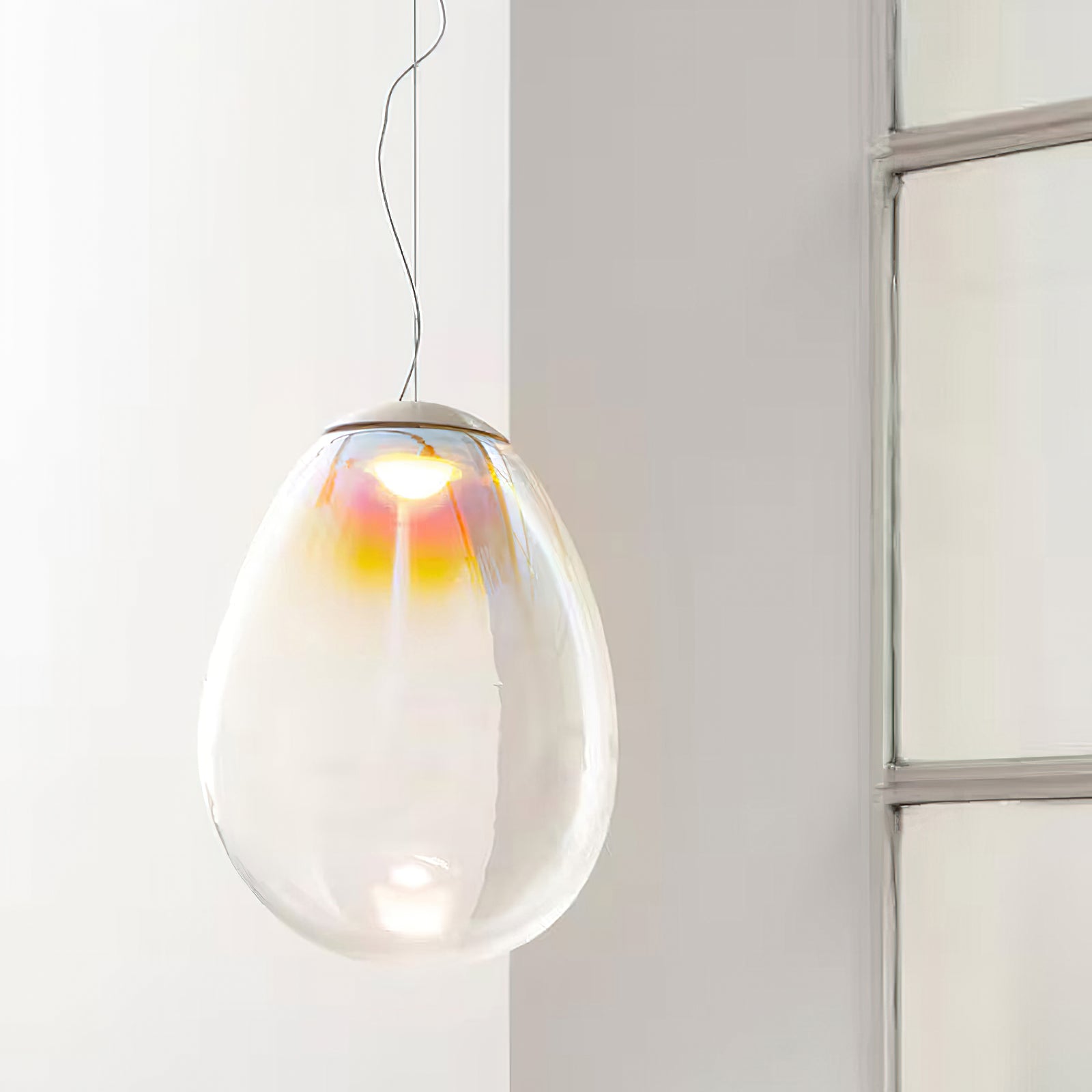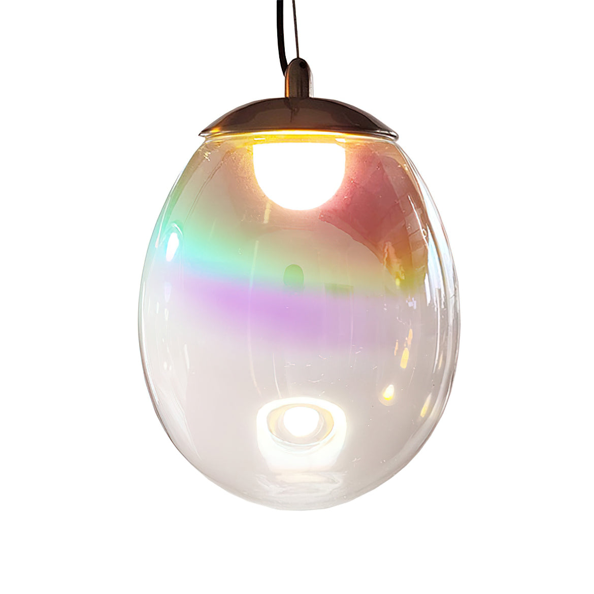 Discover the captivating and contemporary beauty of the Nebula Glass Pendant Light. Using innovative finishing techniques, this lamp showcases the traditional art of hand-blown glass in a whole new light. The iridescent glass reflects an ever-changing array of mesmerizing colors, creating an interactive and poetic experience for the viewer. With its ethereal and organic shape, this chandelier adds a sophisticated and colorful touch to any space.