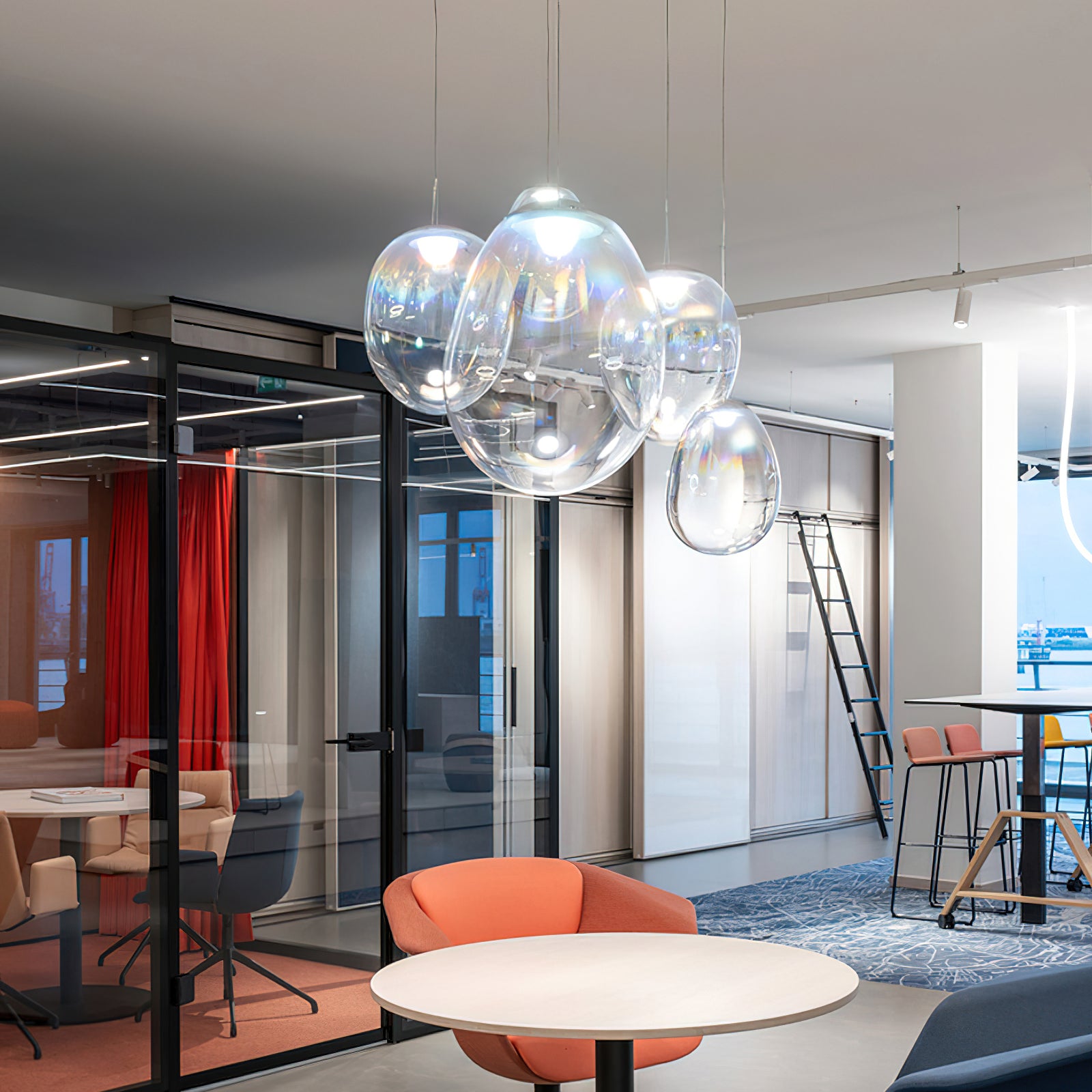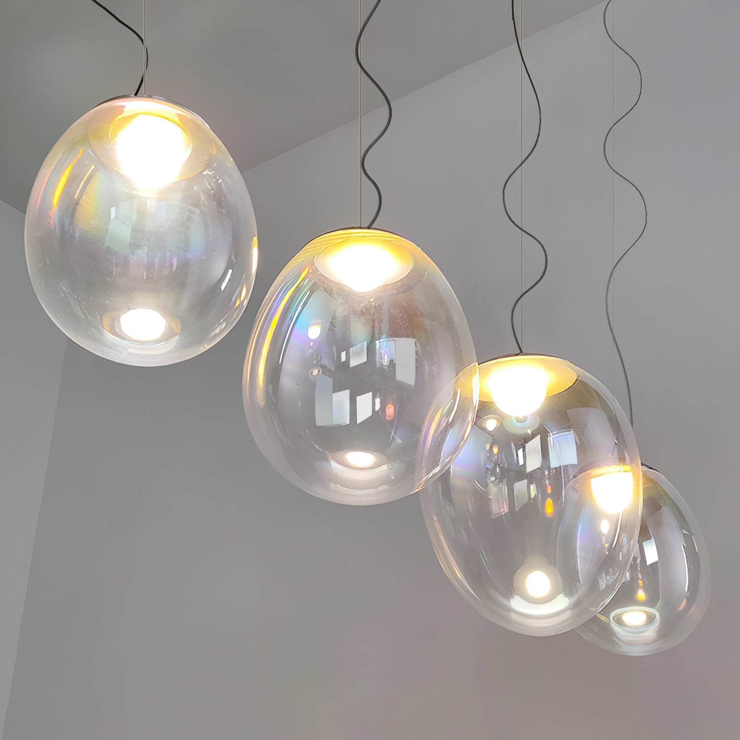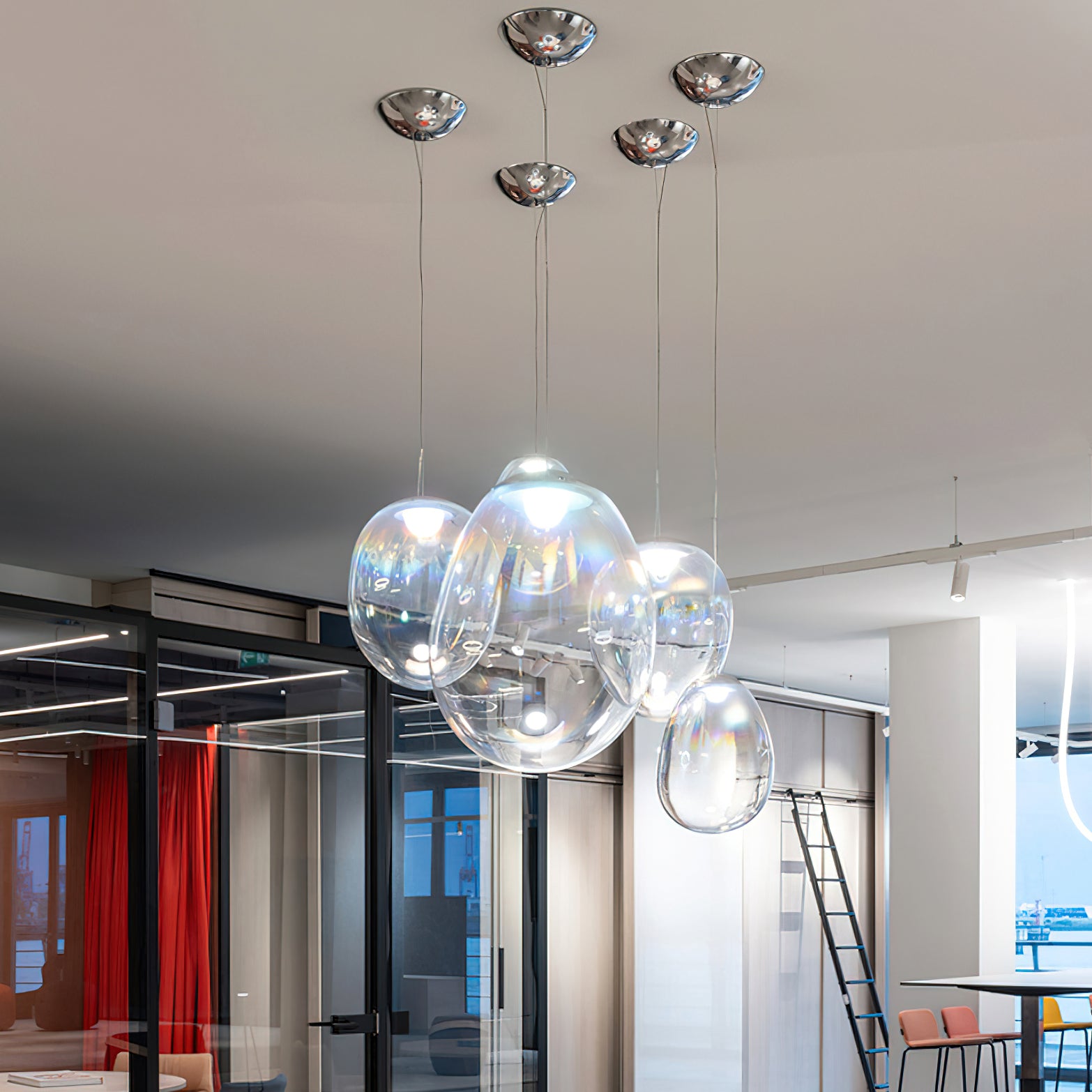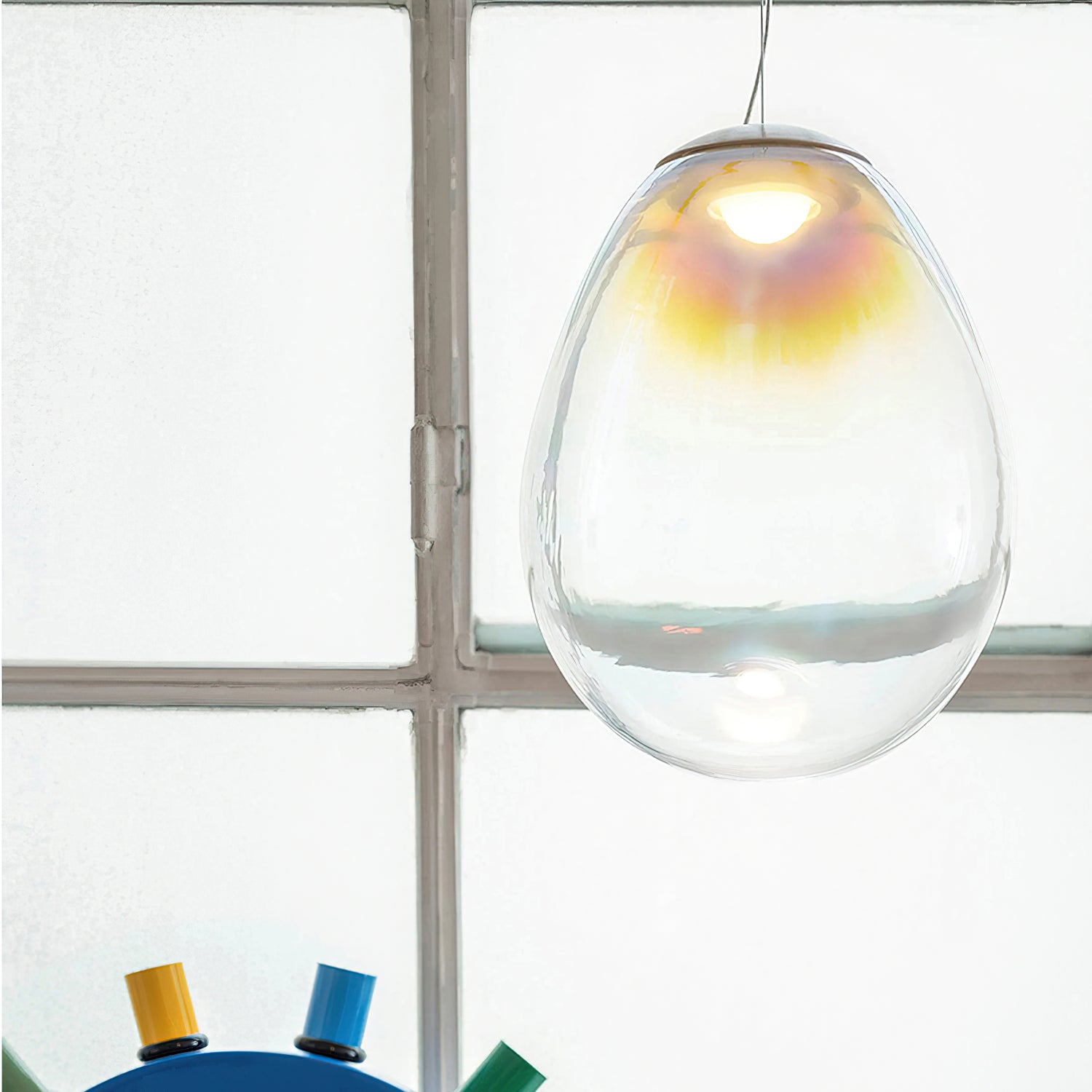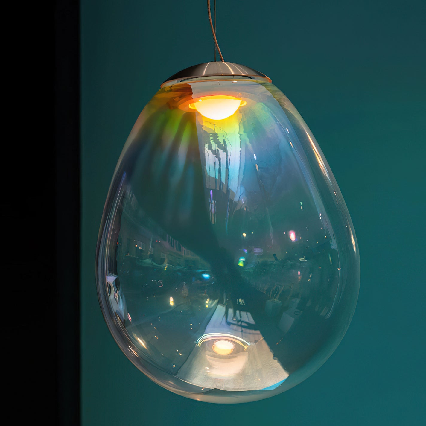 Discover the captivating and contemporary beauty of the Nebula Glass Pendant Light. Using innovative finishing techniques, this lamp showcases the traditional art of hand-blown glass in a whole new light. The iridescent glass reflects an ever-changing array of mesmerizing colors, creating an interactive and poetic experience for the viewer. With its ethereal and organic shape, this chandelier adds a sophisticated and colorful touch to any space.