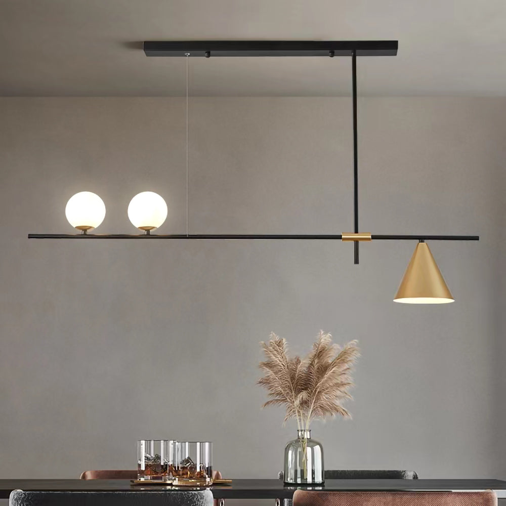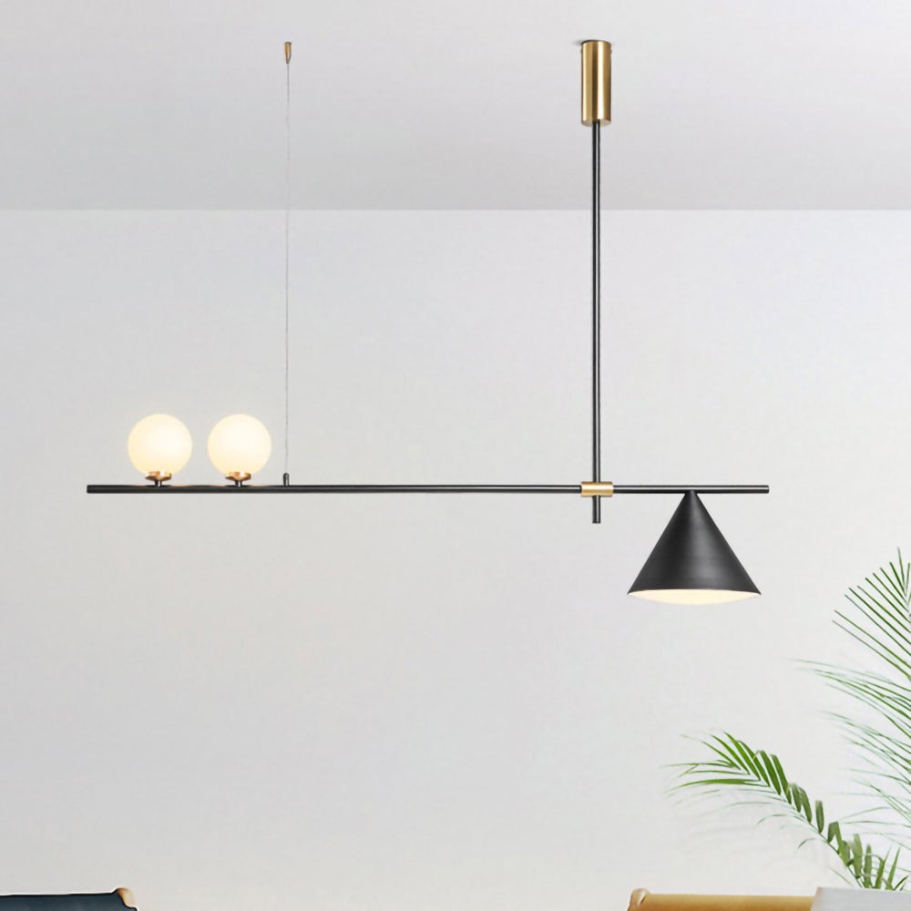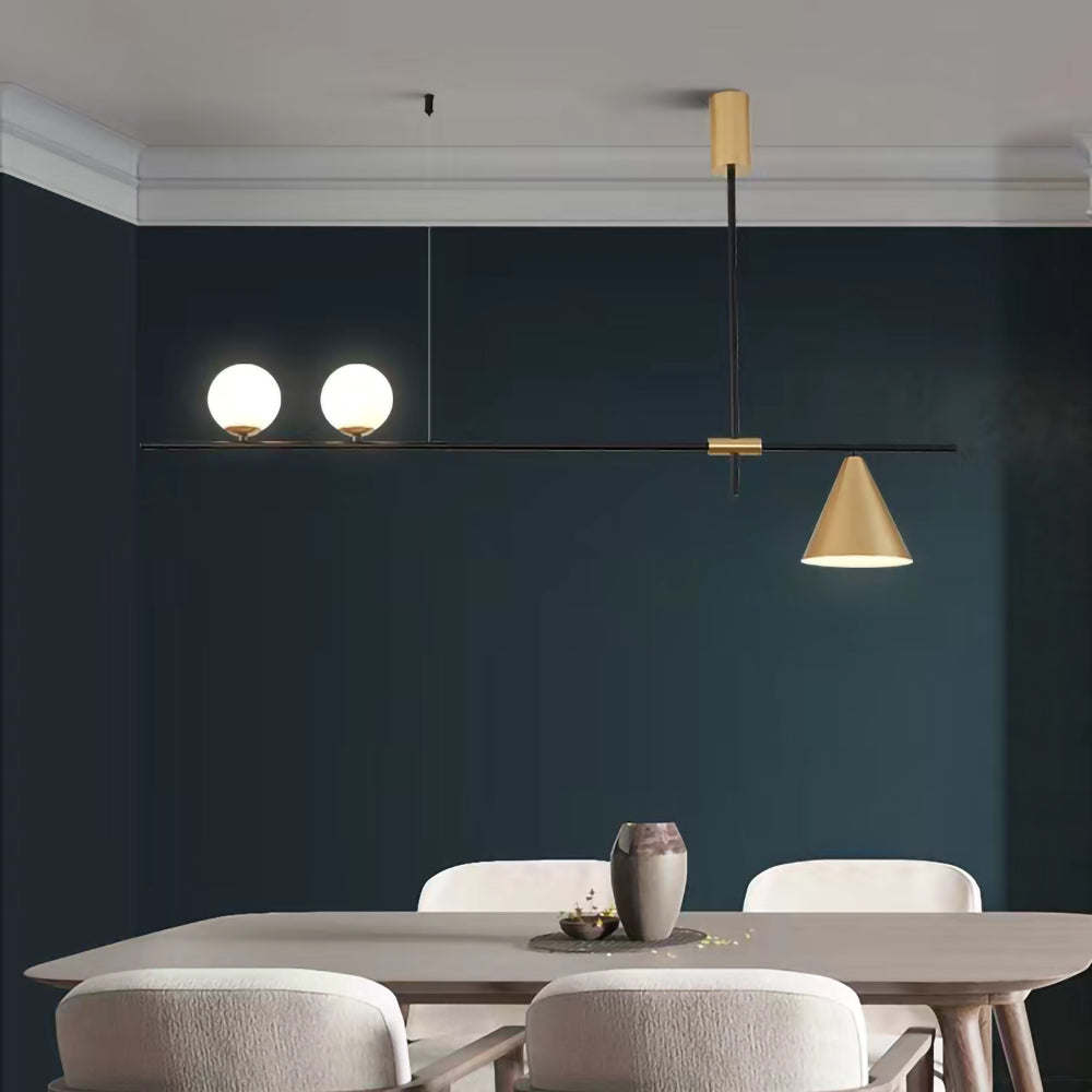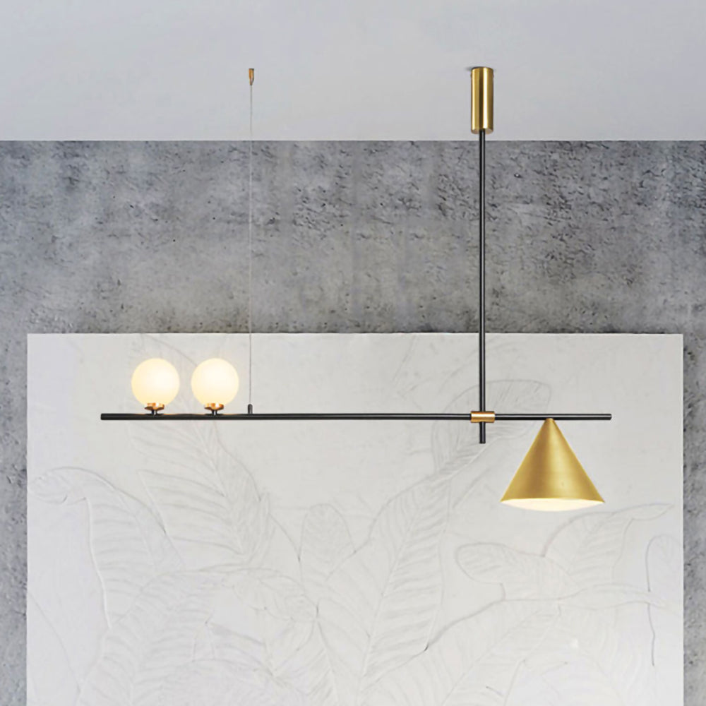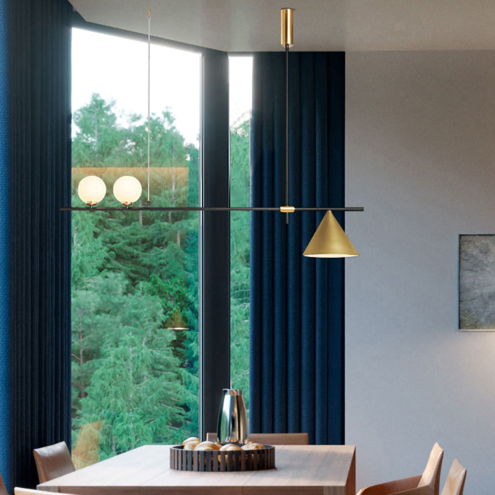 Mooijane Made primarily of metal and glass, this Neglixerint Pendant Light features a classic color scheme of black and gold, with a touch of luxury in a minimalist design. The long stick is its main body, in which two glass spheres and a metallic cone shadow are distributed asymmetrically on the left and right sides, one up and one down. This asymmetrical yet balanced aesthetic is not rigid and gives a neat visual effect. It's perfect for hanging on a long table, serving basic lighting needs while reflecting the elegance and soul in its minimalist design.