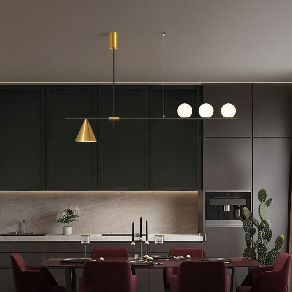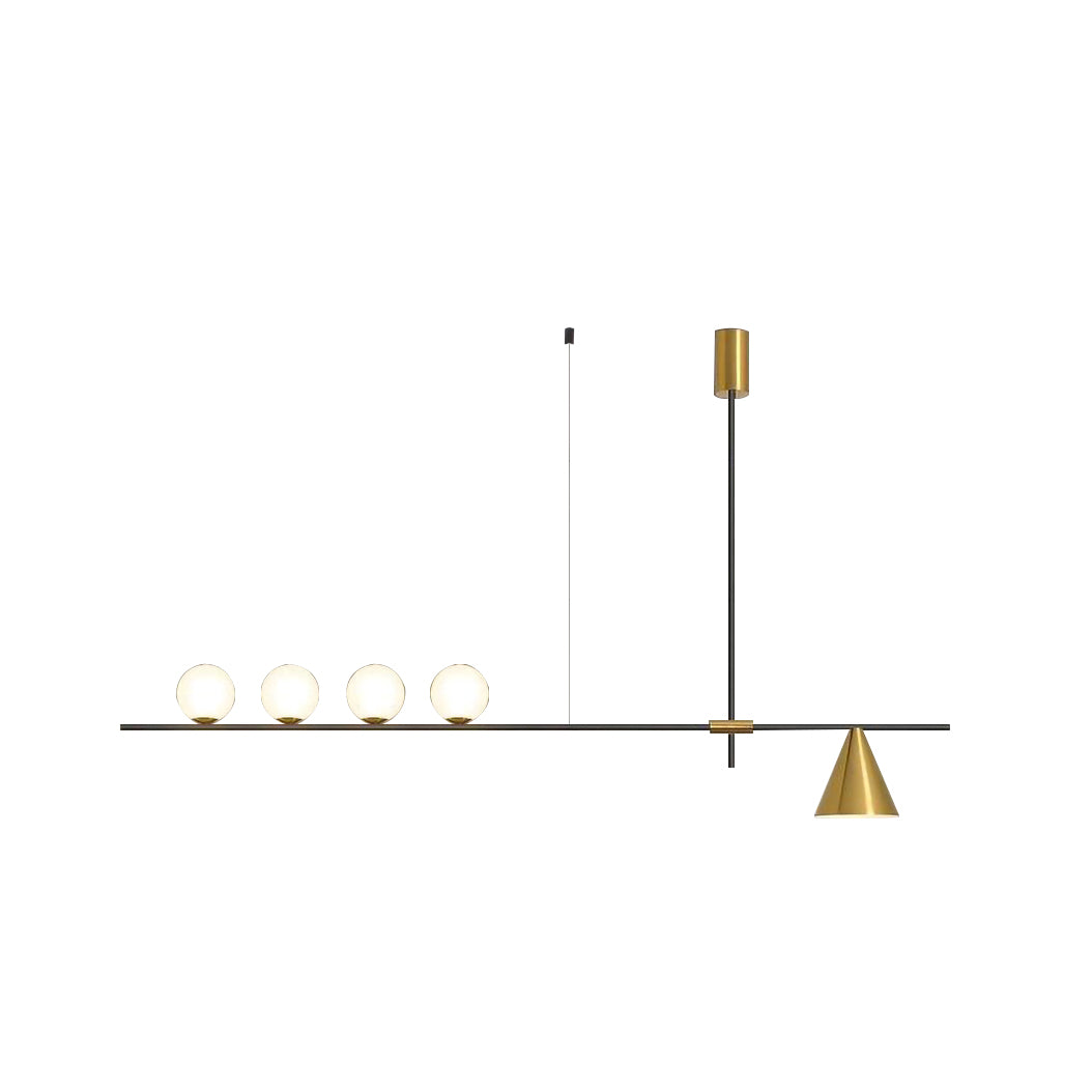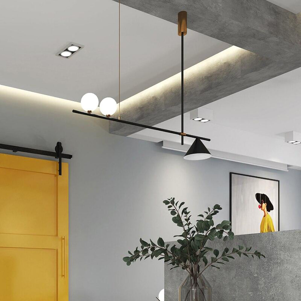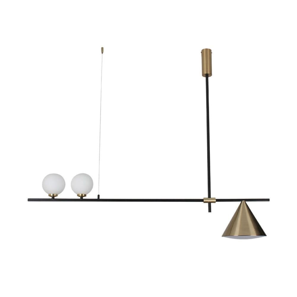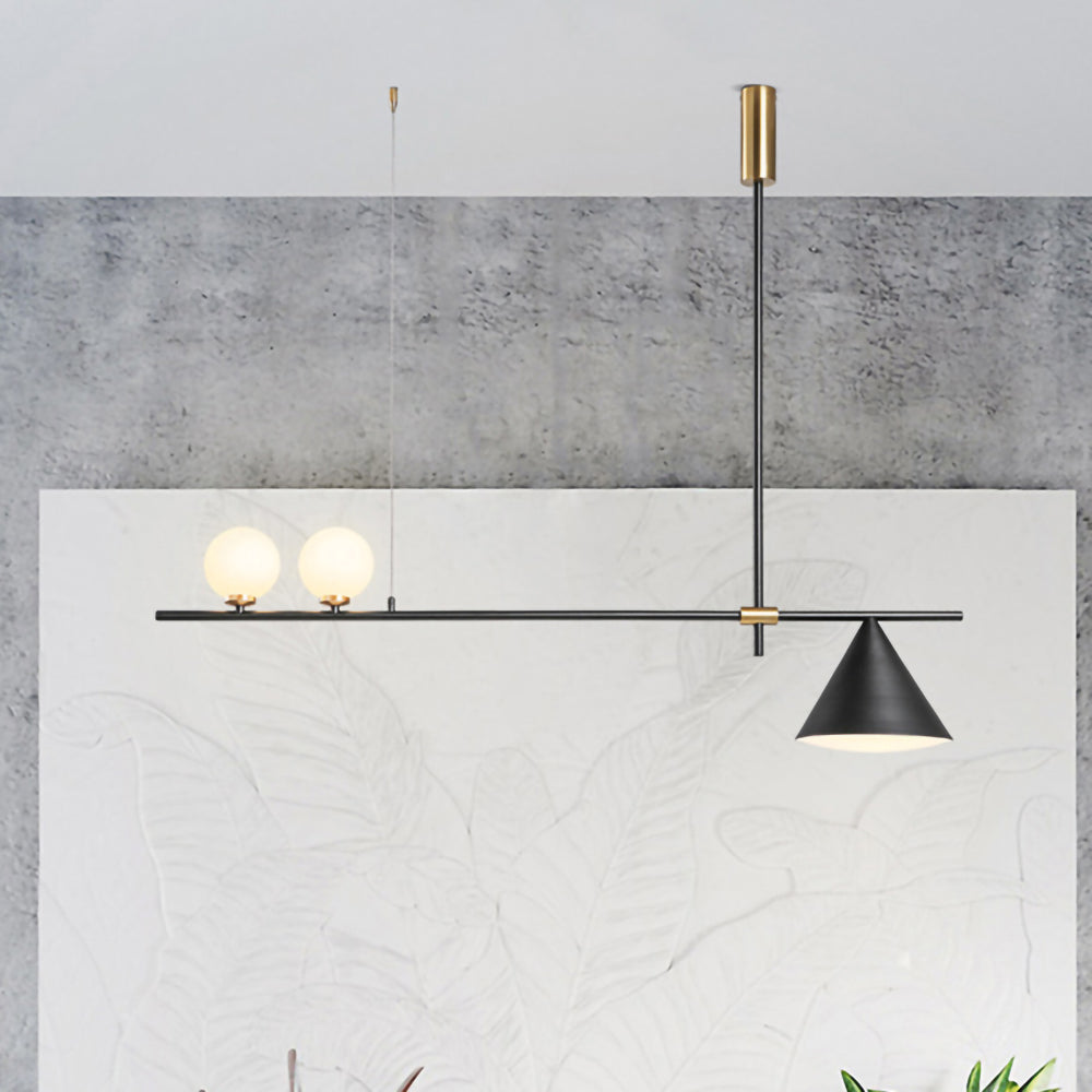 Mooijane Made primarily of metal and glass, this Neglixerint Pendant Light features a classic color scheme of black and gold, with a touch of luxury in a minimalist design. The long stick is its main body, in which two glass spheres and a metallic cone shadow are distributed asymmetrically on the left and right sides, one up and one down. This asymmetrical yet balanced aesthetic is not rigid and gives a neat visual effect. It's perfect for hanging on a long table, serving basic lighting needs while reflecting the elegance and soul in its minimalist design.
