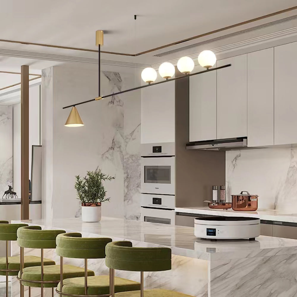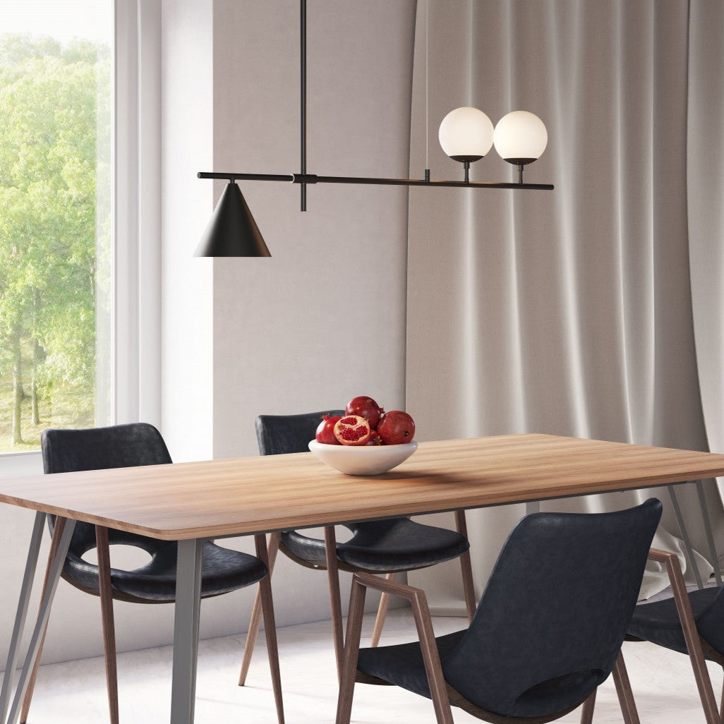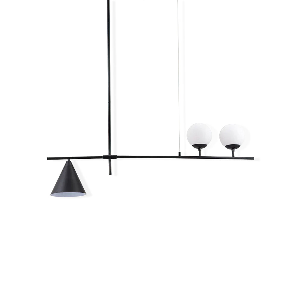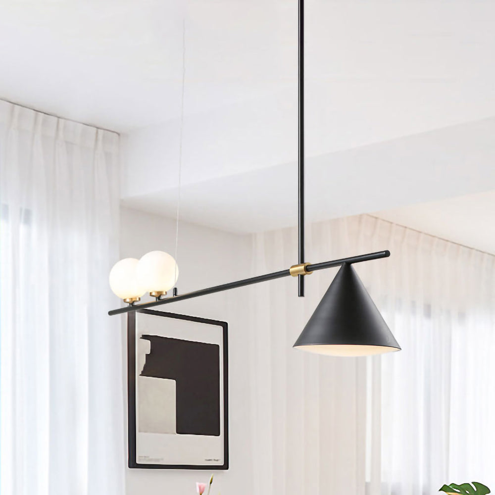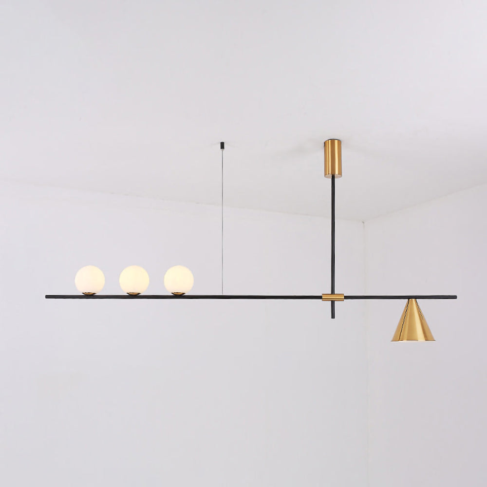 Mooijane Made primarily of metal and glass, this Neglixerint Pendant Light features a classic color scheme of black and gold, with a touch of luxury in a minimalist design. The long stick is its main body, in which two glass spheres and a metallic cone shadow are distributed asymmetrically on the left and right sides, one up and one down. This asymmetrical yet balanced aesthetic is not rigid and gives a neat visual effect. It's perfect for hanging on a long table, serving basic lighting needs while reflecting the elegance and soul in its minimalist design.
