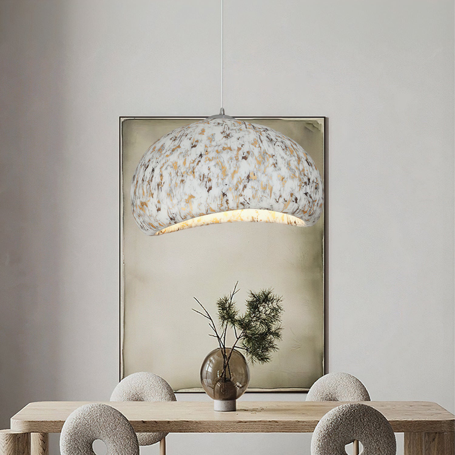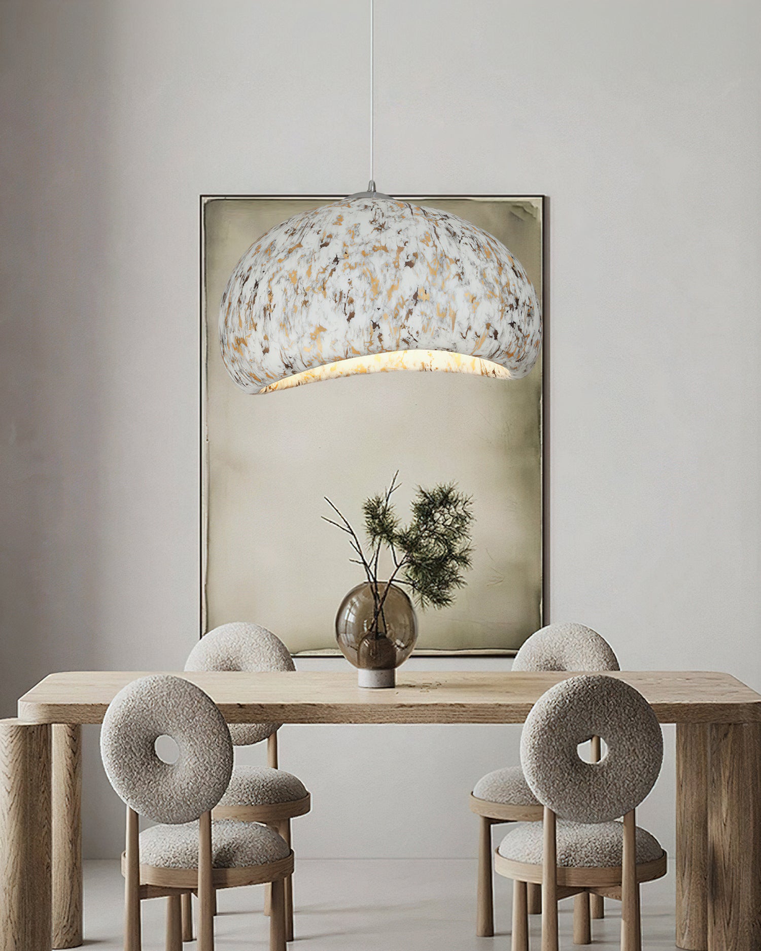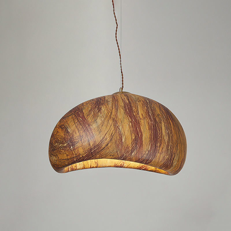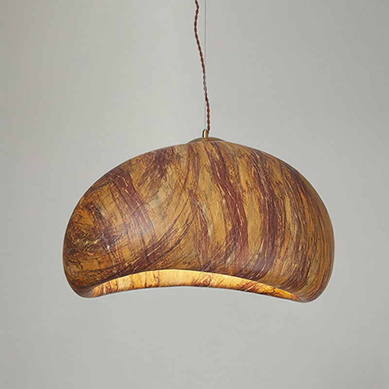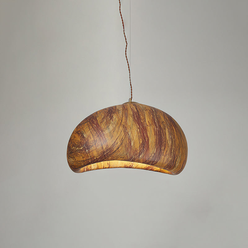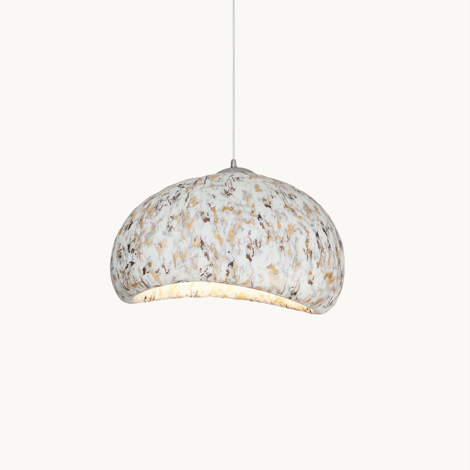 The Nivara Pendant Lamp by Mooijane blends modern design with organic beauty. Featuring a sturdy metal frame and a handcrafted resin shade, it showcases natural textures reminiscent of rock, marble, and wood grain—each piece a unique visual statement. The textured exterior contrasts with the metallic interior, casting a warm, ambient glow.