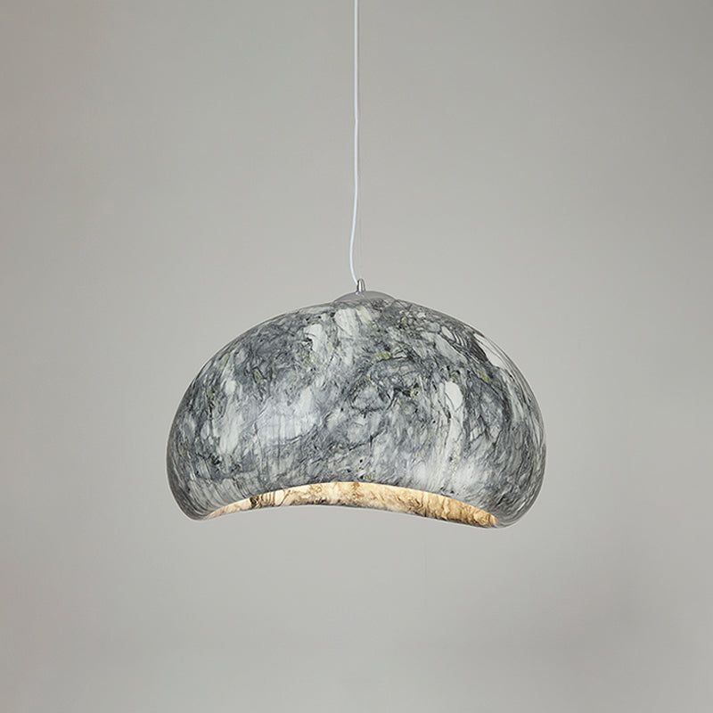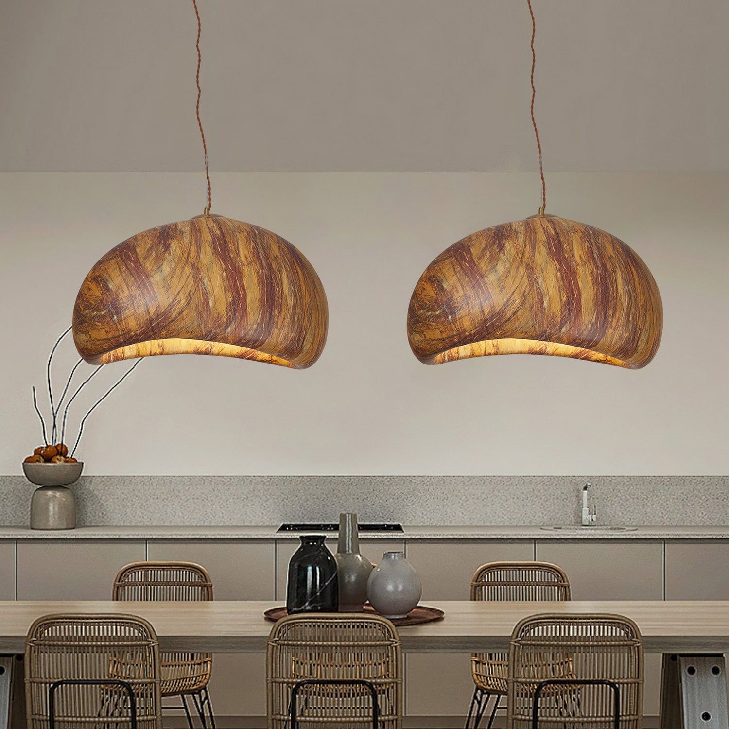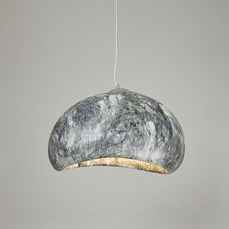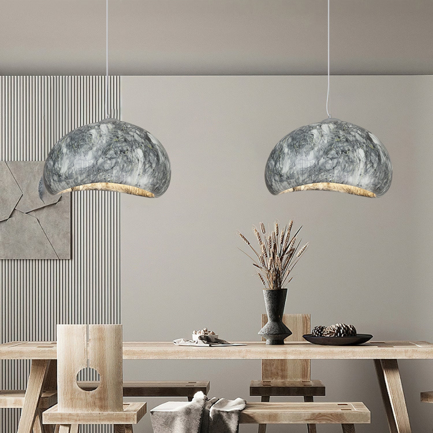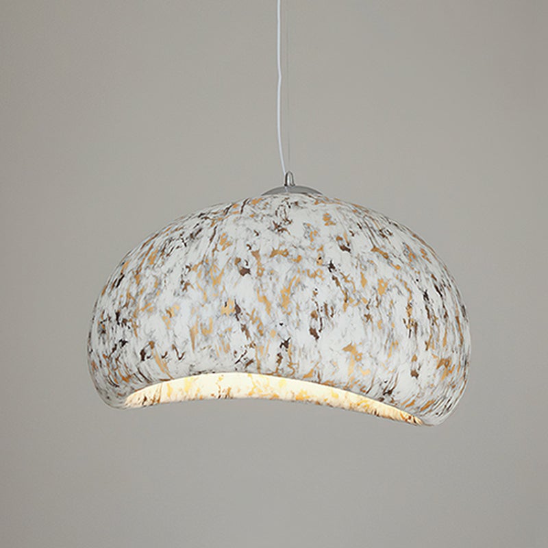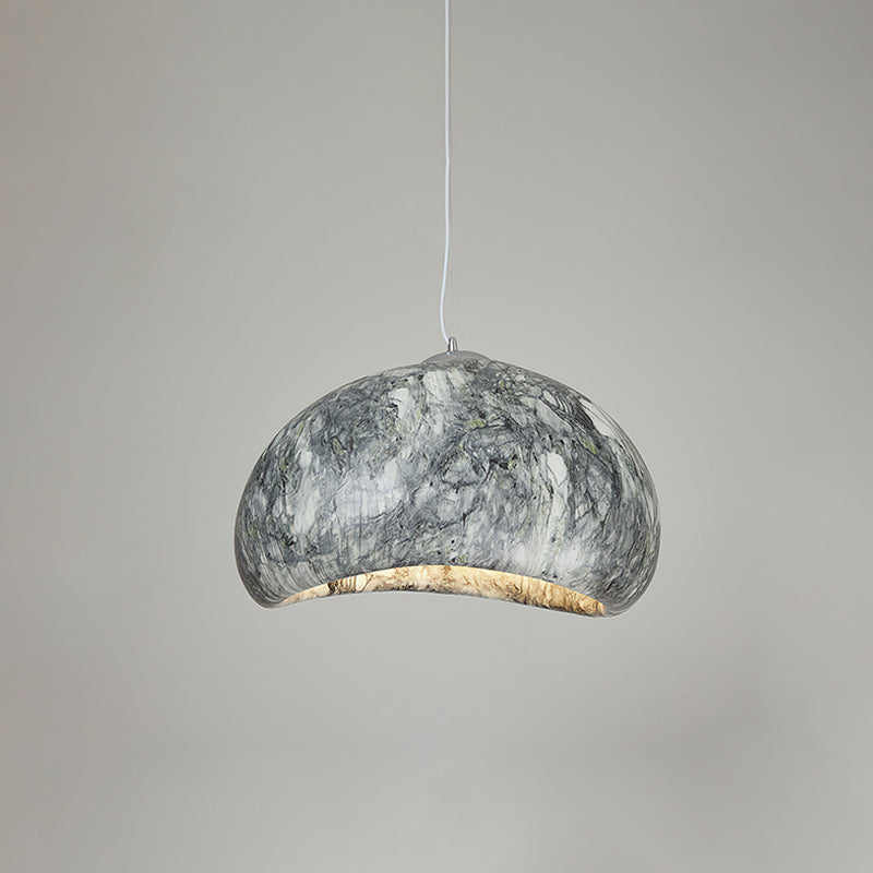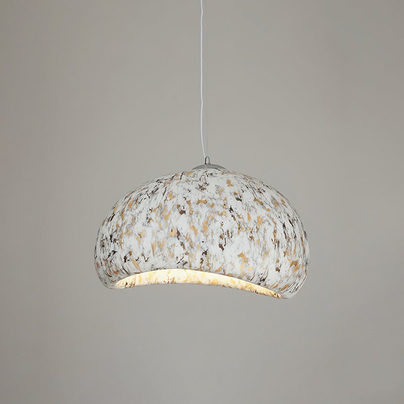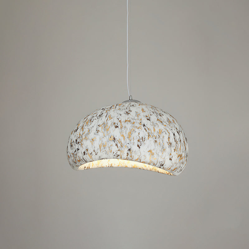 The Nivara Pendant Lamp by Mooijane blends modern design with organic beauty. Featuring a sturdy metal frame and a handcrafted resin shade, it showcases natural textures reminiscent of rock, marble, and wood grain—each piece a unique visual statement. The textured exterior contrasts with the metallic interior, casting a warm, ambient glow.