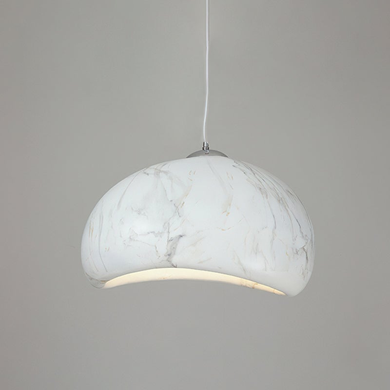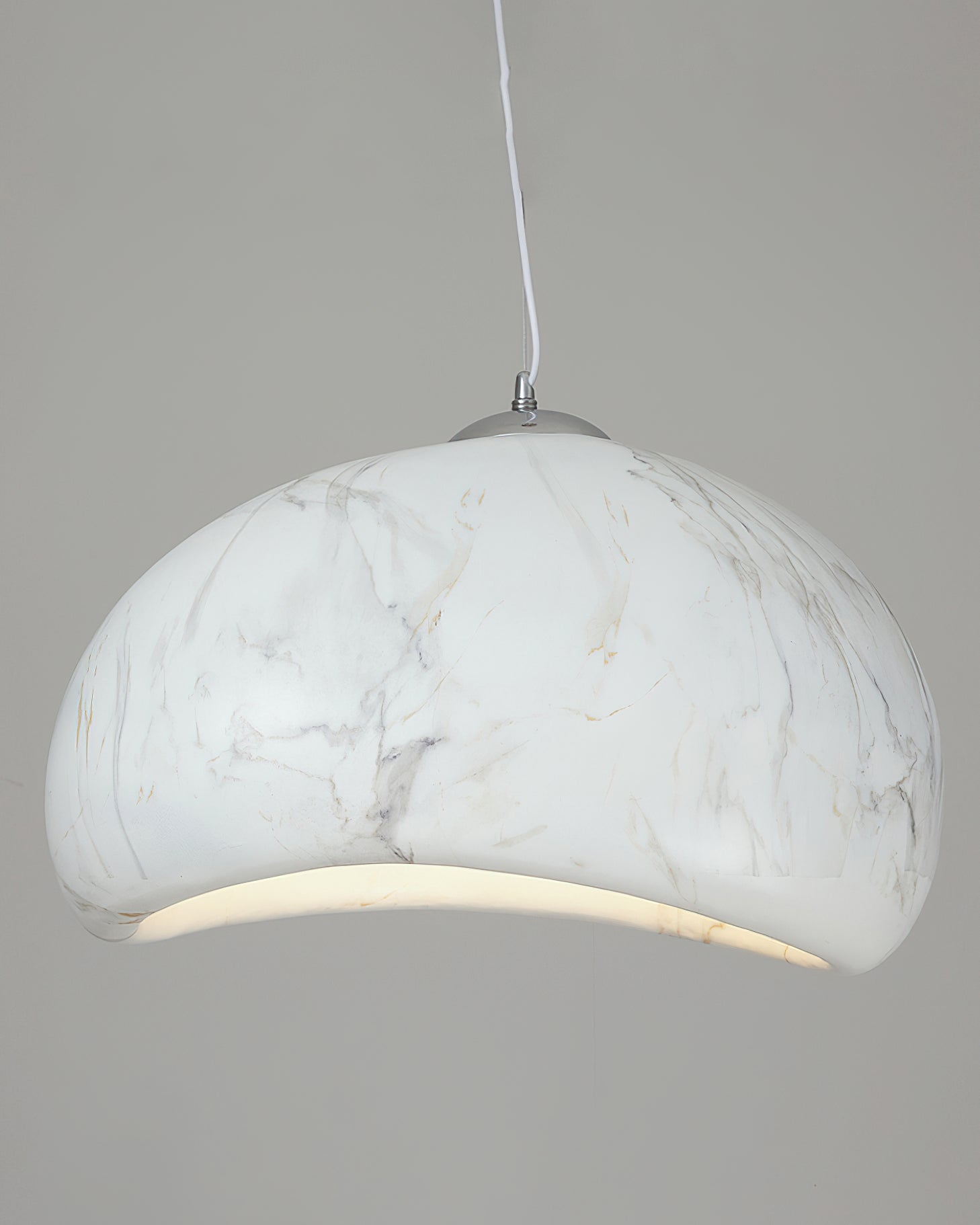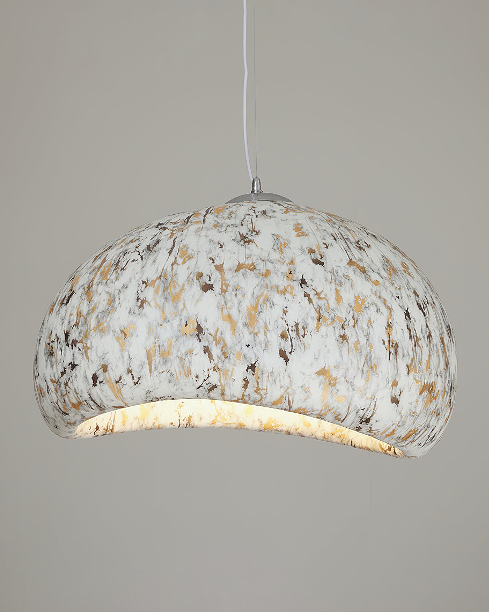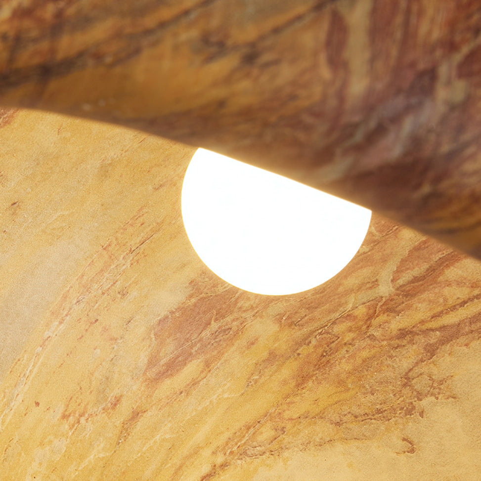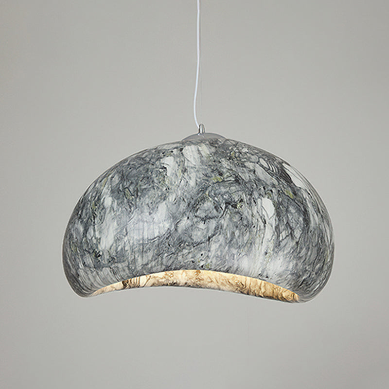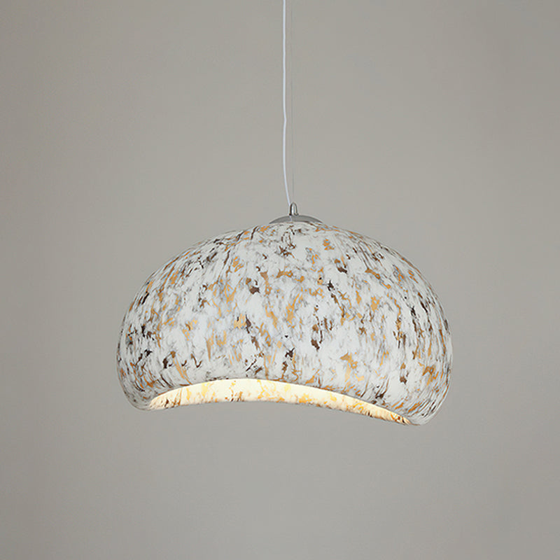 The Nivara Pendant Lamp by Mooijane blends modern design with organic beauty. Featuring a sturdy metal frame and a handcrafted resin shade, it showcases natural textures reminiscent of rock, marble, and wood grain—each piece a unique visual statement. The textured exterior contrasts with the metallic interior, casting a warm, ambient glow.