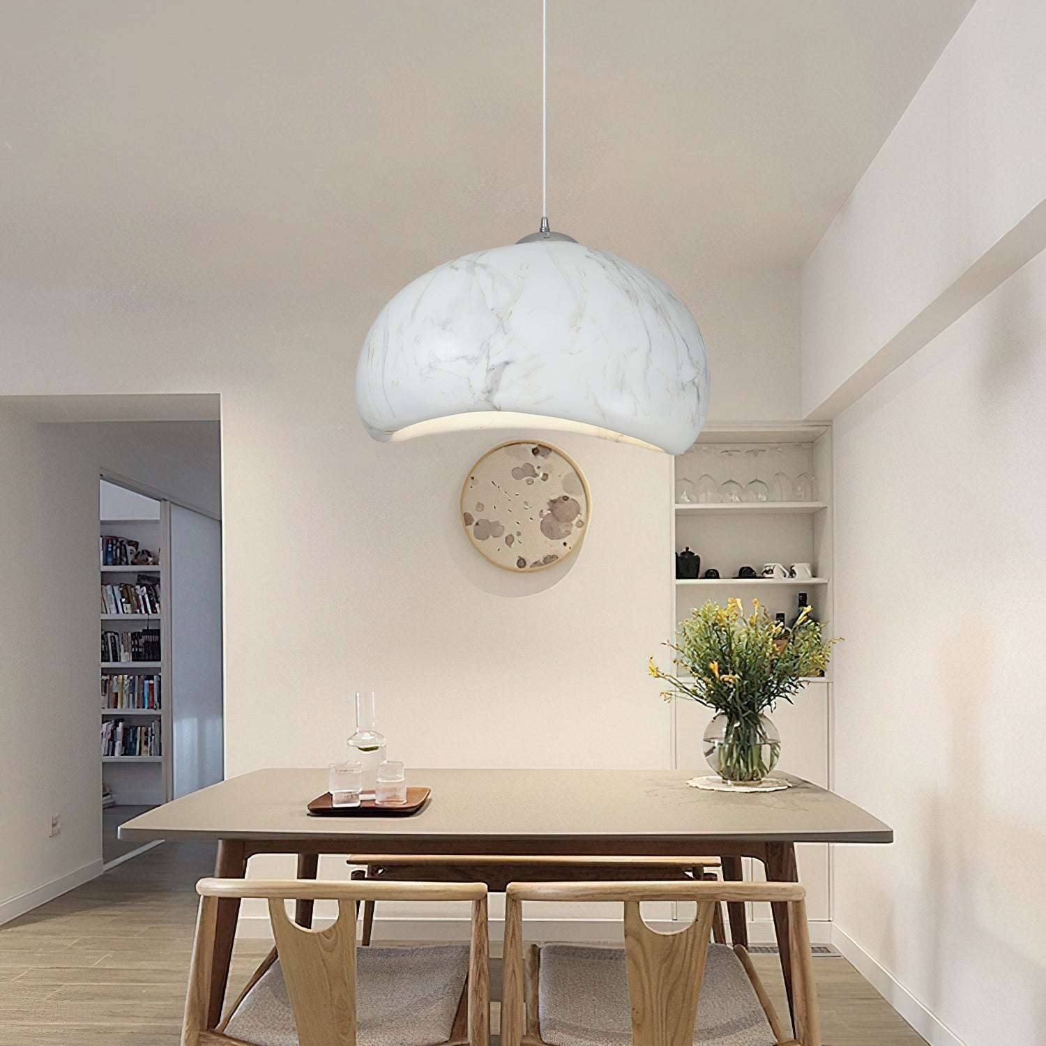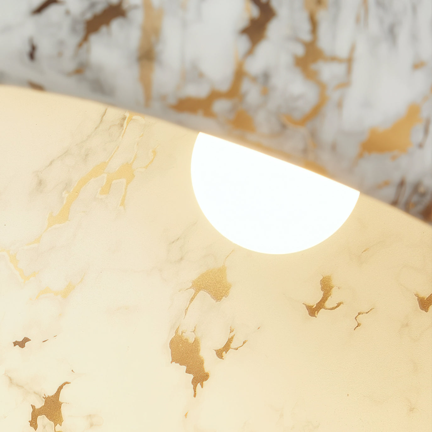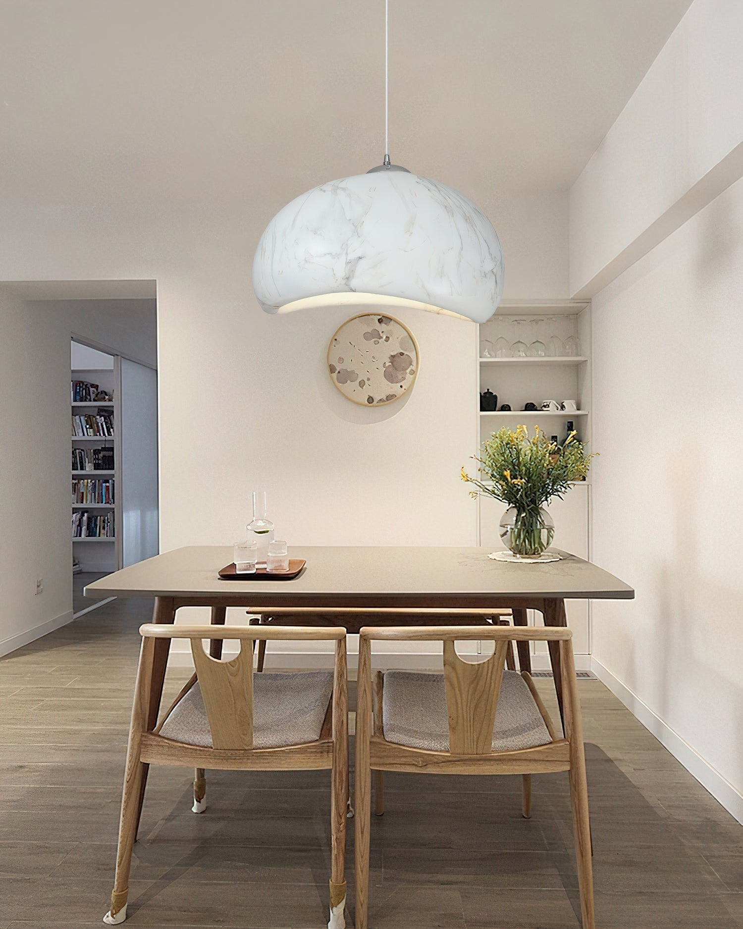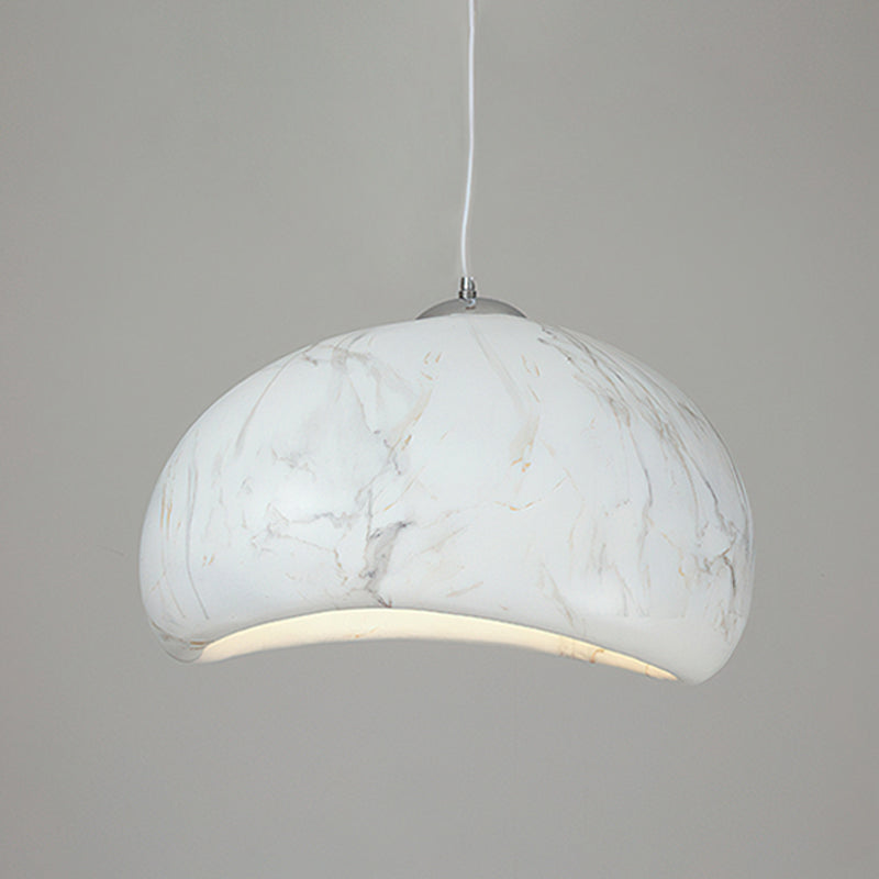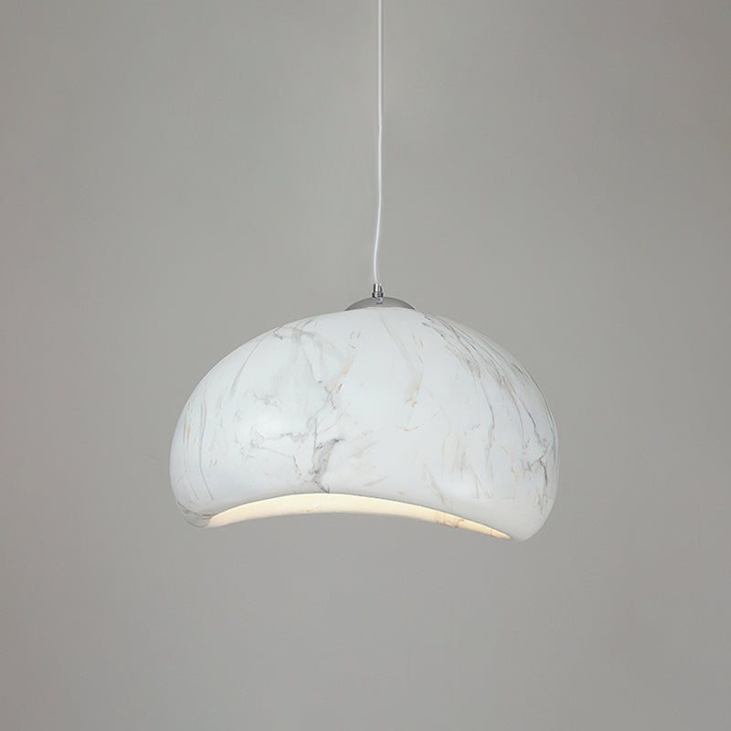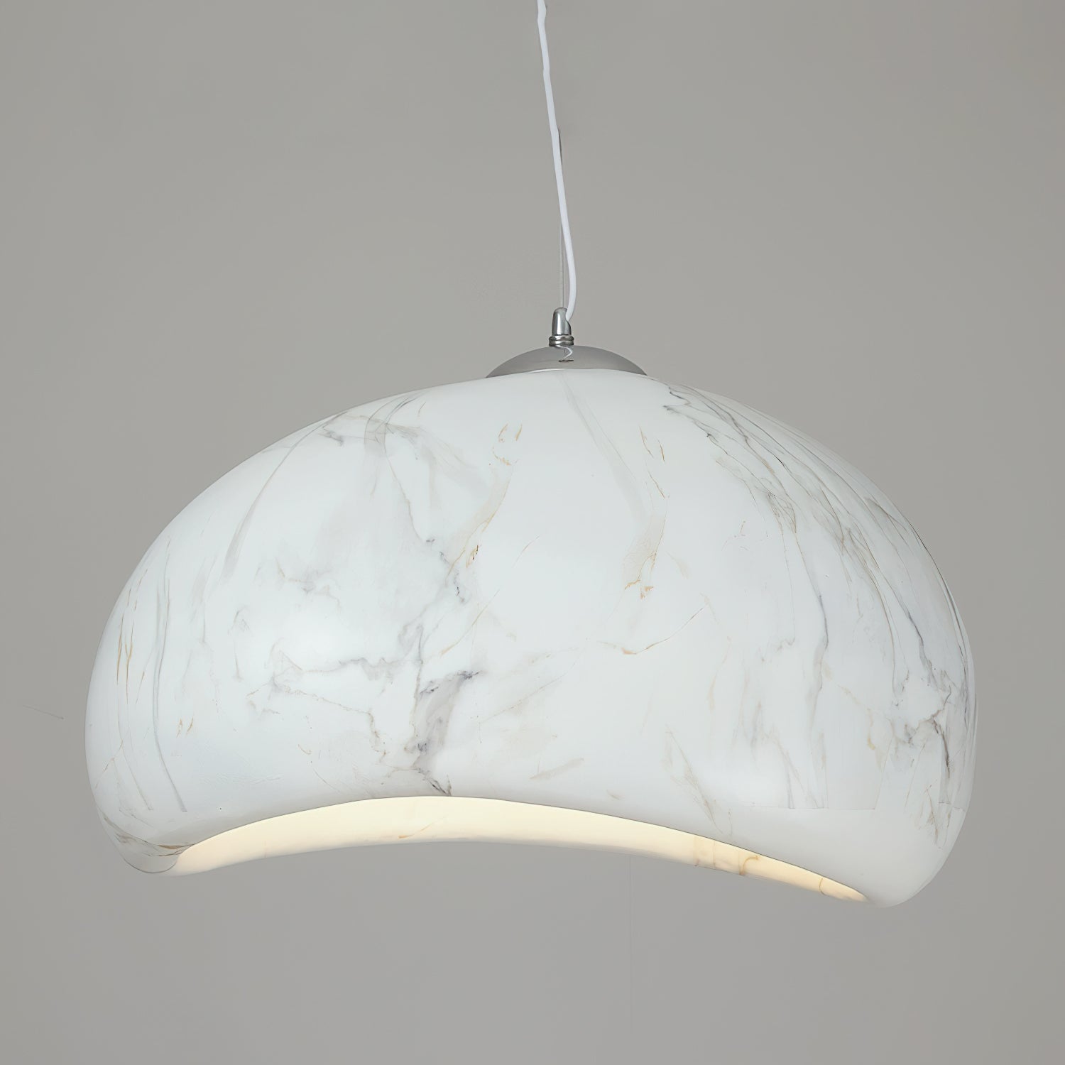 The Nivara Pendant Lamp by Mooijane blends modern design with organic beauty. Featuring a sturdy metal frame and a handcrafted resin shade, it showcases natural textures reminiscent of rock, marble, and wood grain—each piece a unique visual statement. The textured exterior contrasts with the metallic interior, casting a warm, ambient glow.
