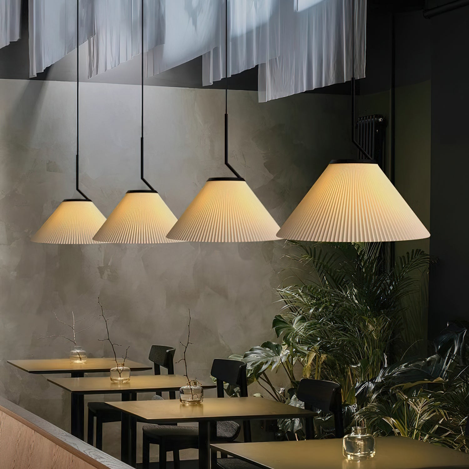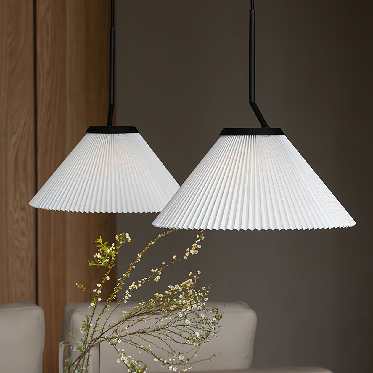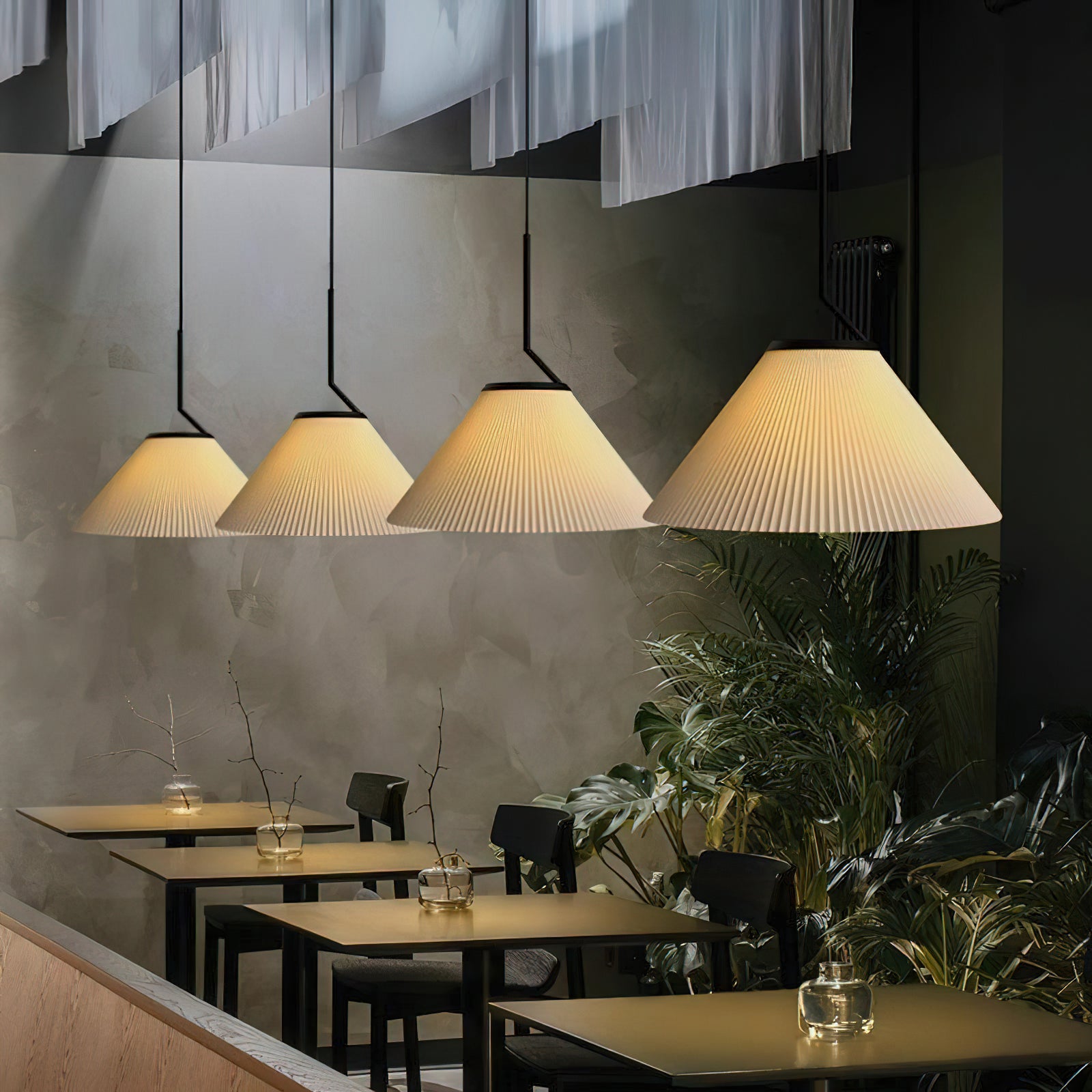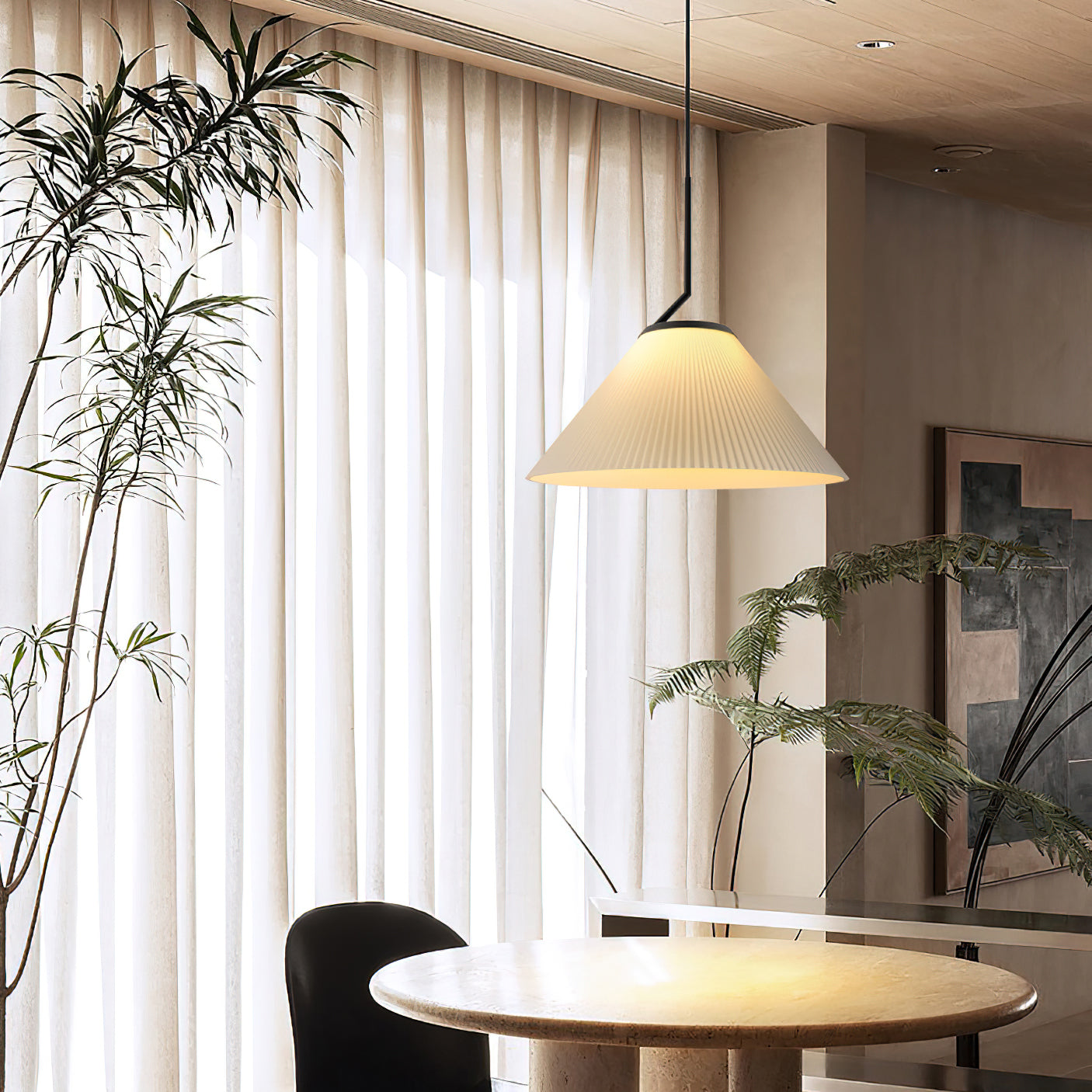 Elevate your living space with the Nobu Pleated Pendant Light from Mooijane. Inspired by the classic look of a pleated skirt, this fixture features a fabric shade with meticulously folded pleats, contrasted by a structured black metal support. The result is a timeless yet modern piece that casts a warm, ambient glow in any room.