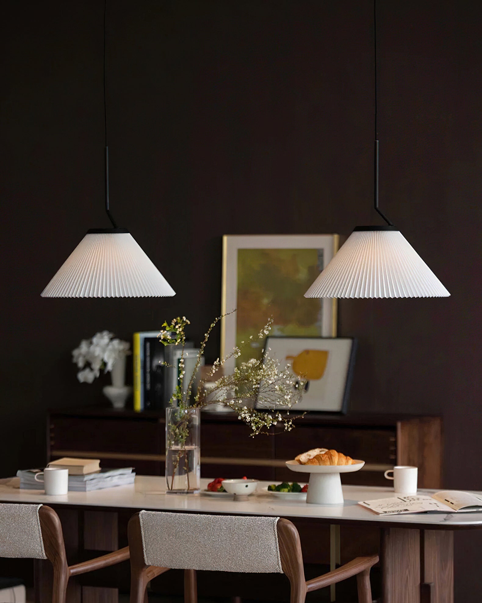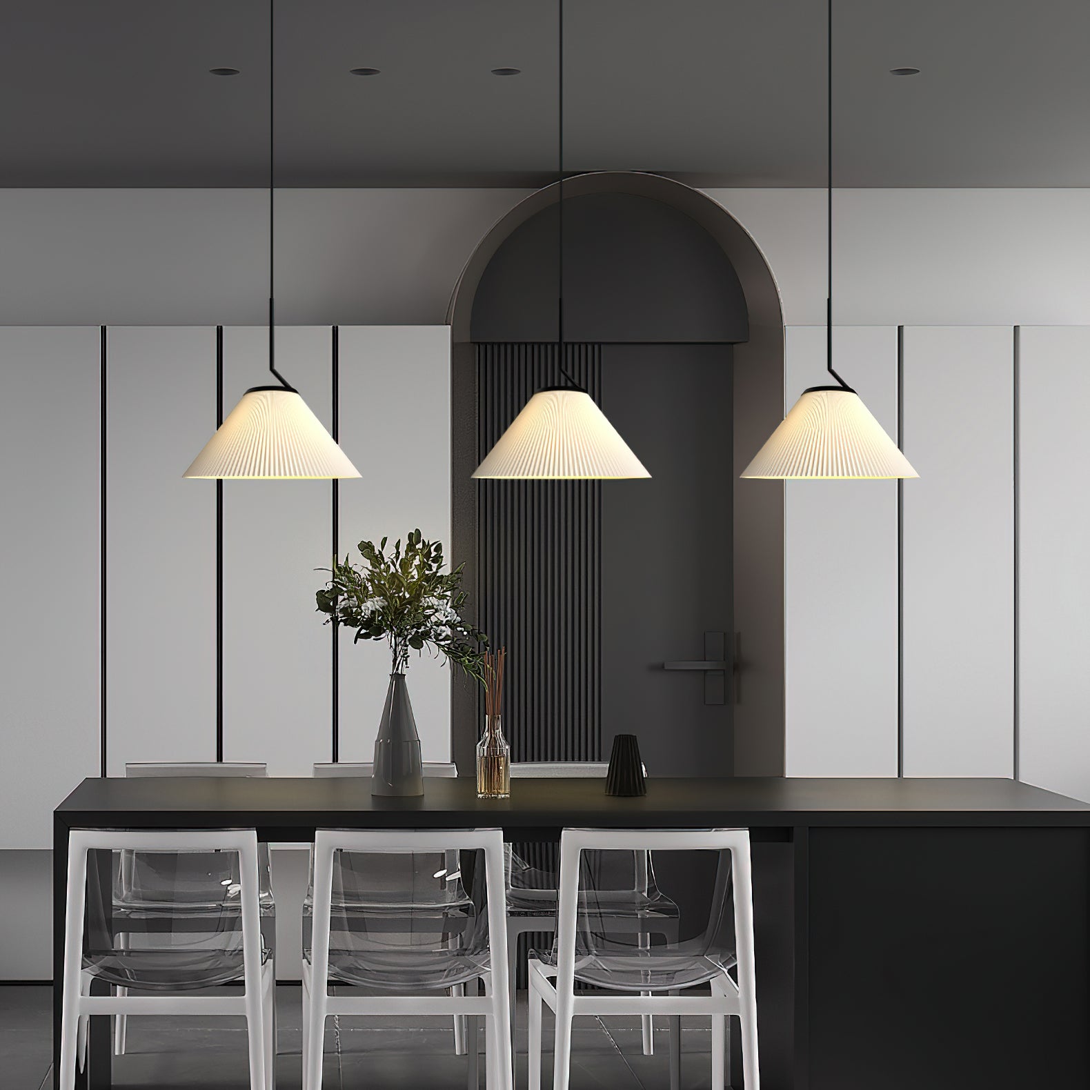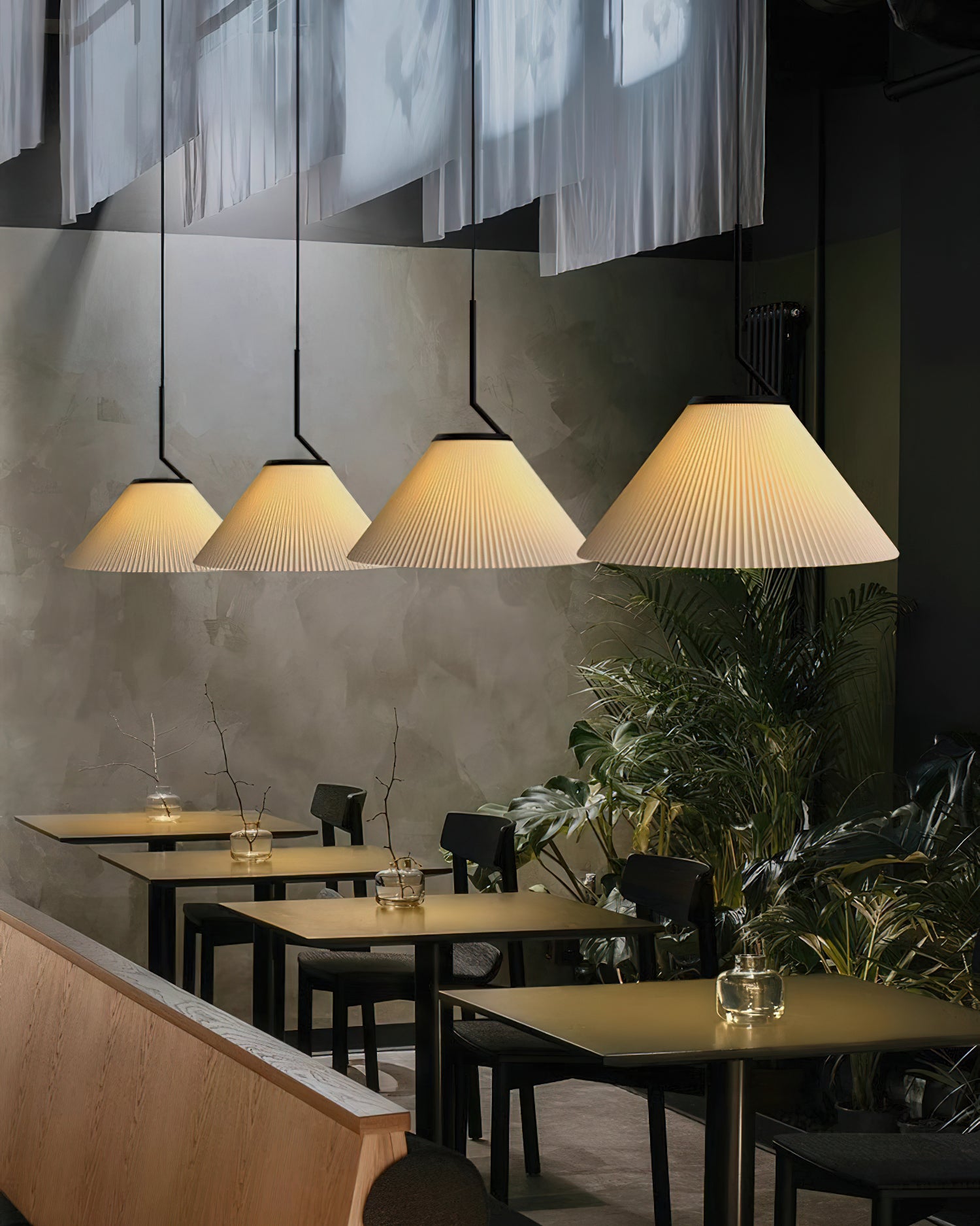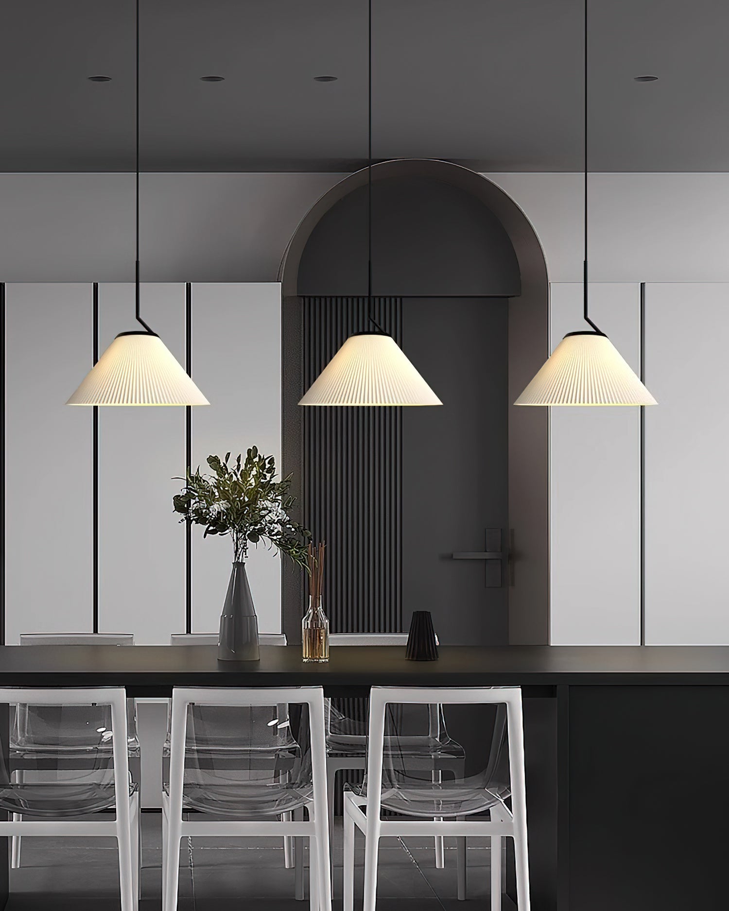 Elevate your living space with the Nobu Pleated Pendant Light from Mooijane. Inspired by the classic look of a pleated skirt, this fixture features a fabric shade with meticulously folded pleats, contrasted by a structured black metal support. The result is a timeless yet modern piece that casts a warm, ambient glow in any room.