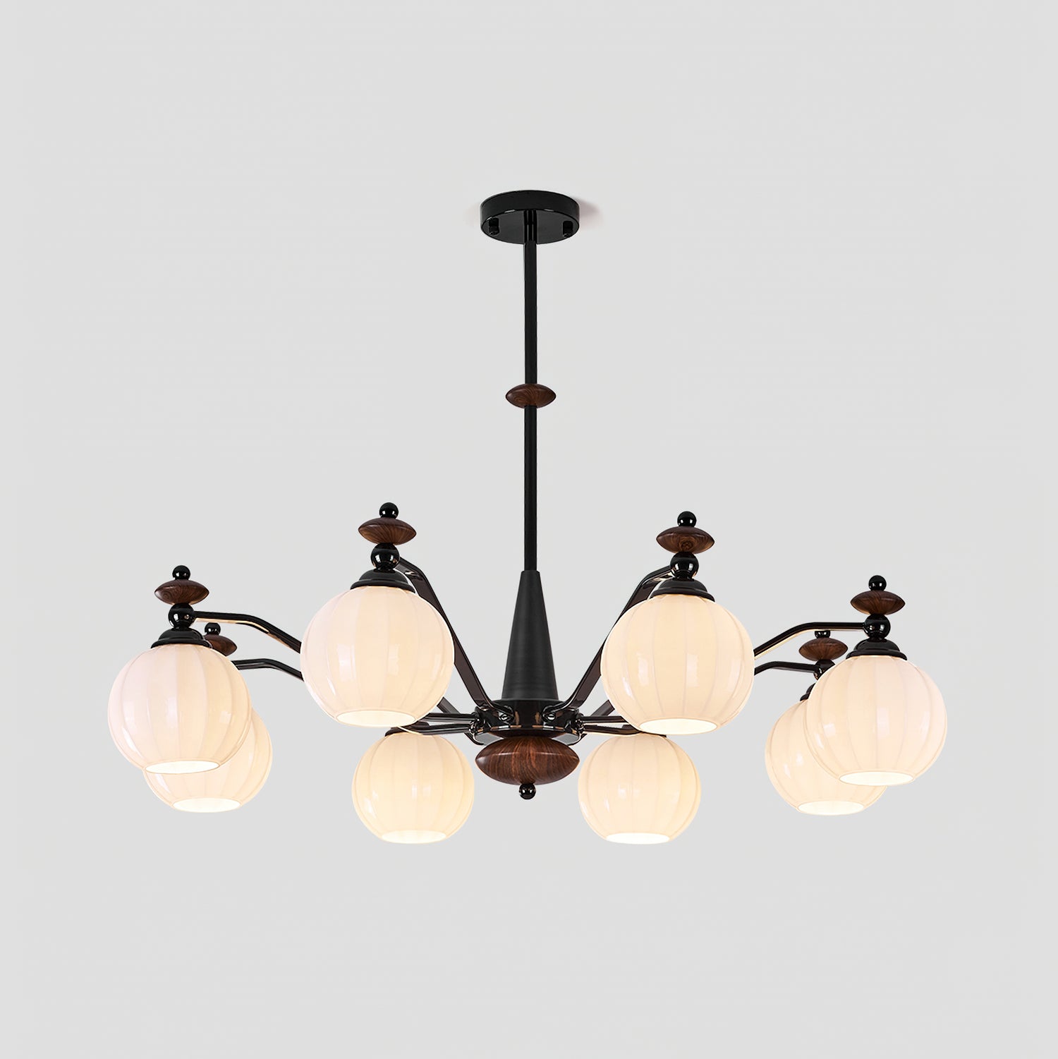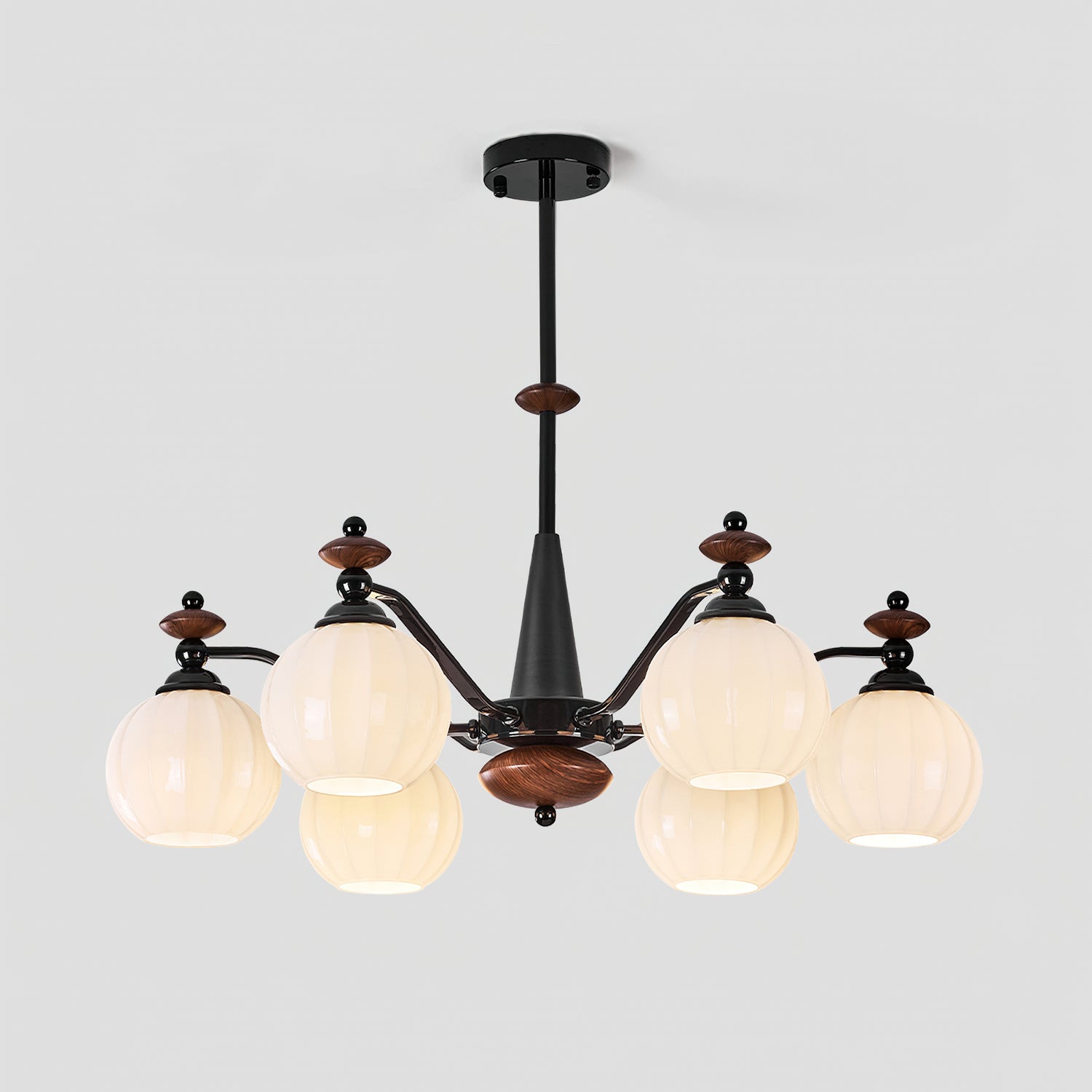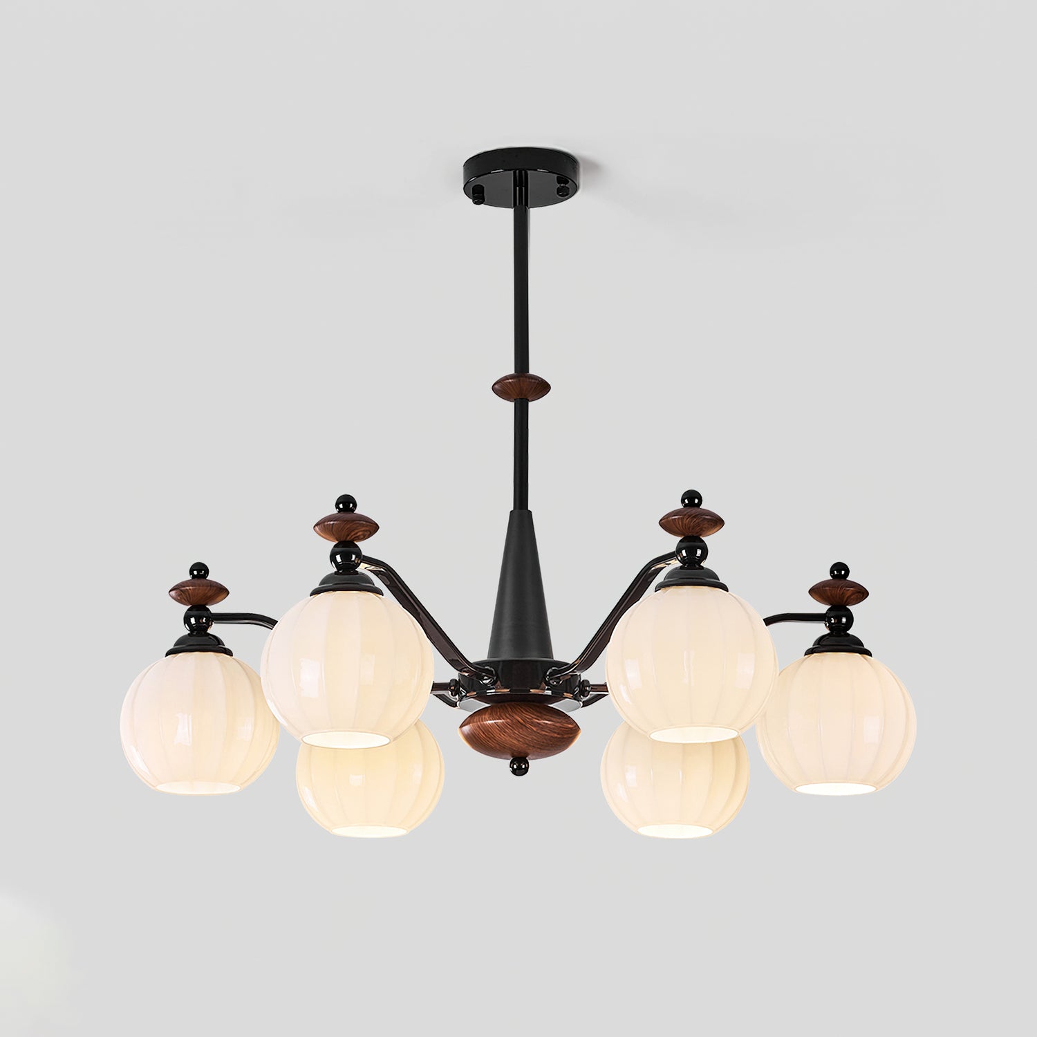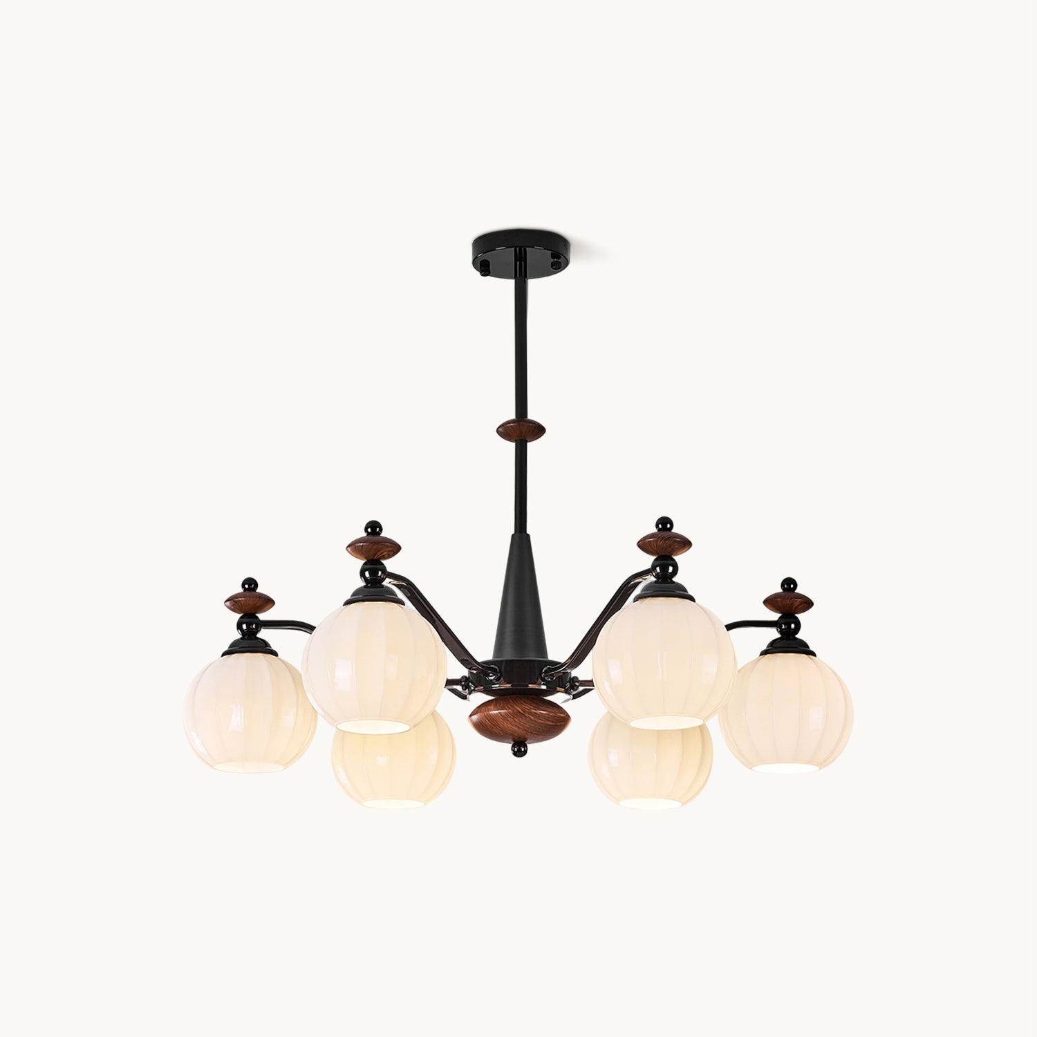 The Novaro Chandelier by Mooijane features a graceful arrangement of opaline glass globes paired with dark metal arms and warm wooden accents. Its balanced silhouette combines modern refinement with classic charm, while the softly diffused light creates a warm and inviting atmosphere. Perfect for dining rooms, living spaces, or entryways, it serves as both a functional light source and an elegant focal point for any interior.