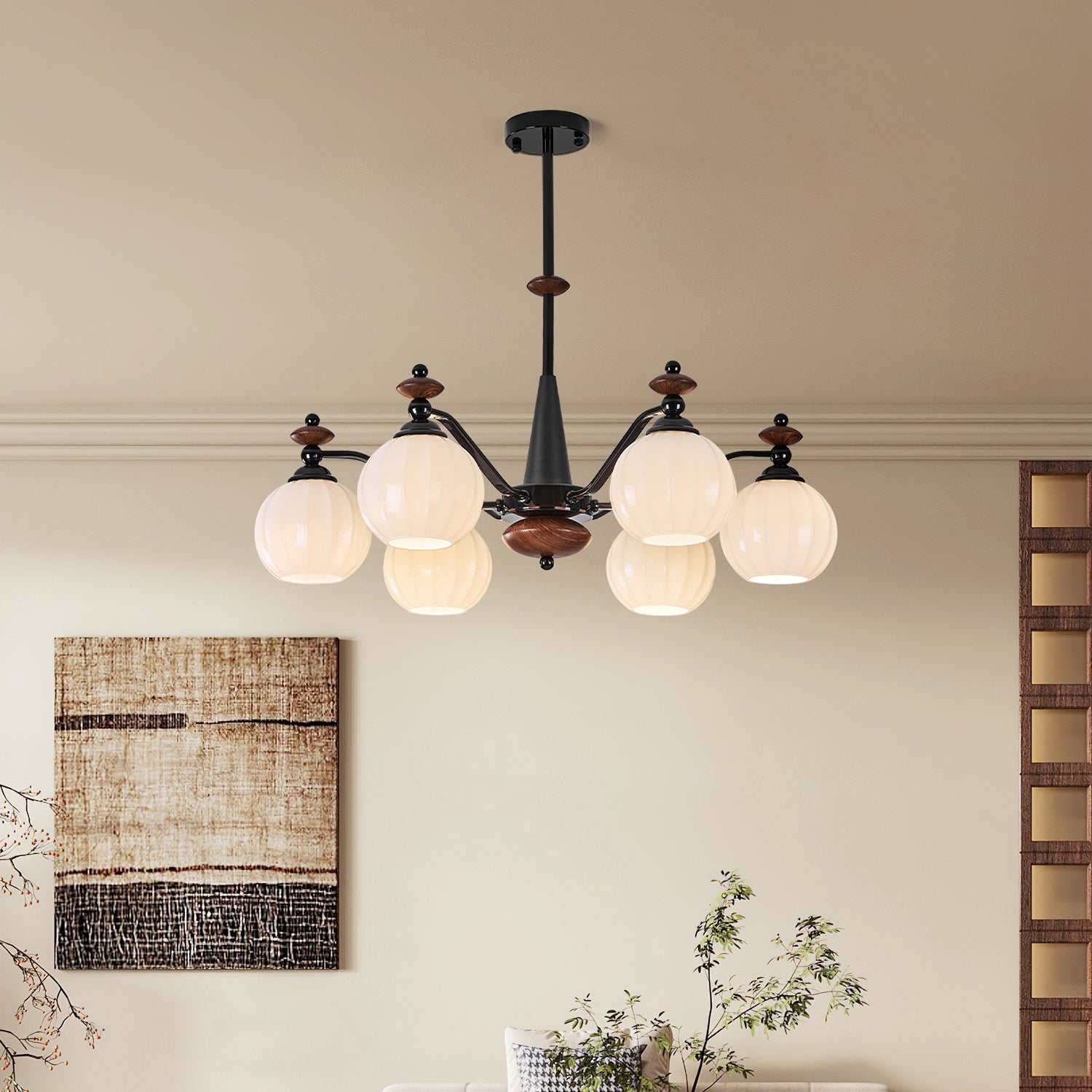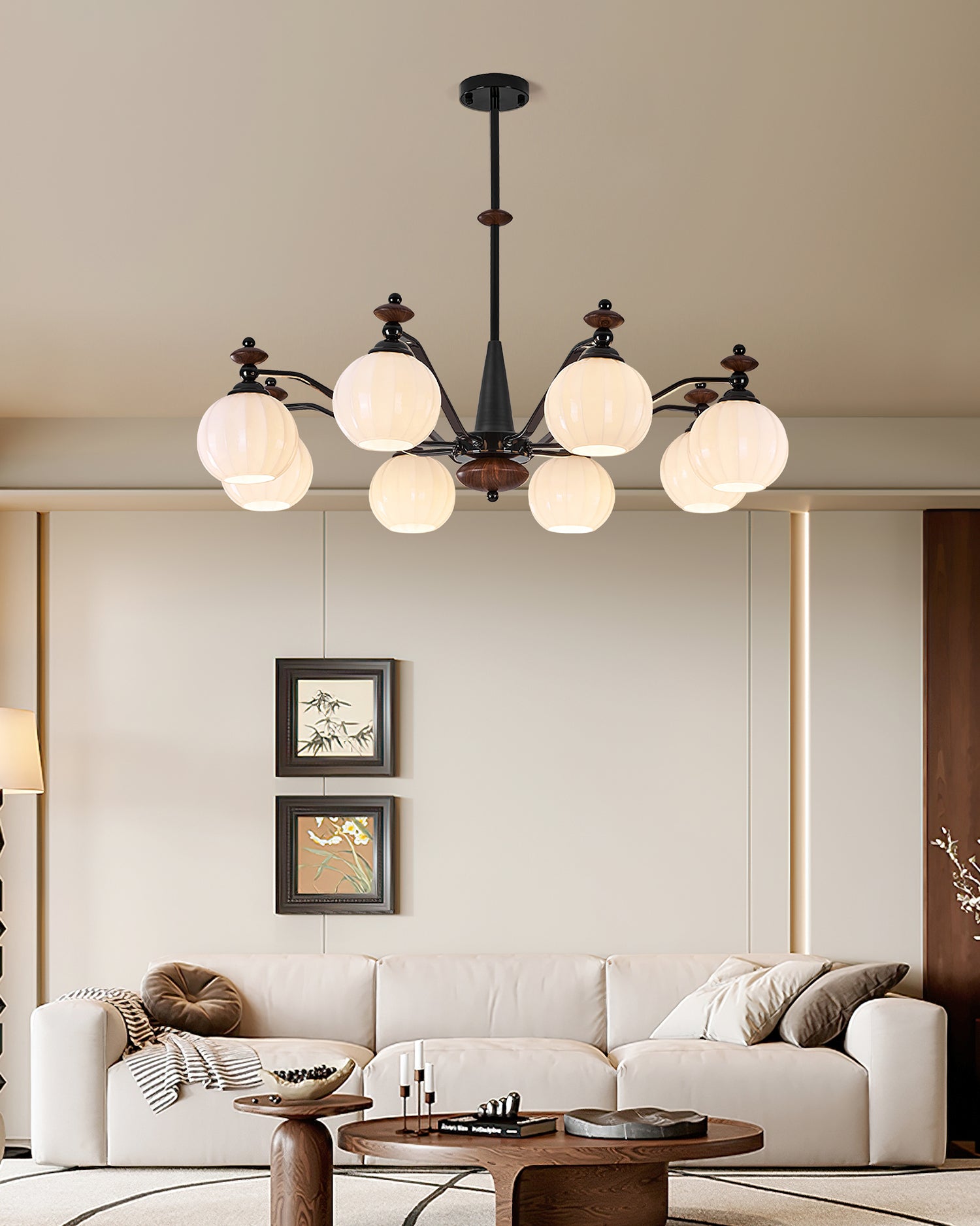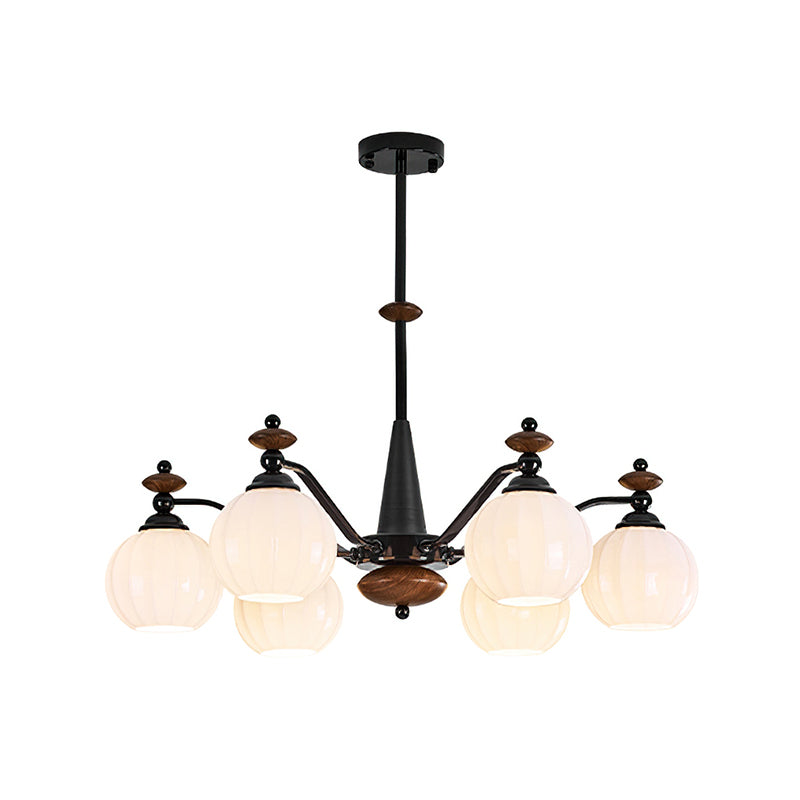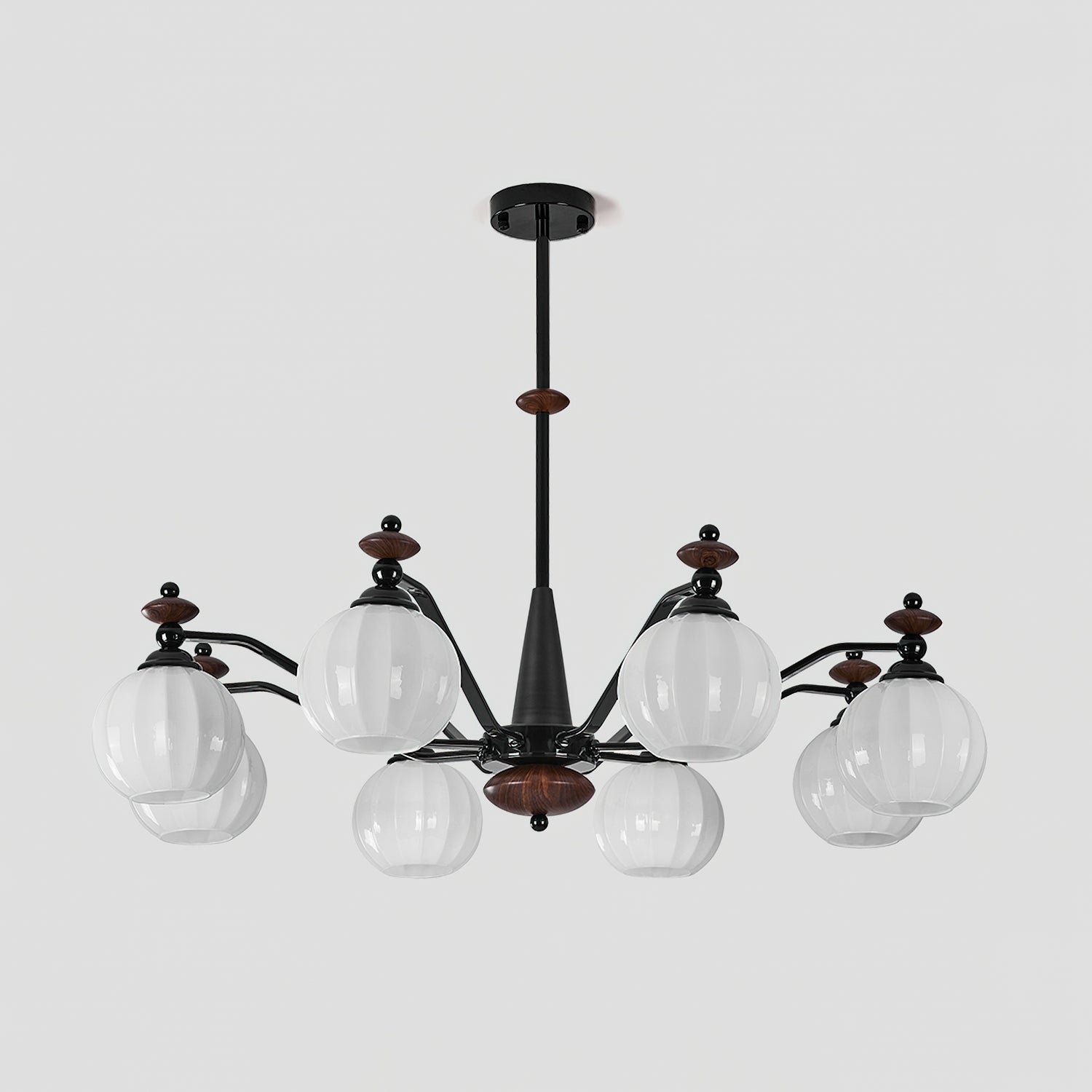 The Novaro Chandelier by Mooijane features a graceful arrangement of opaline glass globes paired with dark metal arms and warm wooden accents. Its balanced silhouette combines modern refinement with classic charm, while the softly diffused light creates a warm and inviting atmosphere. Perfect for dining rooms, living spaces, or entryways, it serves as both a functional light source and an elegant focal point for any interior.