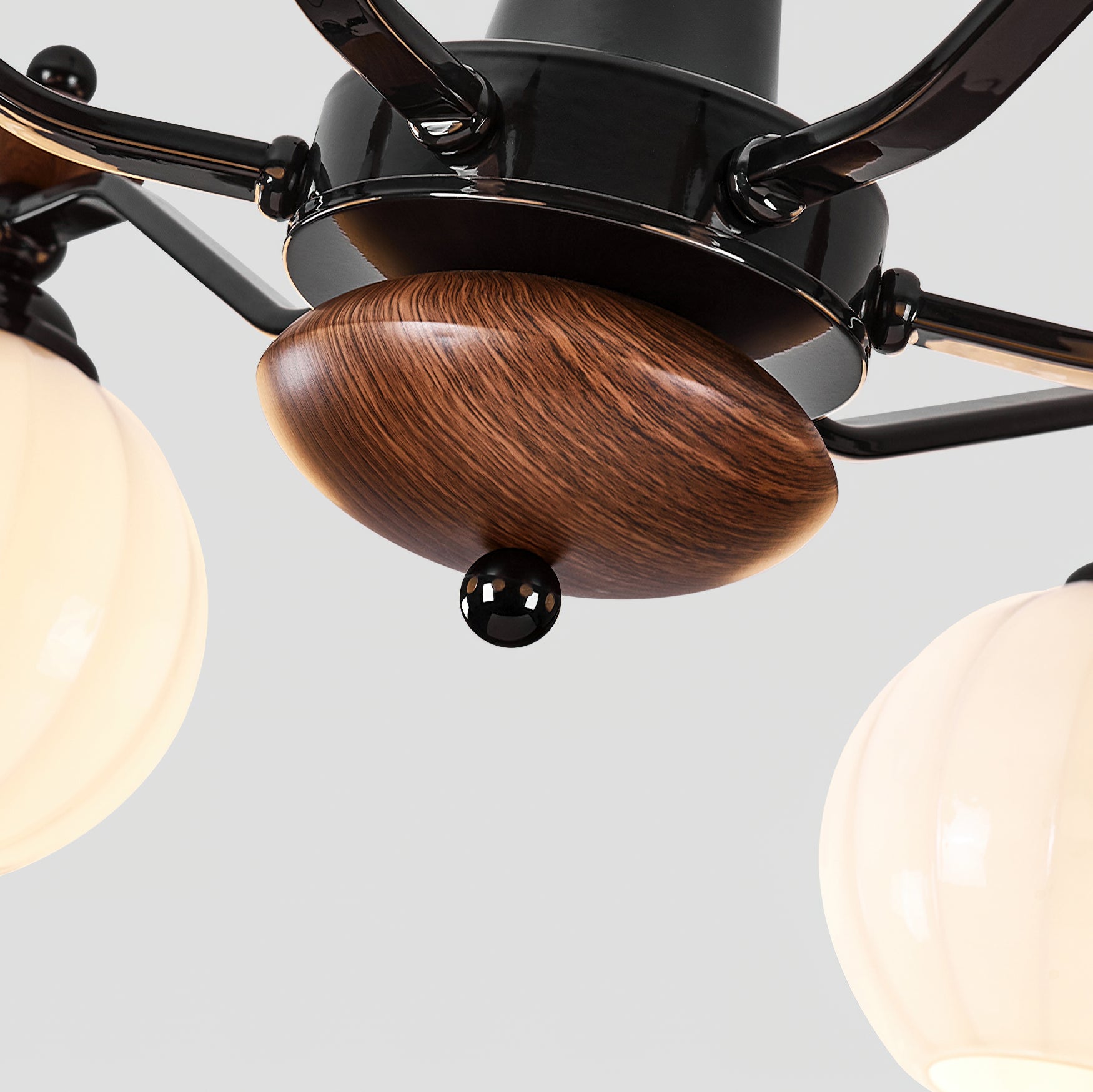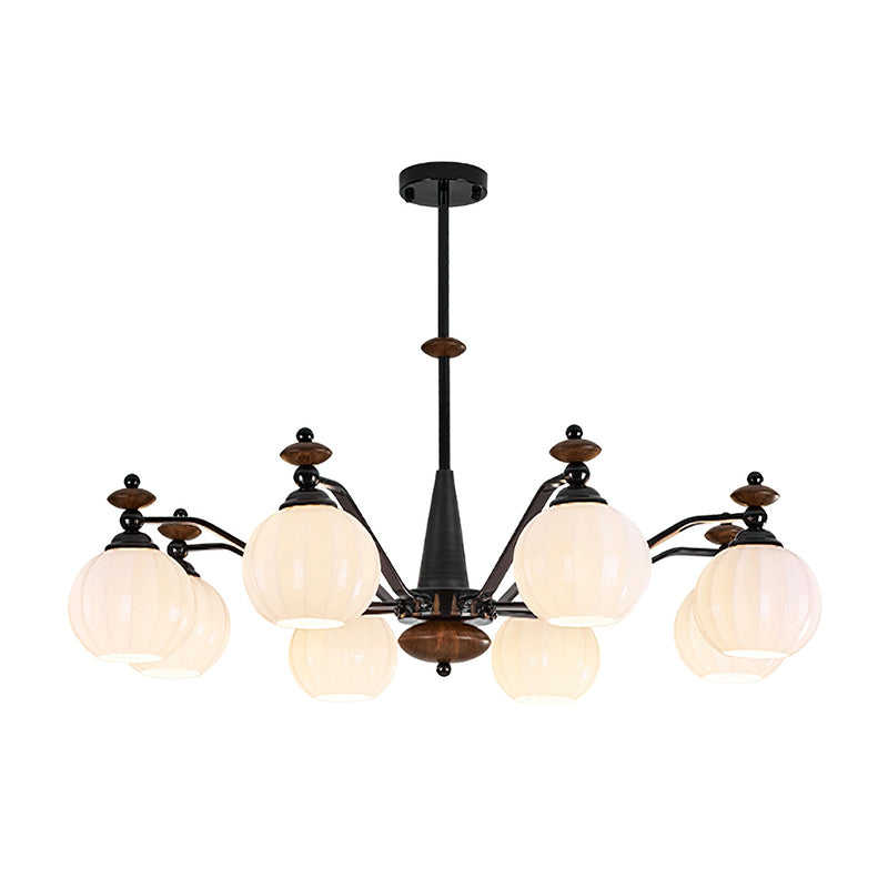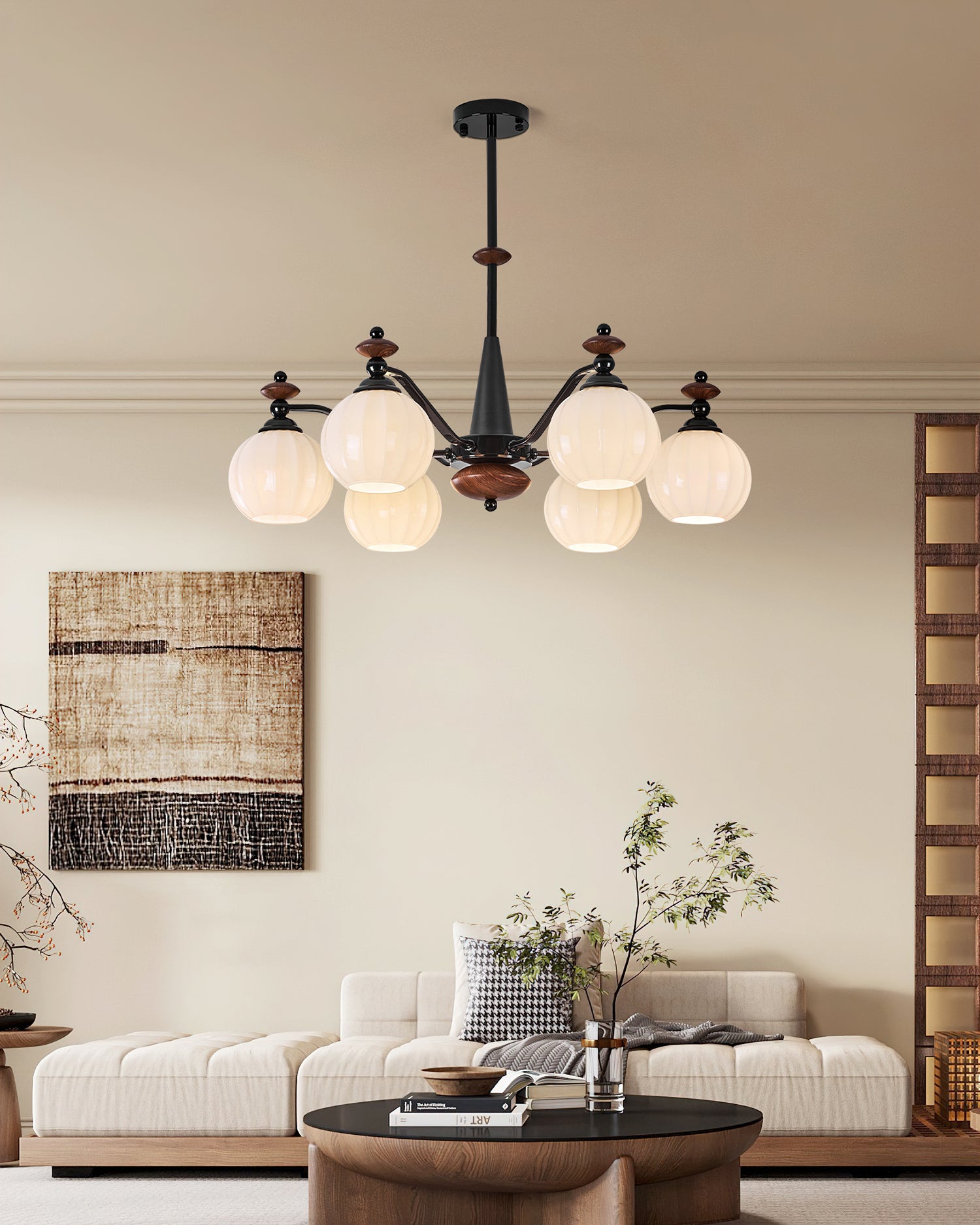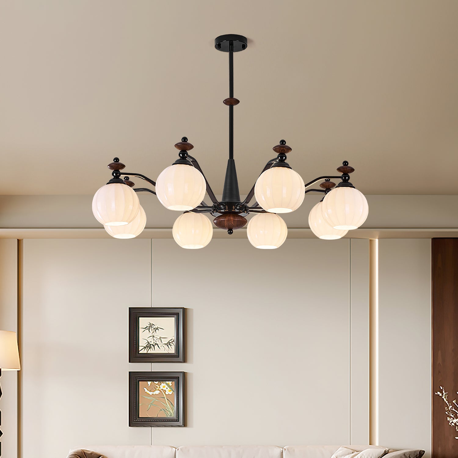The Novaro Chandelier by Mooijane features a graceful arrangement of opaline glass globes paired with dark metal arms and warm wooden accents. Its balanced silhouette combines modern refinement with classic charm, while the softly diffused light creates a warm and inviting atmosphere. Perfect for dining rooms, living spaces, or entryways, it serves as both a functional light source and an elegant focal point for any interior.