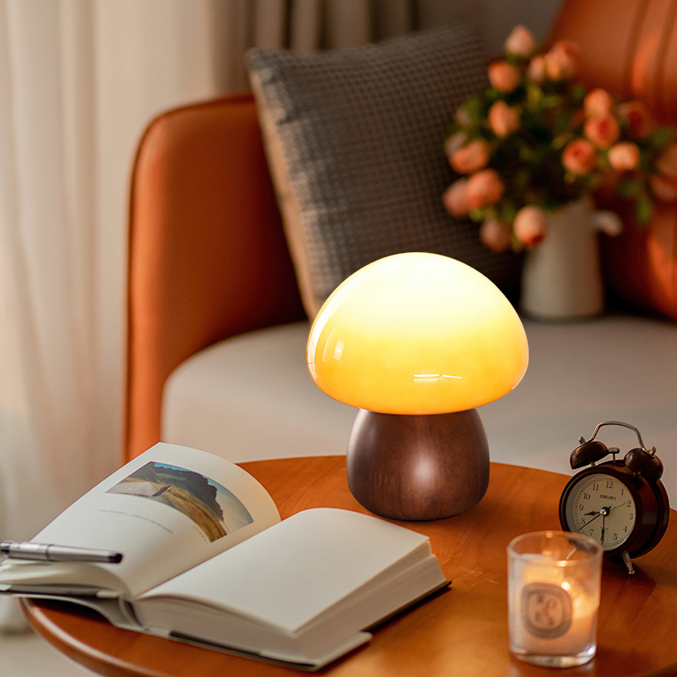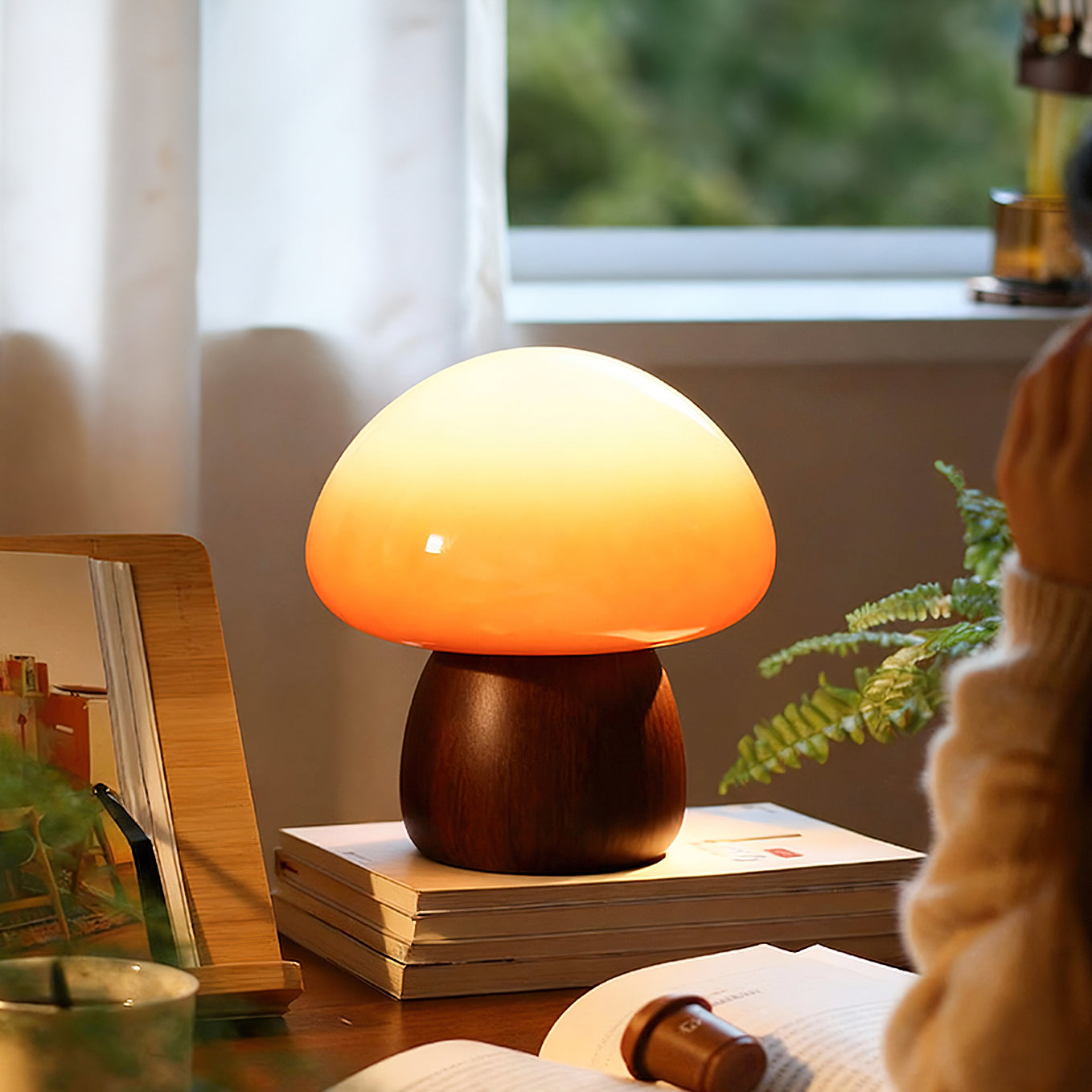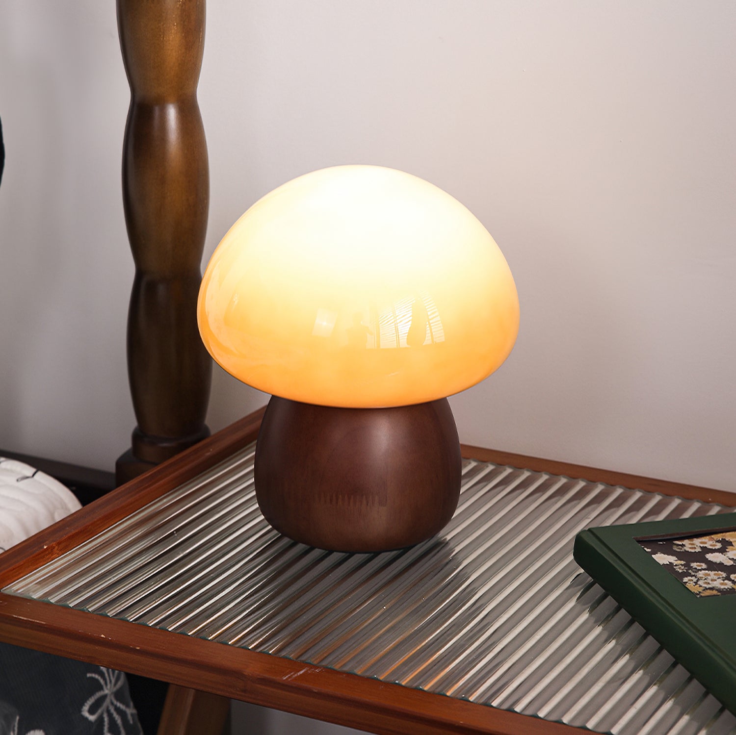 The Obello Table Lamp from Mooijane brings a warm, nature-inspired presence to any space with its serene, sculptural form. Its solid wood base is shaped into a smooth, rounded silhouette that feels grounded and organic, while the hand-blown glass shade features a gentle gradient reminiscent of a softly glowing mushroom cap. When illuminated, the glass diffuses a rich, ambient light that enhances the warm tones and natural texture of the wood.
