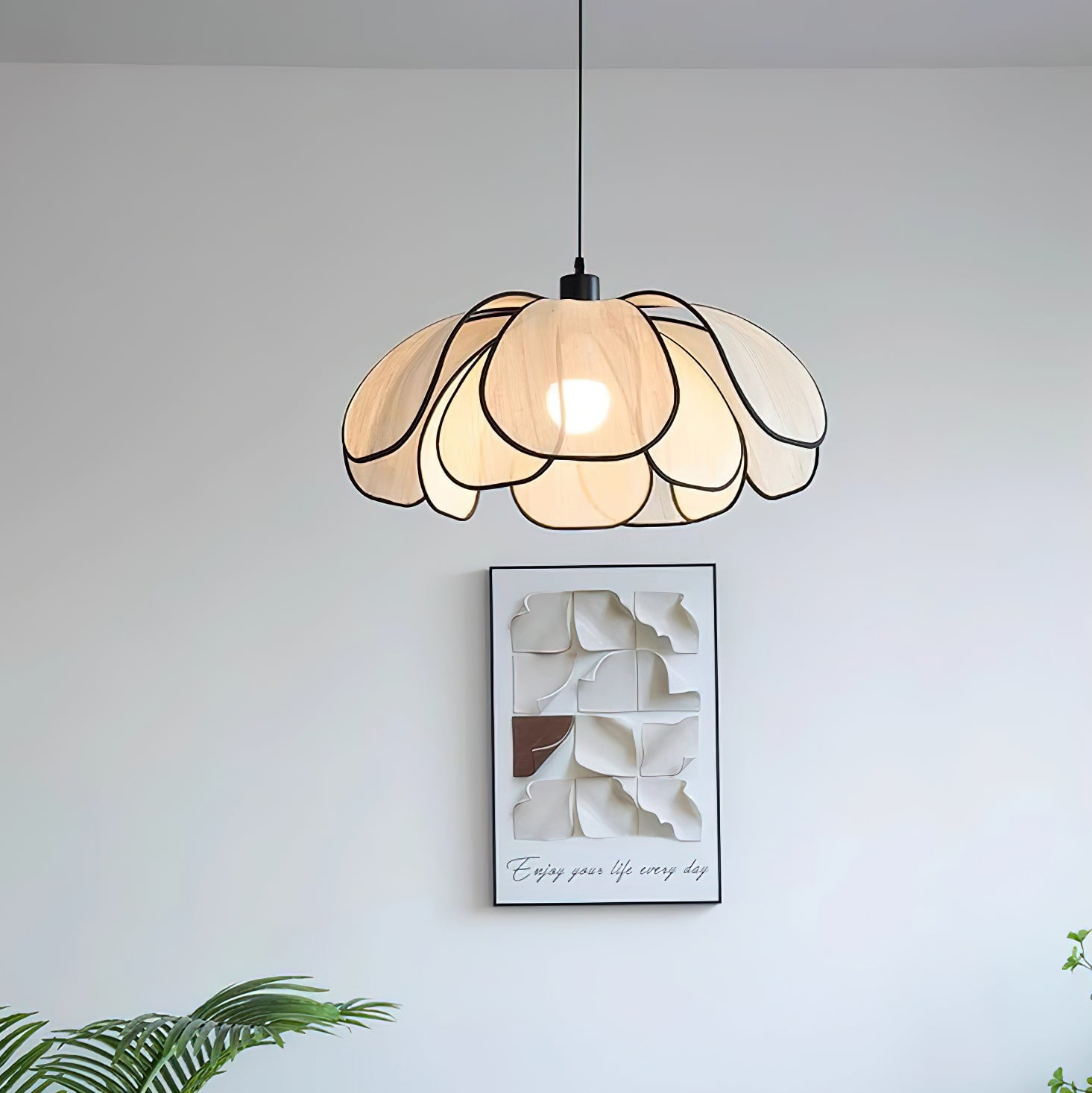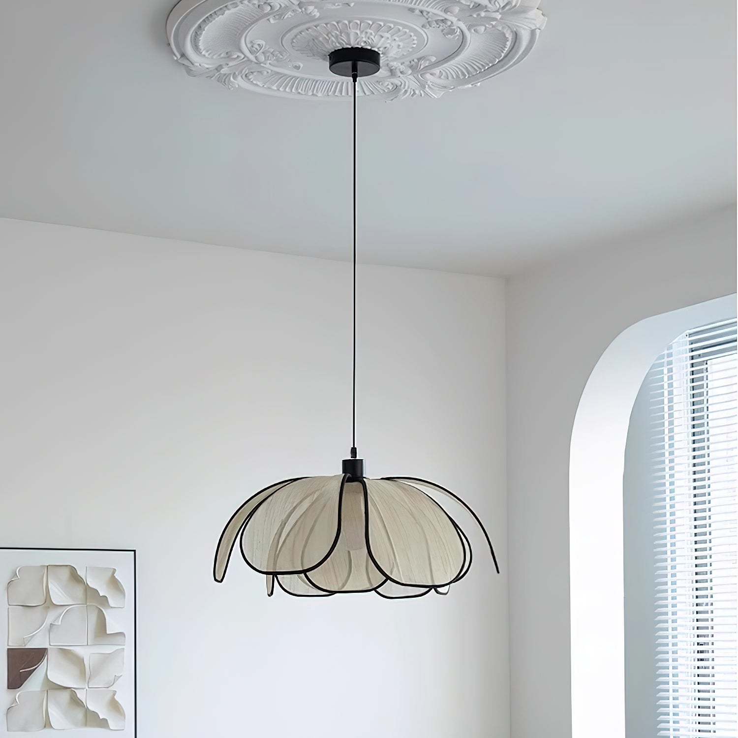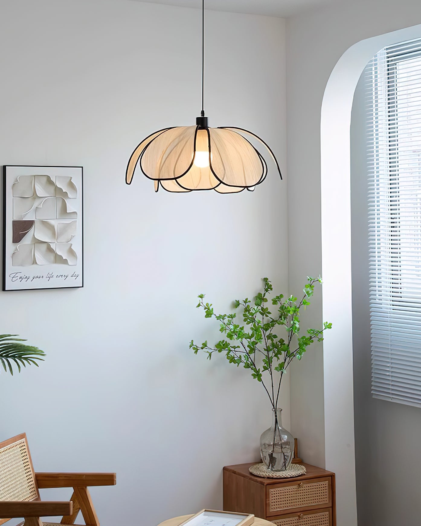 The Okai Pendant Lamp combines minimalistic design with natural materials, creating a contemporary lighting solution. Delicate, overlapping Abaca petals gracefully encase a warm, glowing light source, adding a touch of art to any space. Cast an inviting light and create a serene atmosphere with this elegant lamp.