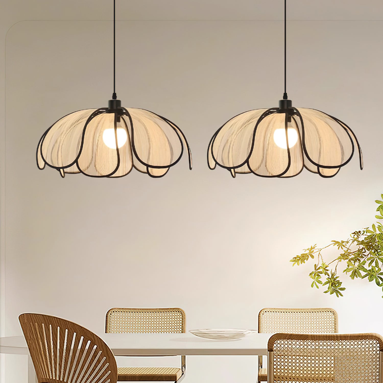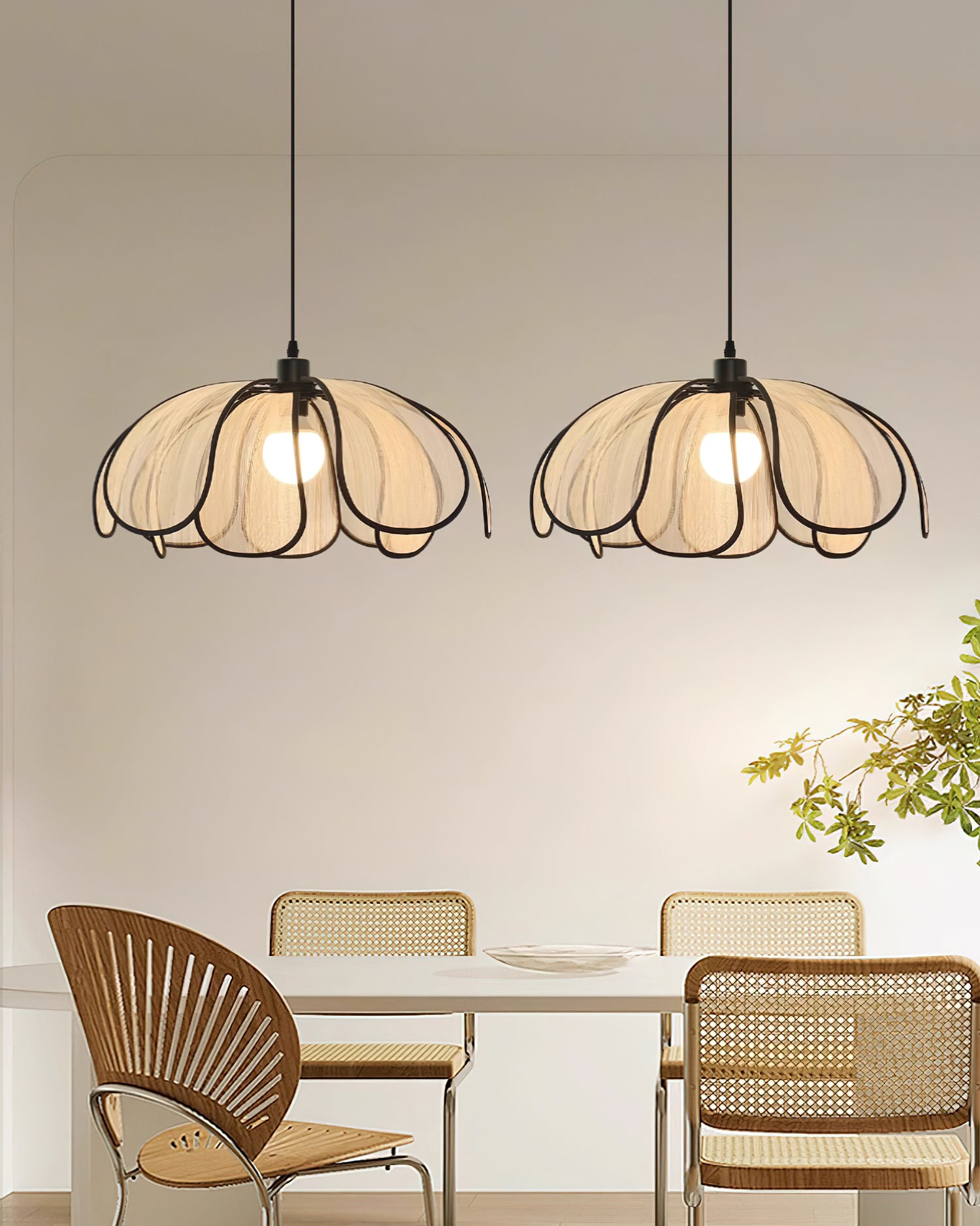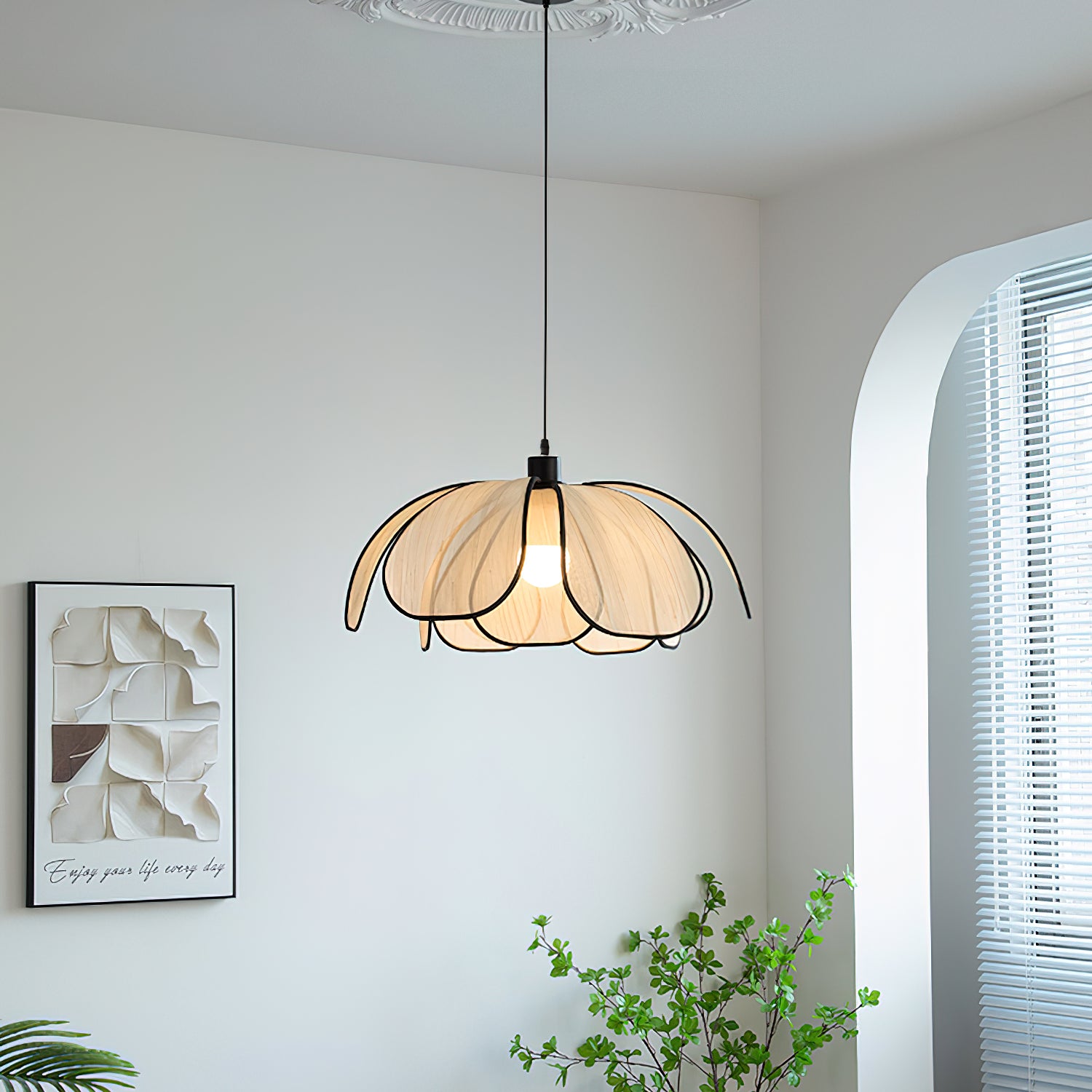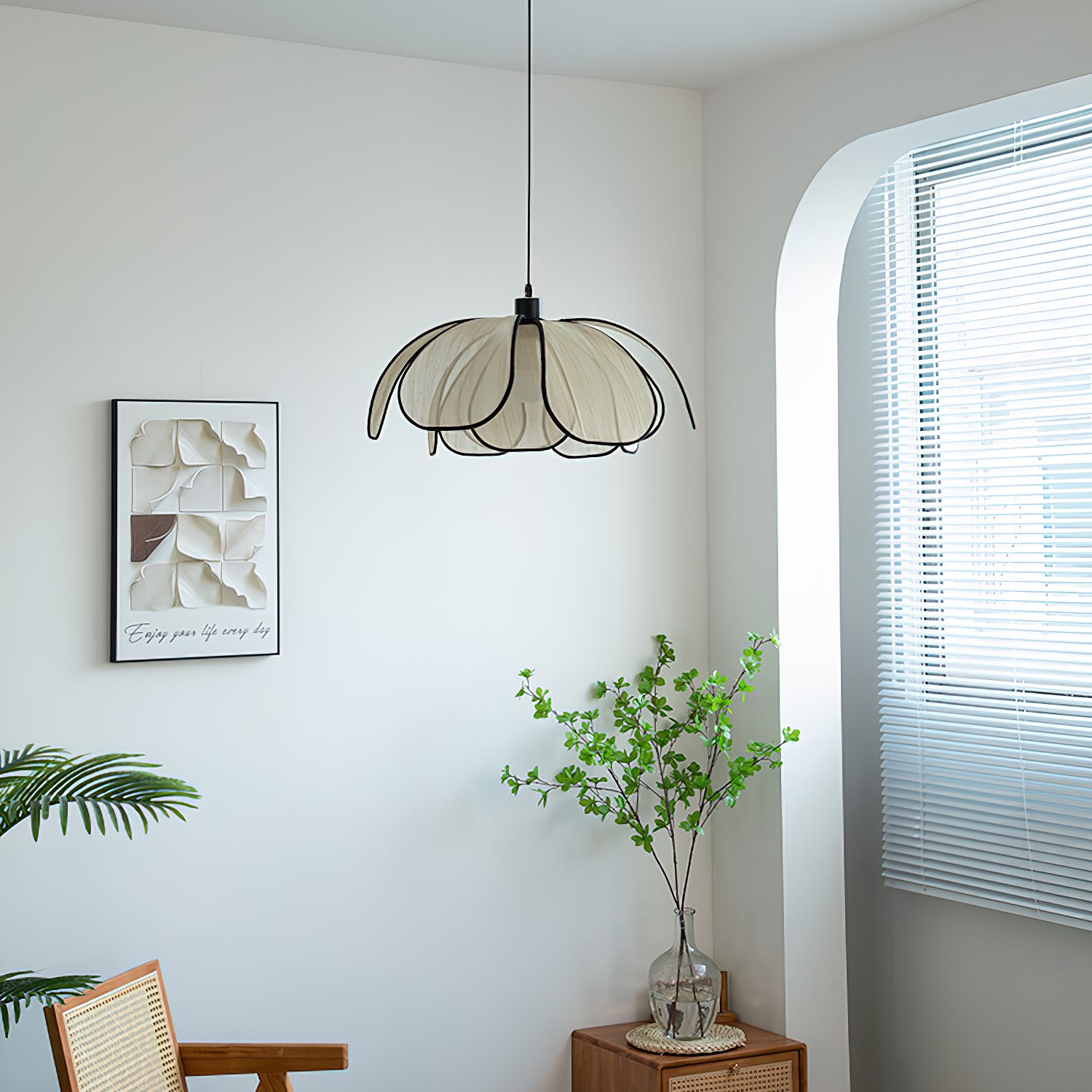 The Okai Pendant Lamp combines minimalistic design with natural materials, creating a contemporary lighting solution. Delicate, overlapping Abaca petals gracefully encase a warm, glowing light source, adding a touch of art to any space. Cast an inviting light and create a serene atmosphere with this elegant lamp.