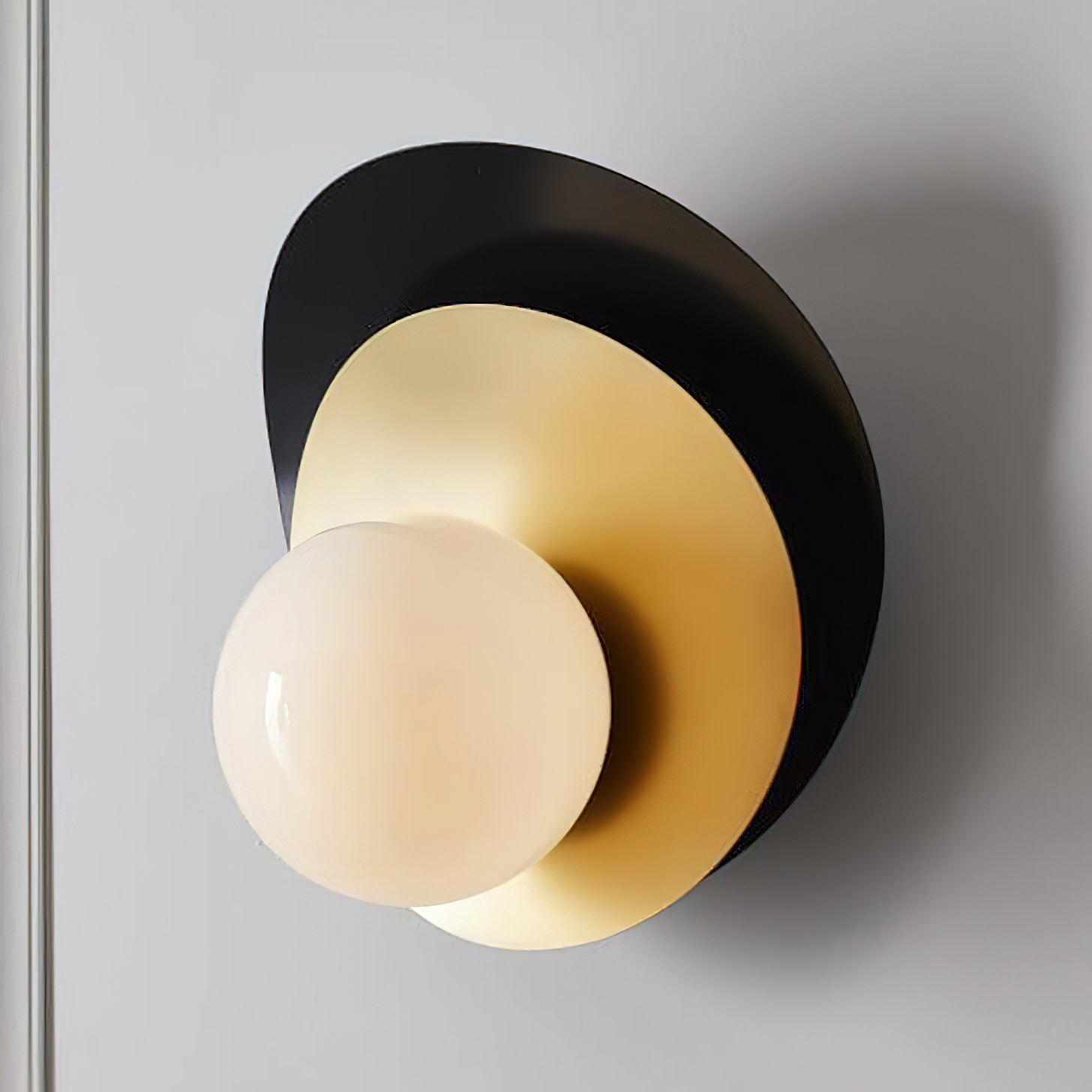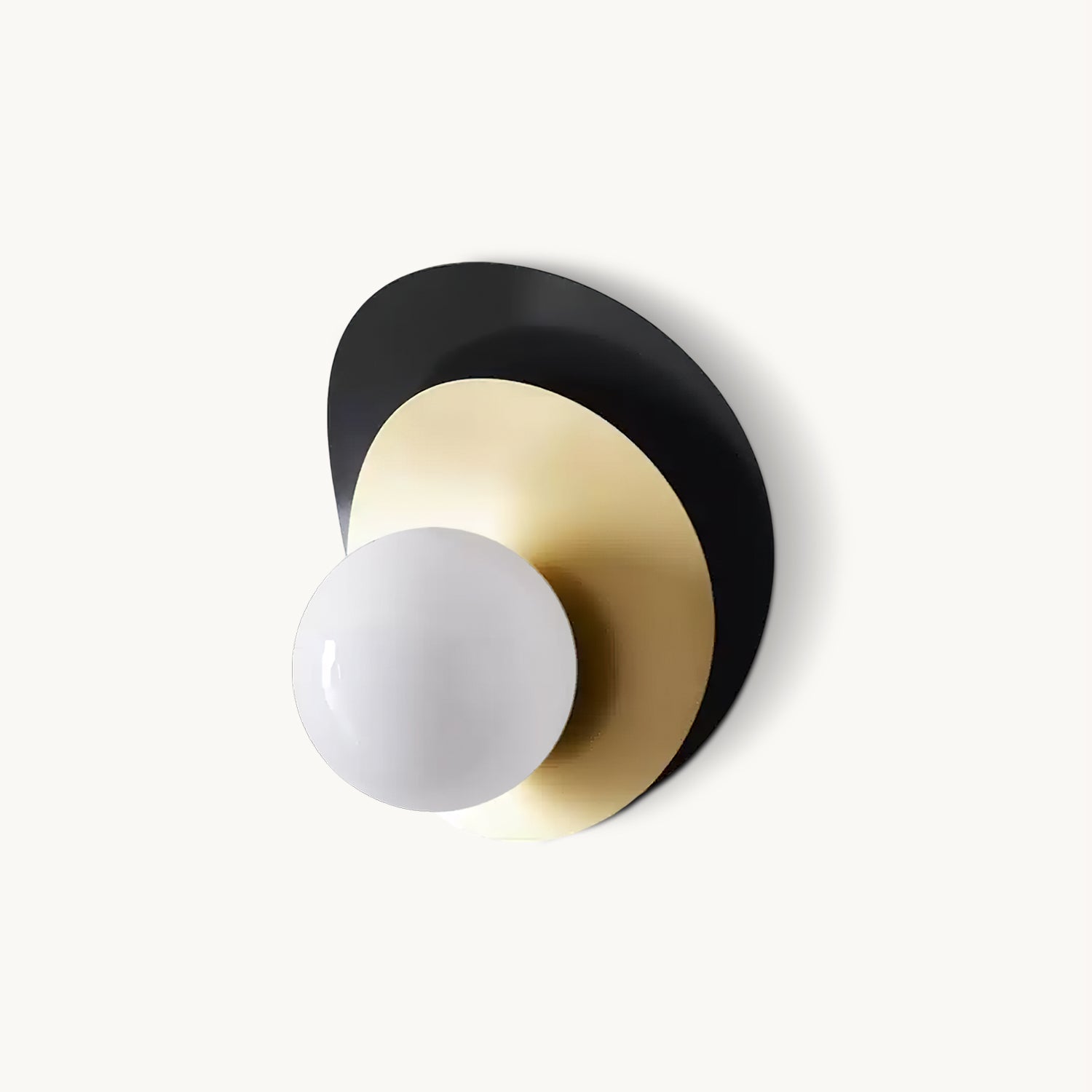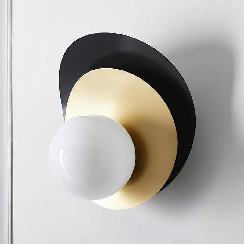 Introducing the Olivia Wall Lamp by Mooijane. This unique design combines sleek elegance and modern artistry, with a graceful glass globe that softly diffuses light and layered metal plates in a smooth curve. The interplay of black and gold creates a visually striking contrast, while the minimalist round shape offers timeless appeal.