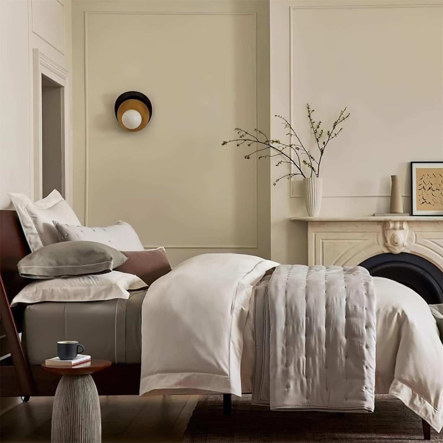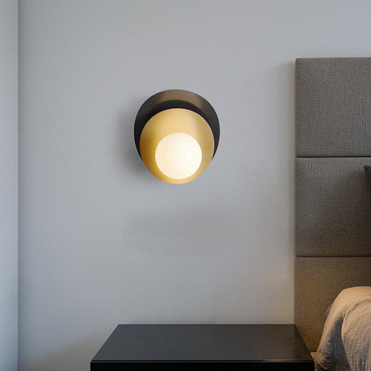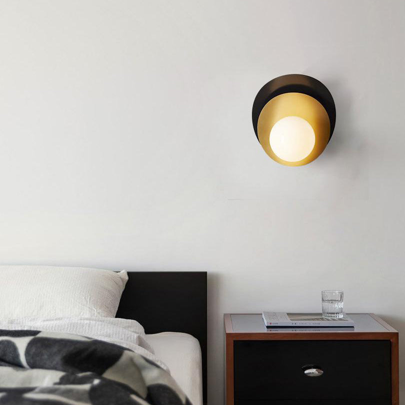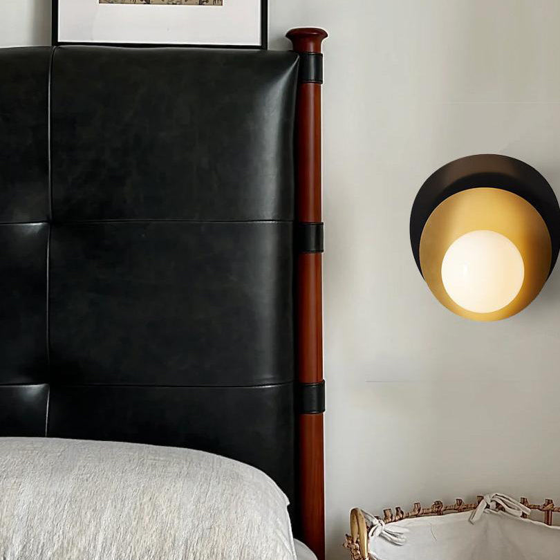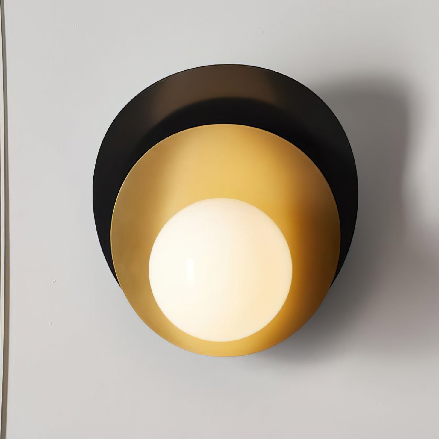 Introducing the Olivia Wall Lamp by Mooijane. This unique design combines sleek elegance and modern artistry, with a graceful glass globe that softly diffuses light and layered metal plates in a smooth curve. The interplay of black and gold creates a visually striking contrast, while the minimalist round shape offers timeless appeal.