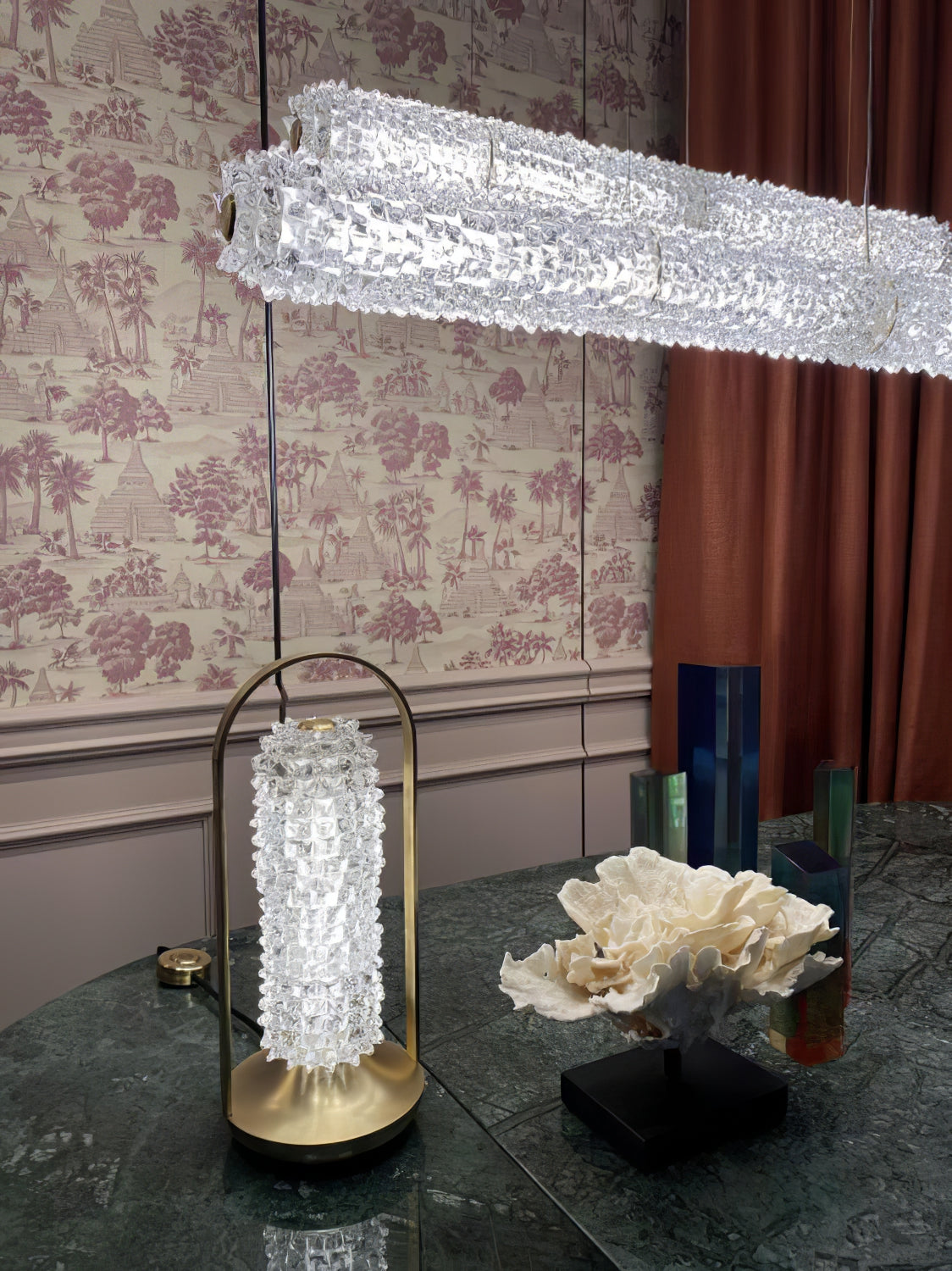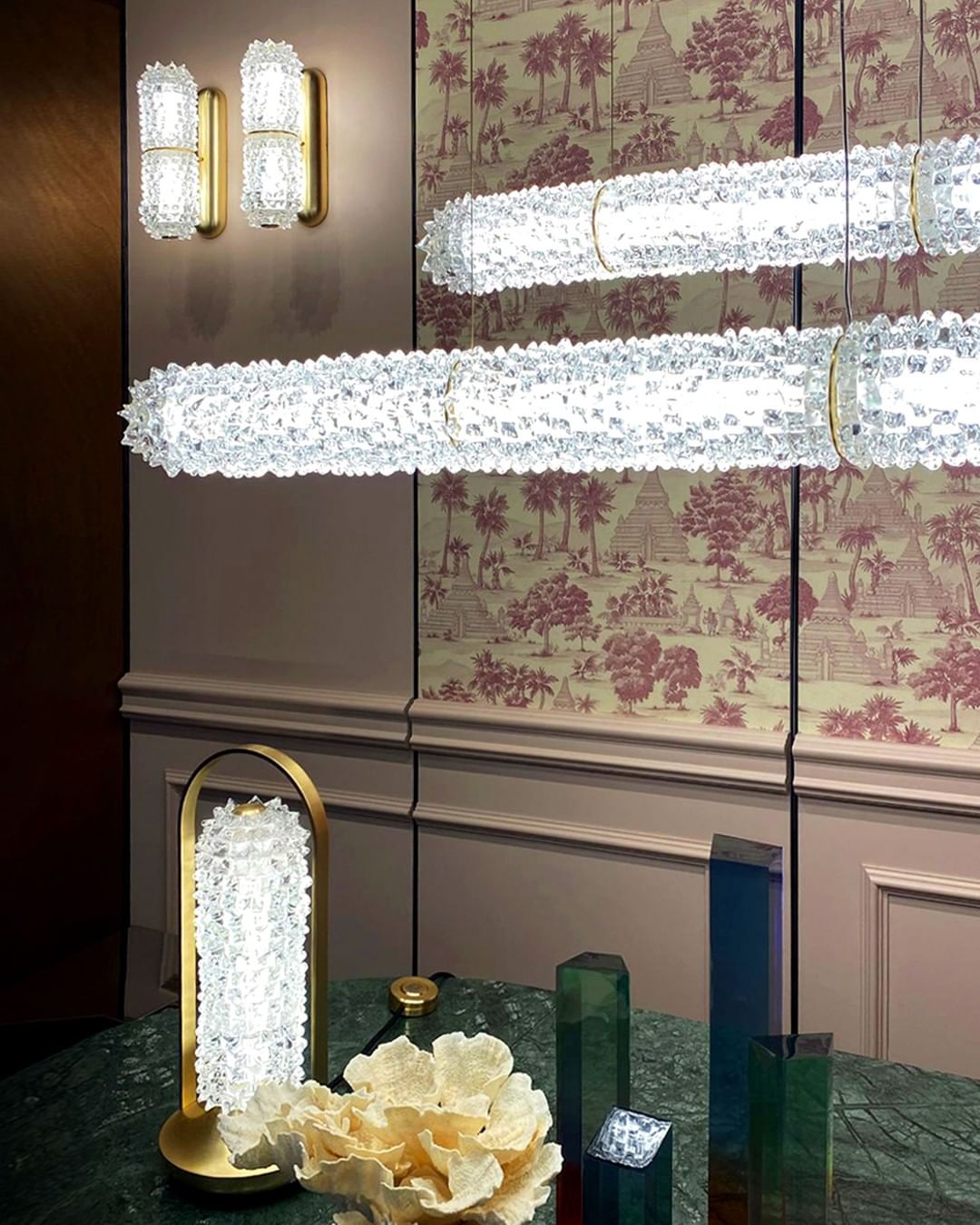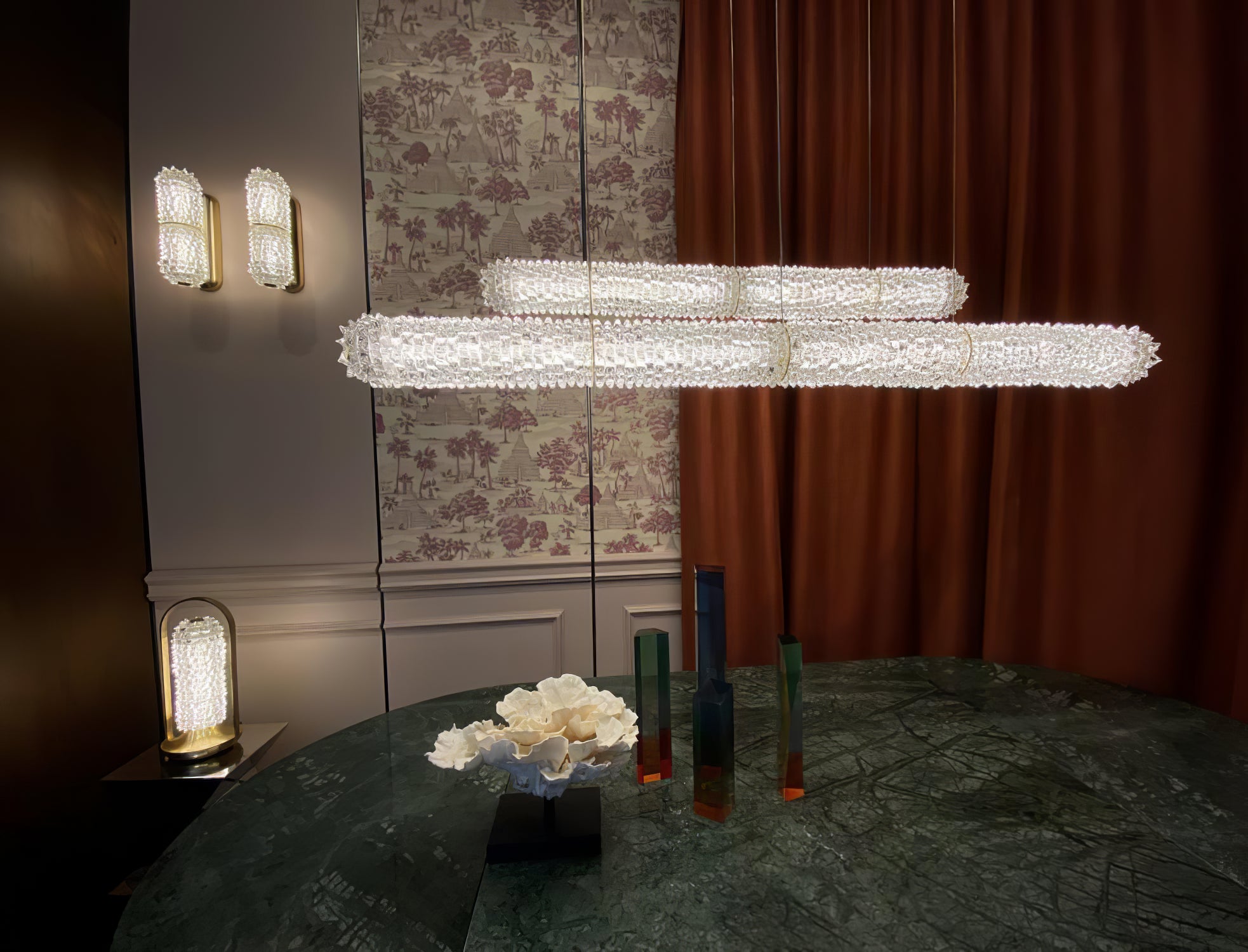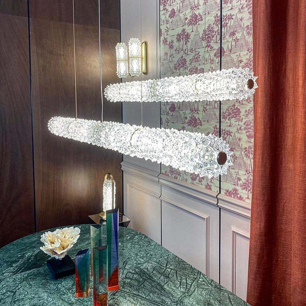 Inspired by the Opéra Garnier, it stands out for its eclectic, decorative character, expressed in stylistic mixtures and remarkable compositional balance. The references to a certain Baroque splendor are tempered by more minimal, contemporary touches, generating a delicate, harmonious dichotomy. The design challenge was to bring out the artistry and heritage of the company, a repository of the art of glass for over seven centuries. The outcome of this creative effort is a timeless, elegant design, rich but not redundant, with a direct, incisive personality.