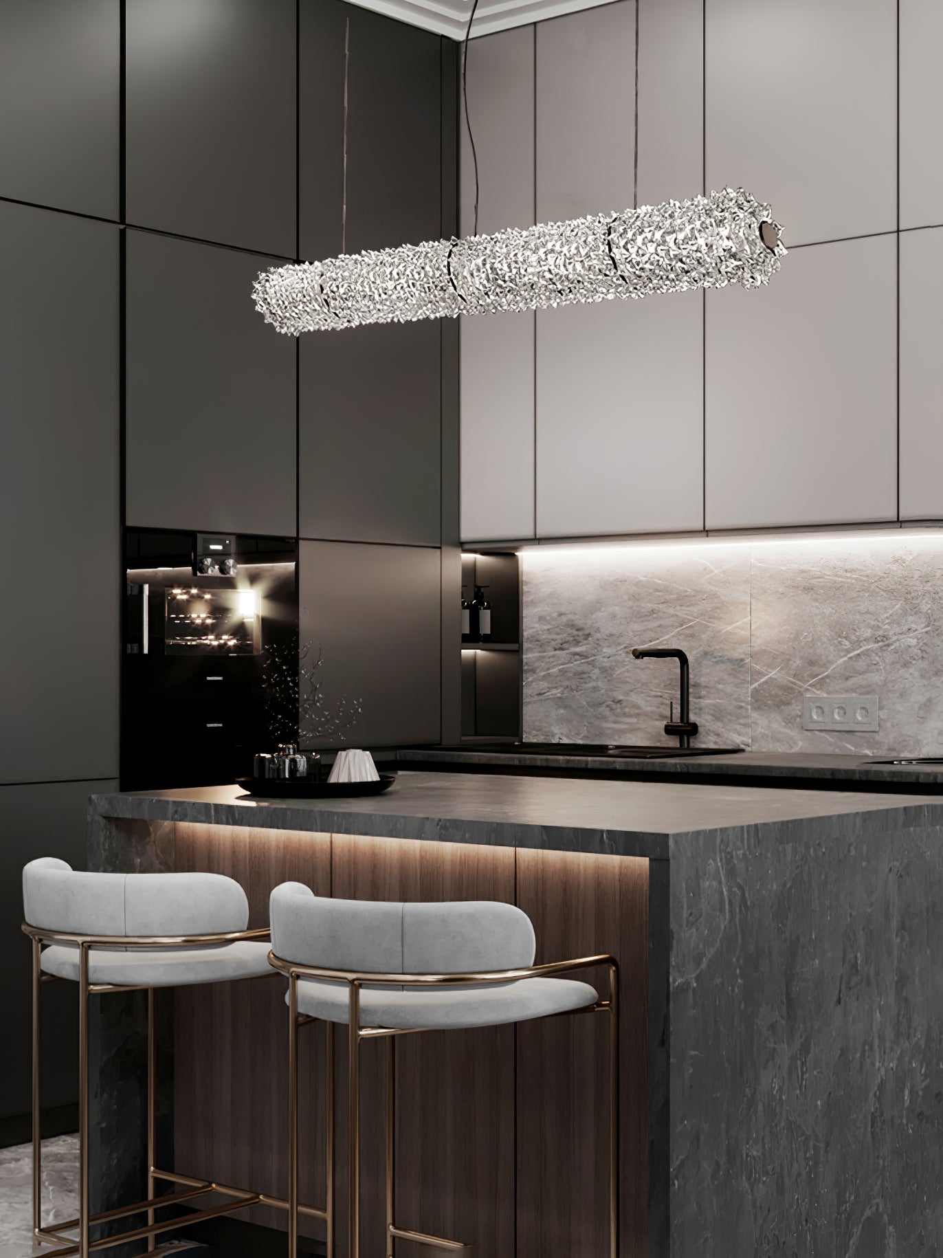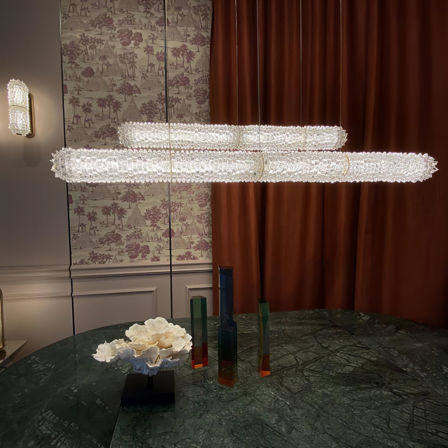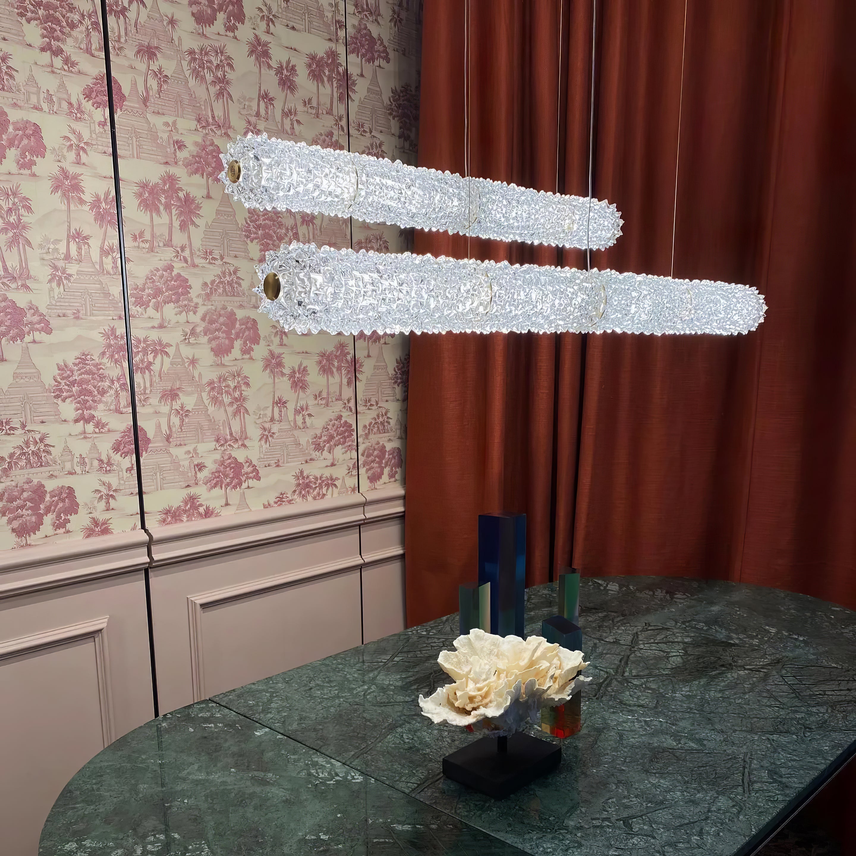 Inspired by the Opéra Garnier, it stands out for its eclectic, decorative character, expressed in stylistic mixtures and remarkable compositional balance. The references to a certain Baroque splendor are tempered by more minimal, contemporary touches, generating a delicate, harmonious dichotomy. The design challenge was to bring out the artistry and heritage of the company, a repository of the art of glass for over seven centuries. The outcome of this creative effort is a timeless, elegant design, rich but not redundant, with a direct, incisive personality.