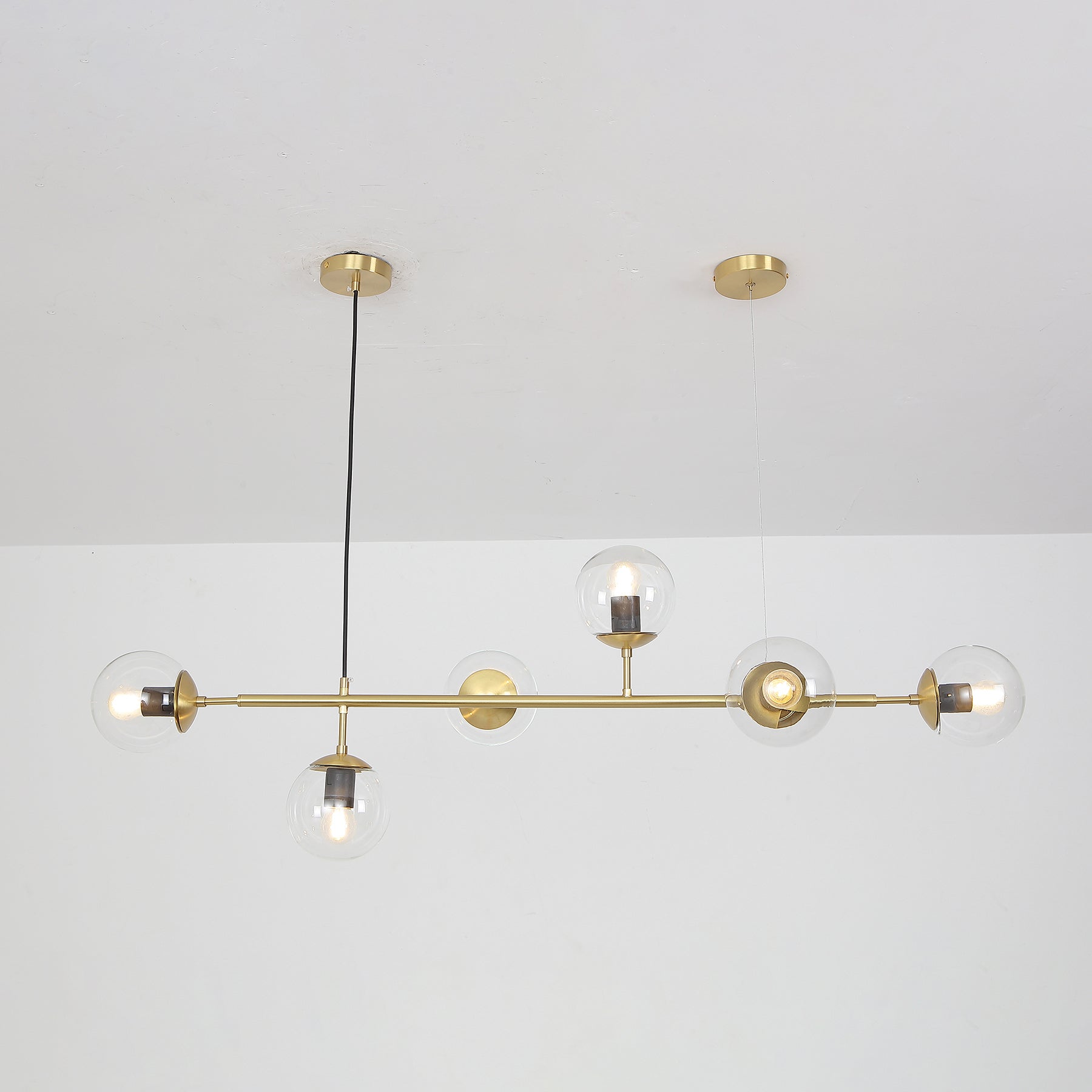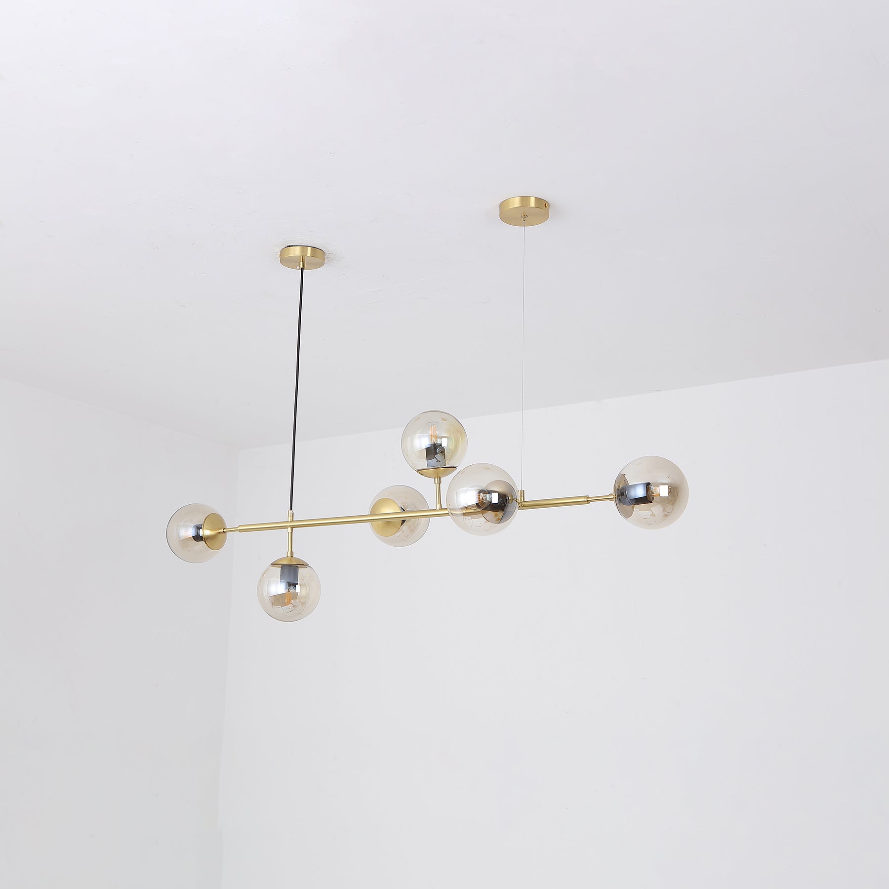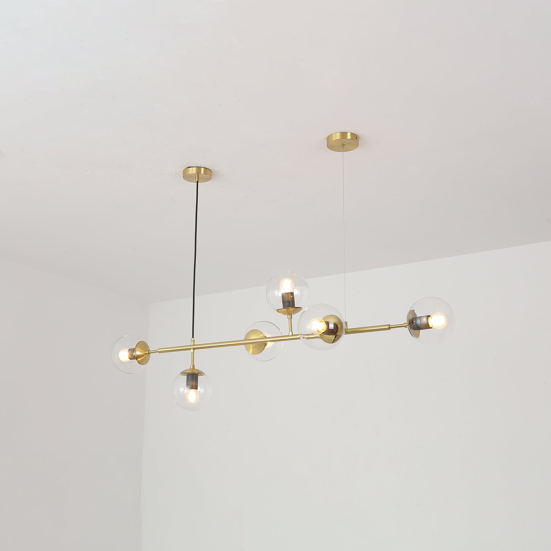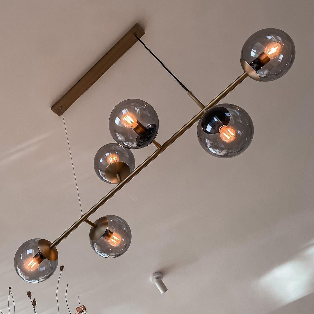 Like beads on a cord. Perfect, round glass beads spread a reflective, shiny light into the room. The light from the Orb hanging lamp creates an exclusive atmosphere that looks stringent, but also liberating nonchalantly. The combination of brass and glass gives your interior an industrial touch. Cantilevered ropes connect glass balls in all directions along a line to create a visually compelling display. Vertical or horizontal versions are available. Show above your hallway or table. If you need a black light body, please contact us.