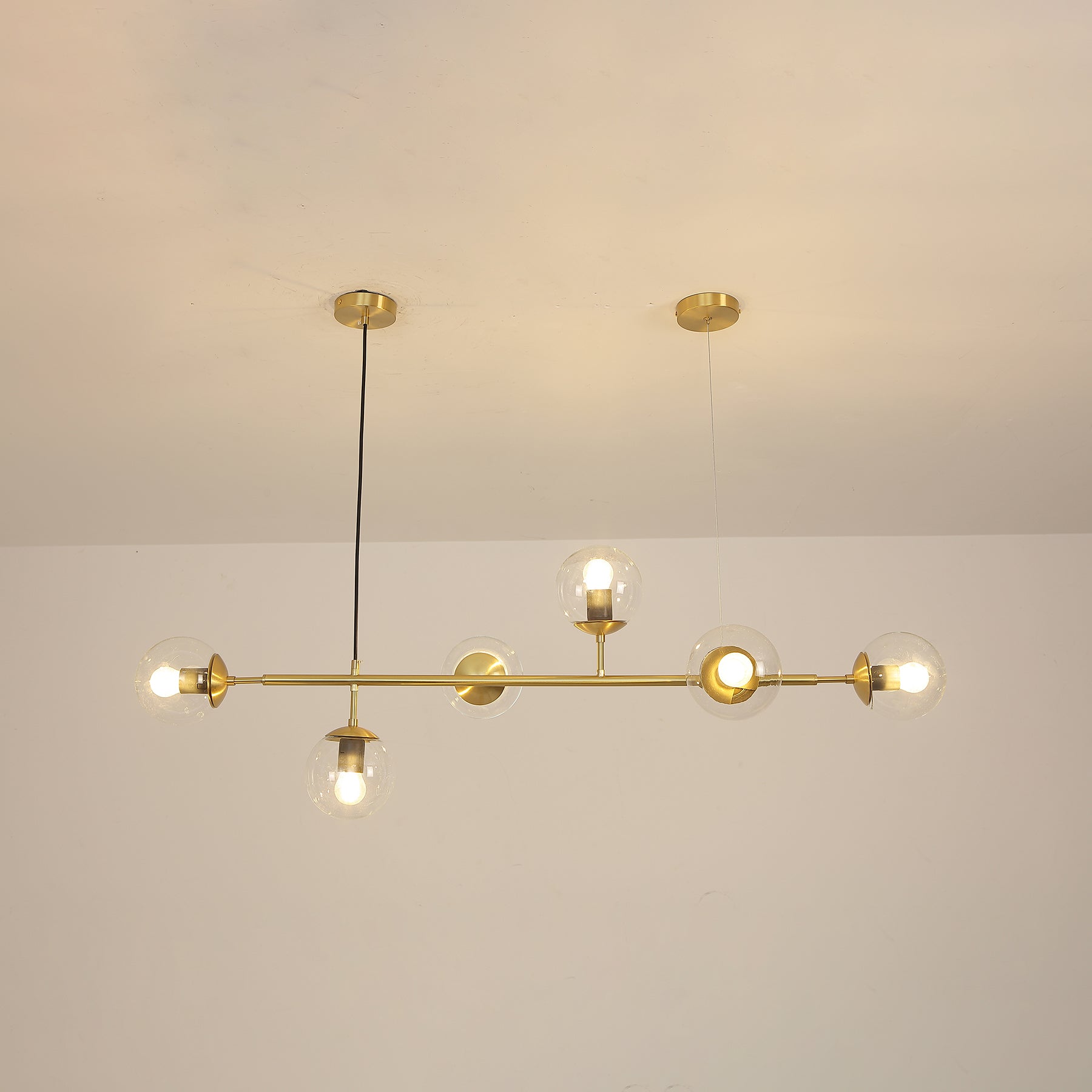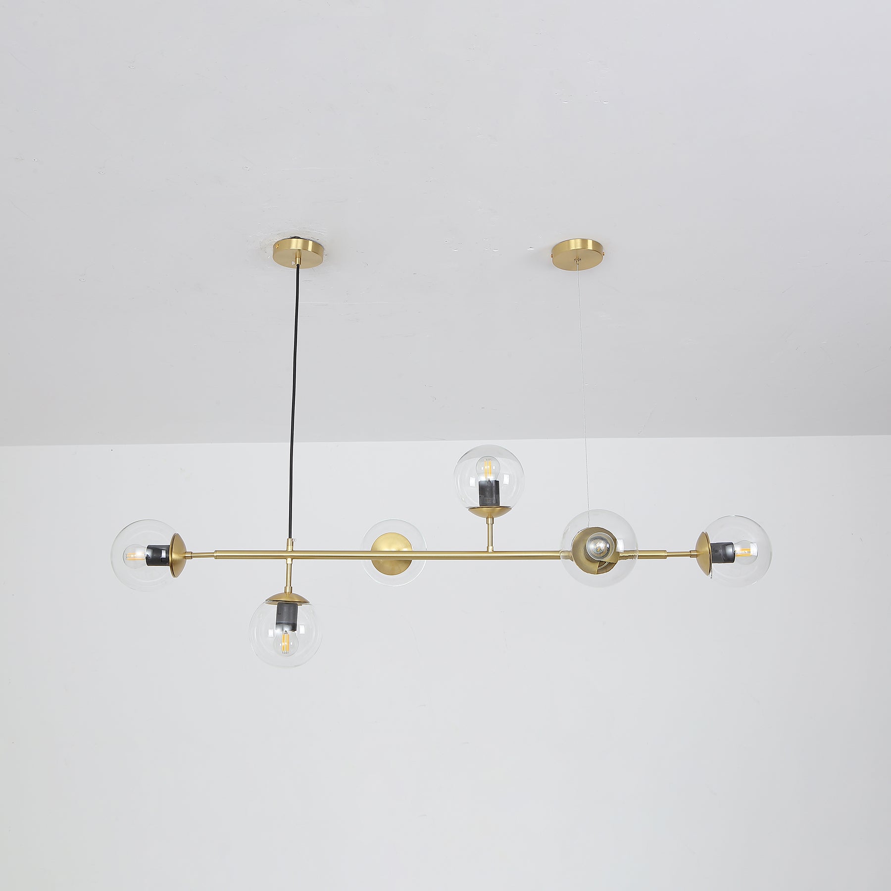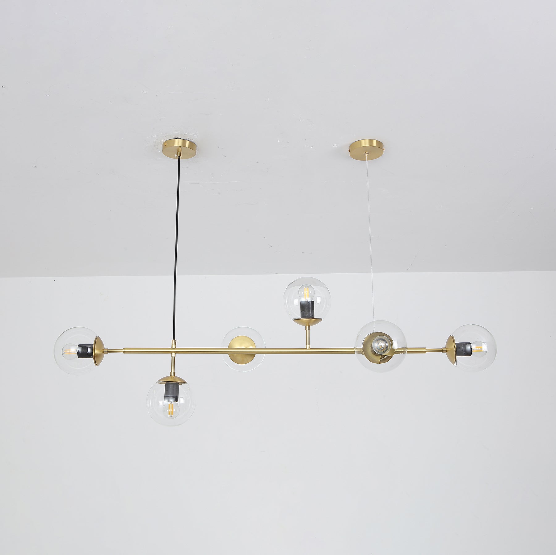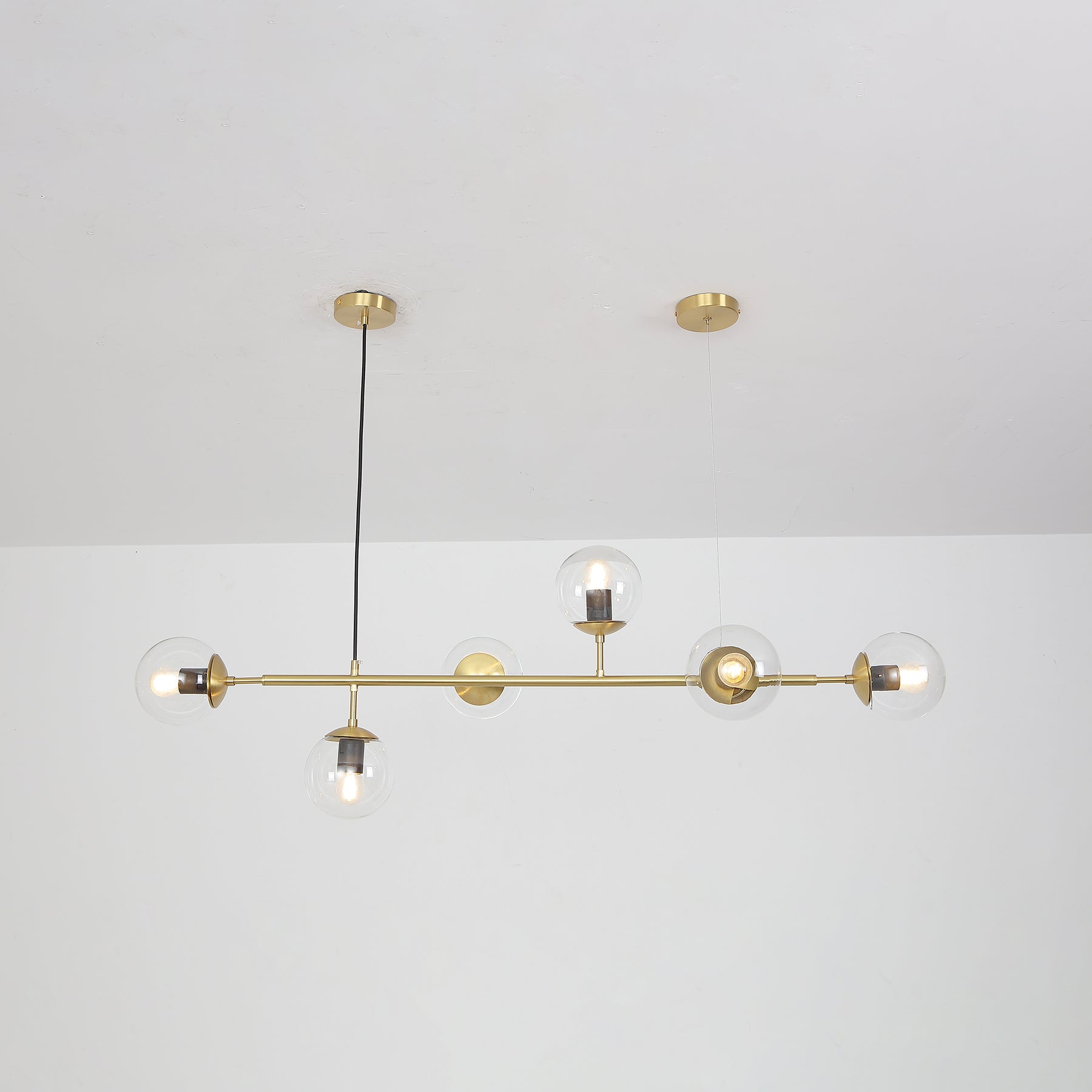 Like beads on a cord. Perfect, round glass beads spread a reflective, shiny light into the room. The light from the Orb hanging lamp creates an exclusive atmosphere that looks stringent, but also liberating nonchalantly. The combination of brass and glass gives your interior an industrial touch. Cantilevered ropes connect glass balls in all directions along a line to create a visually compelling display. Vertical or horizontal versions are available. Show above your hallway or table. If you need a black light body, please contact us.