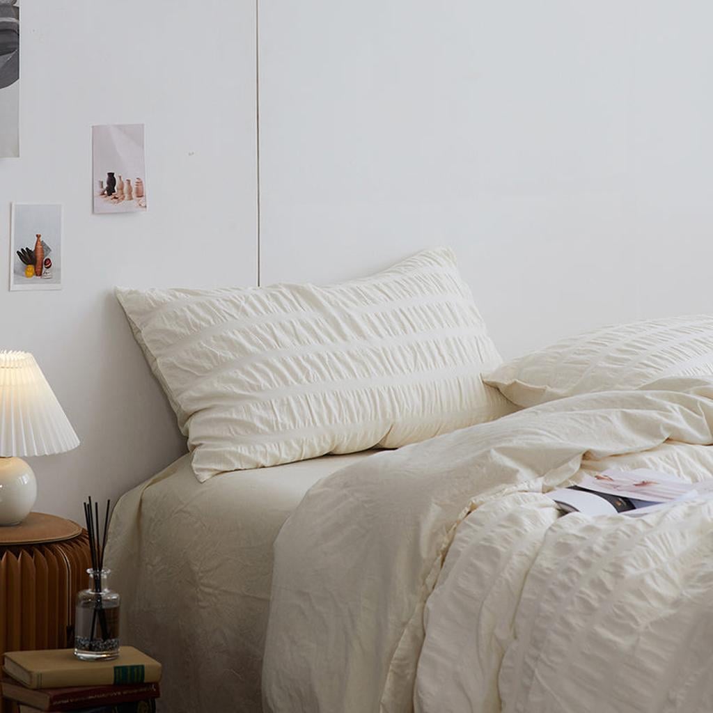 This duvet cover is lightweight, durable, and easy to care for, combining the best of style and comfort. Seersucker is known for its unique puckered texture, making it breathable and great for staying cool on warm nights. The fabric's crinkled look means it's naturally wrinkle-resistant, so no ironing needed!