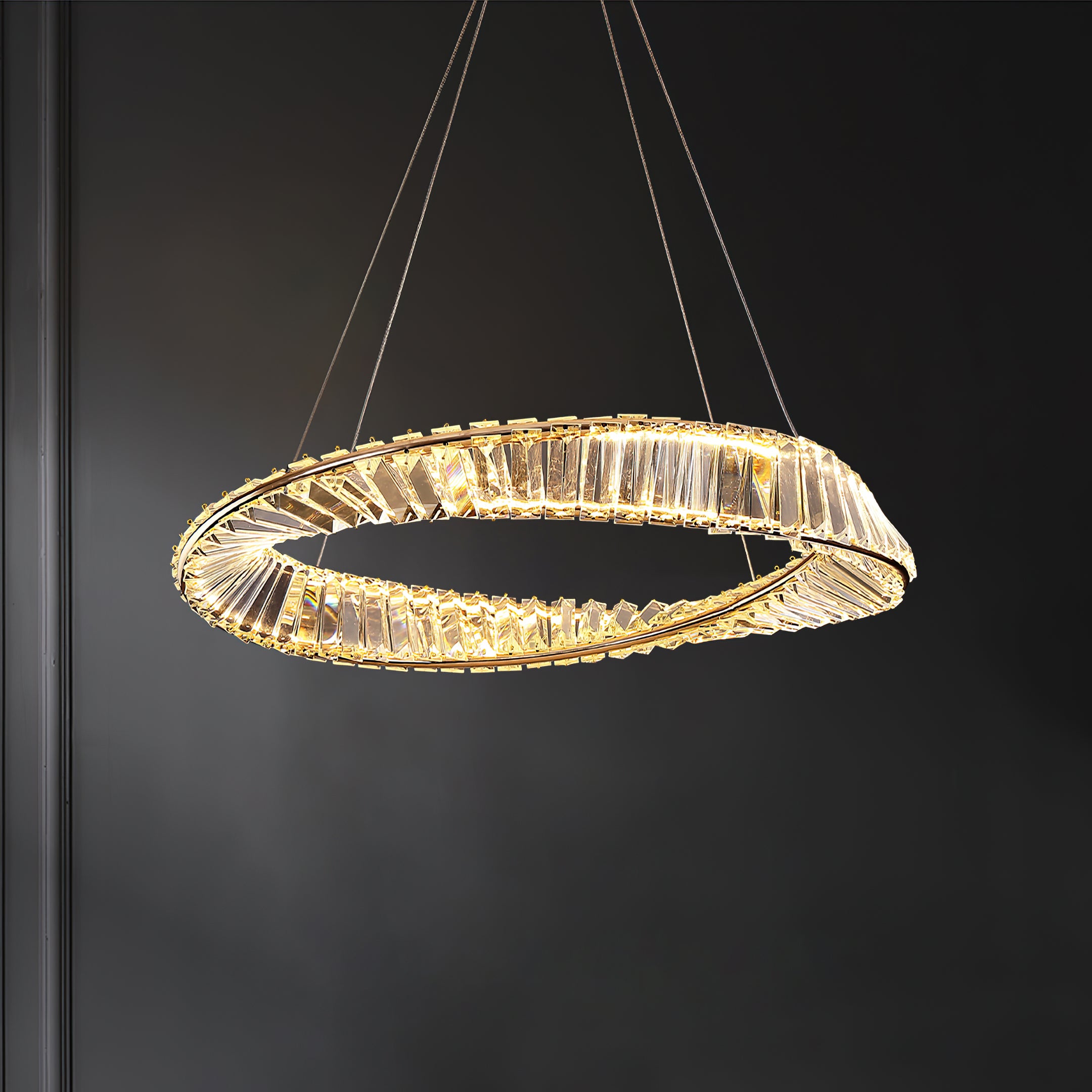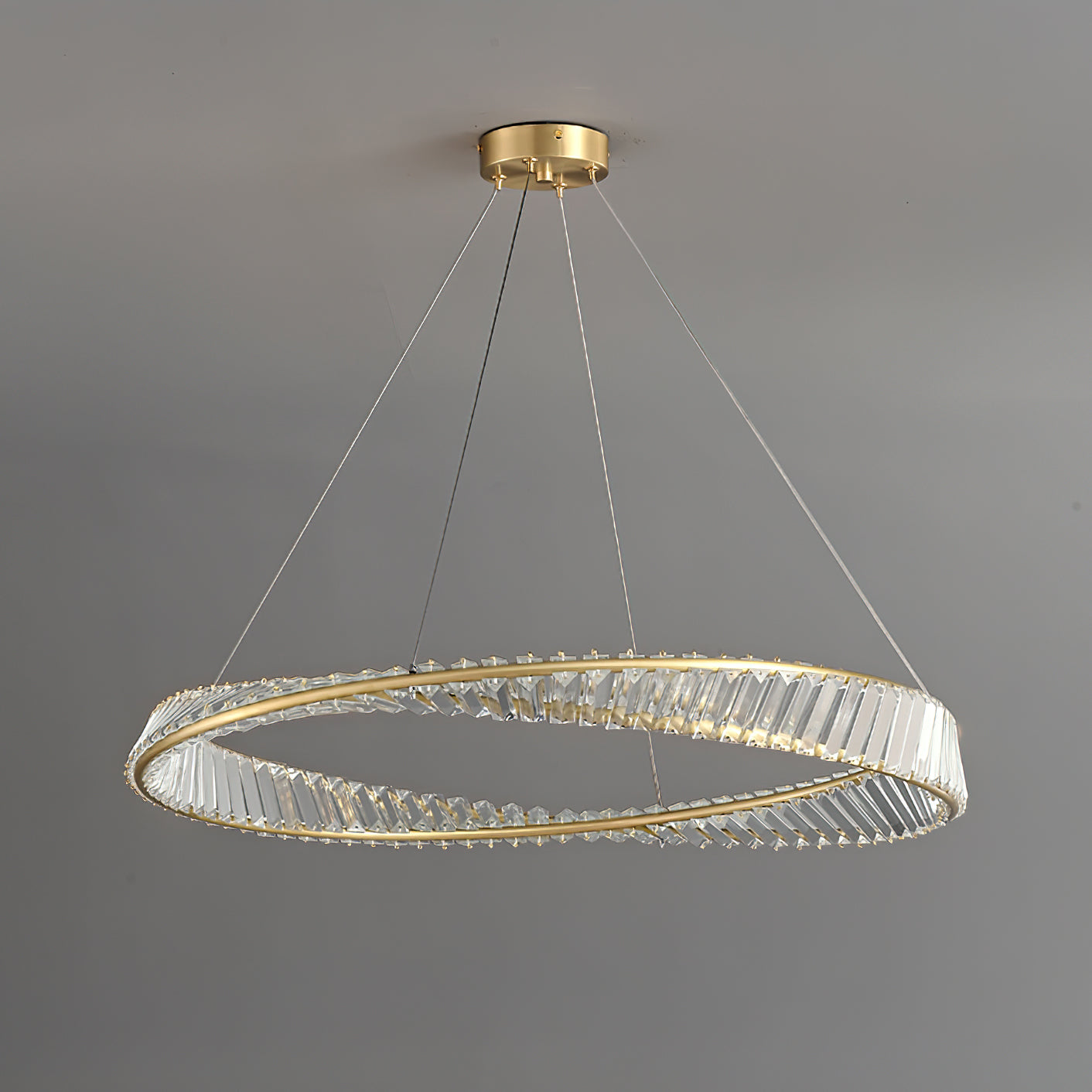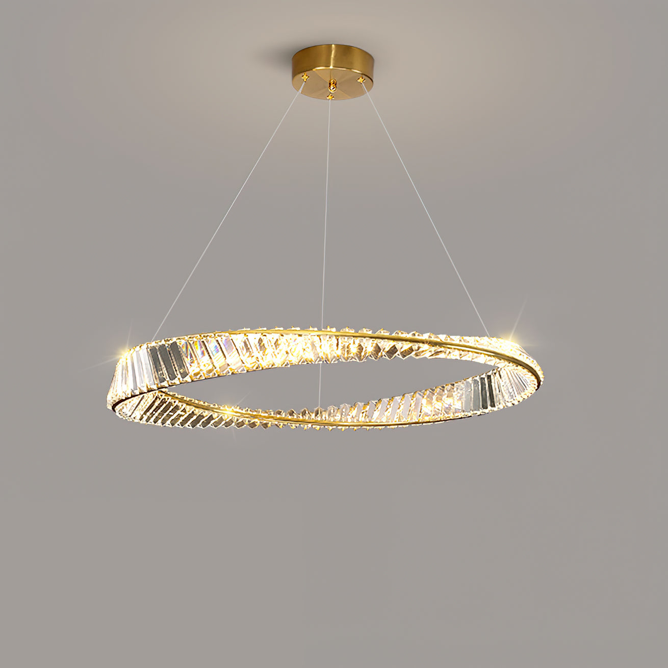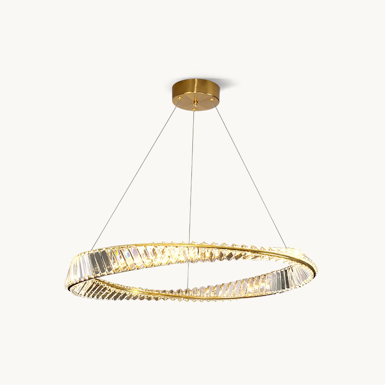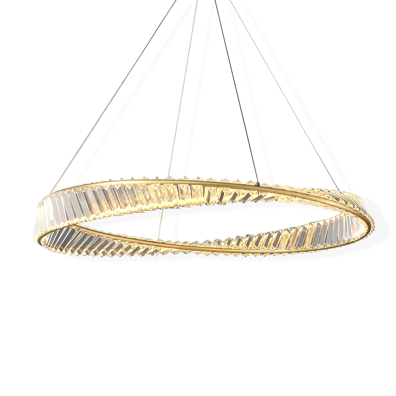 Glittering from every angle, it's timeless. Dreamy light and sheer clarity, this pendant features faceted crystal cut in the shape of a Möbius ring and framed in brushed brass. Outline the atmospheric charm of modern style with straightforward and concise lines, and endow the space with a touch of light luxury. As your eyes follow the frame, it orbits the crystal in a unique way.