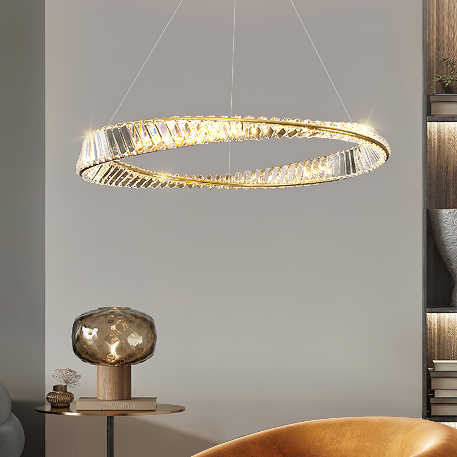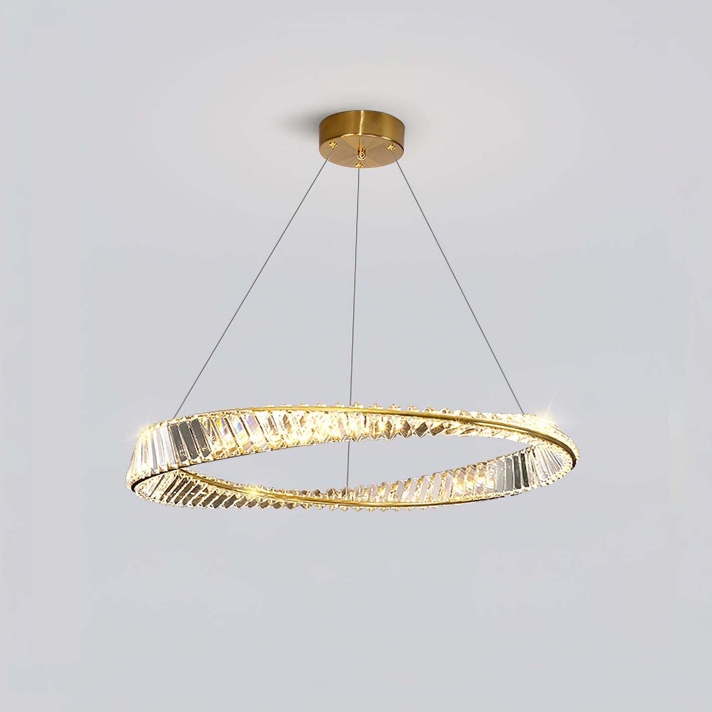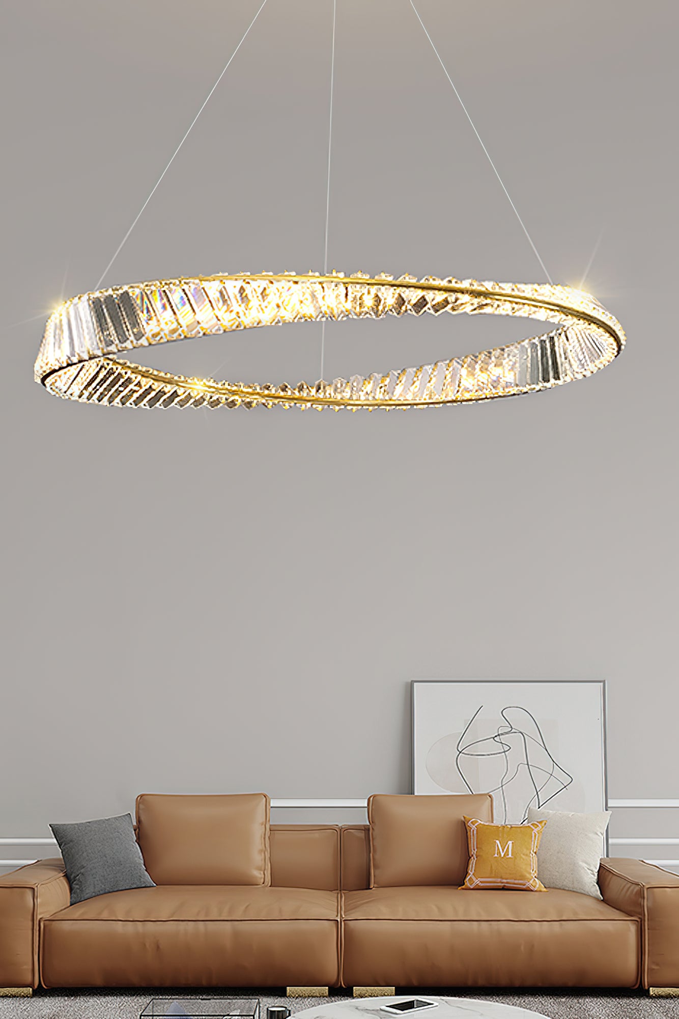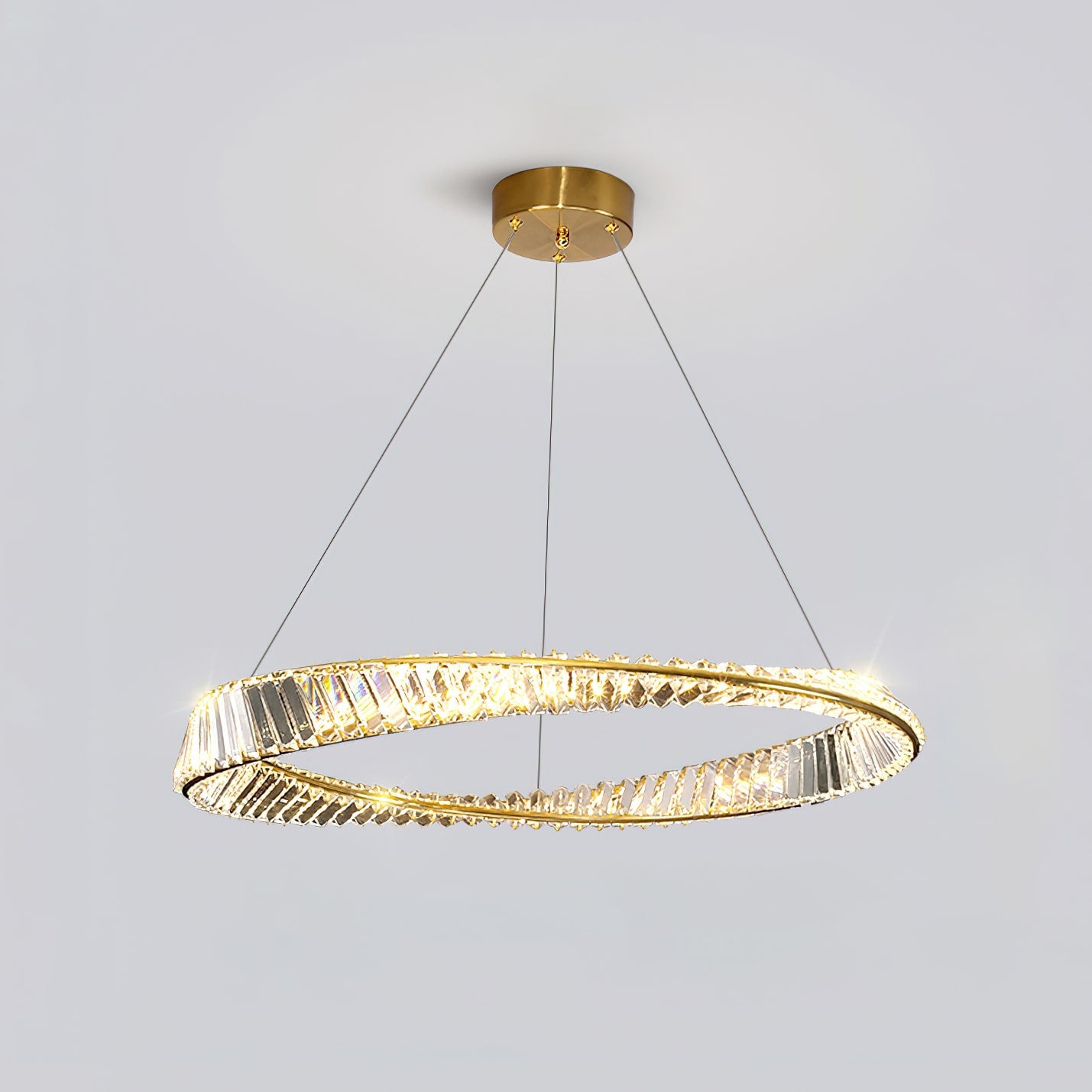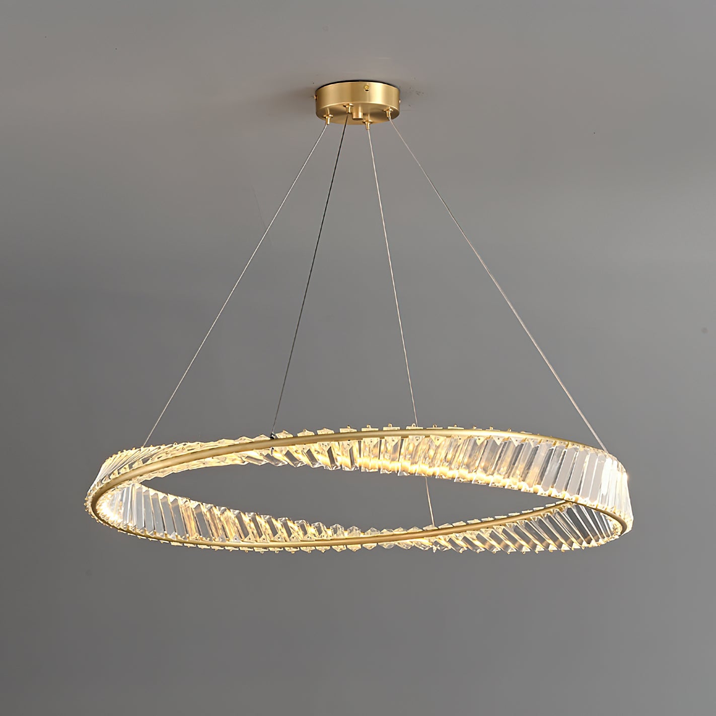Glittering from every angle, it's timeless. Dreamy light and sheer clarity, this pendant features faceted crystal cut in the shape of a Möbius ring and framed in brushed brass. Outline the atmospheric charm of modern style with straightforward and concise lines, and endow the space with a touch of light luxury. As your eyes follow the frame, it orbits the crystal in a unique way.