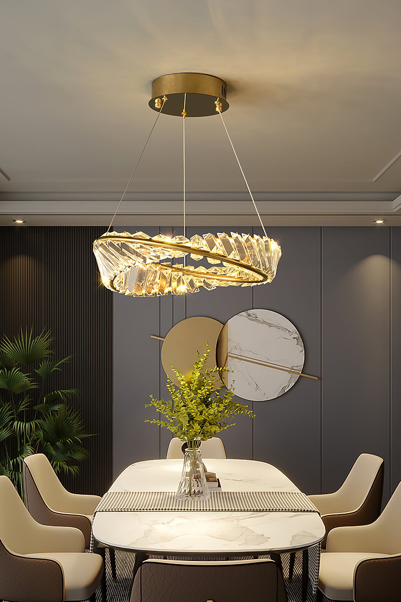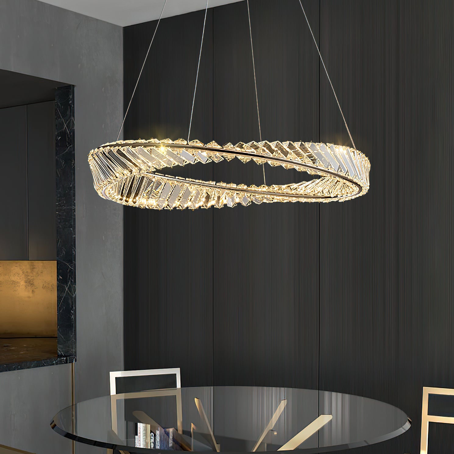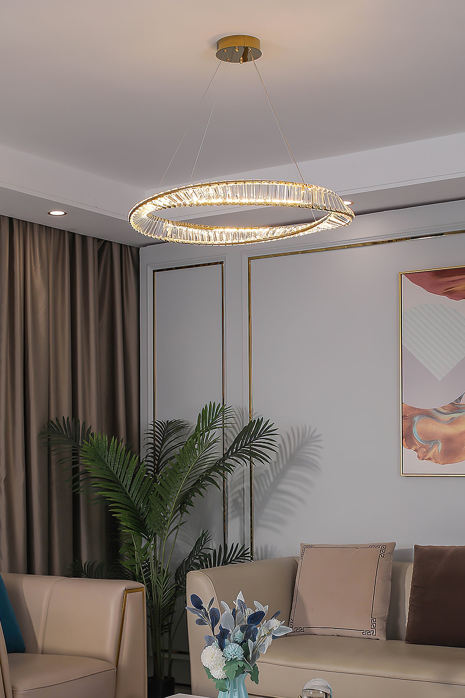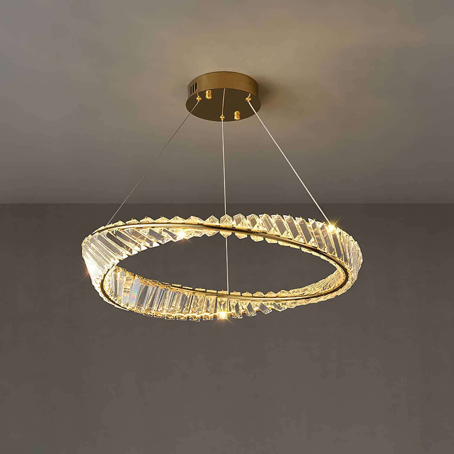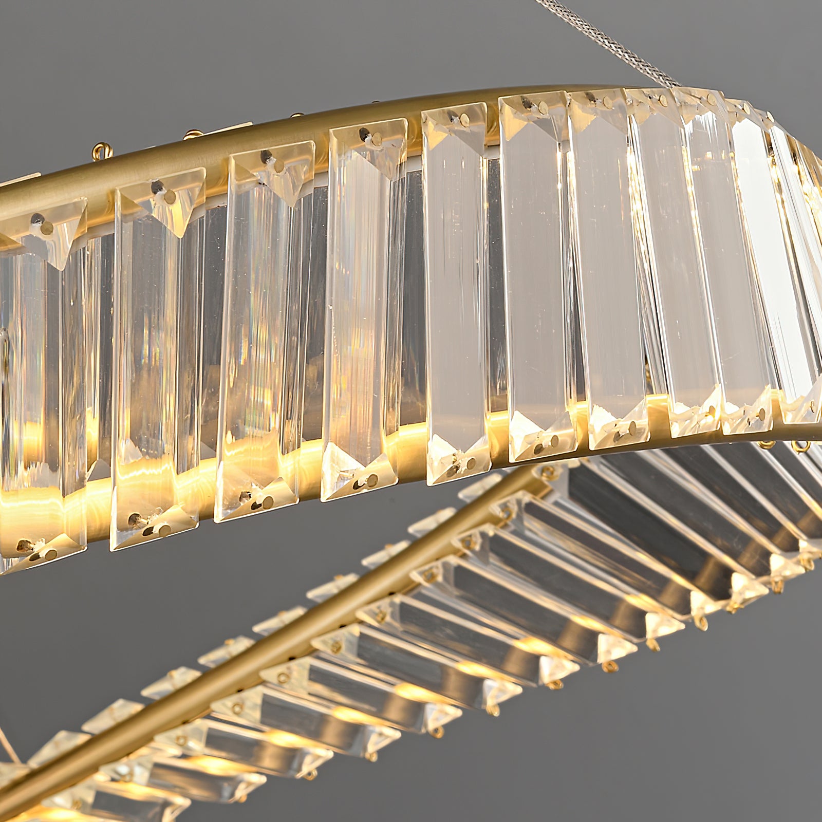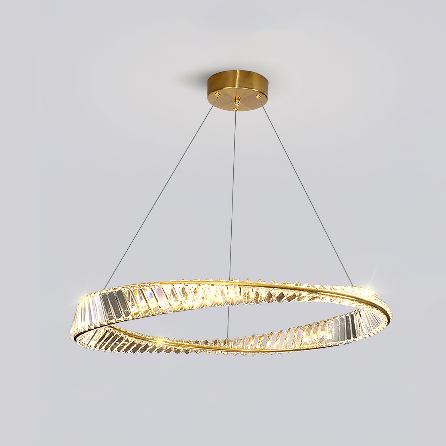 Glittering from every angle, it's timeless. Dreamy light and sheer clarity, this pendant features faceted crystal cut in the shape of a Möbius ring and framed in brushed brass. Outline the atmospheric charm of modern style with straightforward and concise lines, and endow the space with a touch of light luxury. As your eyes follow the frame, it orbits the crystal in a unique way.