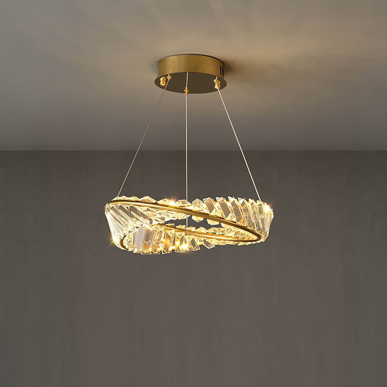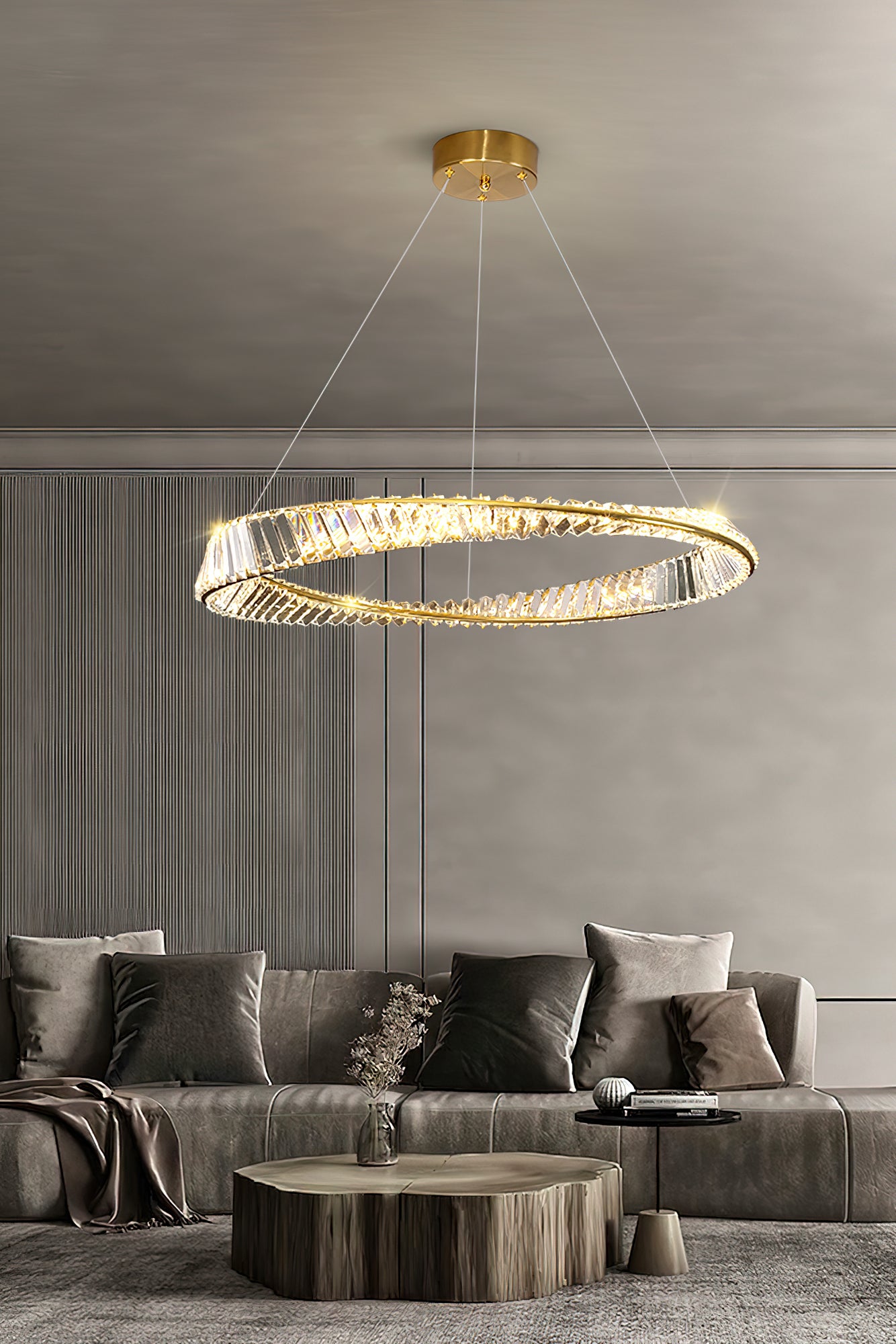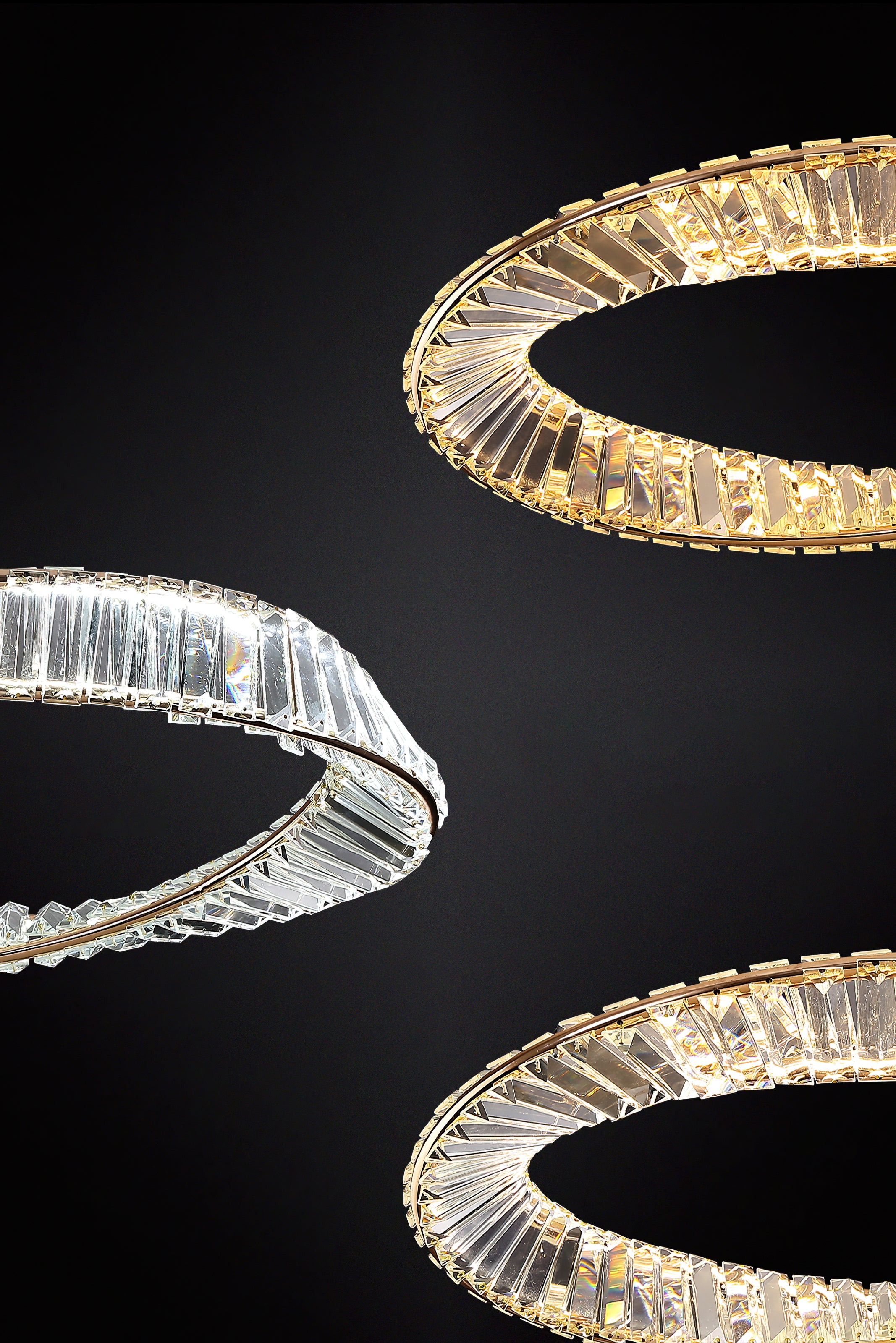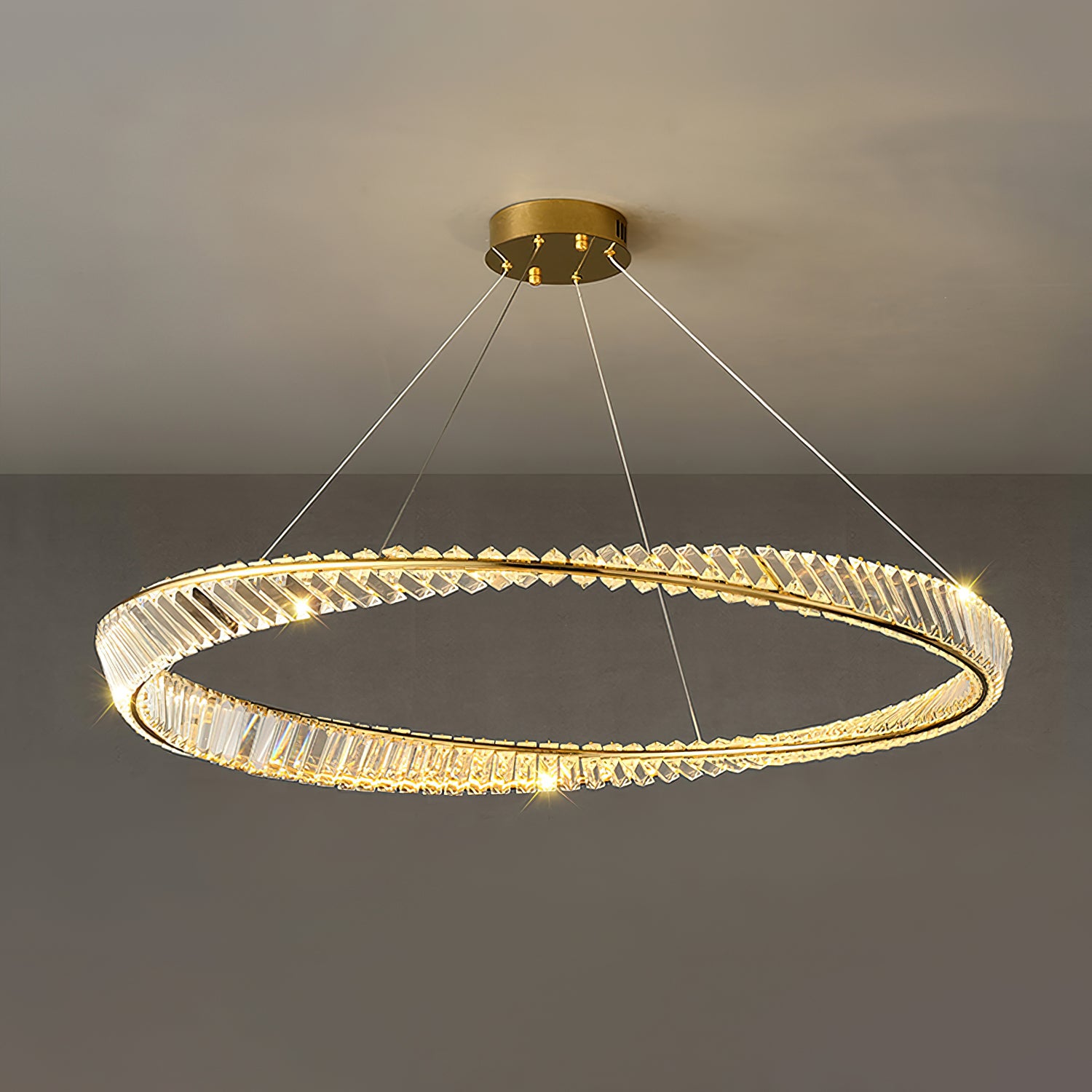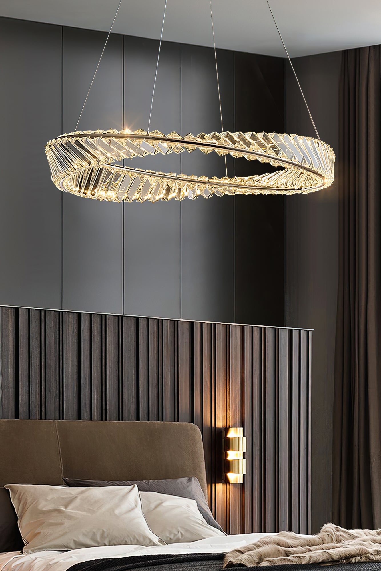 Glittering from every angle, it's timeless. Dreamy light and sheer clarity, this pendant features faceted crystal cut in the shape of a Möbius ring and framed in brushed brass. Outline the atmospheric charm of modern style with straightforward and concise lines, and endow the space with a touch of light luxury. As your eyes follow the frame, it orbits the crystal in a unique way.