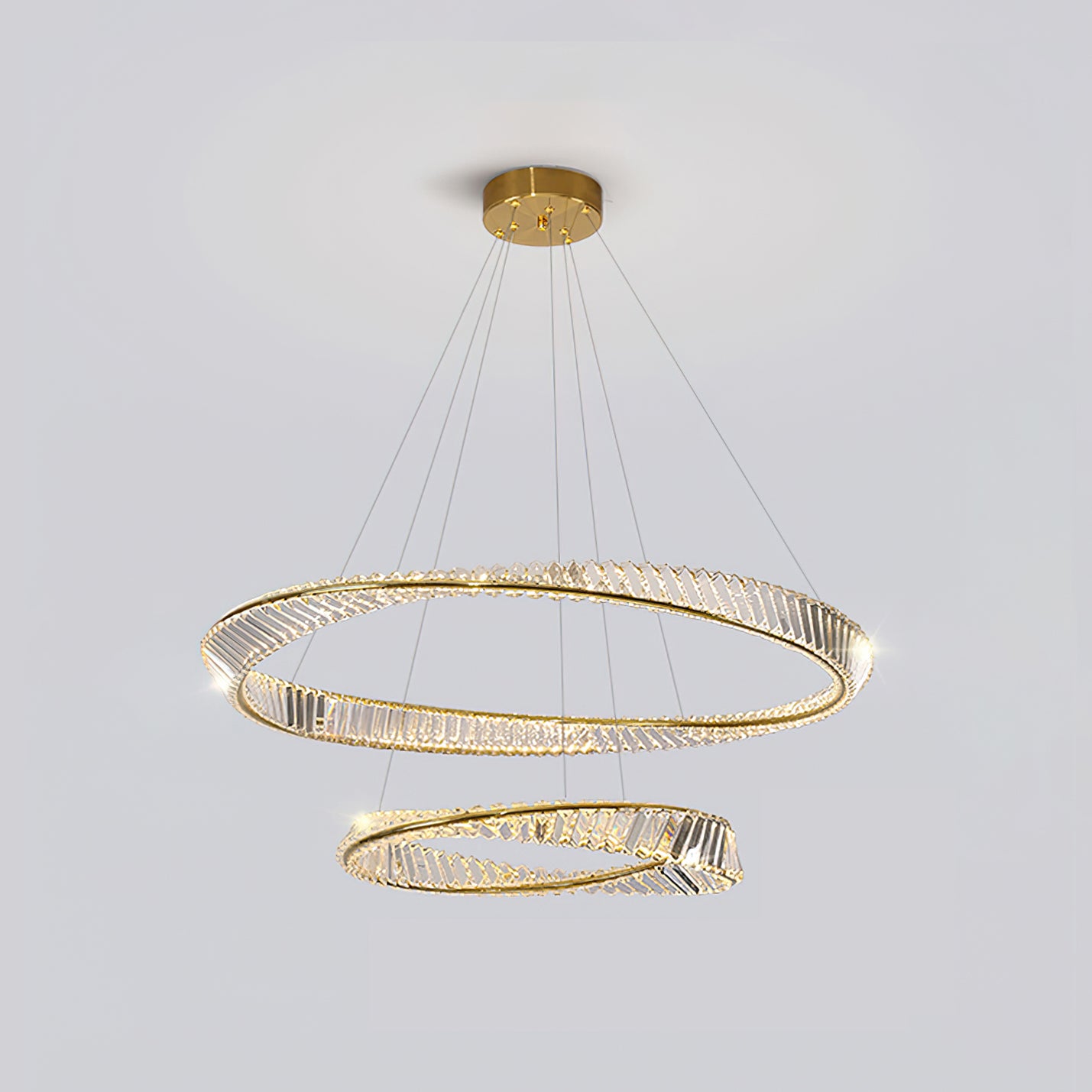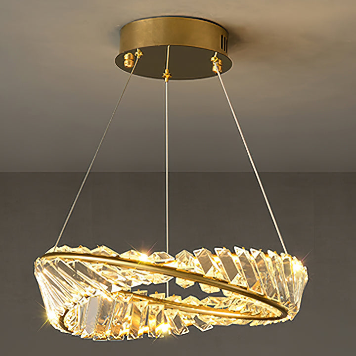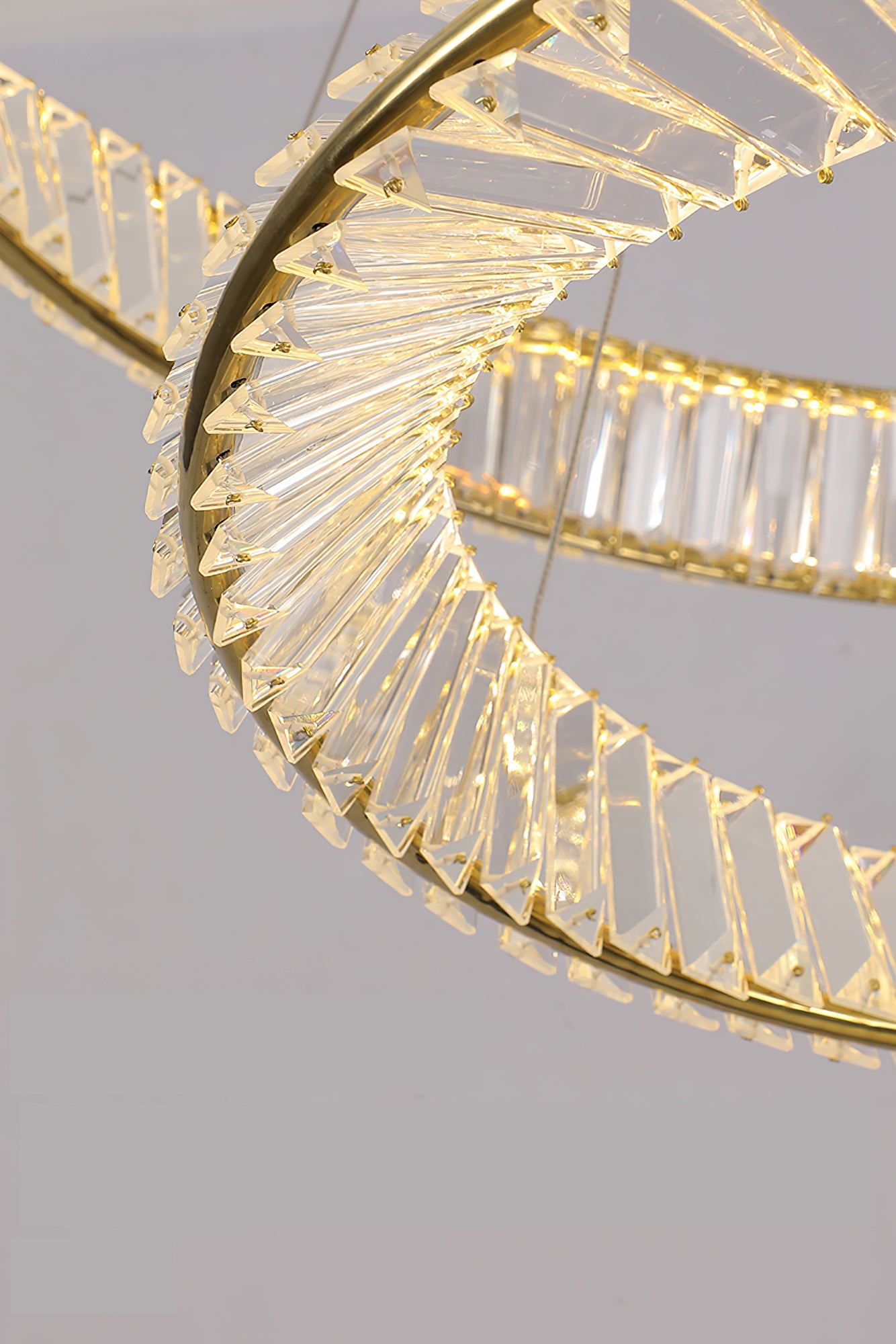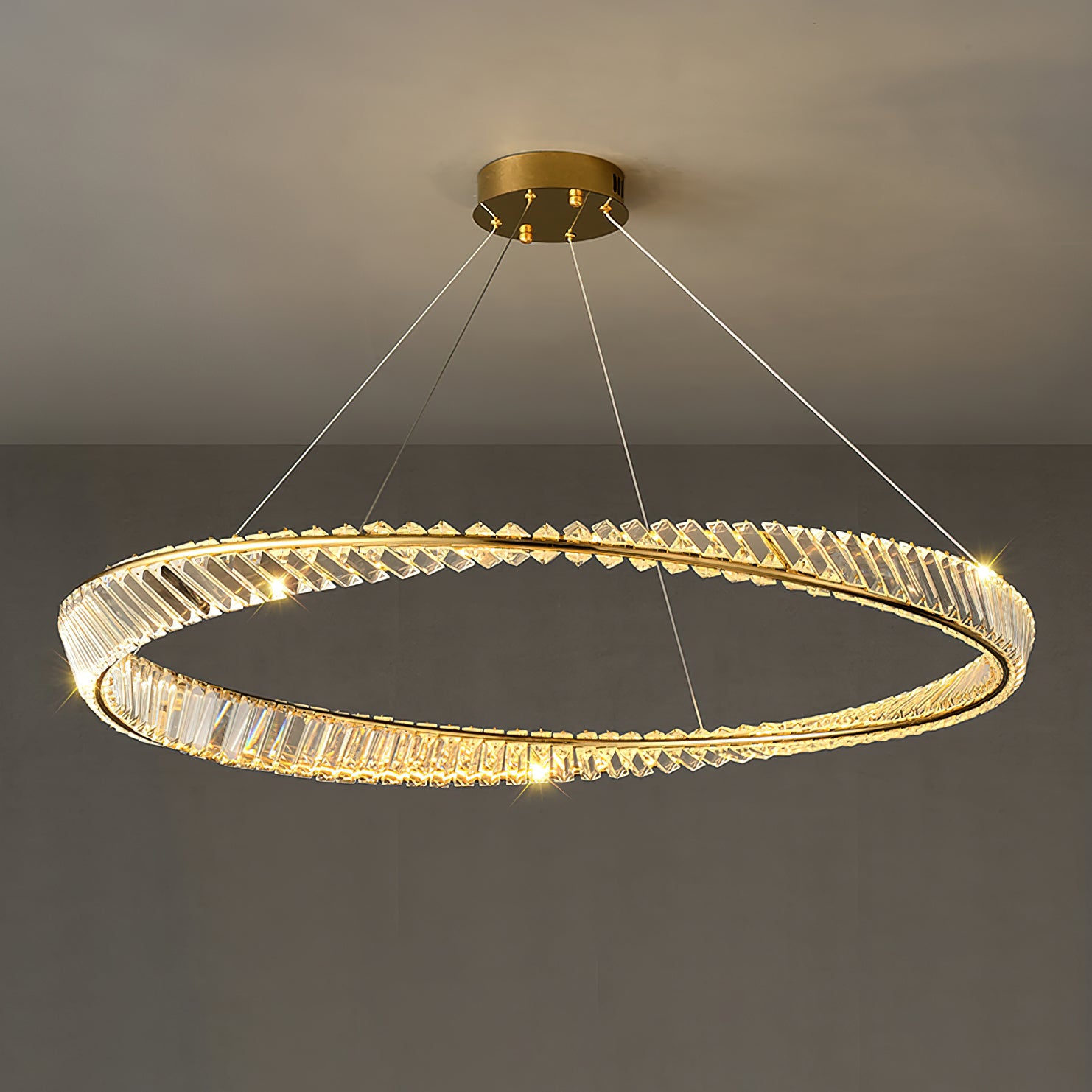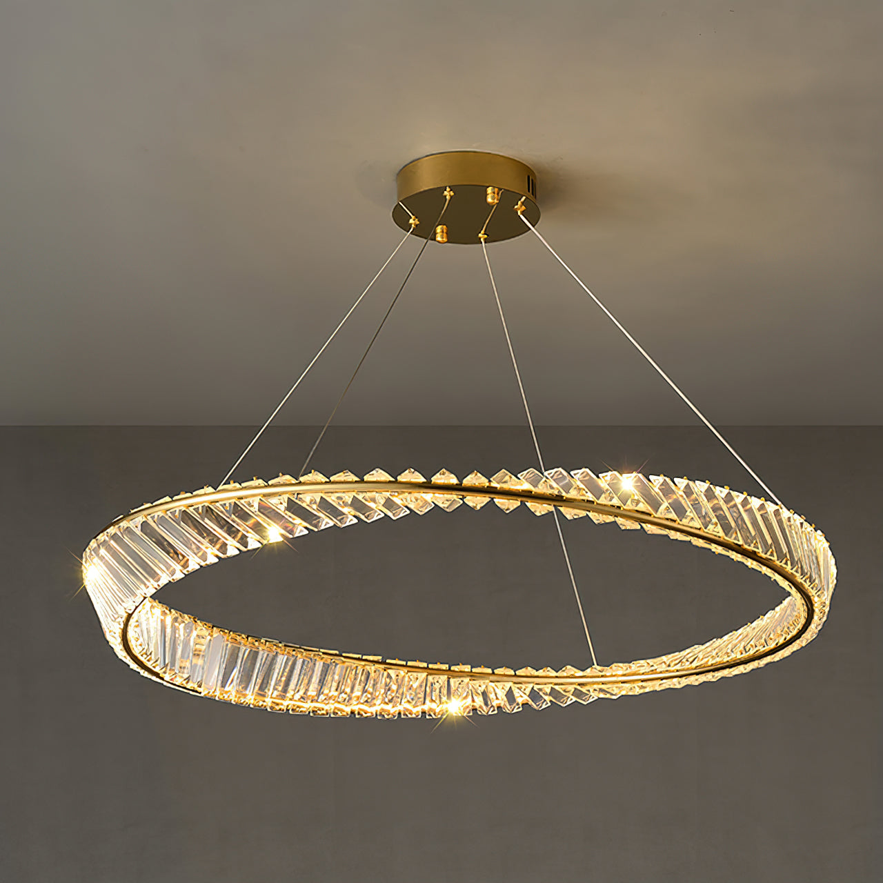 Glittering from every angle, it's timeless. Dreamy light and sheer clarity, this pendant features faceted crystal cut in the shape of a Möbius ring and framed in brushed brass. Outline the atmospheric charm of modern style with straightforward and concise lines, and endow the space with a touch of light luxury. As your eyes follow the frame, it orbits the crystal in a unique way.