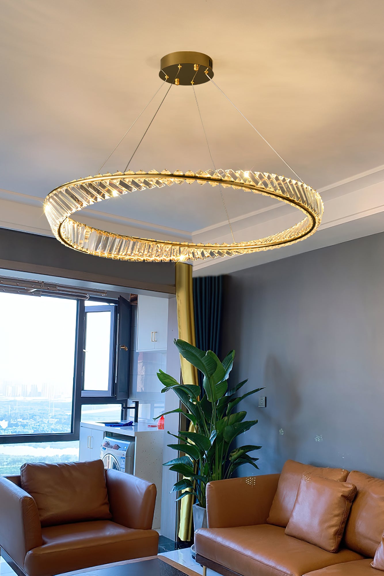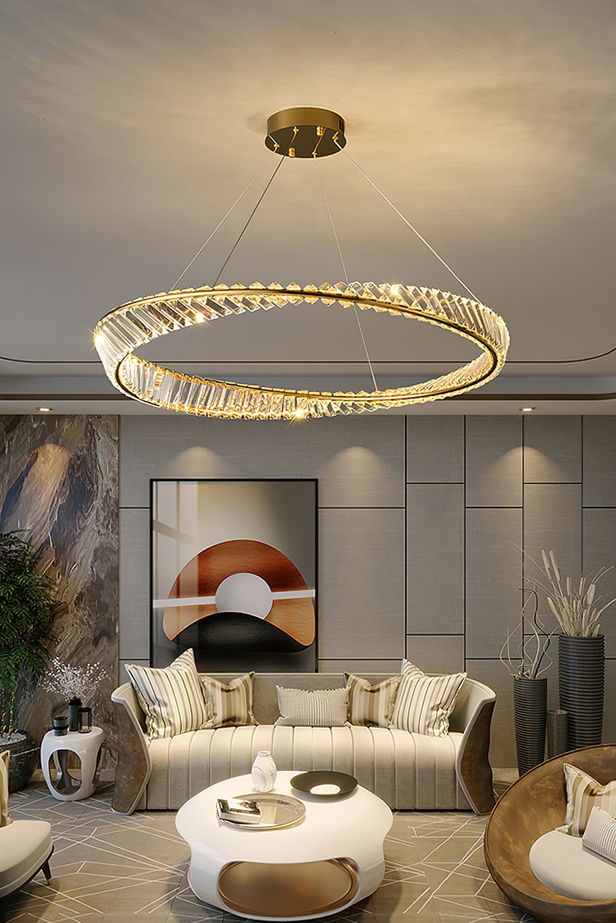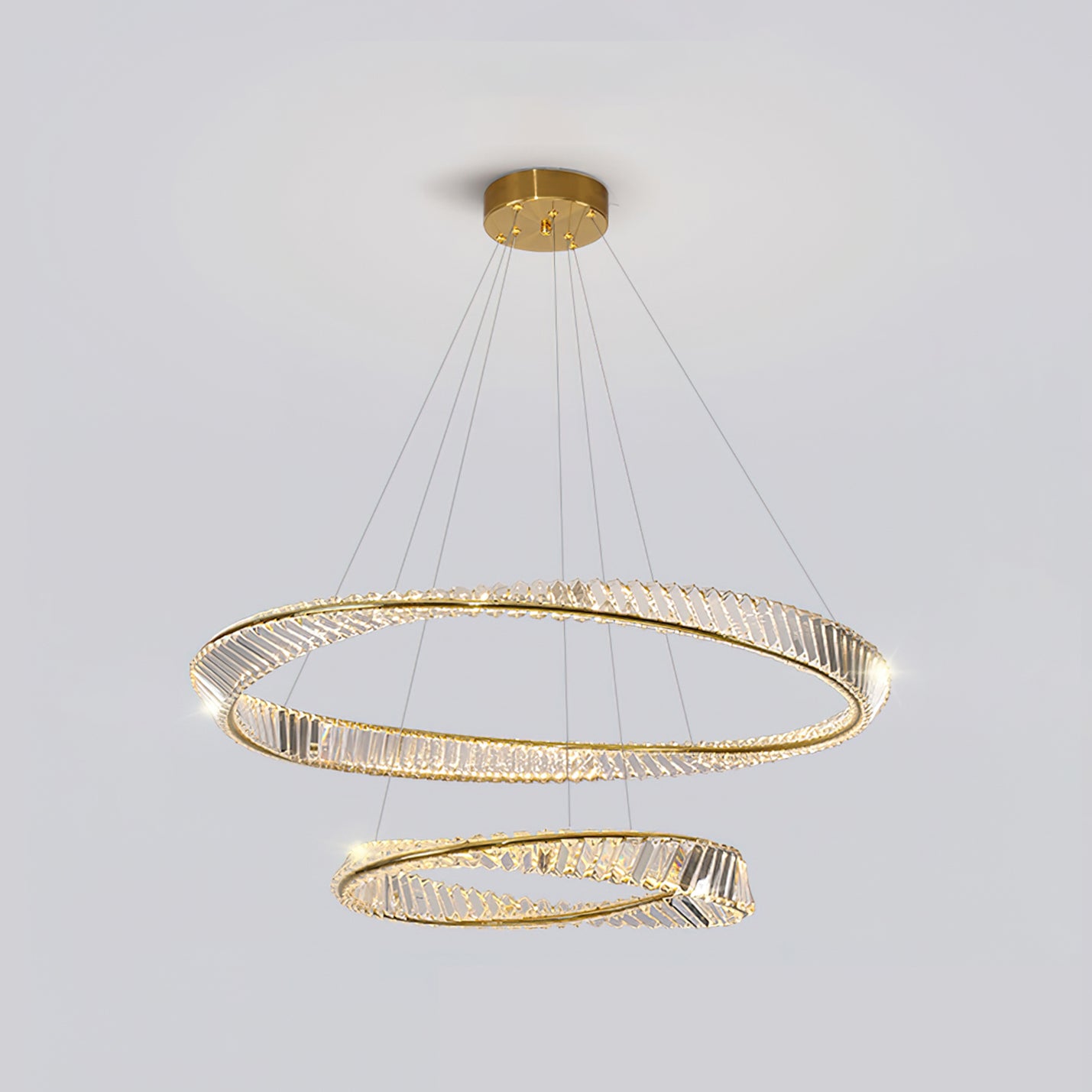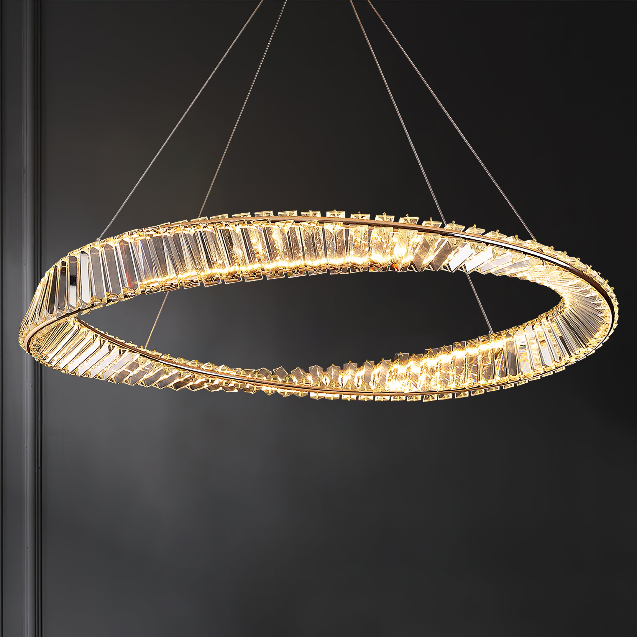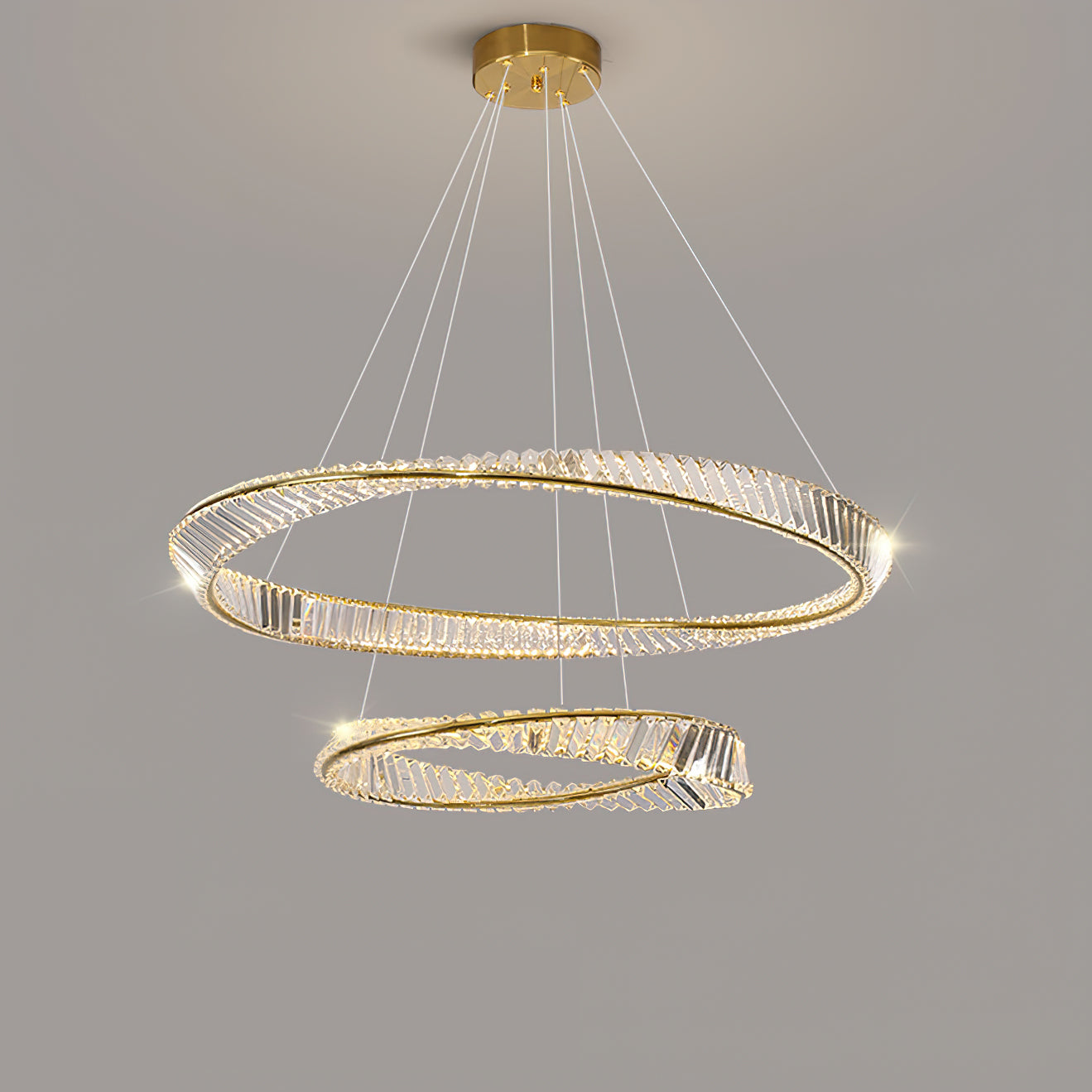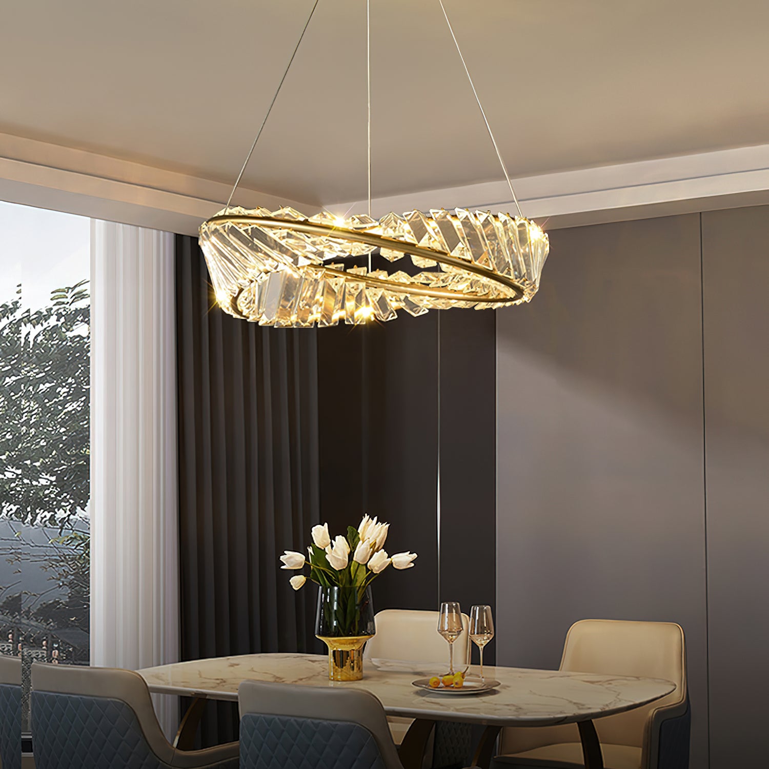 Glittering from every angle, it's timeless. Dreamy light and sheer clarity, this pendant features faceted crystal cut in the shape of a Möbius ring and framed in brushed brass. Outline the atmospheric charm of modern style with straightforward and concise lines, and endow the space with a touch of light luxury. As your eyes follow the frame, it orbits the crystal in a unique way.