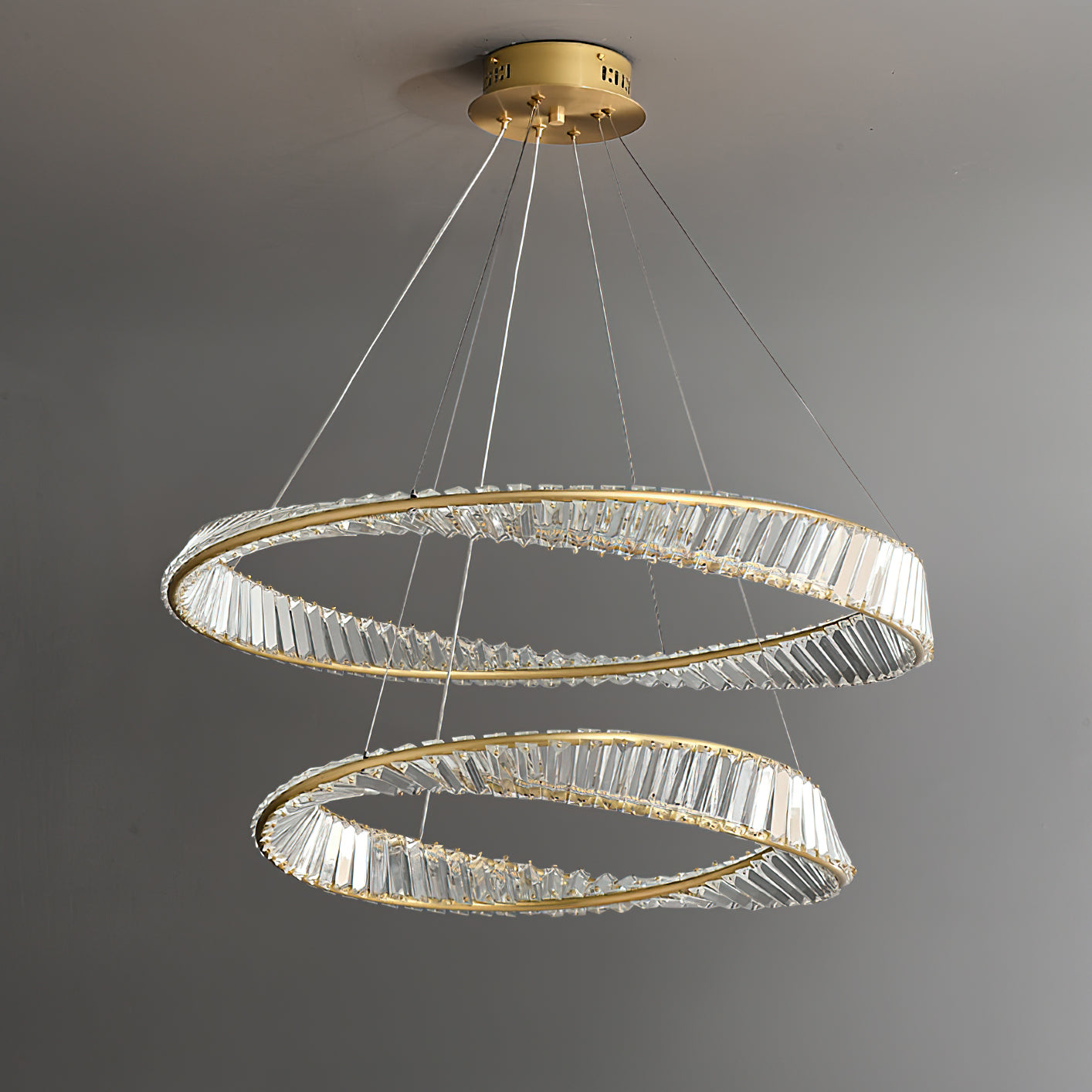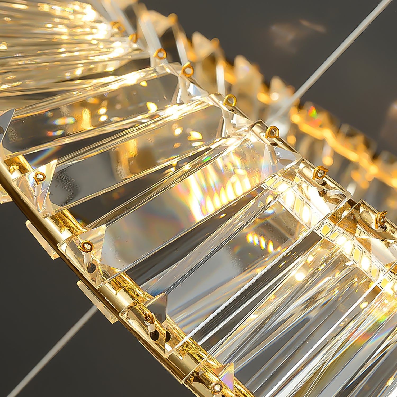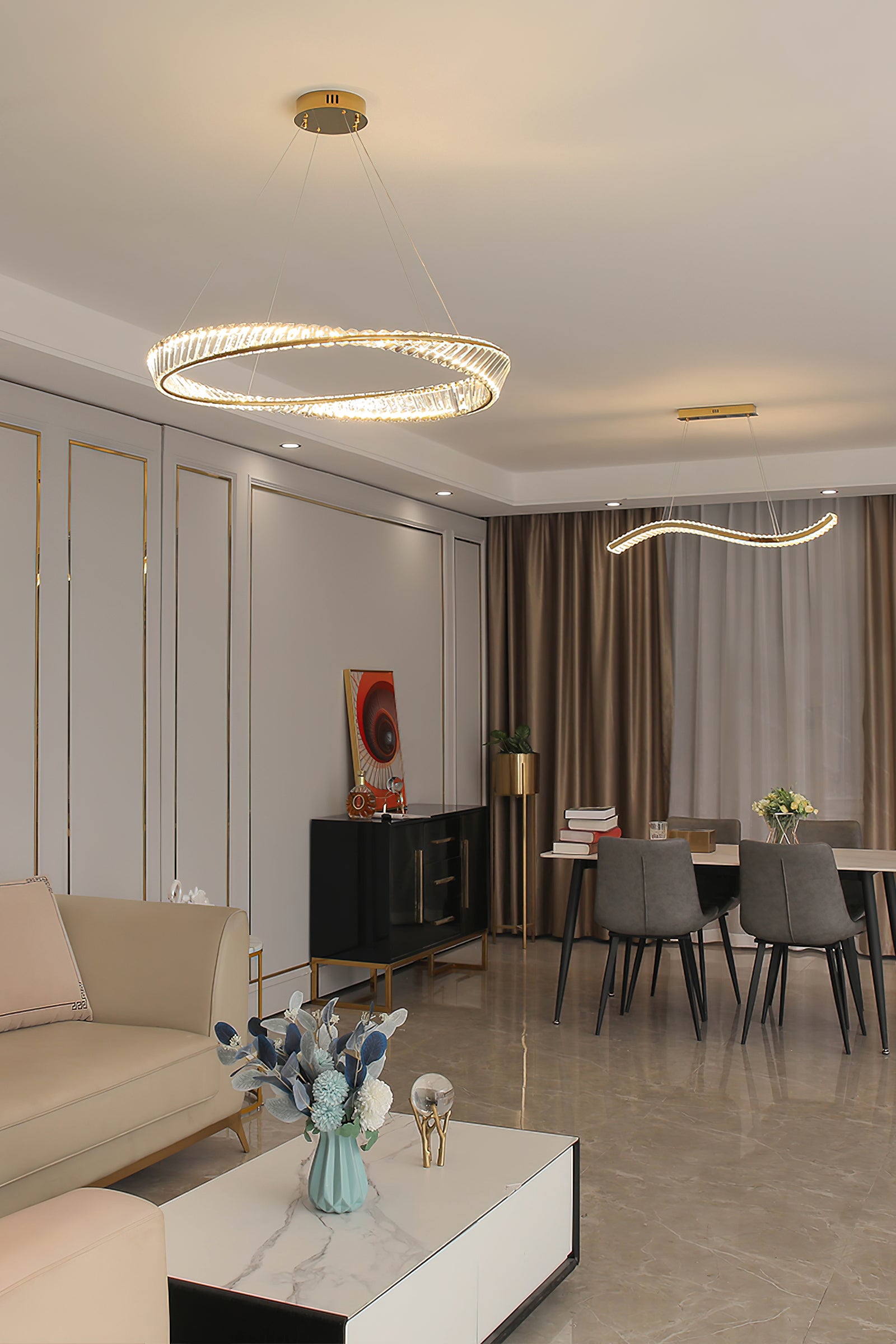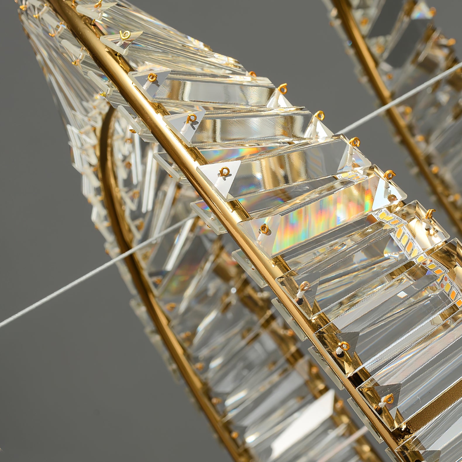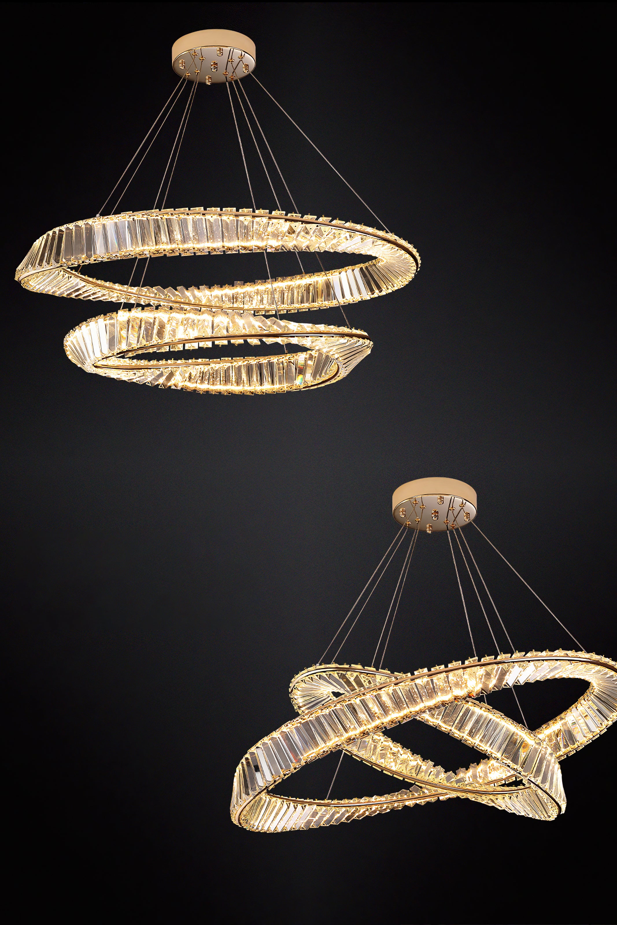 Glittering from every angle, it's timeless. Dreamy light and sheer clarity, this pendant features faceted crystal cut in the shape of a Möbius ring and framed in brushed brass. Outline the atmospheric charm of modern style with straightforward and concise lines, and endow the space with a touch of light luxury. As your eyes follow the frame, it orbits the crystal in a unique way.