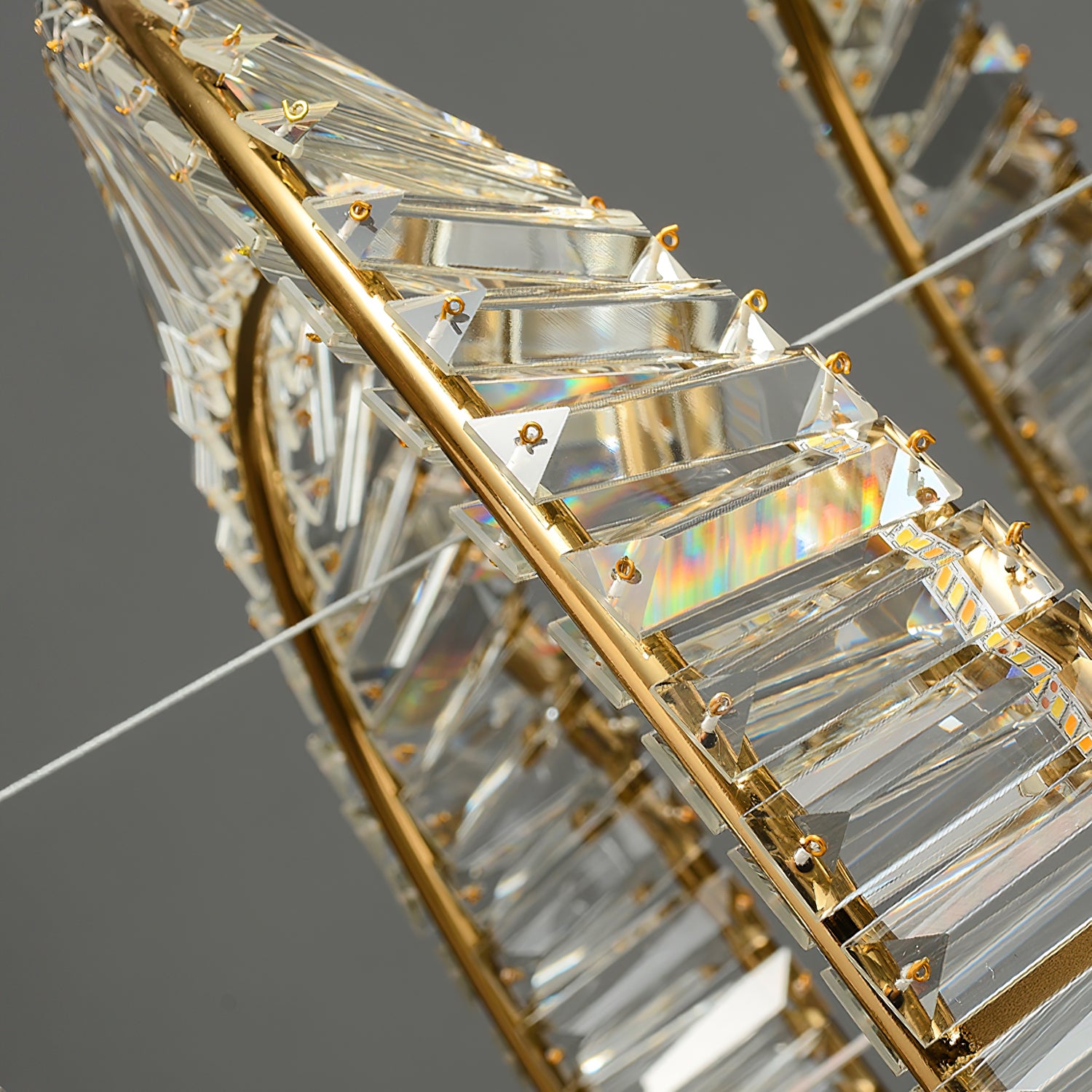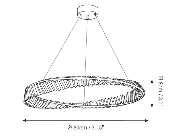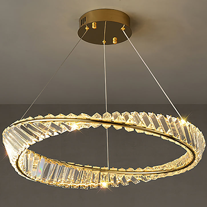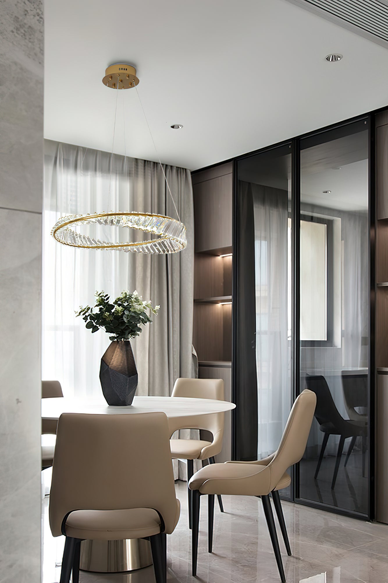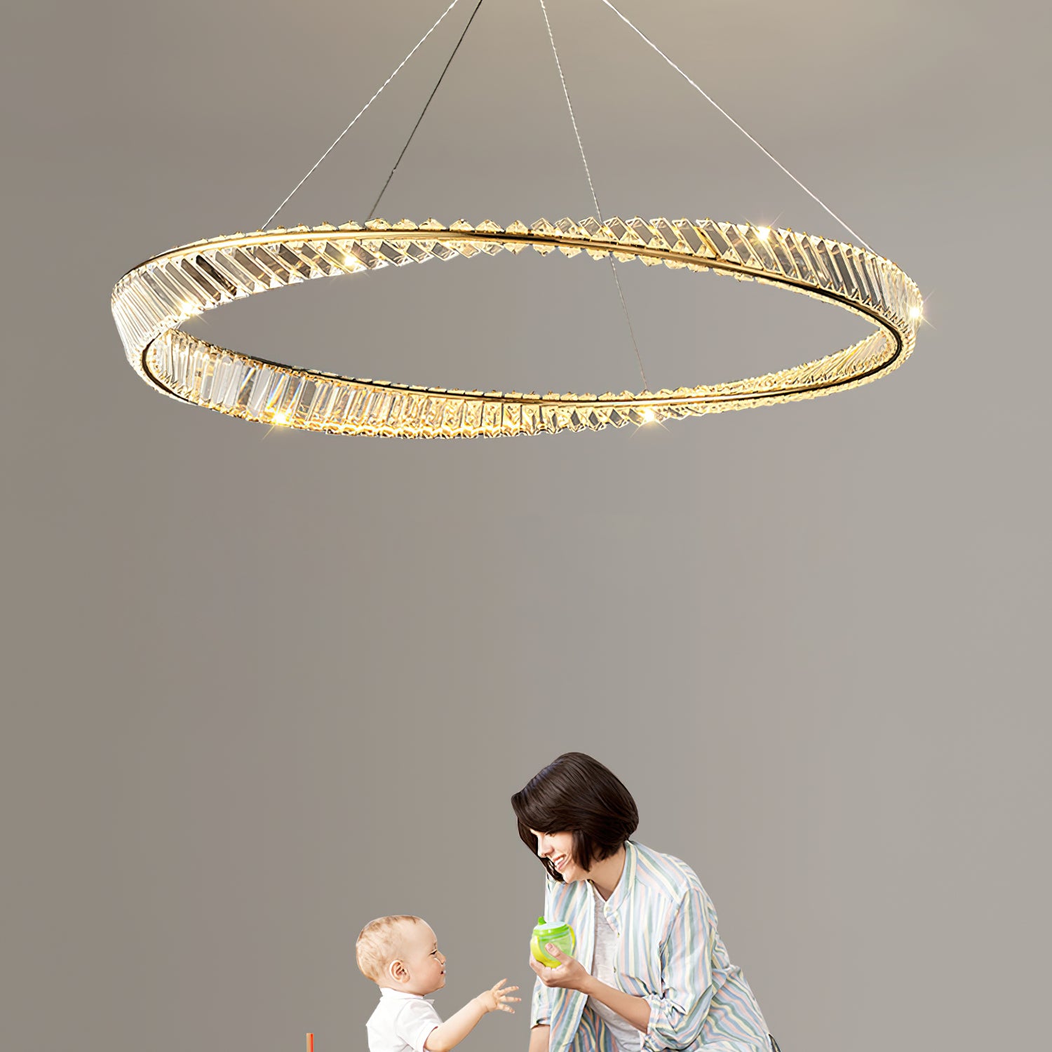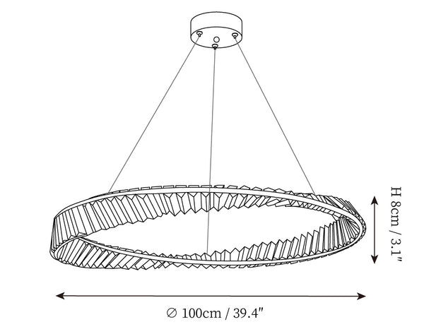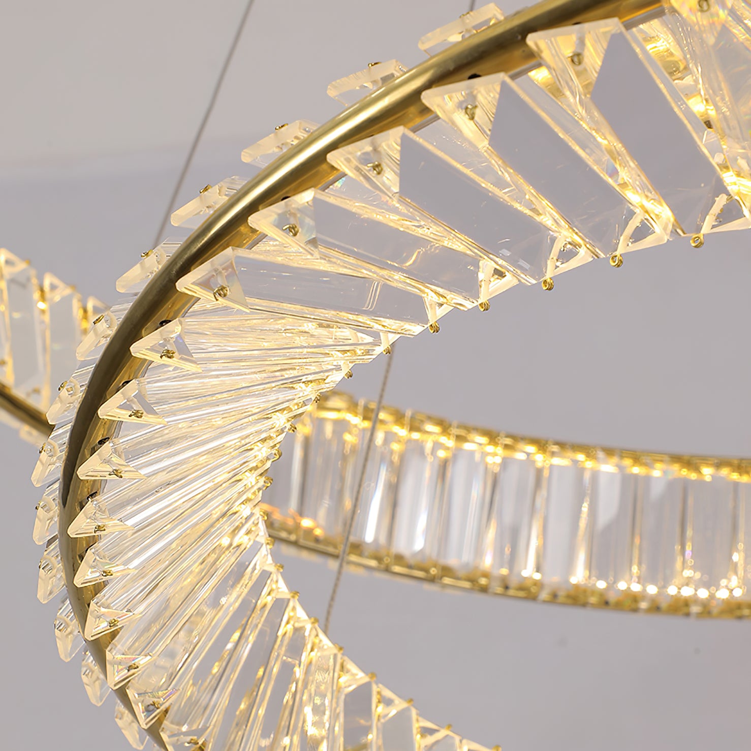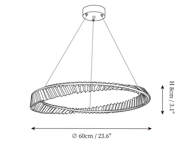 Glittering from every angle, it's timeless. Dreamy light and sheer clarity, this pendant features faceted crystal cut in the shape of a Möbius ring and framed in brushed brass. Outline the atmospheric charm of modern style with straightforward and concise lines, and endow the space with a touch of light luxury. As your eyes follow the frame, it orbits the crystal in a unique way.