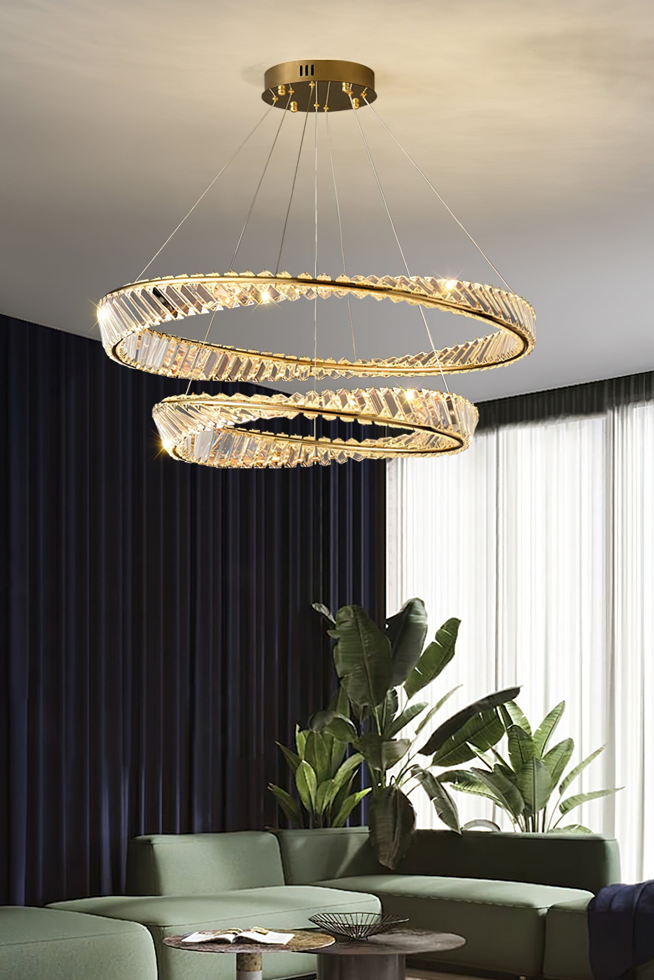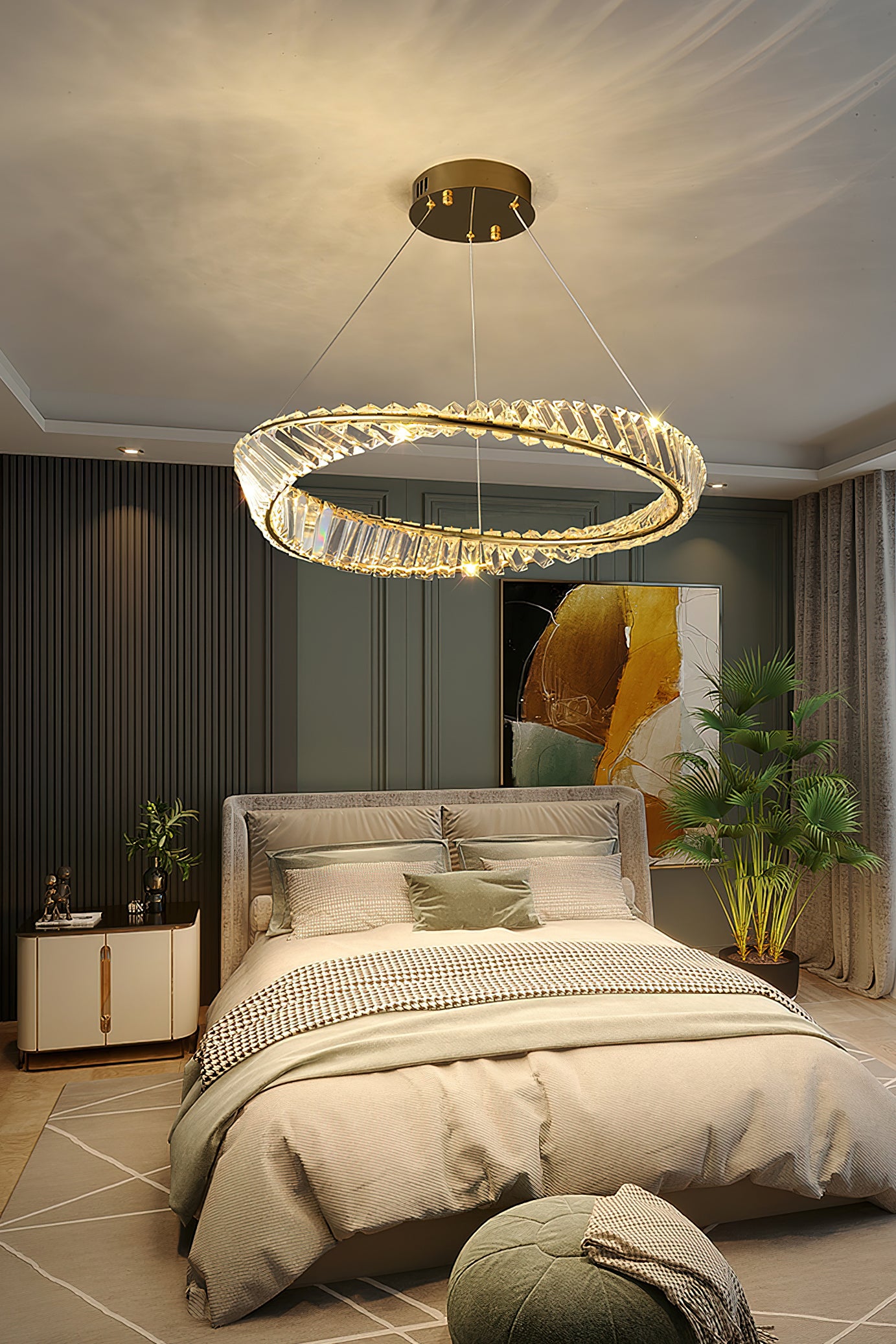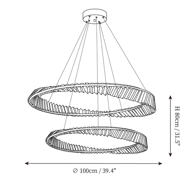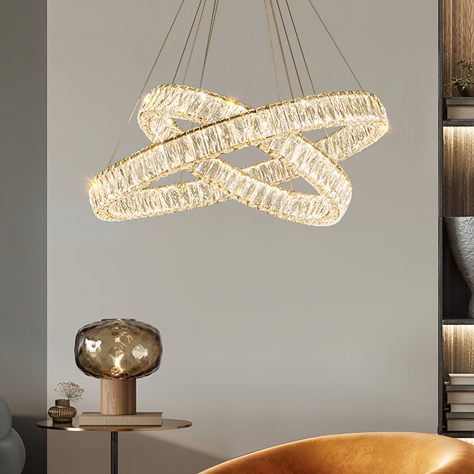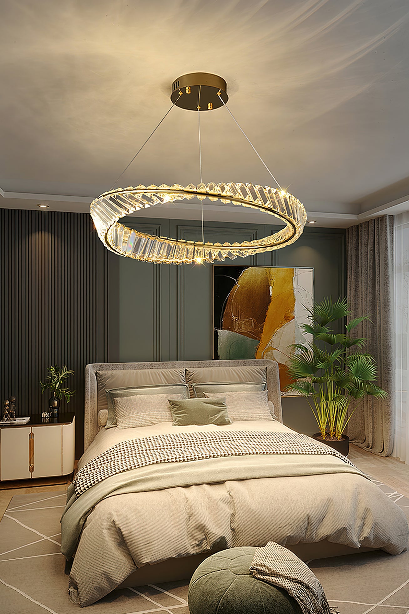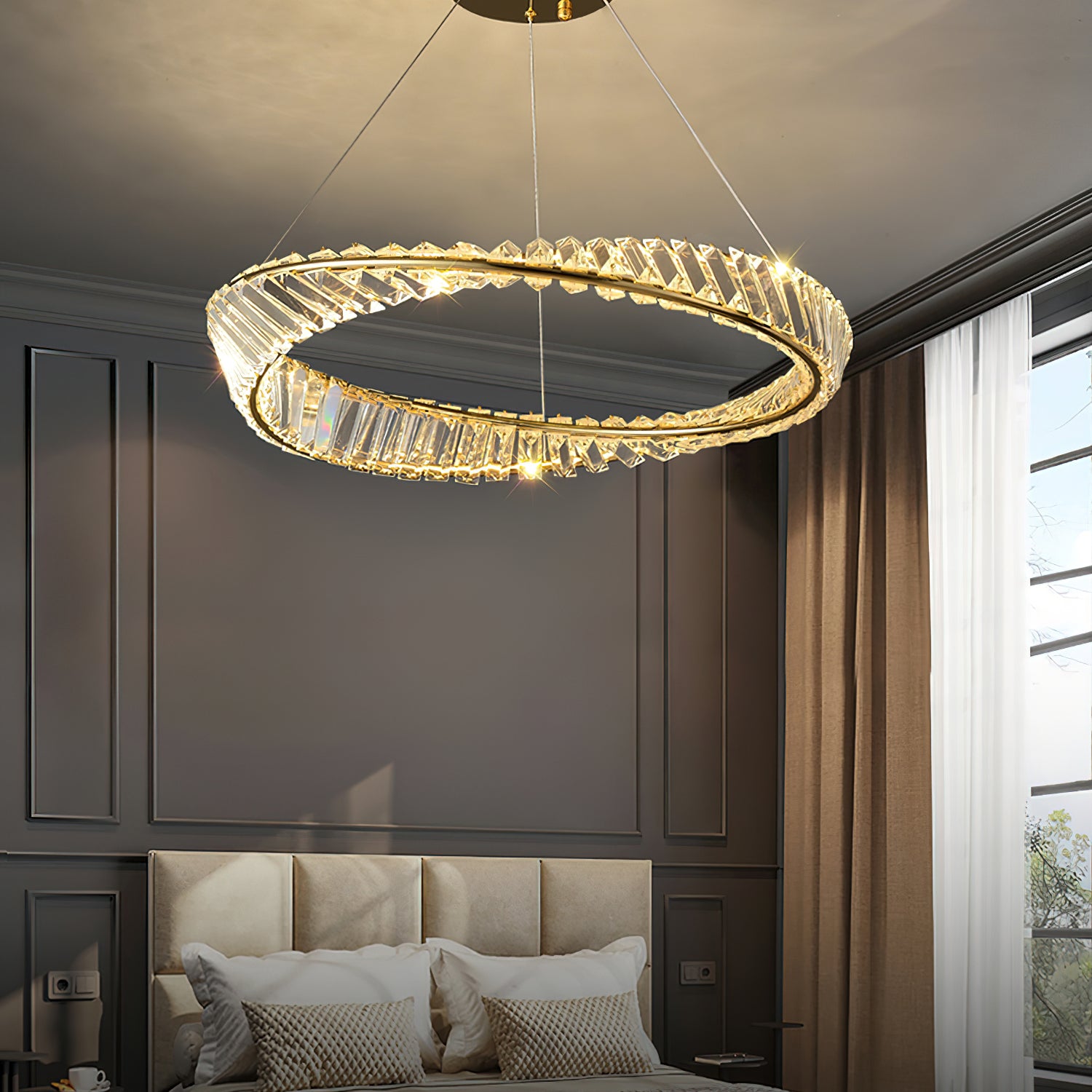 Glittering from every angle, it's timeless. Dreamy light and sheer clarity, this pendant features faceted crystal cut in the shape of a Möbius ring and framed in brushed brass. Outline the atmospheric charm of modern style with straightforward and concise lines, and endow the space with a touch of light luxury. As your eyes follow the frame, it orbits the crystal in a unique way.